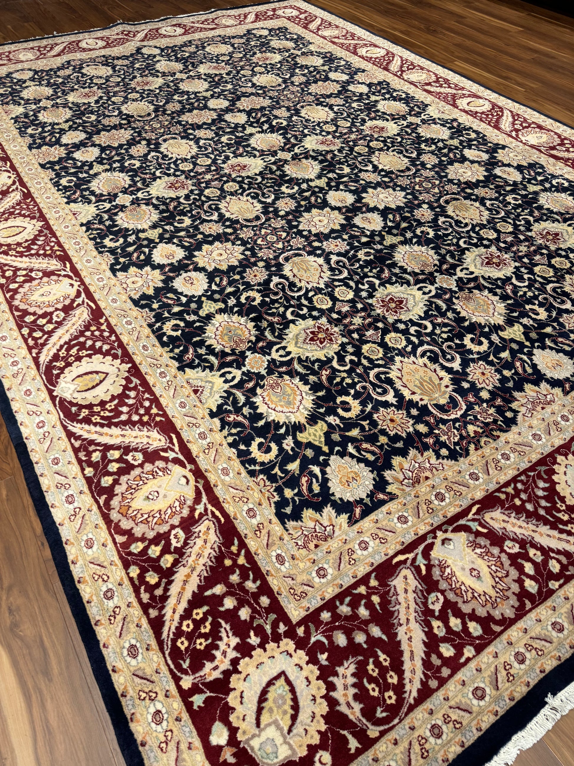 This exquisite Hereke rug boasts an array of intricate patterns, drawing inspiration from age-old traditions. It features a deep navy blue field complemented by gold and beige floral motifs and bordered in a warm, opulent red. Its high knot density and lustrous sheen suggest it may be made from a blend of wool and silk, typical of fine Hereke craftsmanship. Ideally suited to add a touch of elegance to any living space, collectors and decorators will appreciate its meticulous design and luxurious texture.