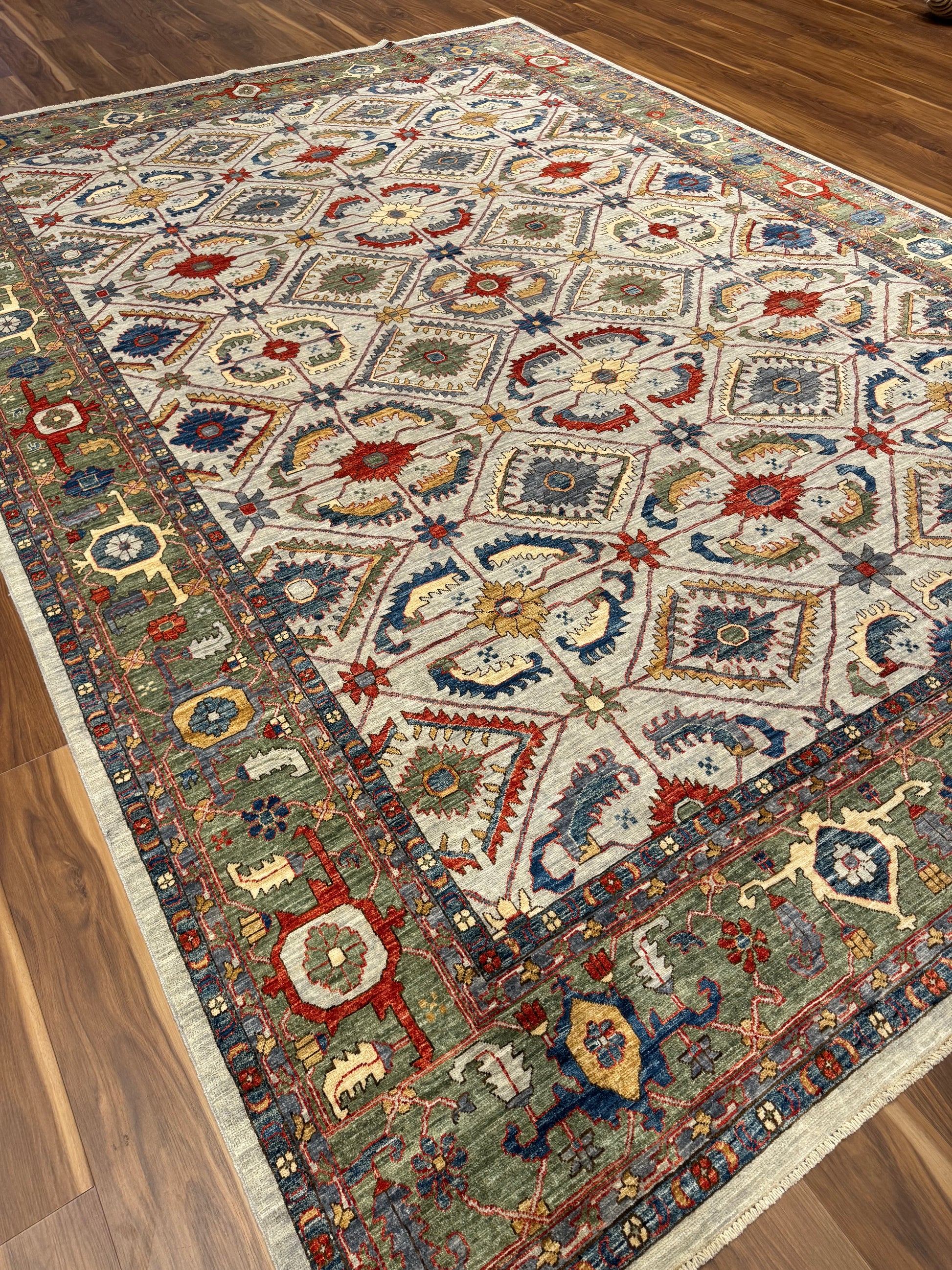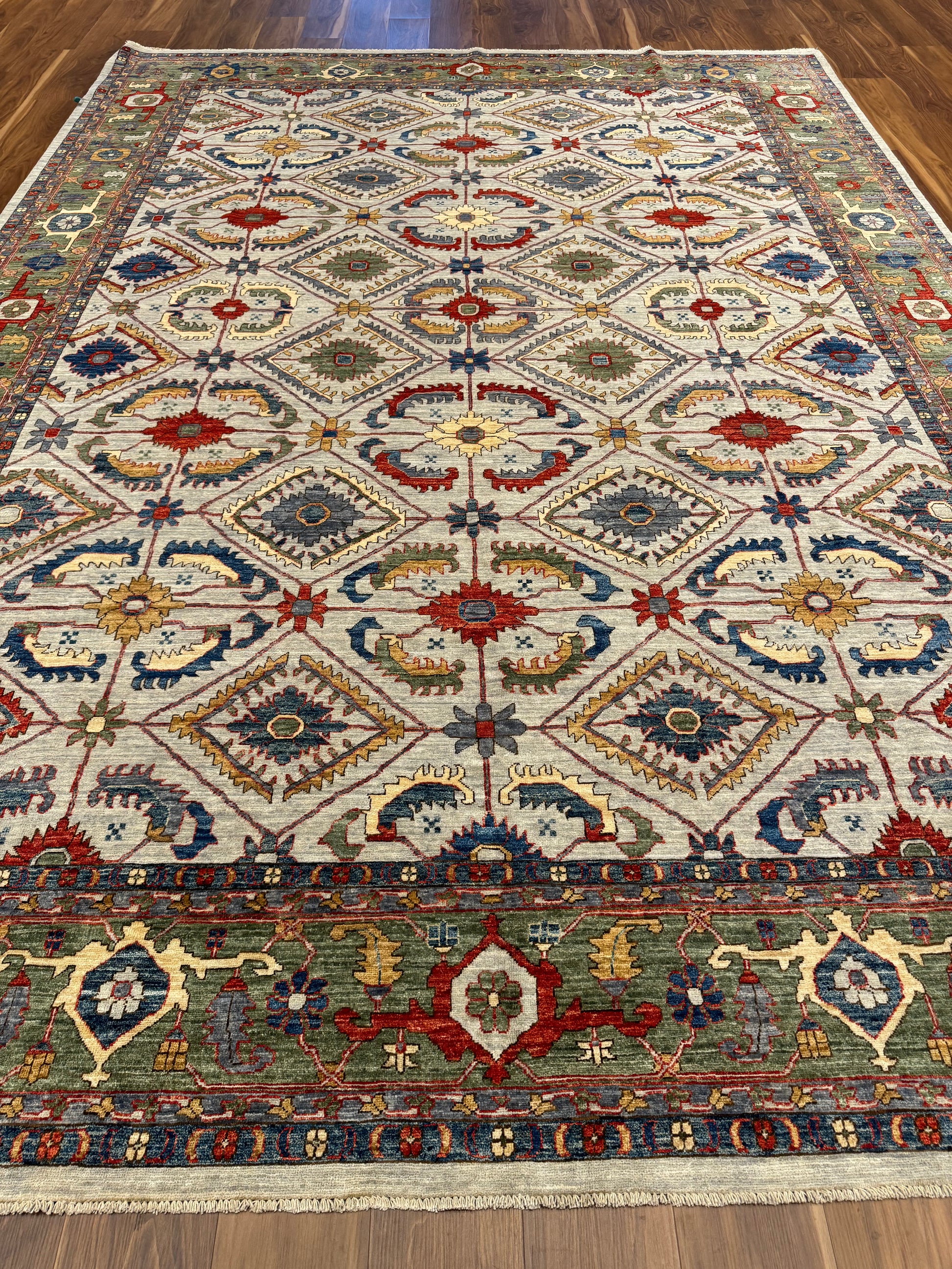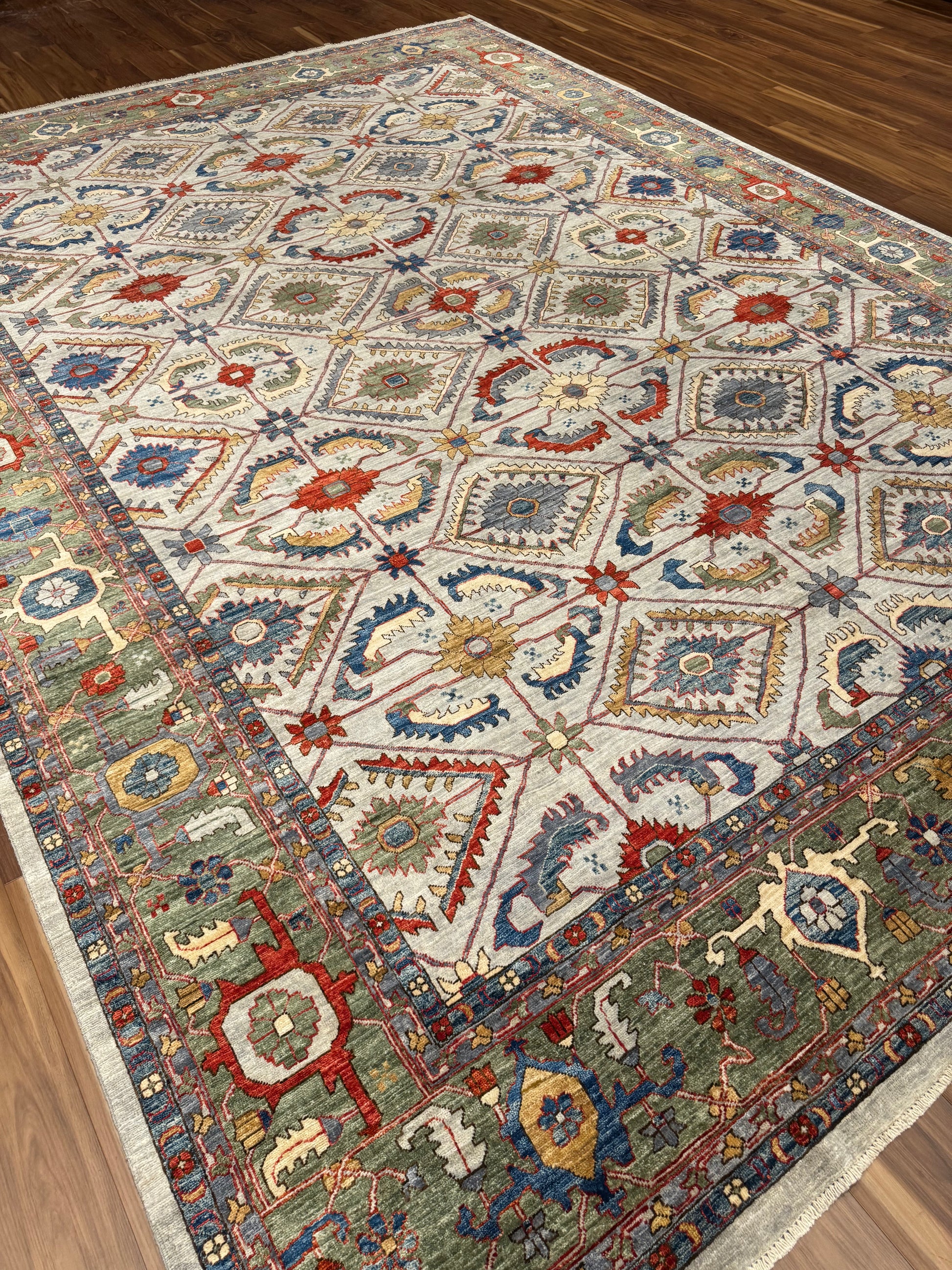 This exquisite Heriz (Ariana) wool rug showcases an intricate design featuring geometric patterns and symmetrical motifs. The beige field is adorned with navy blue, red, and olive green detailing, combining traditional craftsmanship with a sophisticated color palette. Each corner envelops part of the field, creating a sense of balance and harmony. The border frames the rug with a succession of smaller geometric patterns that complement the central design, embodying the authentic character of classic Heriz craftsmanship.