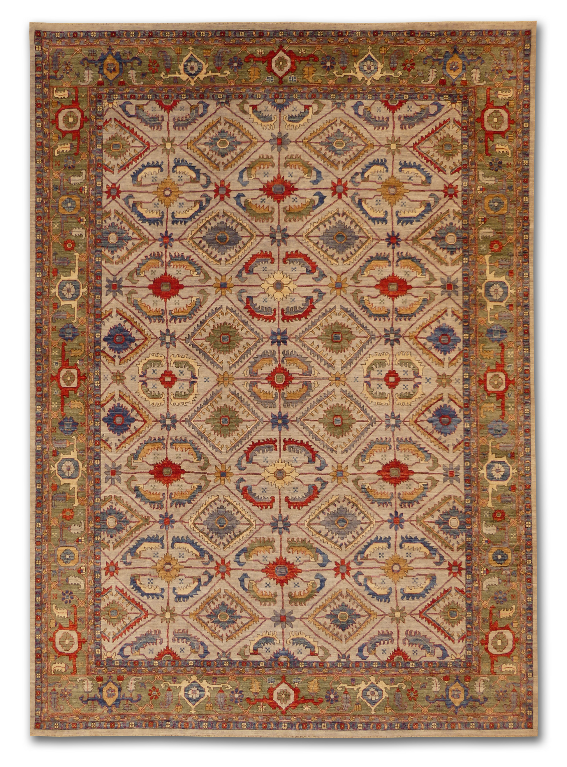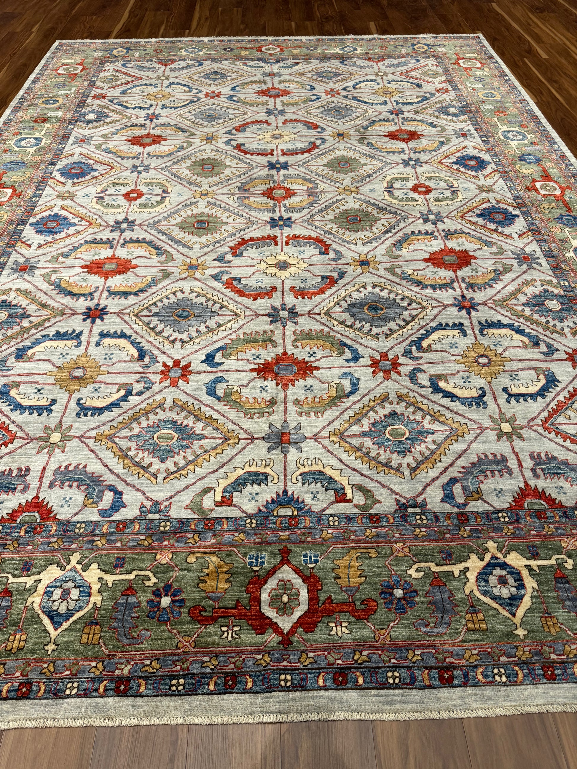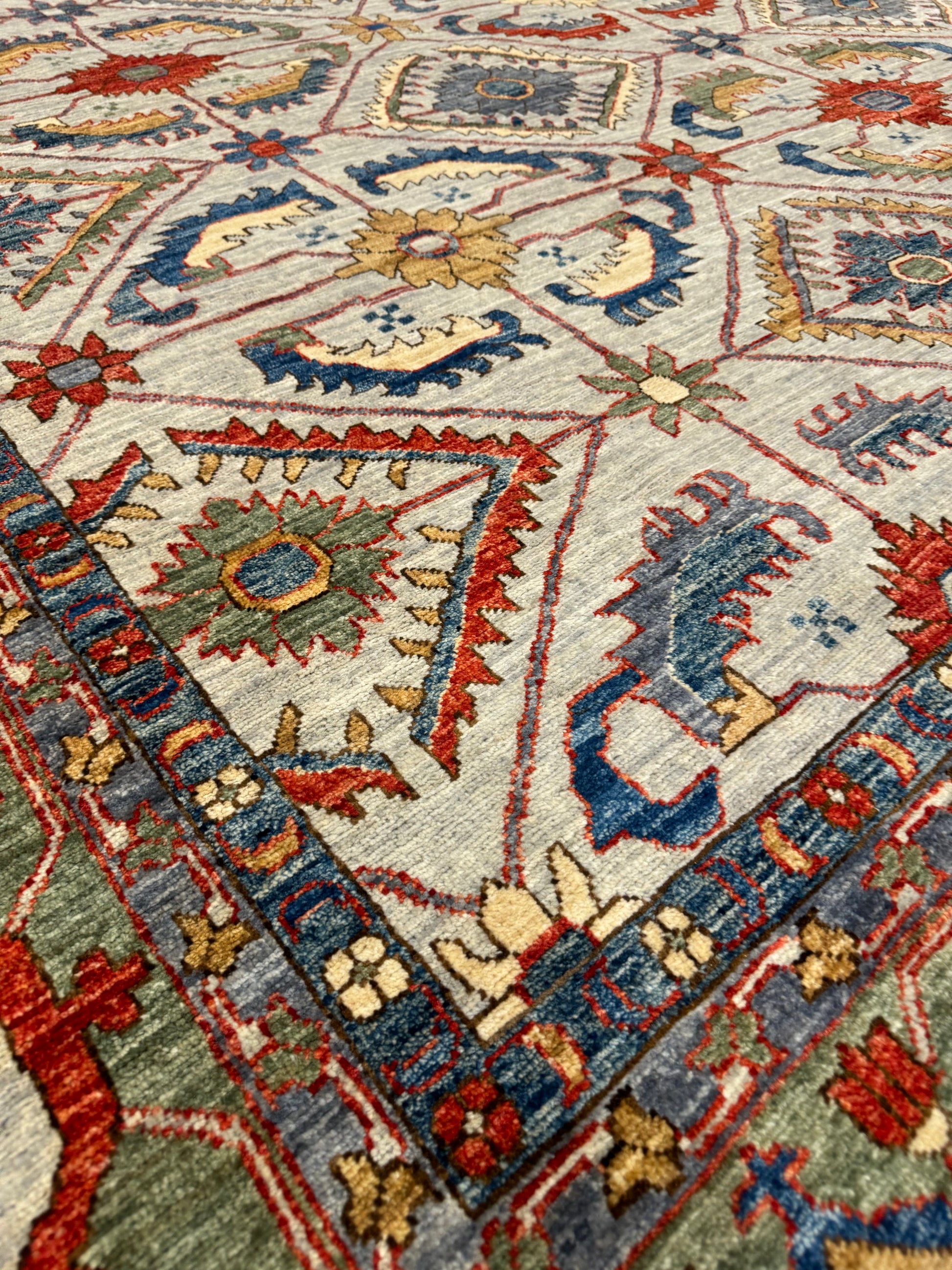 This exquisite Heriz (Ariana) wool rug showcases an intricate design featuring geometric patterns and symmetrical motifs. The beige field is adorned with navy blue, red, and olive green detailing, combining traditional craftsmanship with a sophisticated color palette. Each corner envelops part of the field, creating a sense of balance and harmony. The border frames the rug with a succession of smaller geometric patterns that complement the central design, embodying the authentic character of classic Heriz craftsmanship.