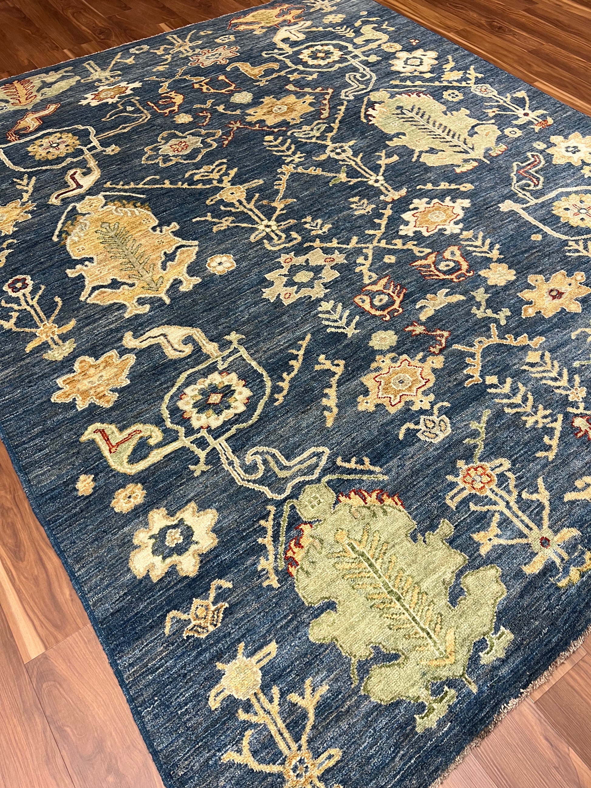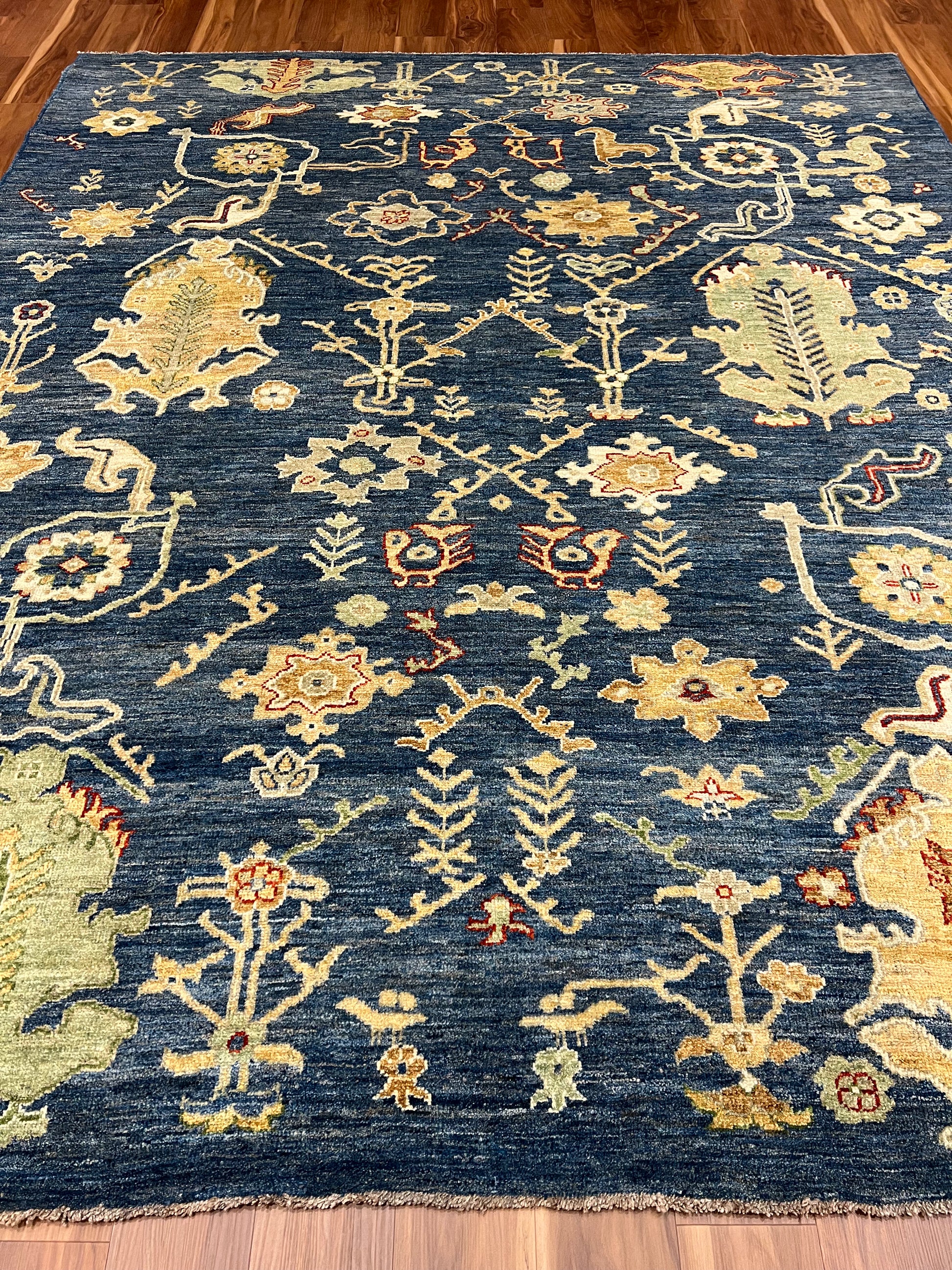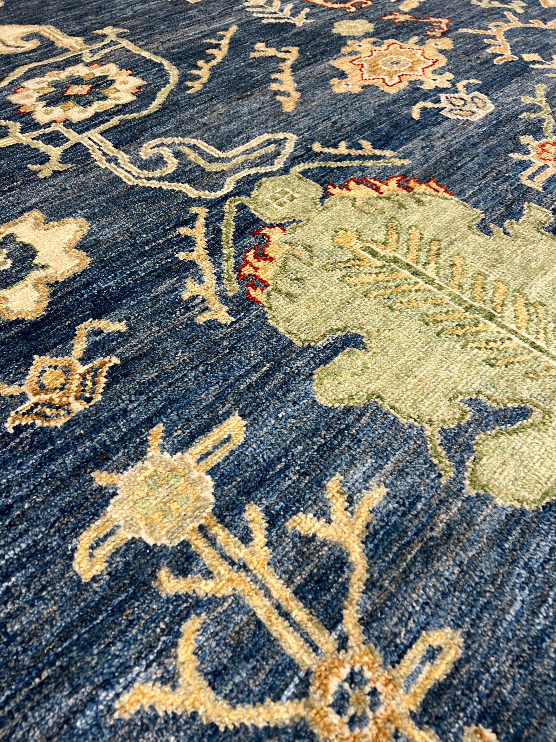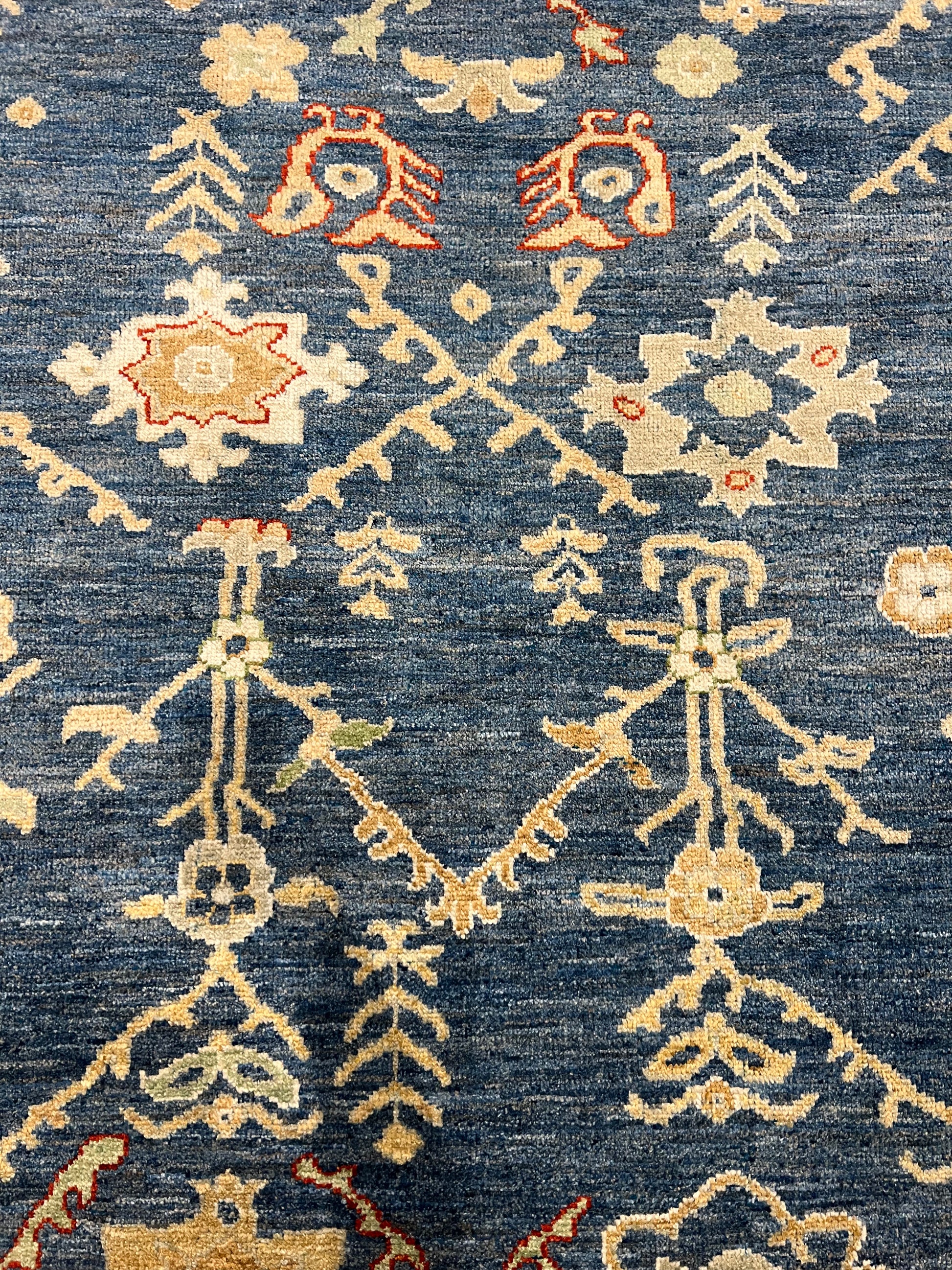 The Heriz rug features an elegantly balanced symphony of patterns crafted from high-quality wool. Its traditional design nods to the classic Persian artistry, incorporating floral motifs and geometric borders in a stunningly detailed presentation. The deep navy blue background sets a majestic stage for the gold and burnt orange details to shine, offering a rich and warm ambiance that would enrich any room. Each knot is a testament to the artisan's skill, providing durability and a timeless aesthetic that will endure.