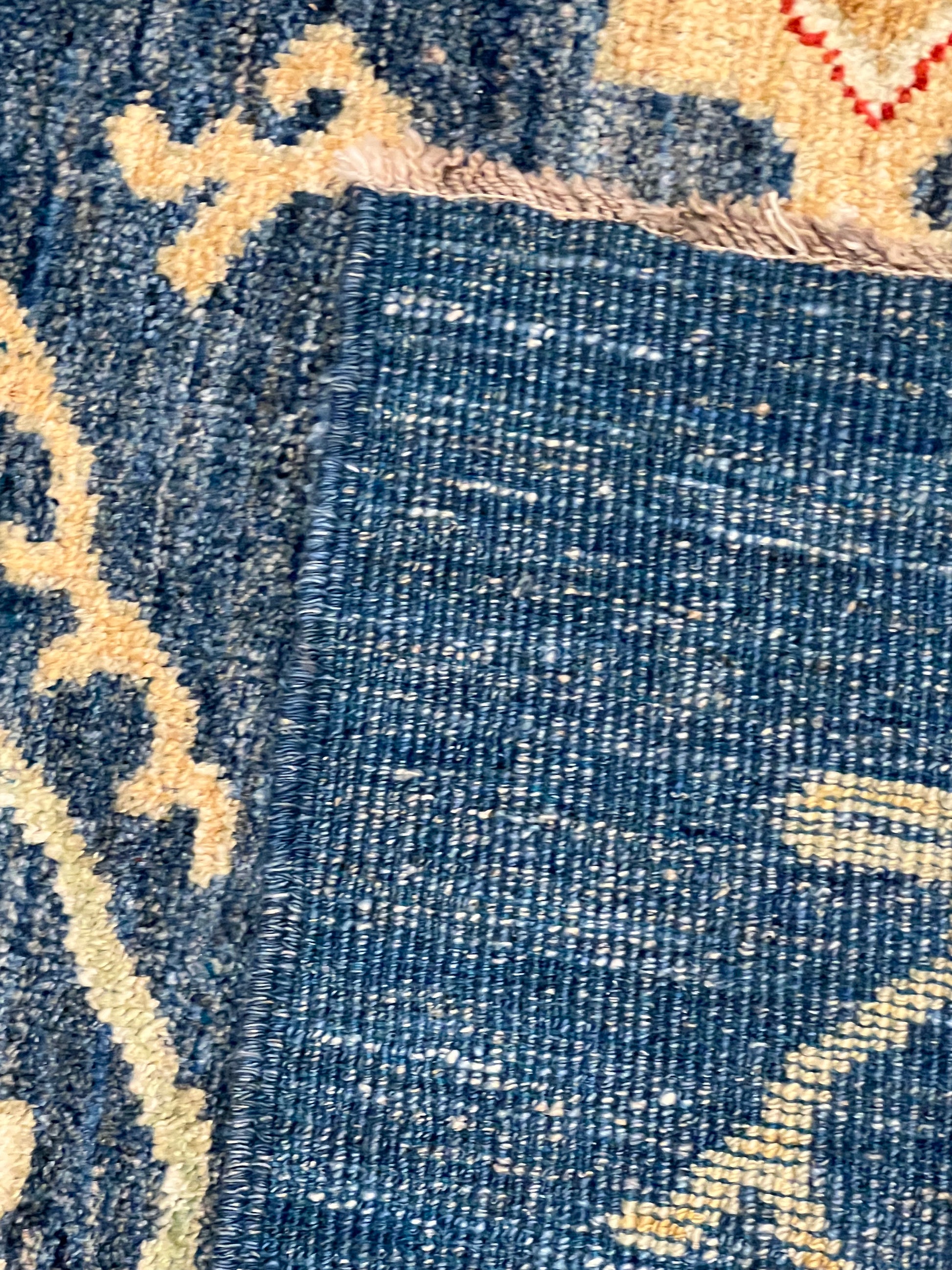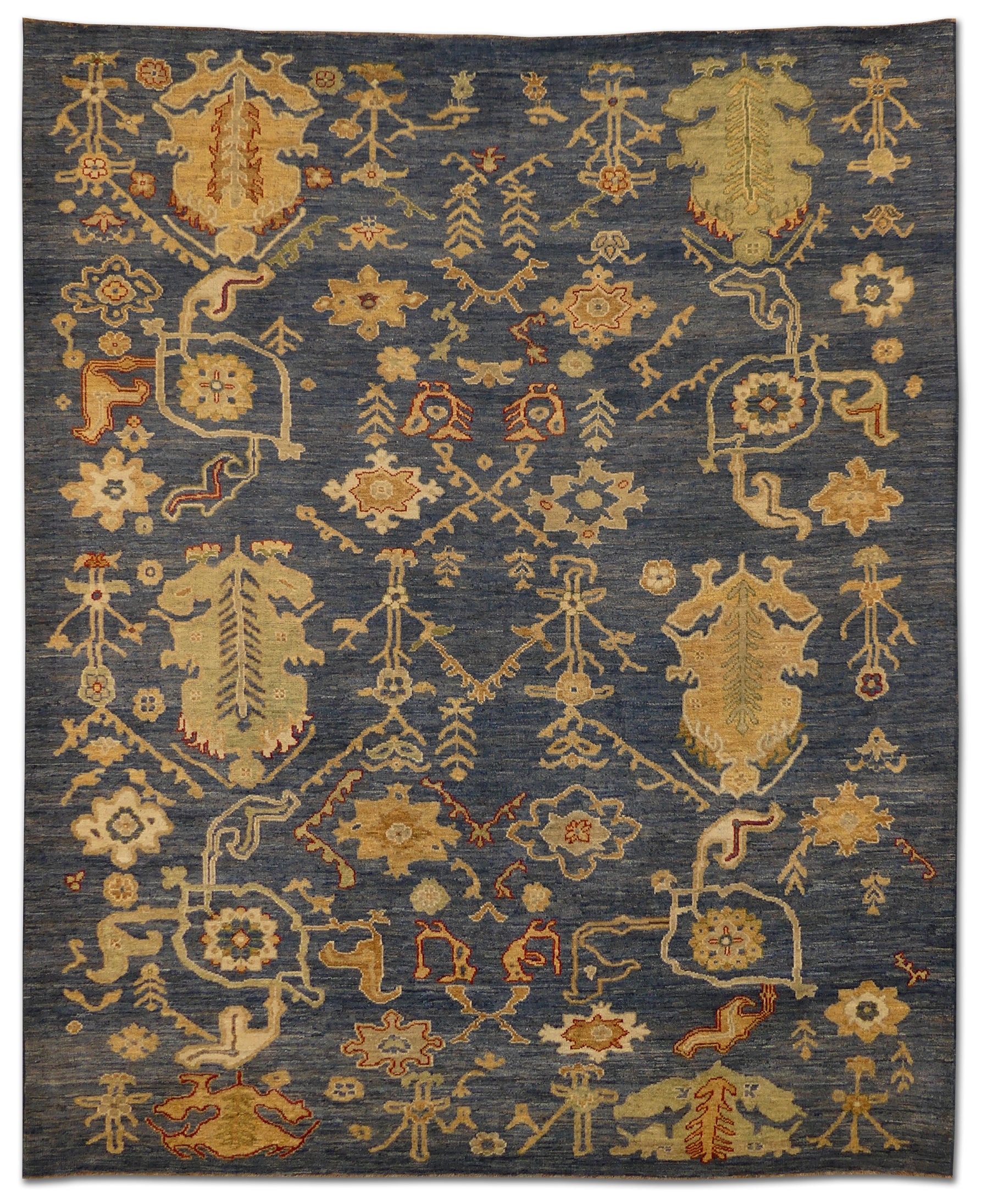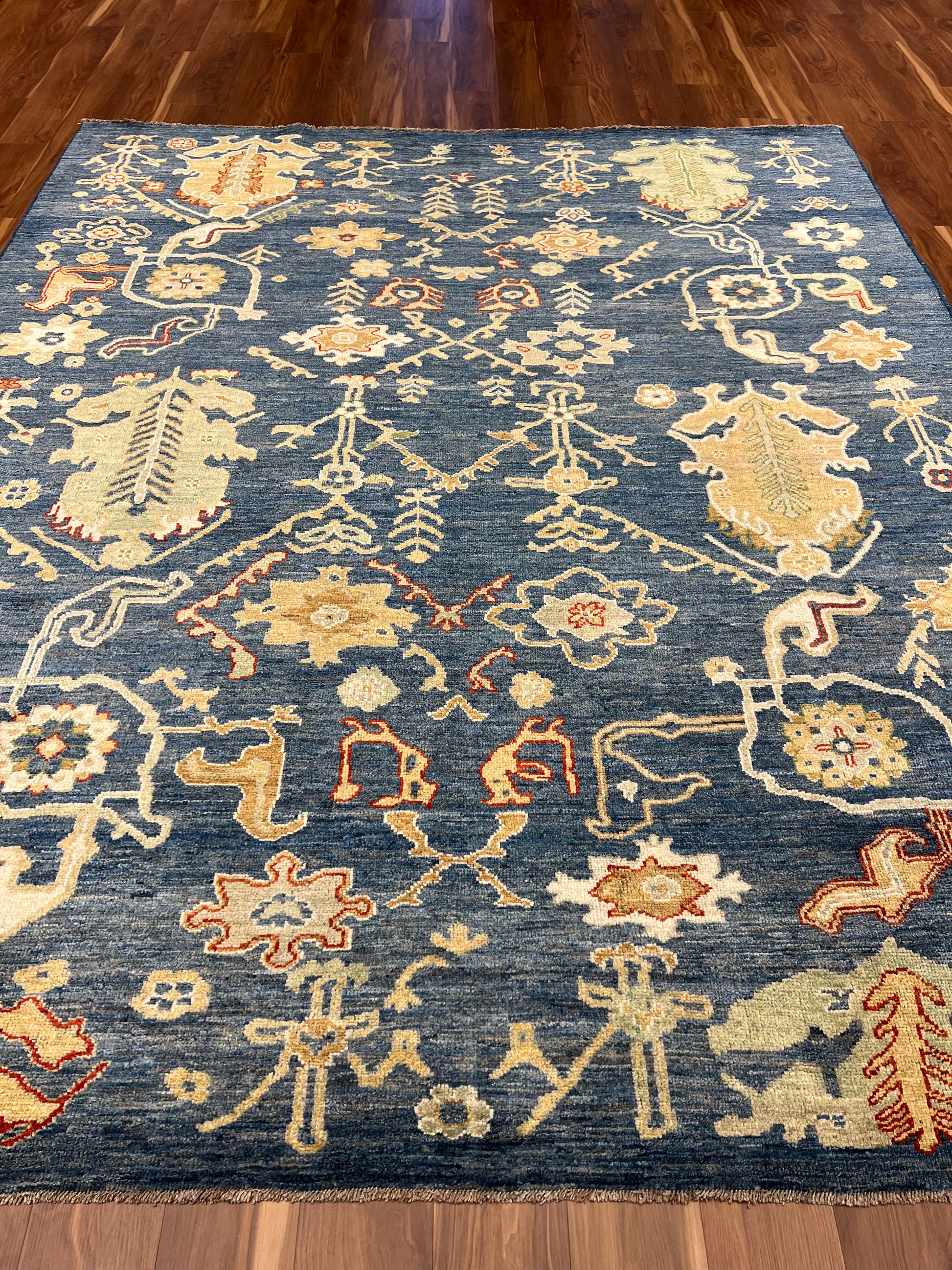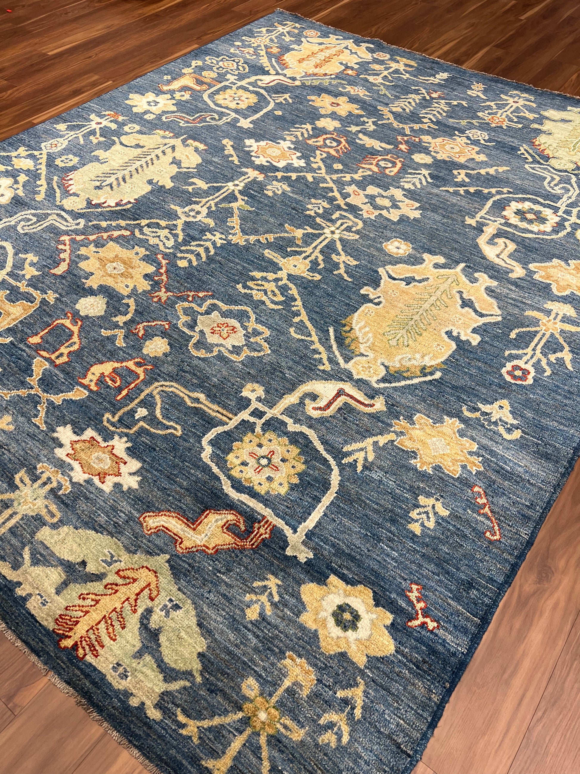 The Heriz rug features an elegantly balanced symphony of patterns crafted from high-quality wool. Its traditional design nods to the classic Persian artistry, incorporating floral motifs and geometric borders in a stunningly detailed presentation. The deep navy blue background sets a majestic stage for the gold and burnt orange details to shine, offering a rich and warm ambiance that would enrich any room. Each knot is a testament to the artisan's skill, providing durability and a timeless aesthetic that will endure.