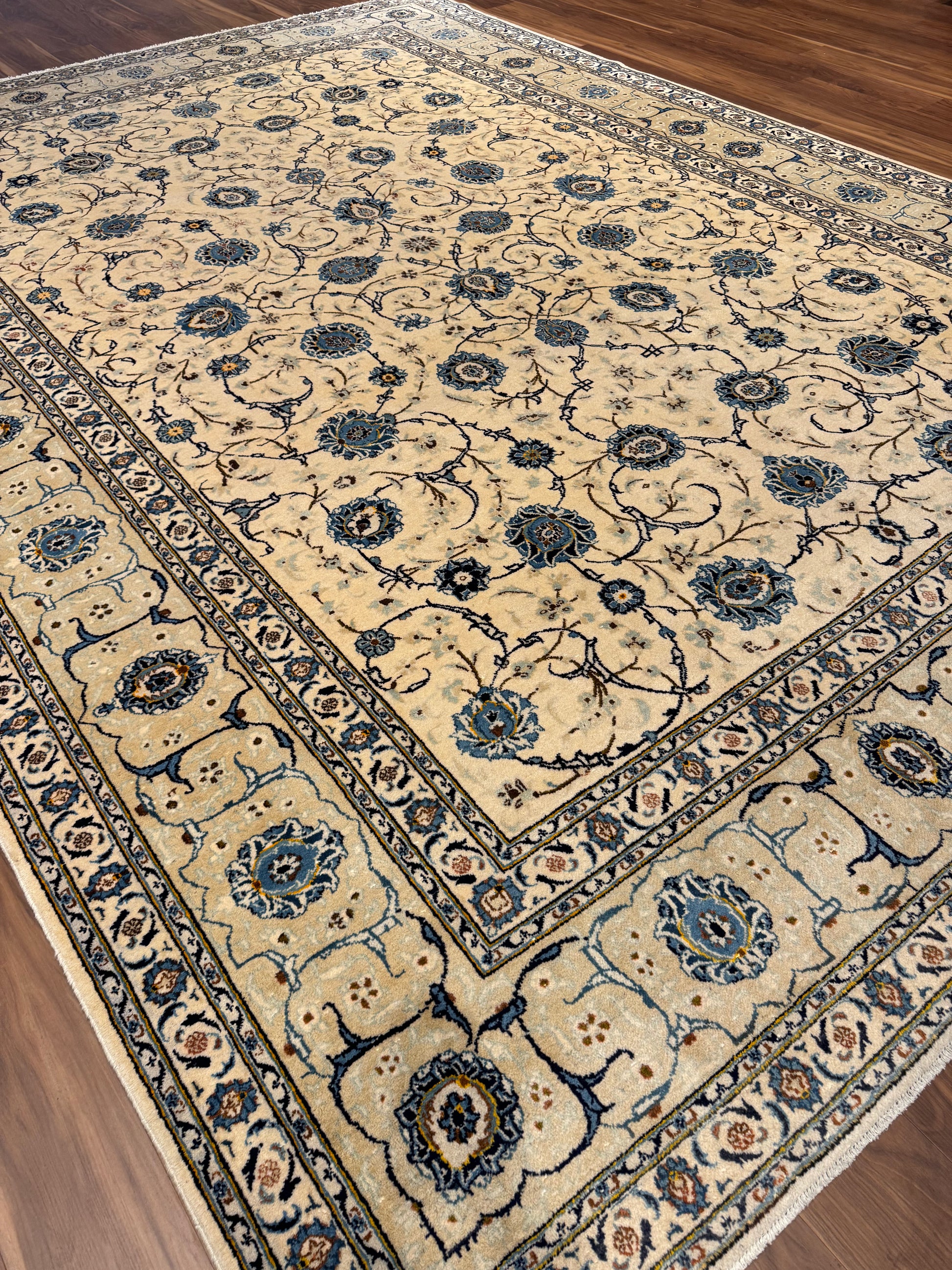 This exquisite Heriz Wool Rug boasts a traditional design with a rich blend of beige and navy blue hues, accentuated by intricate brown details. Perfect for adding a touch of elegance to any room, this rug is hand-knotted with high-quality wool, ensuring durability and a luxurious feel underfoot. The symmetrical floral patterns and the detailed borders evoke a timeless charm that complements both classic and contemporary decors, making it a versatile choice for homeowners seeking a blend of comfort and sophistication.