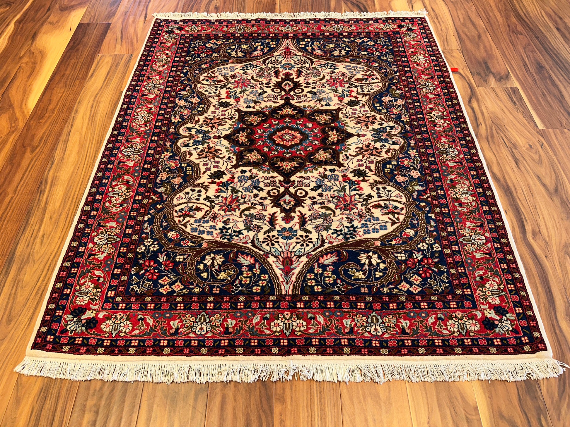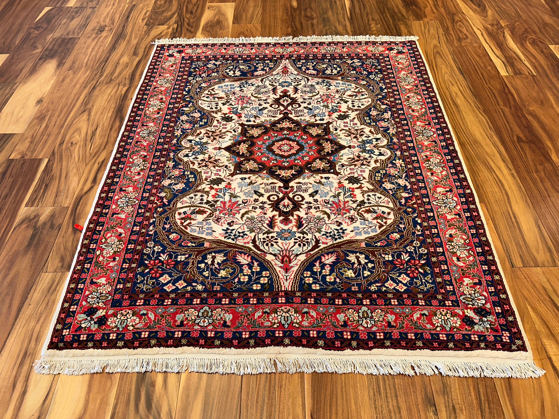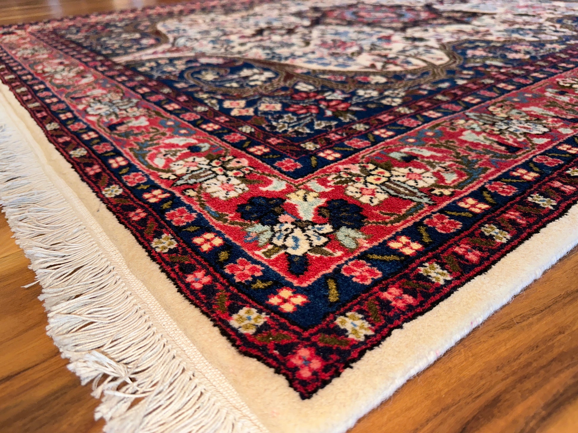 This refined handmade wool rug showcases a dramatic central medallion framed within a delicate ivory field and bordered by intricate floral scrollwork. Deep navy, soft coral, and hints of sky blue enrich the densely detailed botanical motifs, offering both movement and harmony. Its elegant symmetry and saturated palette evoke a sense of timeless grandeur.