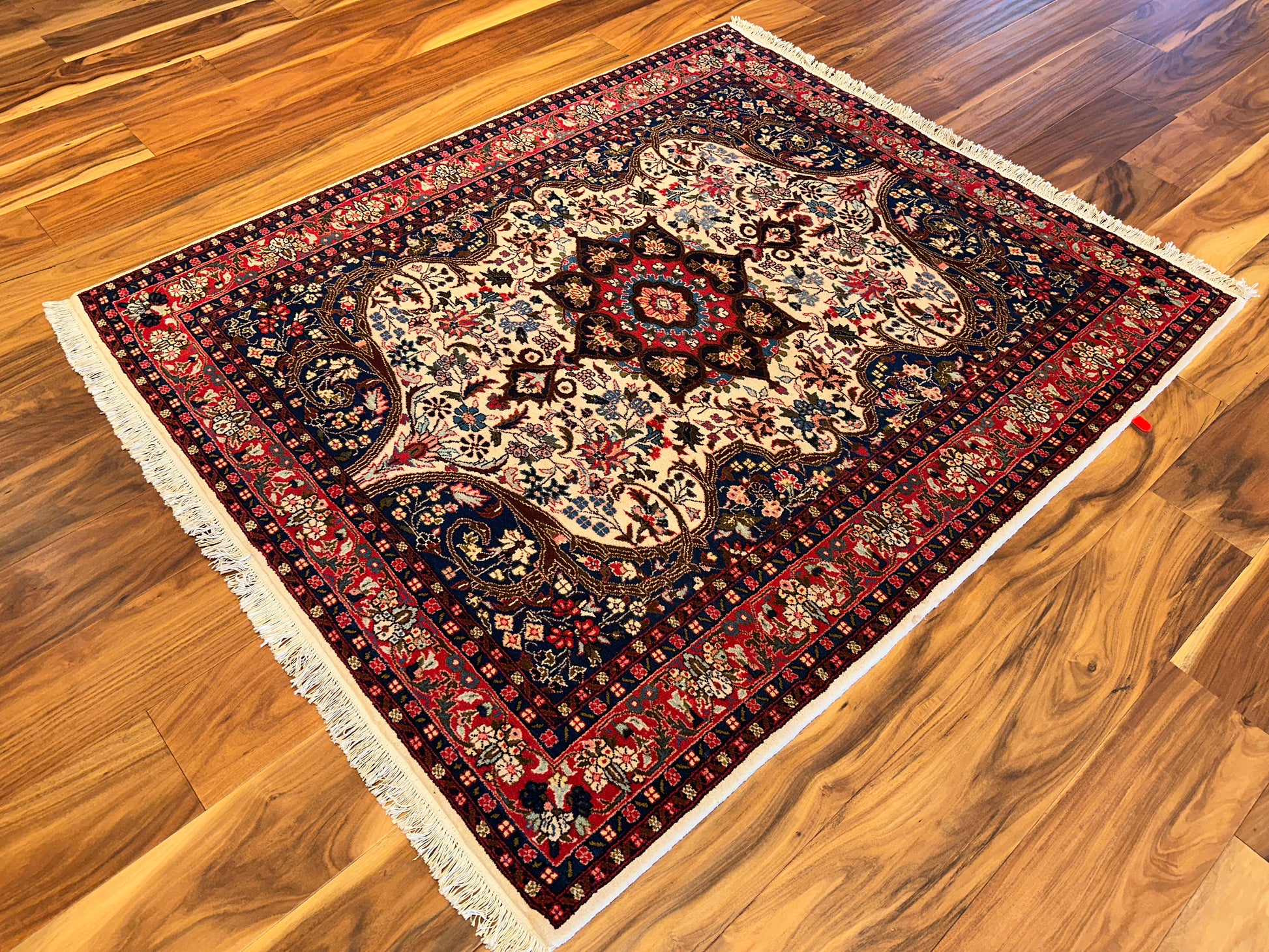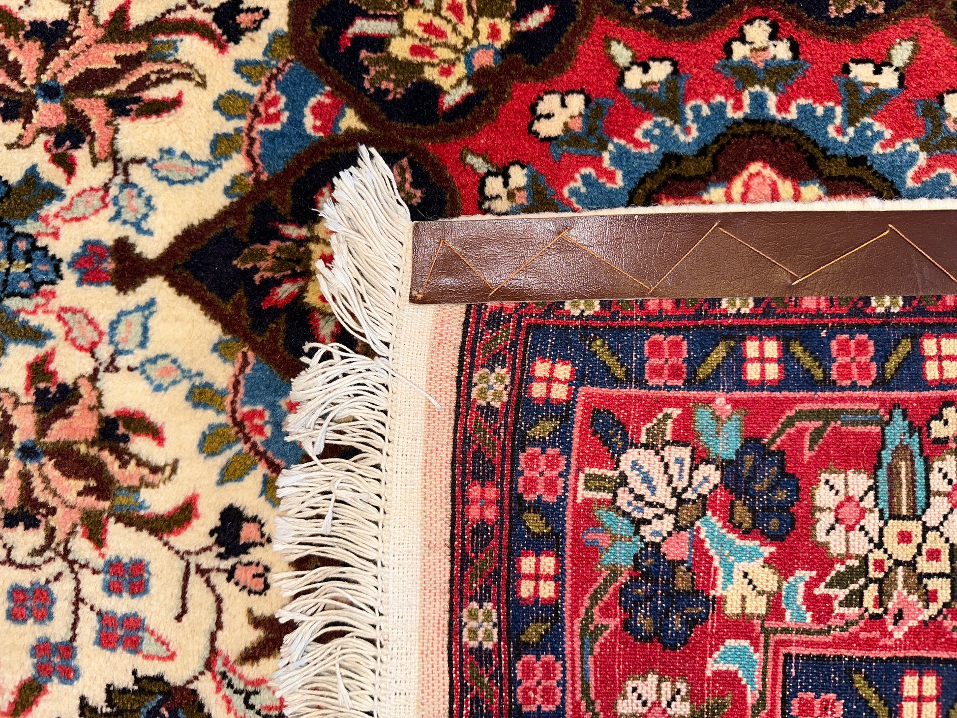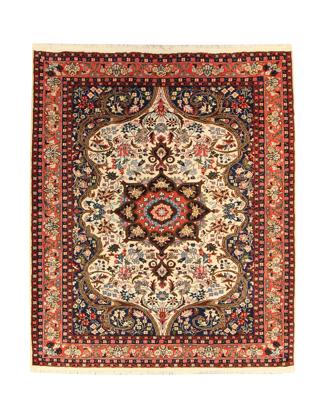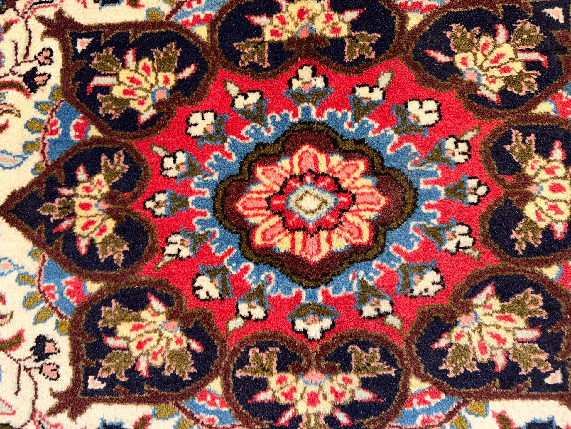 This refined handmade wool rug showcases a dramatic central medallion framed within a delicate ivory field and bordered by intricate floral scrollwork. Deep navy, soft coral, and hints of sky blue enrich the densely detailed botanical motifs, offering both movement and harmony. Its elegant symmetry and saturated palette evoke a sense of timeless grandeur.