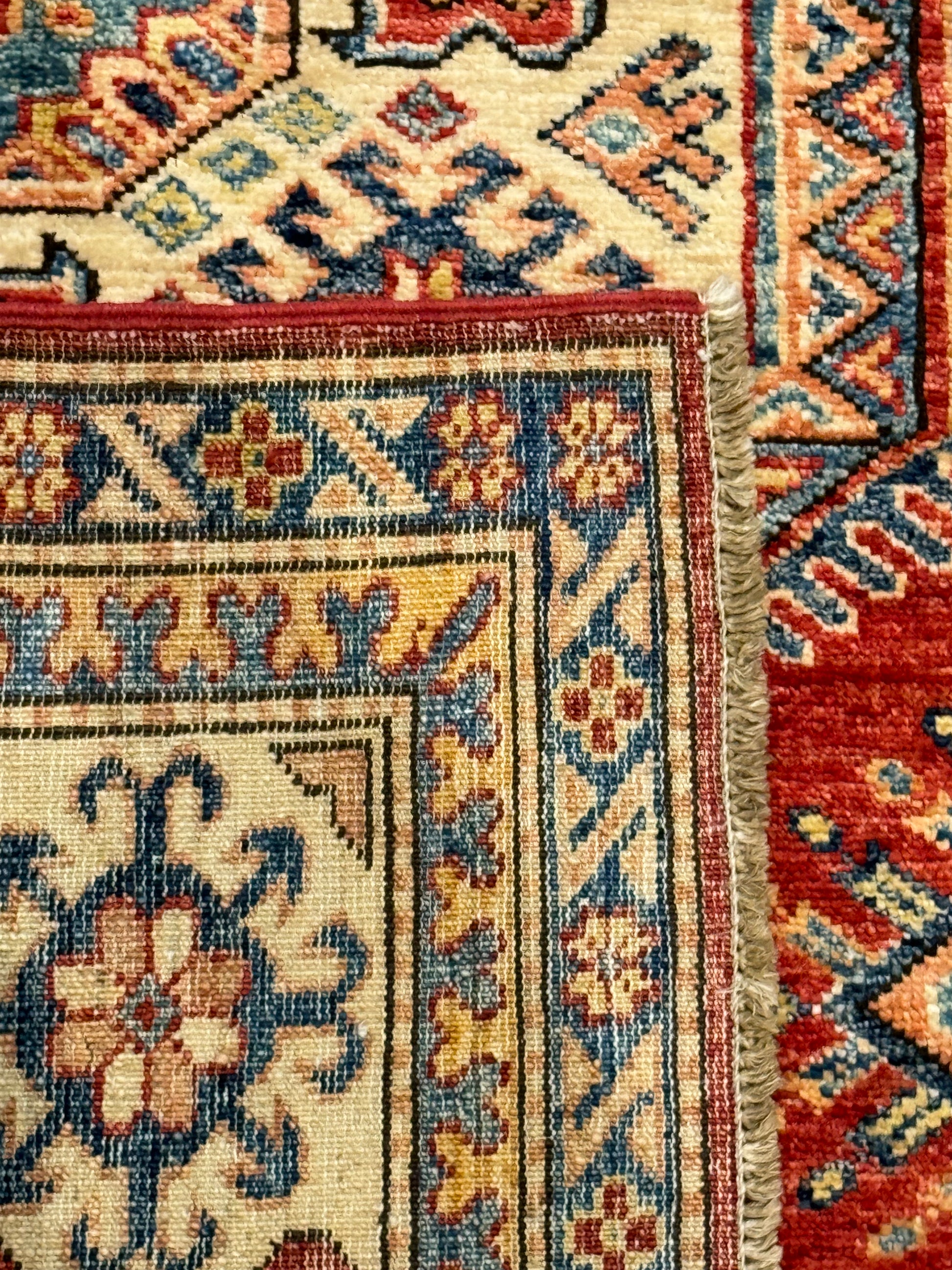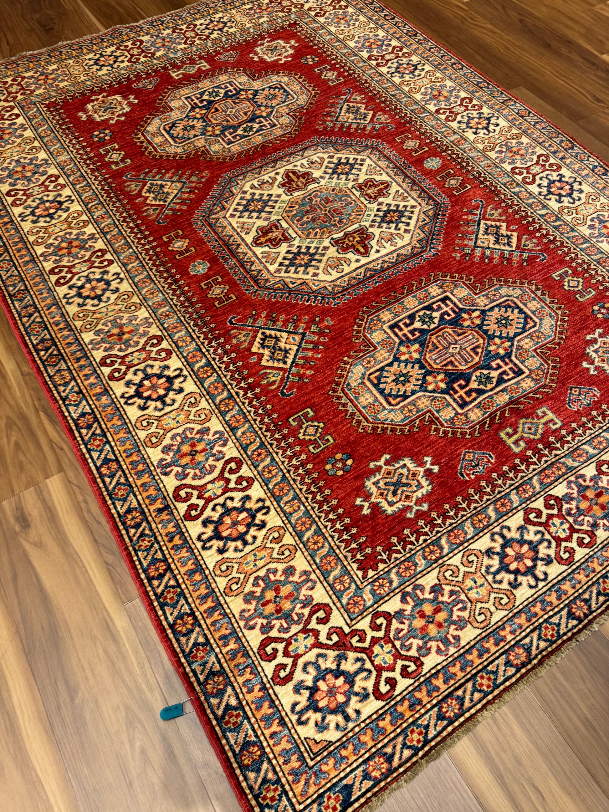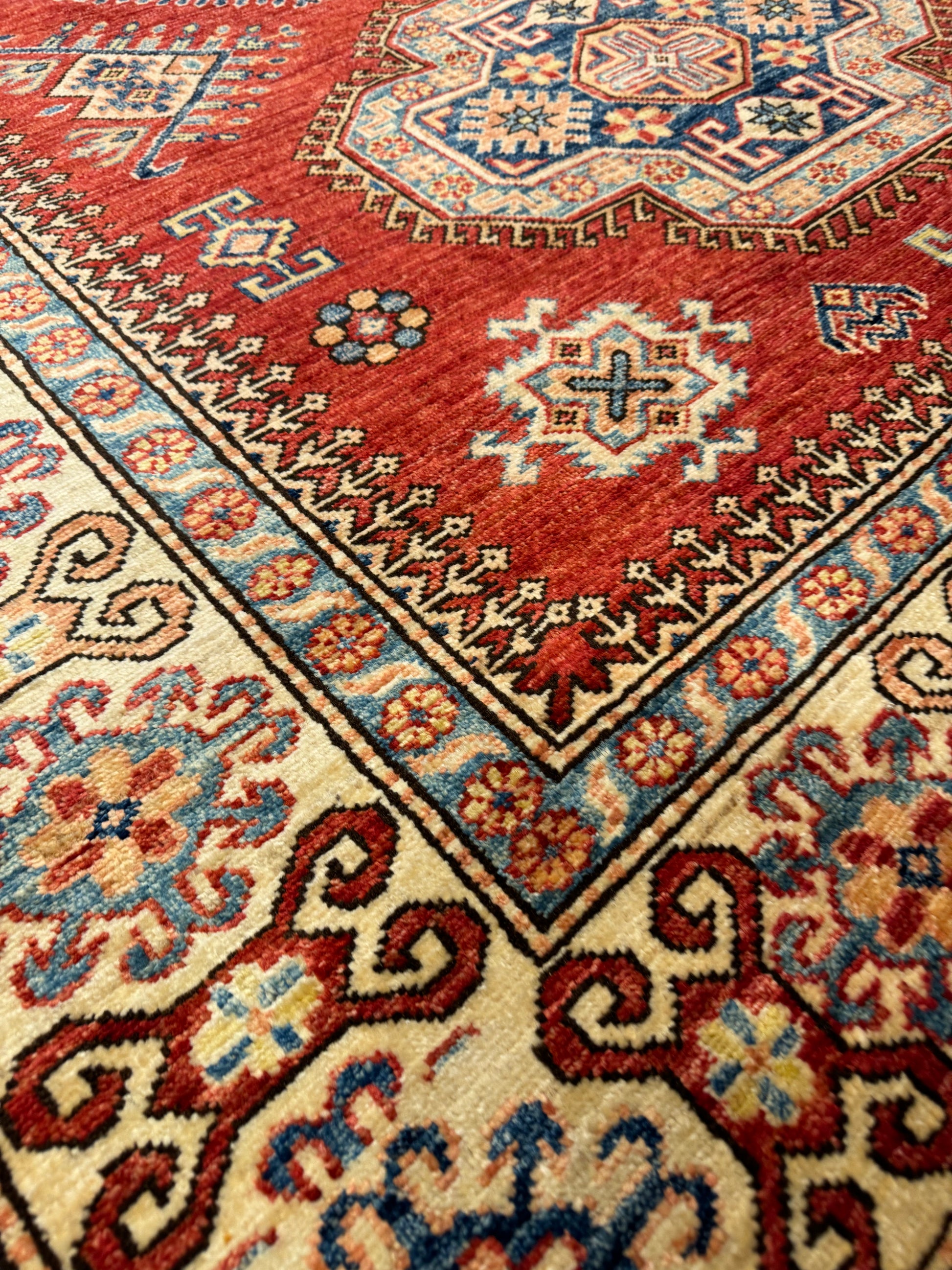 The Karachov Kazak rug features a rich tapestry of bold geometric shapes and distinctive tribal patterns. Its deep red field accentuated with harmonious shades of blue, ivory, and hints of orange elicits a warm and stately presence. Handwoven from high-quality wool, this rug's construction offers durability and a plush texture. The intricate borders showcase sophisticated artistry, making it a statement piece for any traditional or contemporary space seeking a touch of cultural depth.