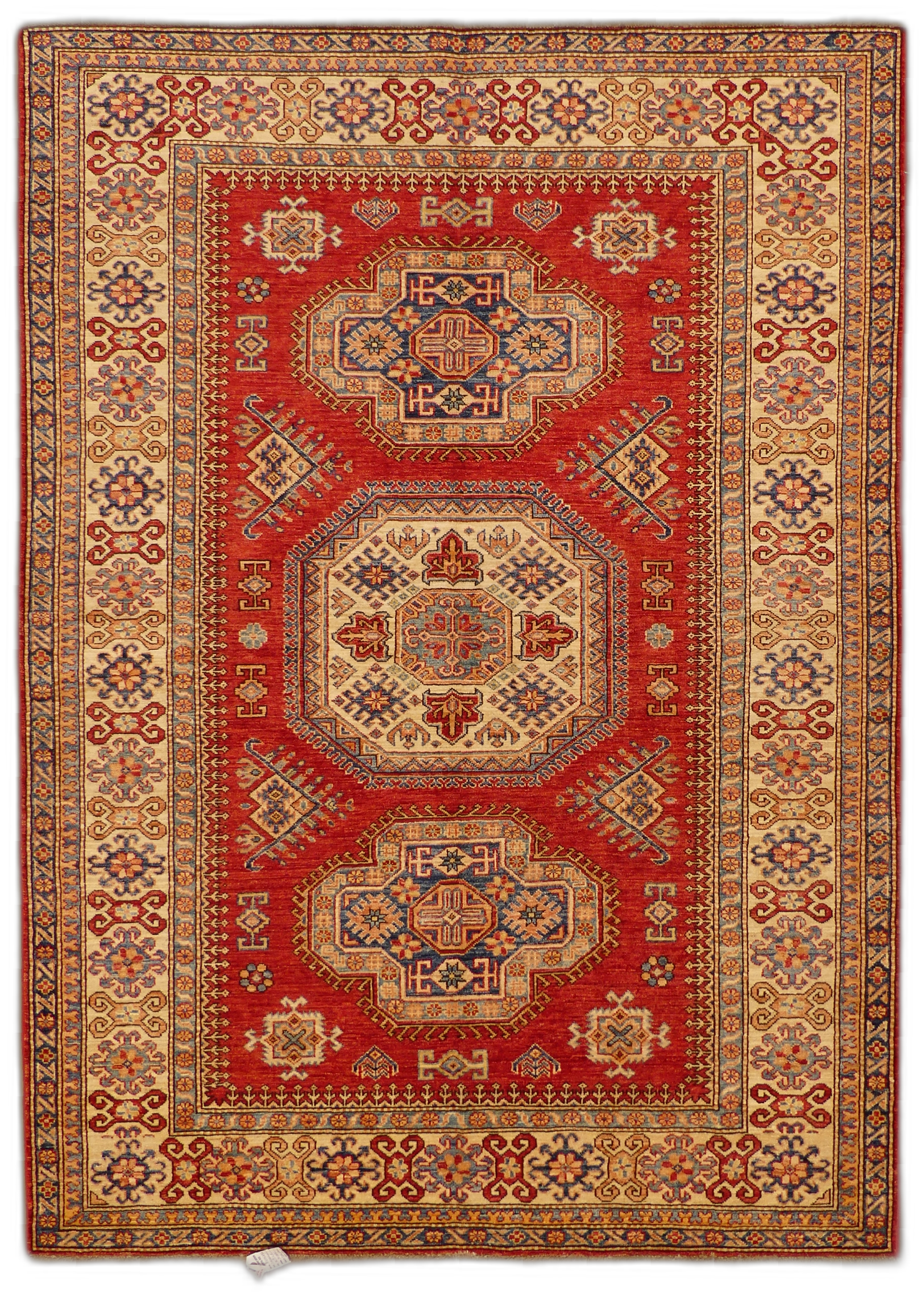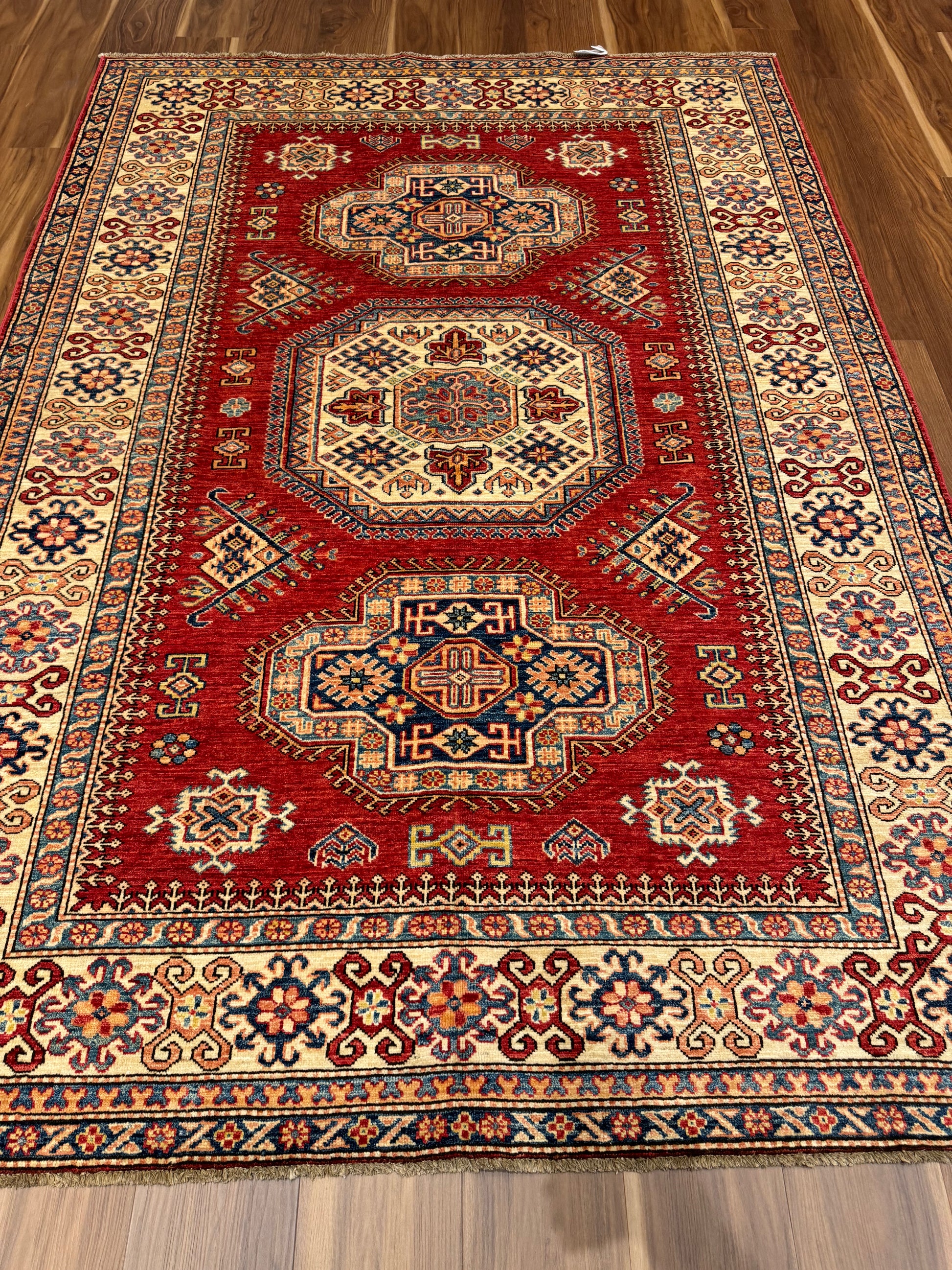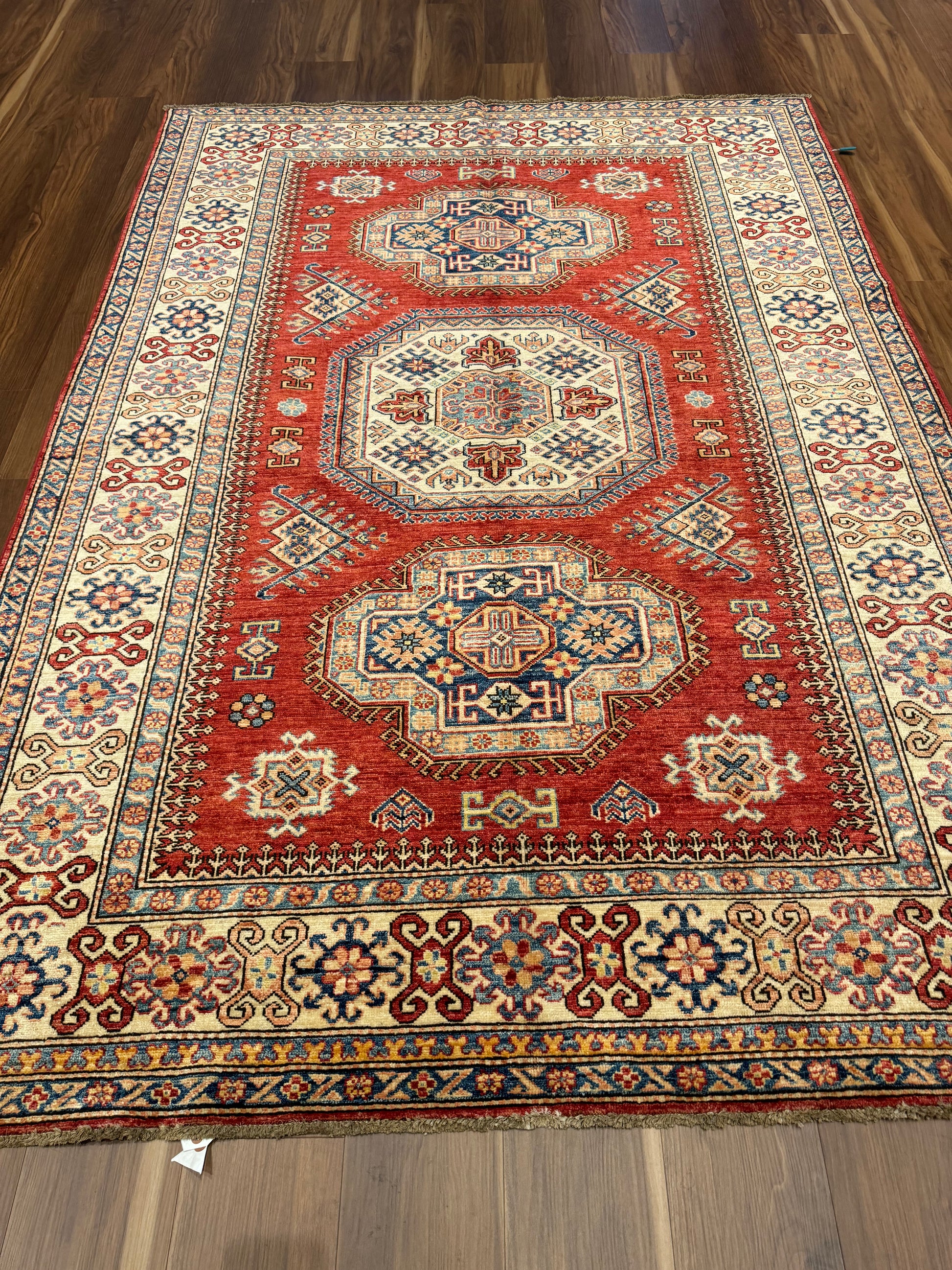 The Karachov Kazak rug features a rich tapestry of bold geometric shapes and distinctive tribal patterns. Its deep red field accentuated with harmonious shades of blue, ivory, and hints of orange elicits a warm and stately presence. Handwoven from high-quality wool, this rug's construction offers durability and a plush texture. The intricate borders showcase sophisticated artistry, making it a statement piece for any traditional or contemporary space seeking a touch of cultural depth.