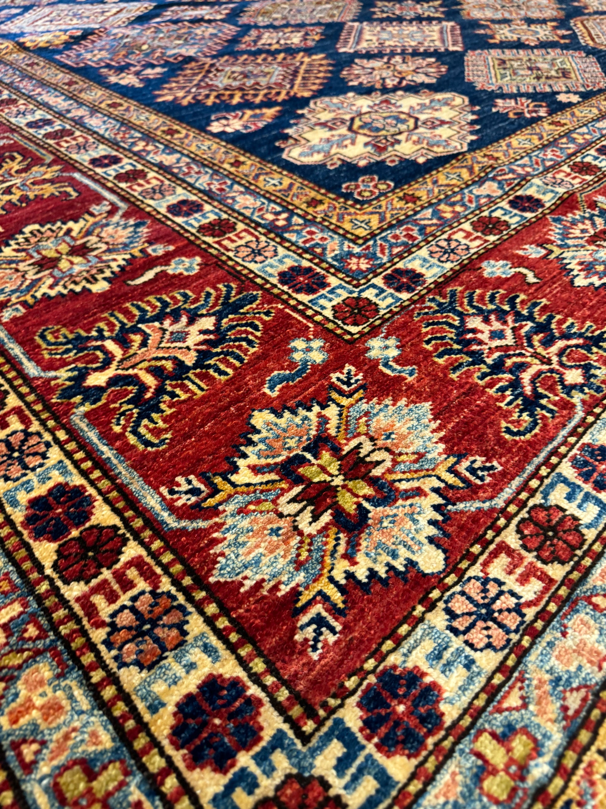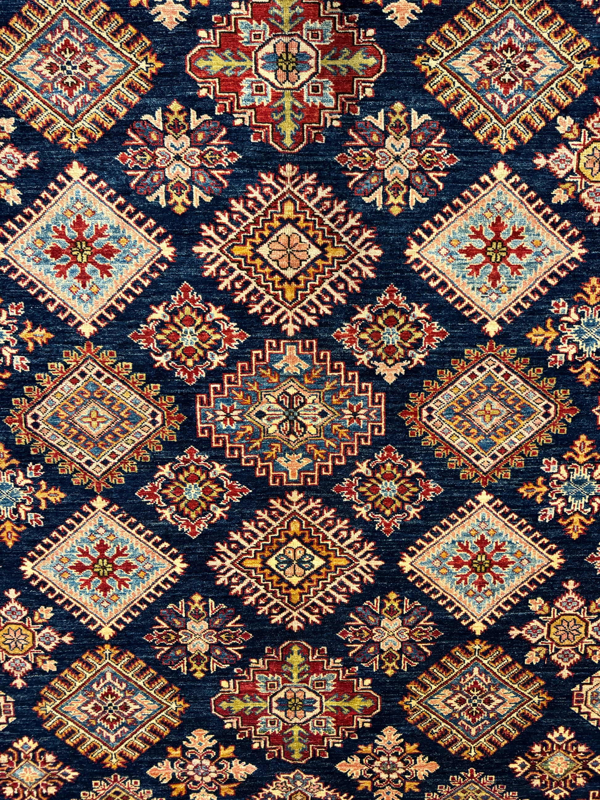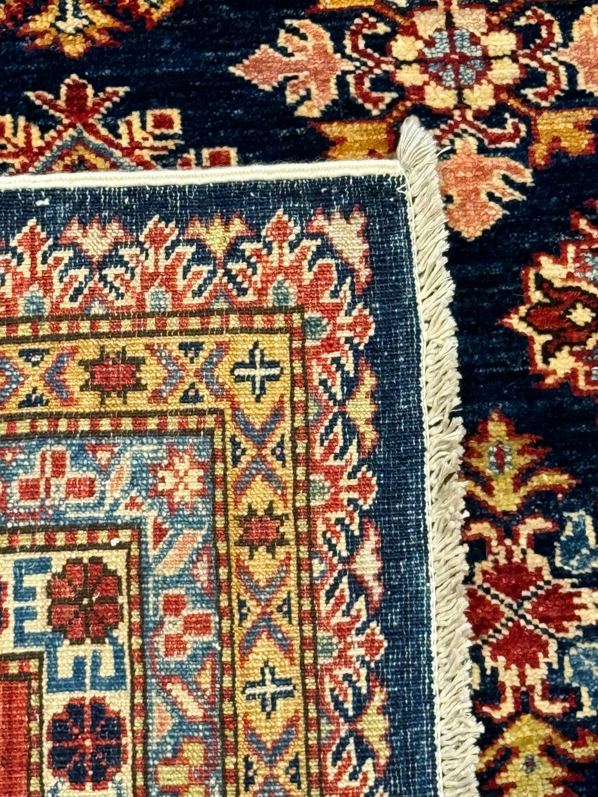 This exquisite Kazak (Ararat) rug exhibits a blend of rich, deep colors and a series of geometric motifs that bring a sense of vibrancy and tradition to any space. With its dense weave and intricate designs, each element tells a story, invoking the heritage of Armenian craftsmanship. The precise patterns, using navy blue, red, and gold hues, create a harmonious composition that is both captivating and timeless. This woolen rug, crafted with exceptional skill, offers durability and comfort, making it a practical choice for daily use while maintaining its cultural narrative and decorative appeal.
