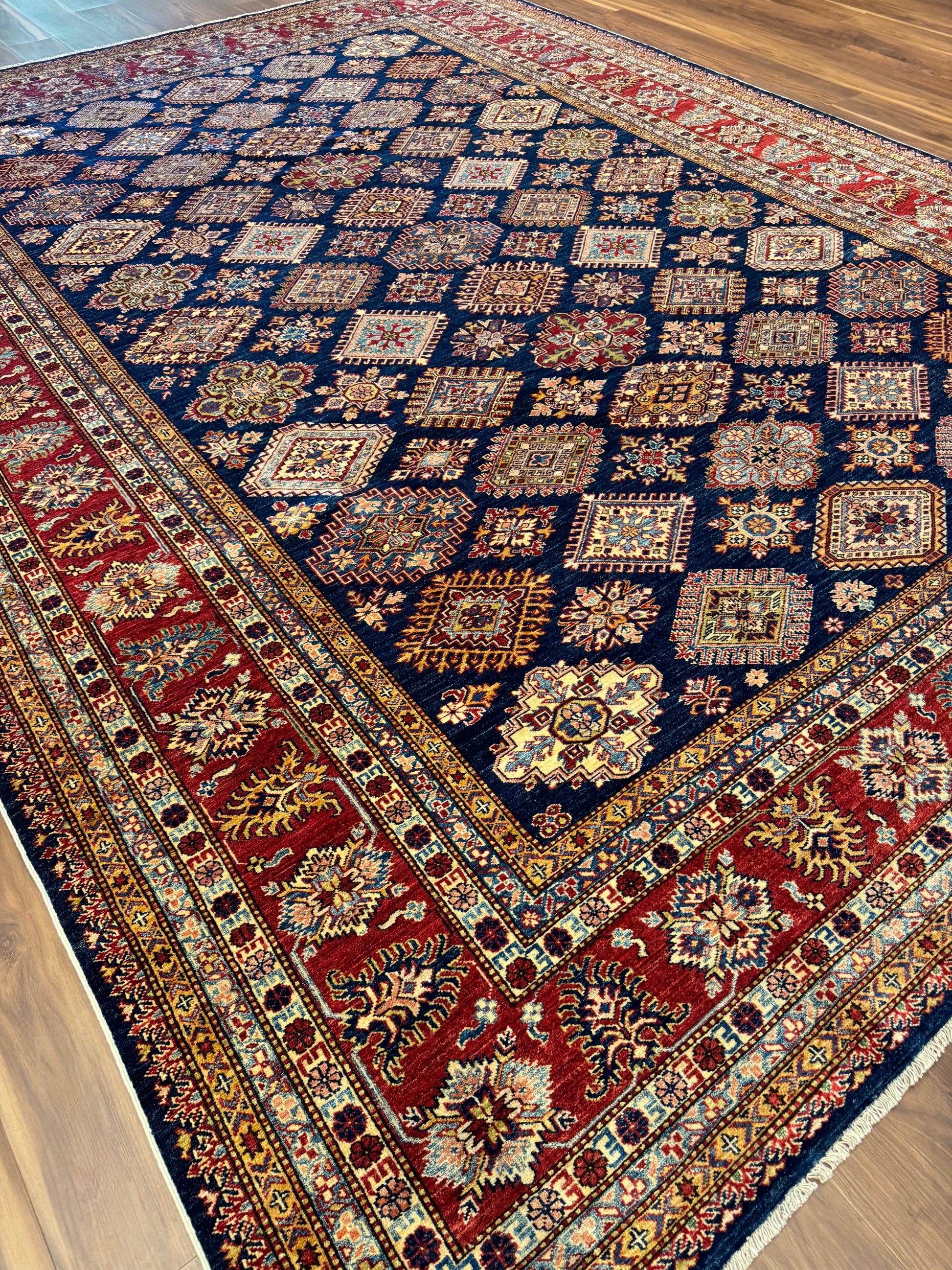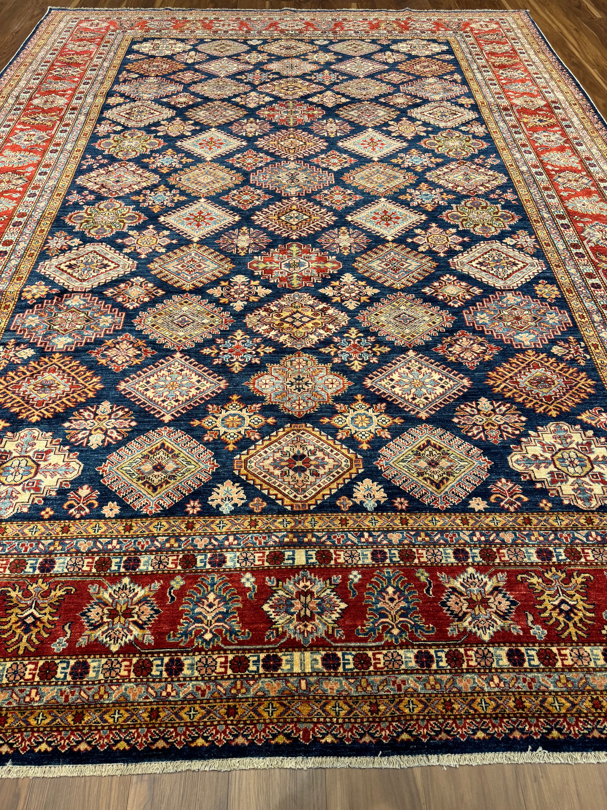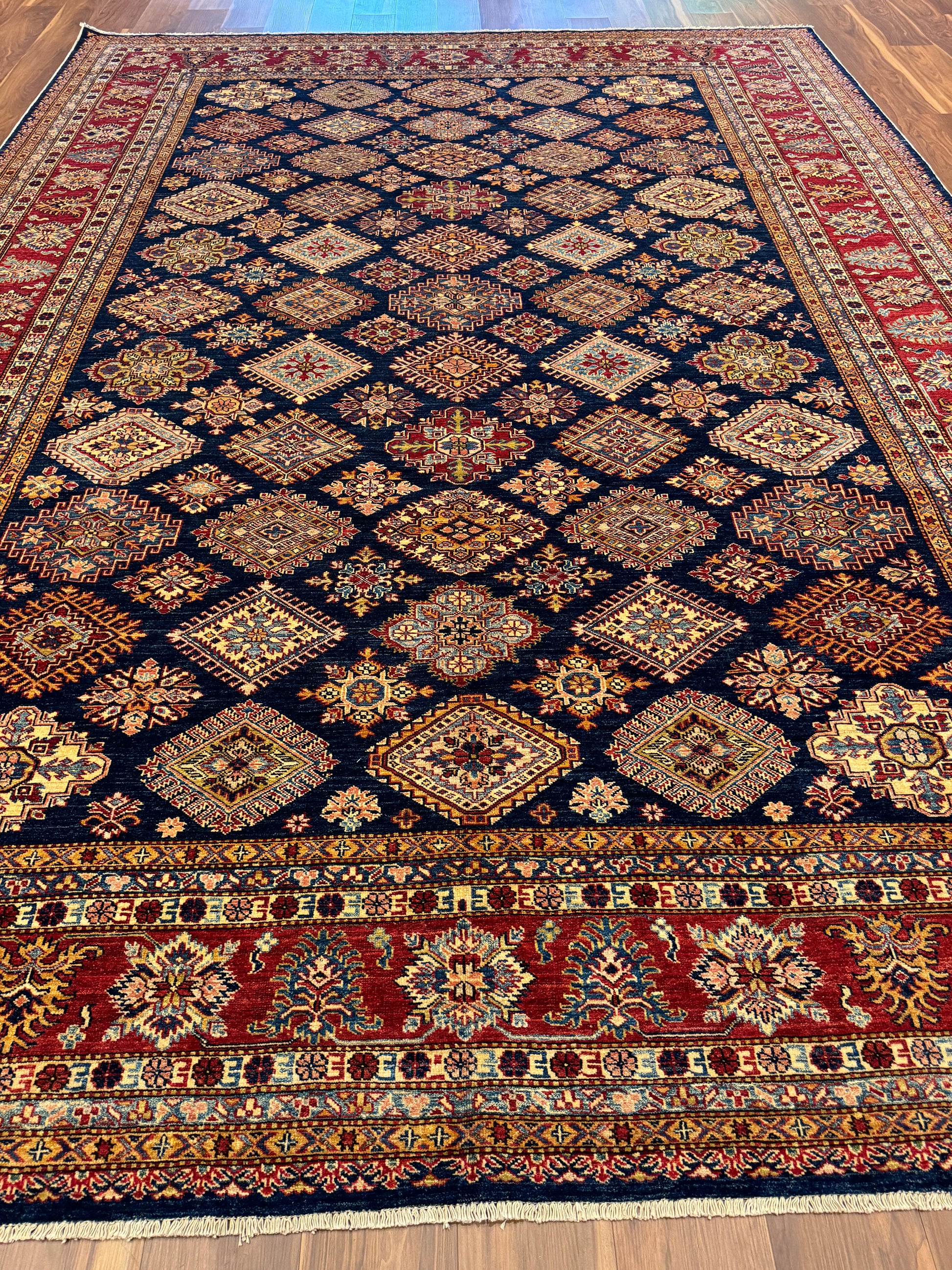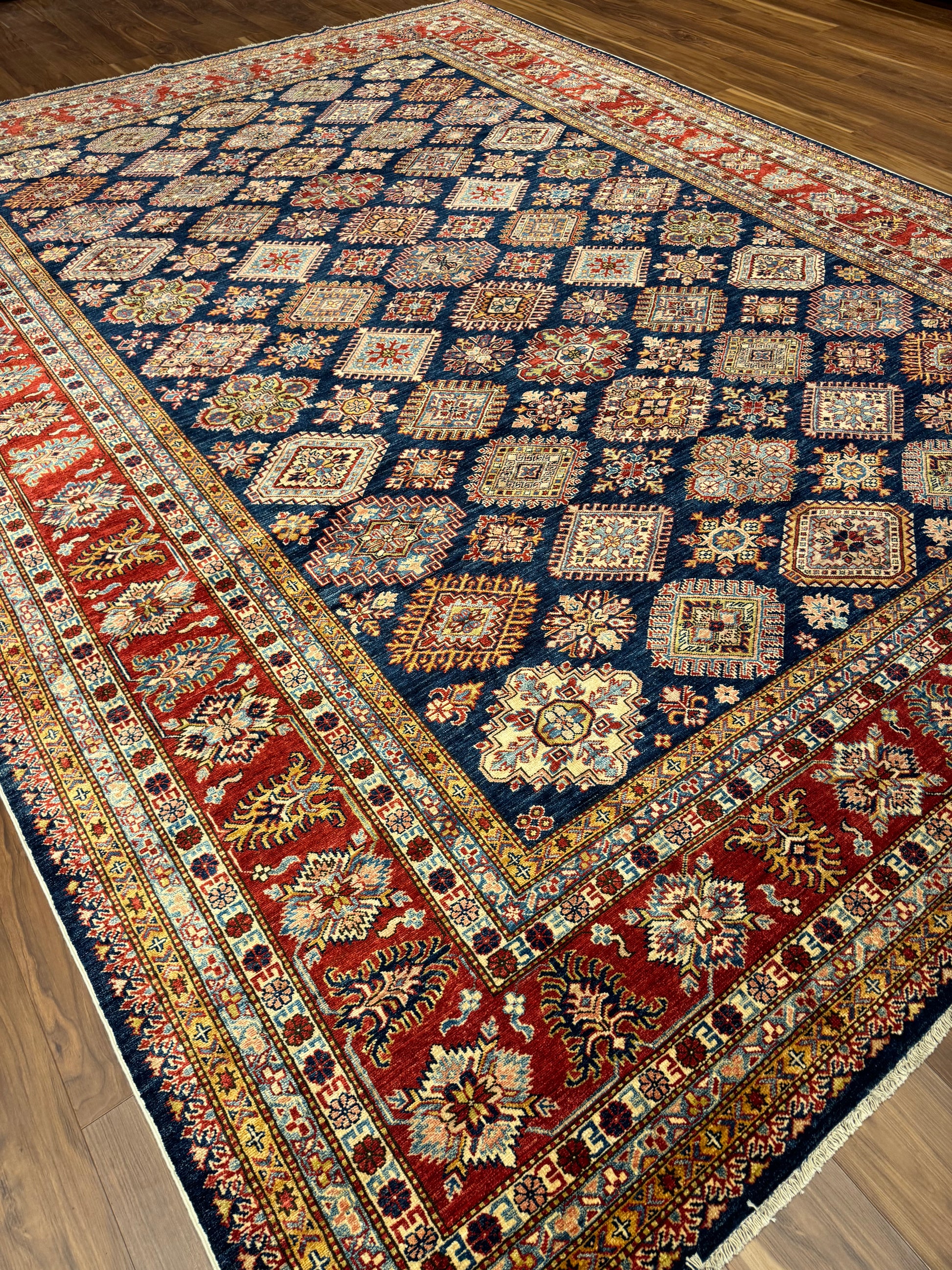 This exquisite Kazak (Ararat) rug exhibits a blend of rich, deep colors and a series of geometric motifs that bring a sense of vibrancy and tradition to any space. With its dense weave and intricate designs, each element tells a story, invoking the heritage of Armenian craftsmanship. The precise patterns, using navy blue, red, and gold hues, create a harmonious composition that is both captivating and timeless. This woolen rug, crafted with exceptional skill, offers durability and comfort, making it a practical choice for daily use while maintaining its cultural narrative and decorative appeal.