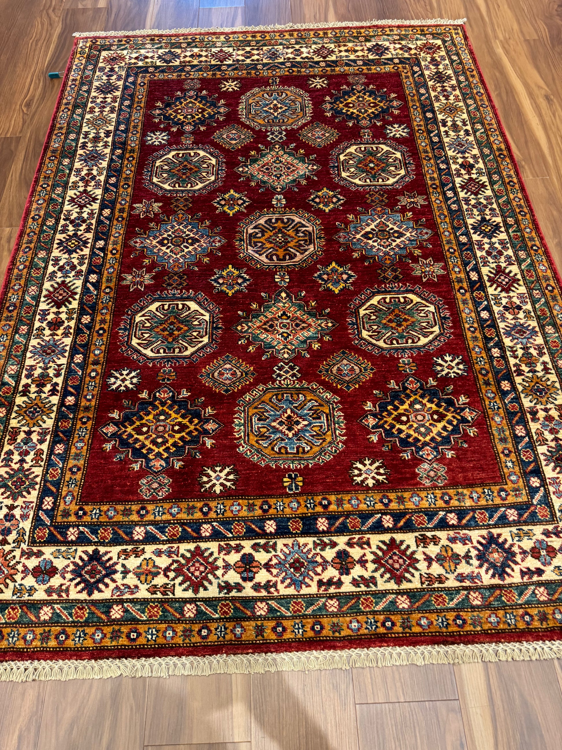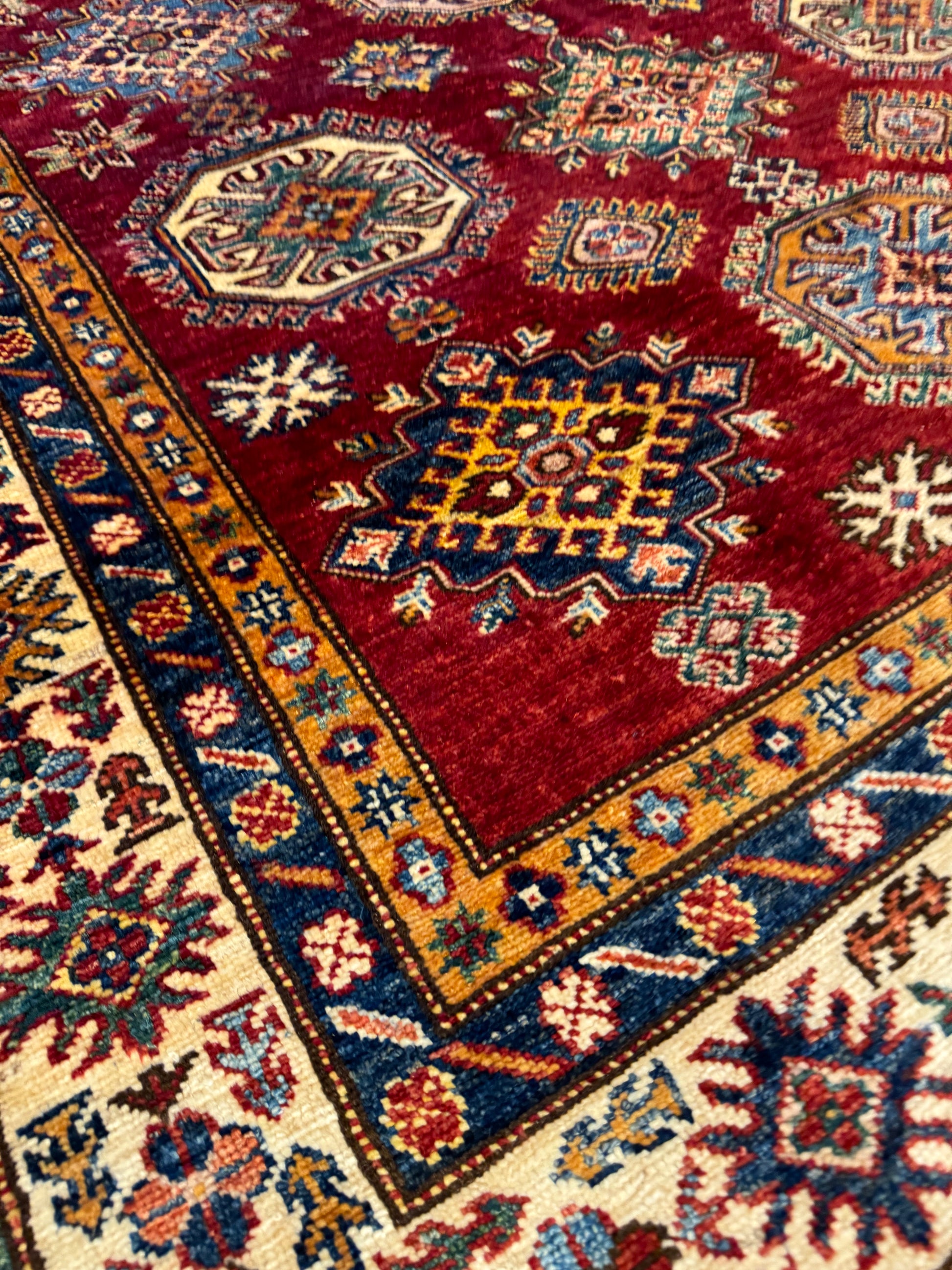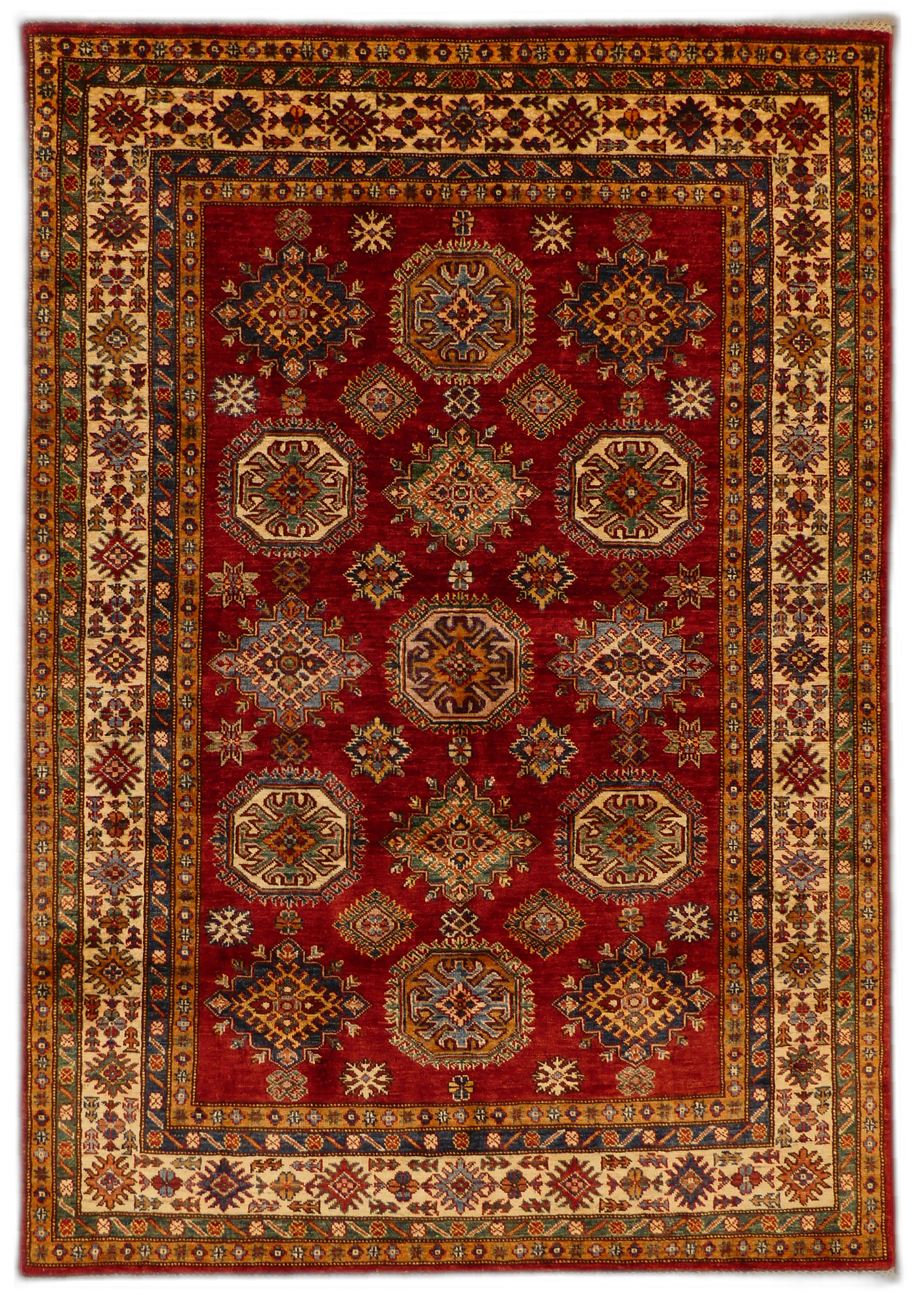 This exquisite Kazak rug boasts a traditional hand-knotted design with geometric patterns. Its rich, red field is adorned with a series of intricate, symmetrical medallions, meticulously detailed with accents of blue, beige, and hints of orange. The broad beige border, complemented by minor guards featuring detailed motifs, frames the central composition, enhancing its visual appeal. Crafted from high-quality wool, this rug promises durability and a luxuriously soft underfoot experience, making it a magnificent choice for collectors and interior design enthusiasts alike.