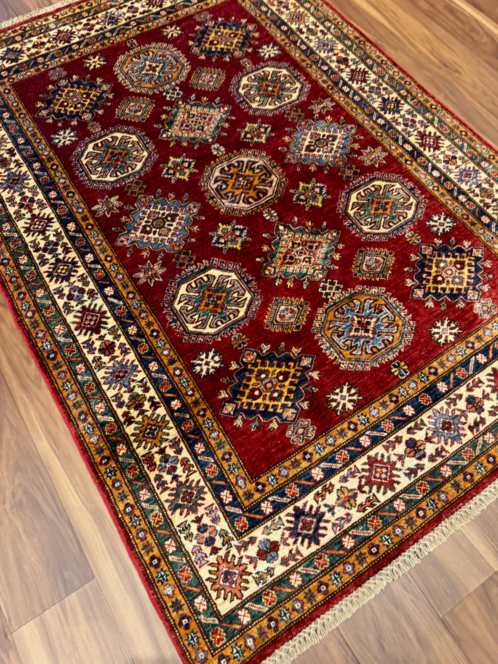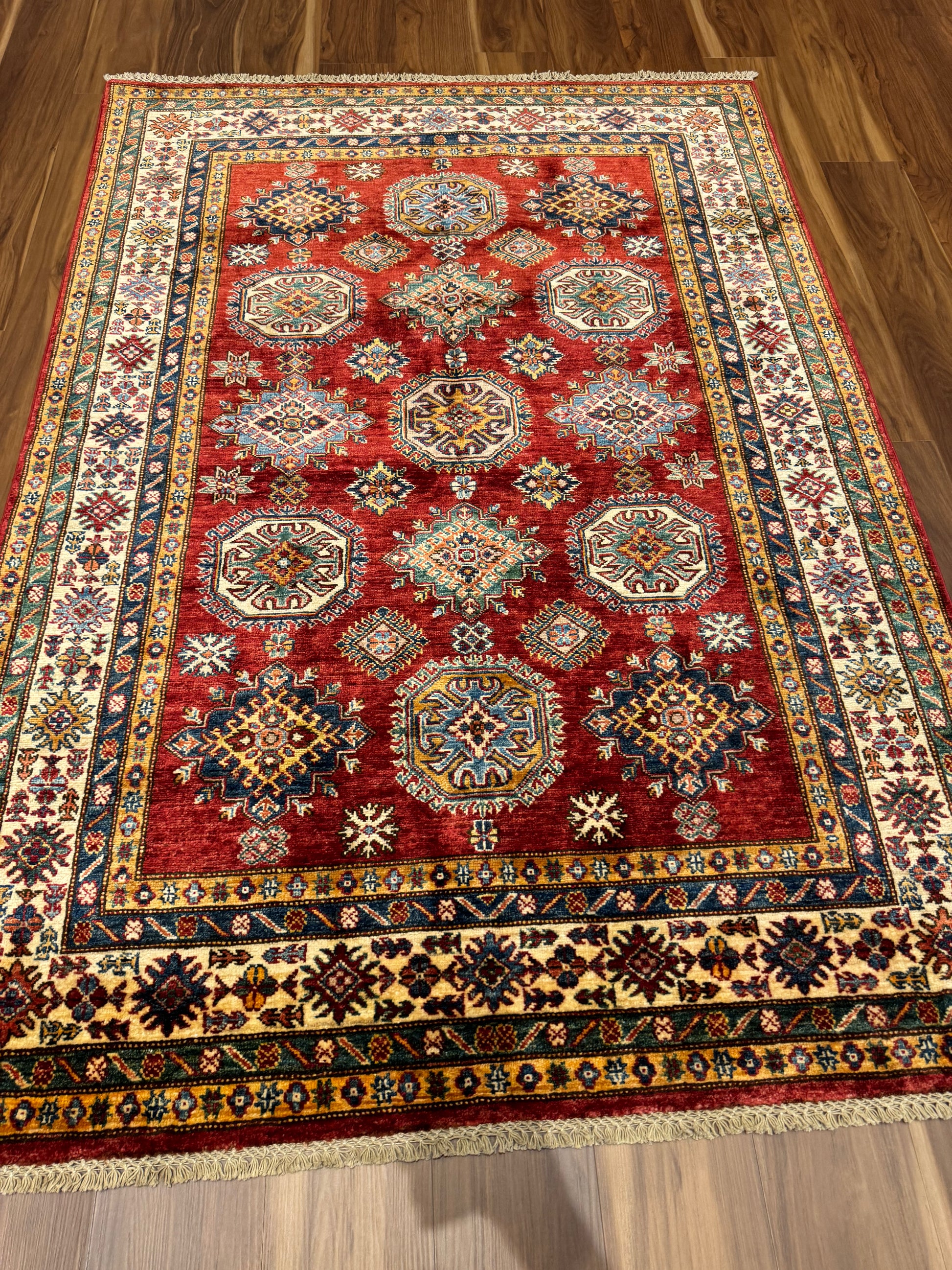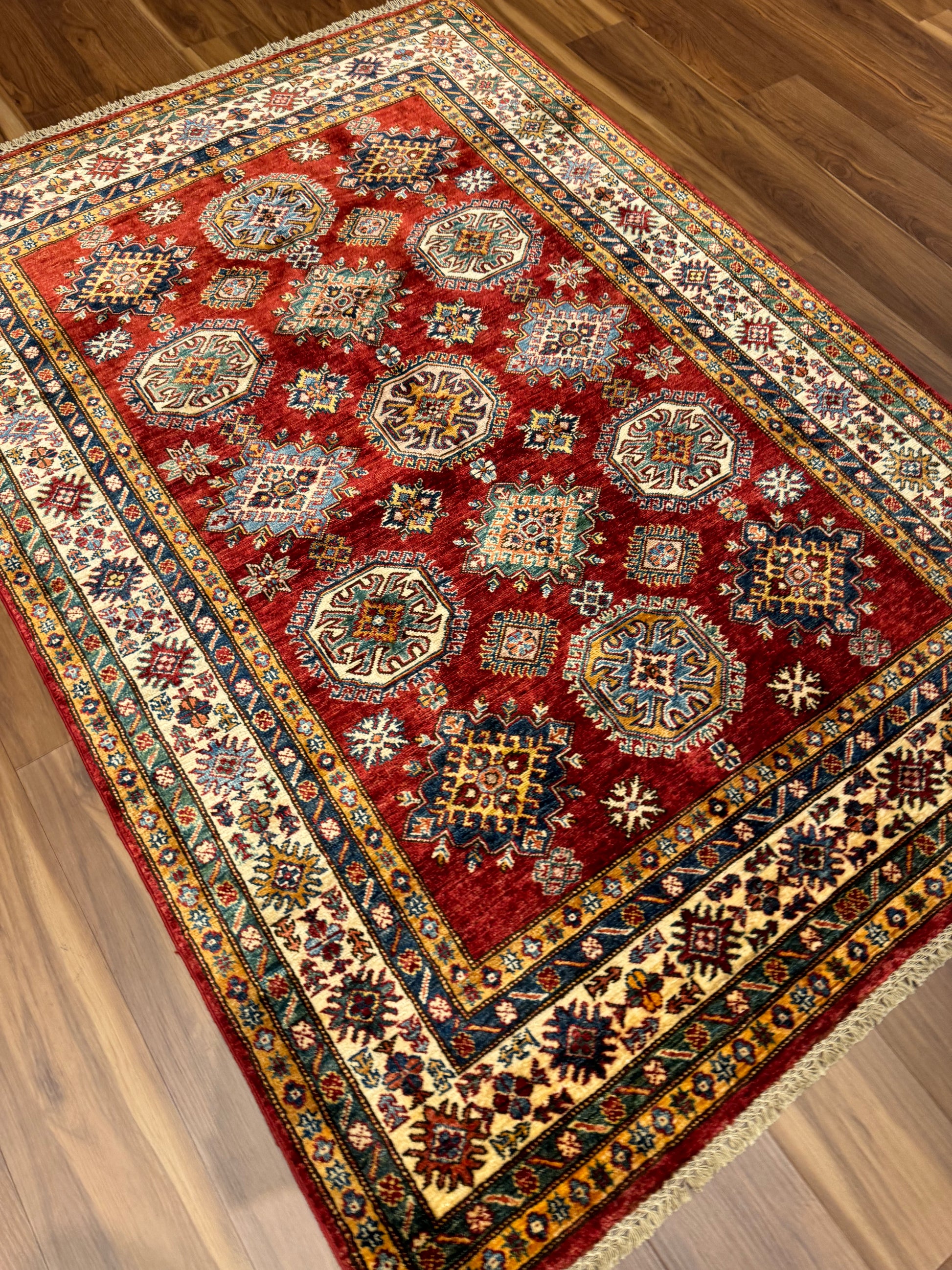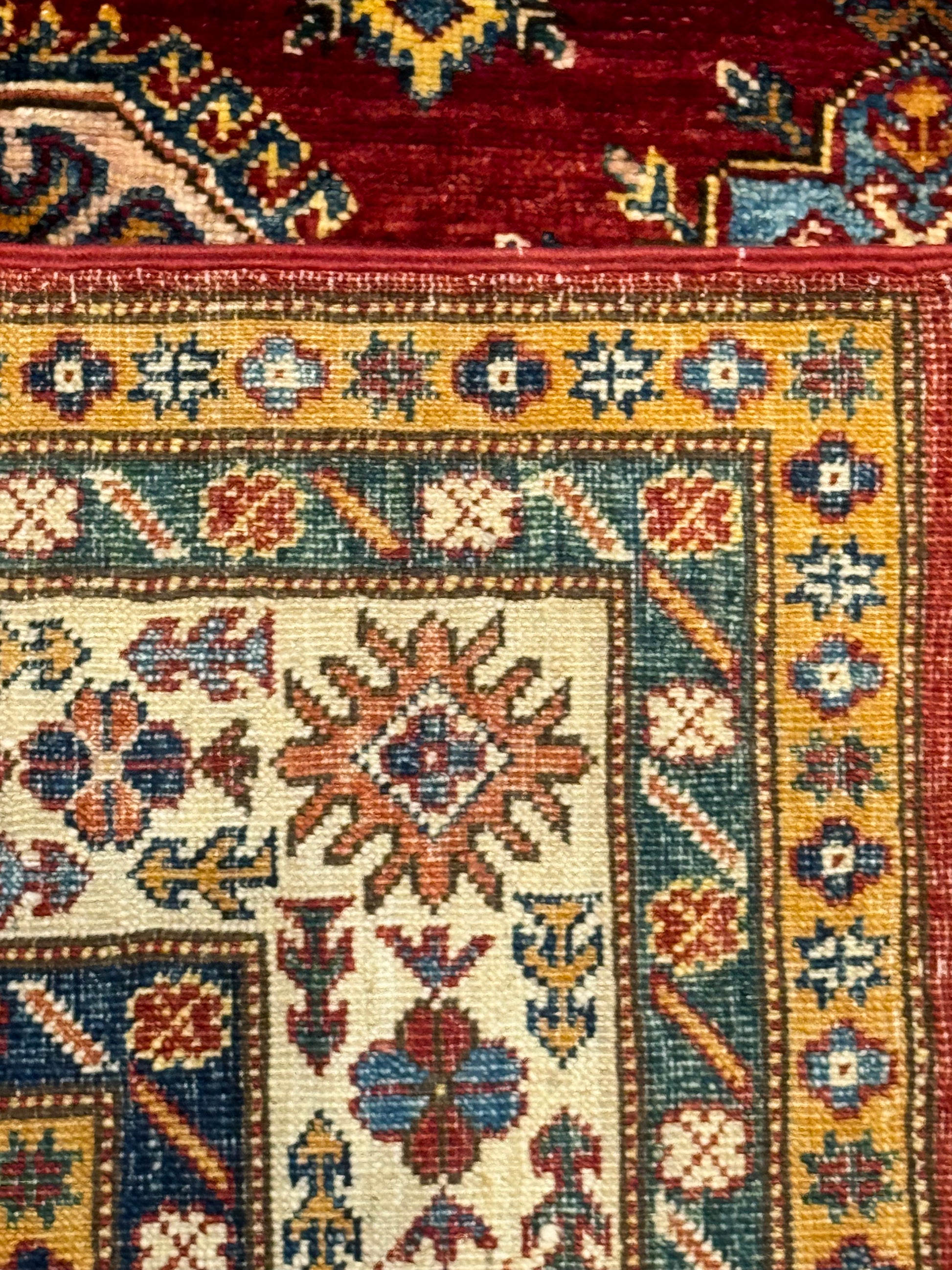 This exquisite Kazak rug boasts a traditional hand-knotted design with geometric patterns. Its rich, red field is adorned with a series of intricate, symmetrical medallions, meticulously detailed with accents of blue, beige, and hints of orange. The broad beige border, complemented by minor guards featuring detailed motifs, frames the central composition, enhancing its visual appeal. Crafted from high-quality wool, this rug promises durability and a luxuriously soft underfoot experience, making it a magnificent choice for collectors and interior design enthusiasts alike.