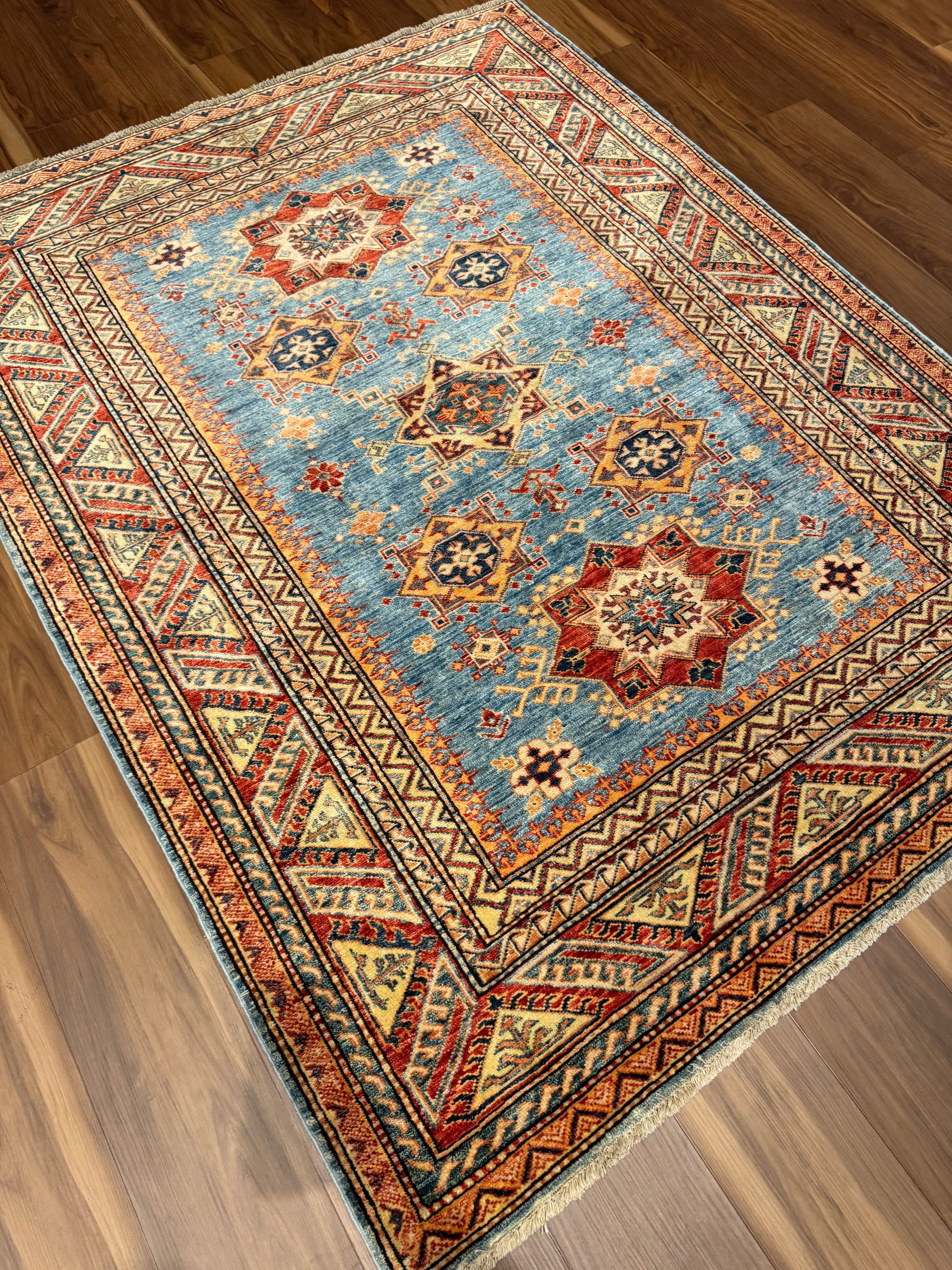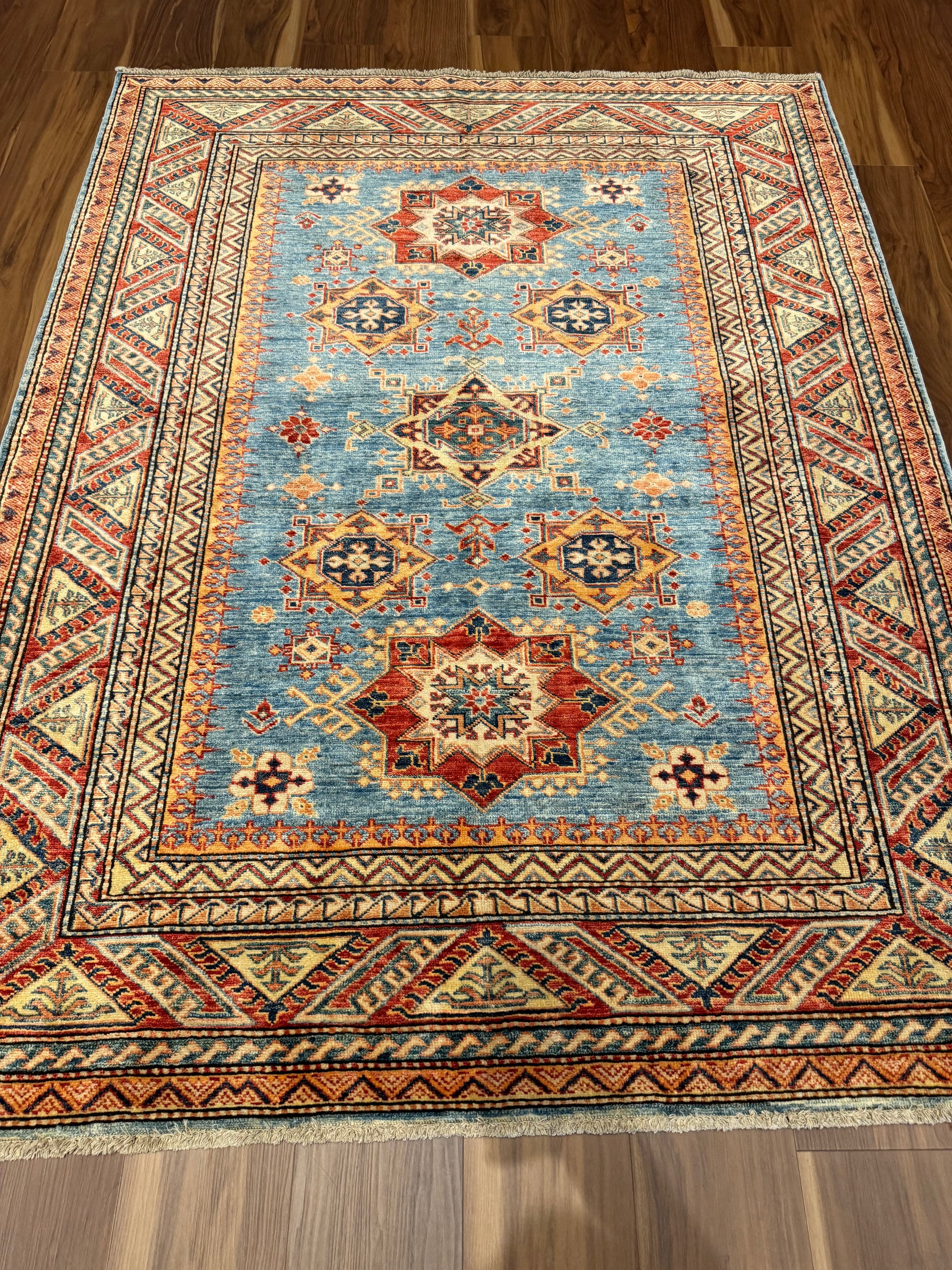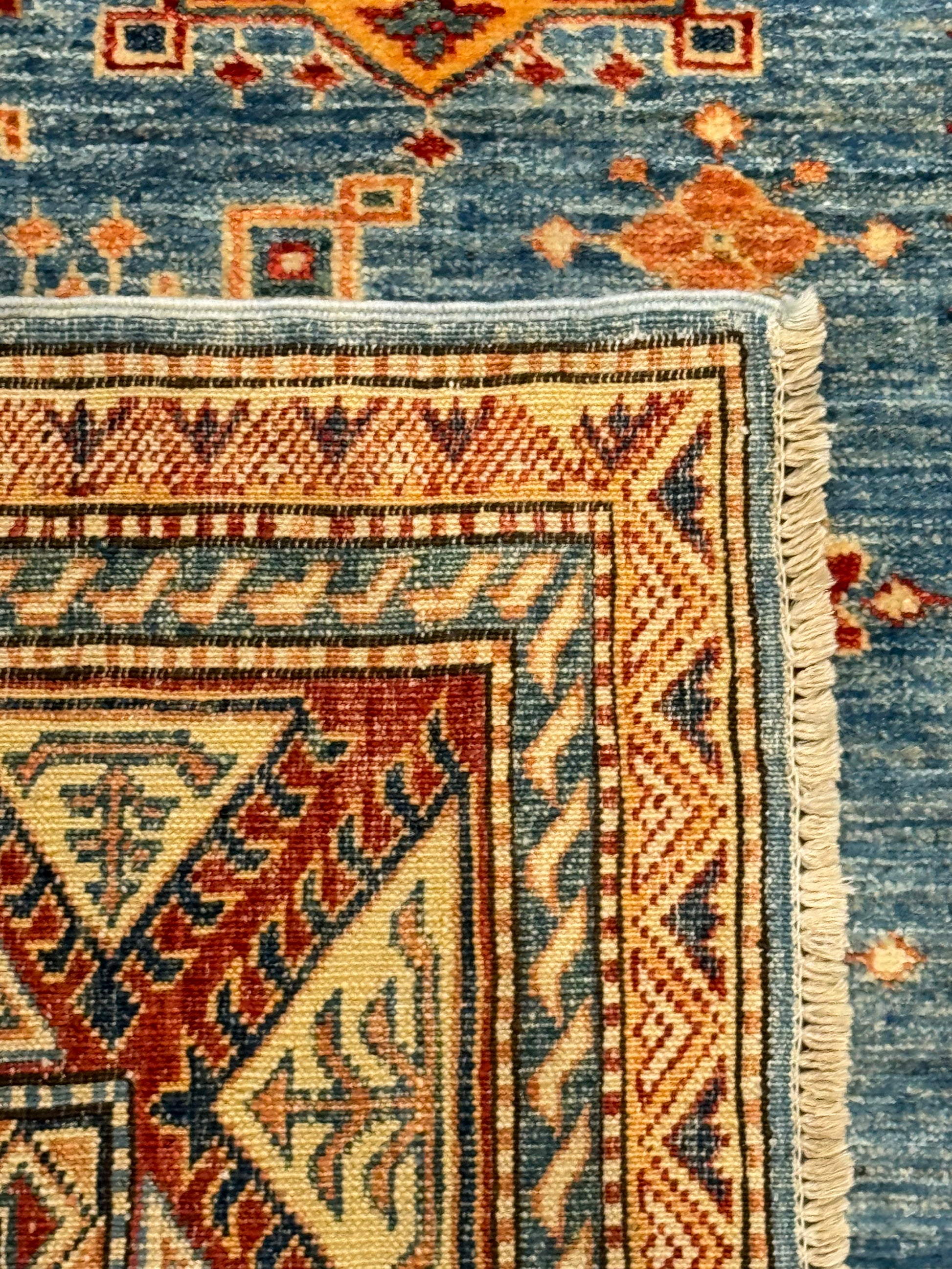 This Wool Kazak rug features a harmonious blend of traditional design and modern craftsmanship. The central pattern showcases bold, geometric medallions in warm hues of red and beige that contrast beautifully against the deep blue field, framed by an intricate border. Handwoven with precision, it exudes a sense of history and artisanal skill. This rug is ideal for adding a touch of timeless elegance to any living space.