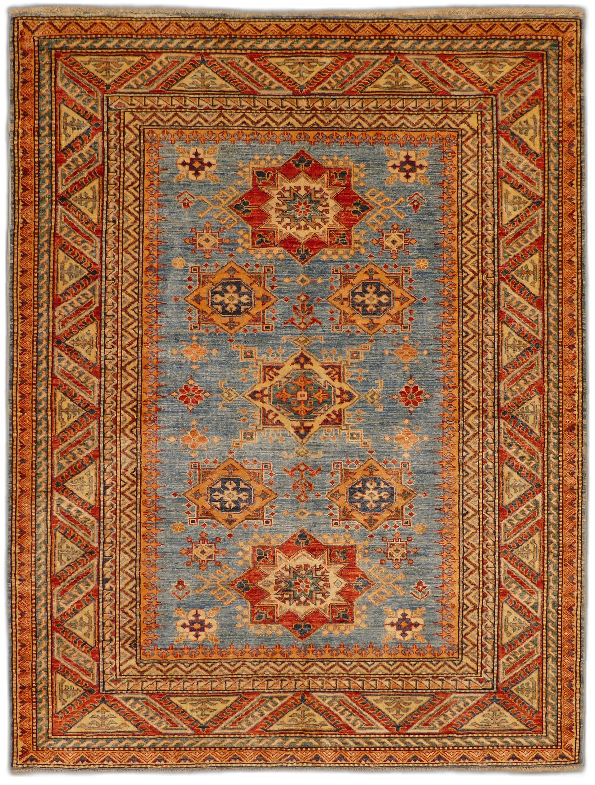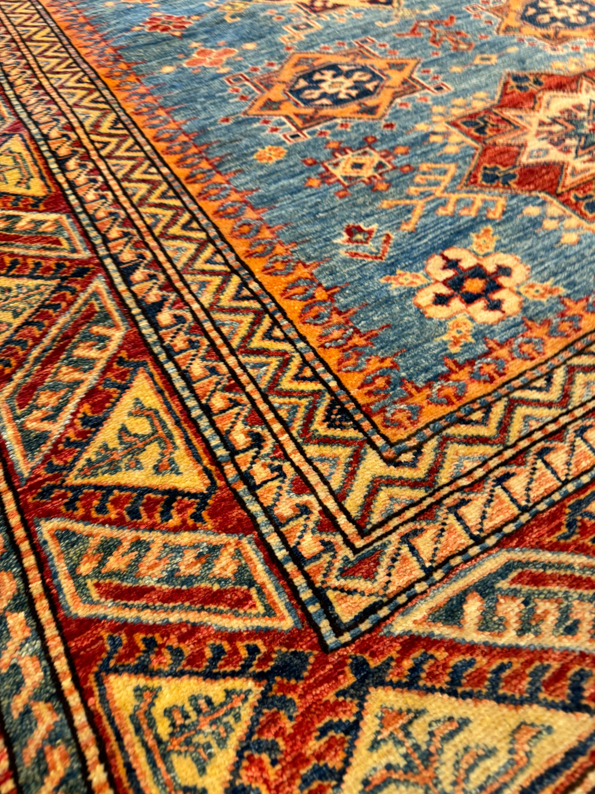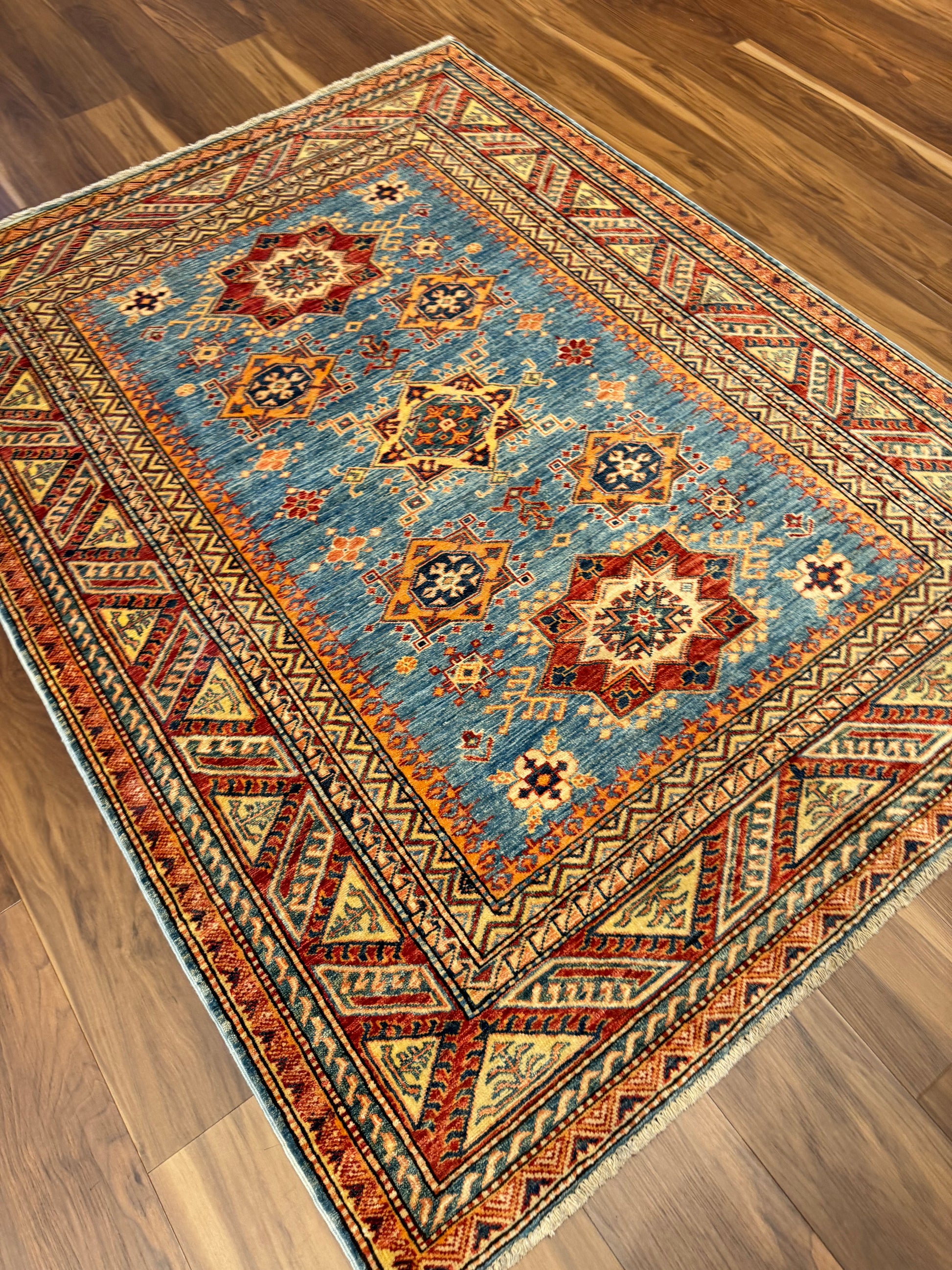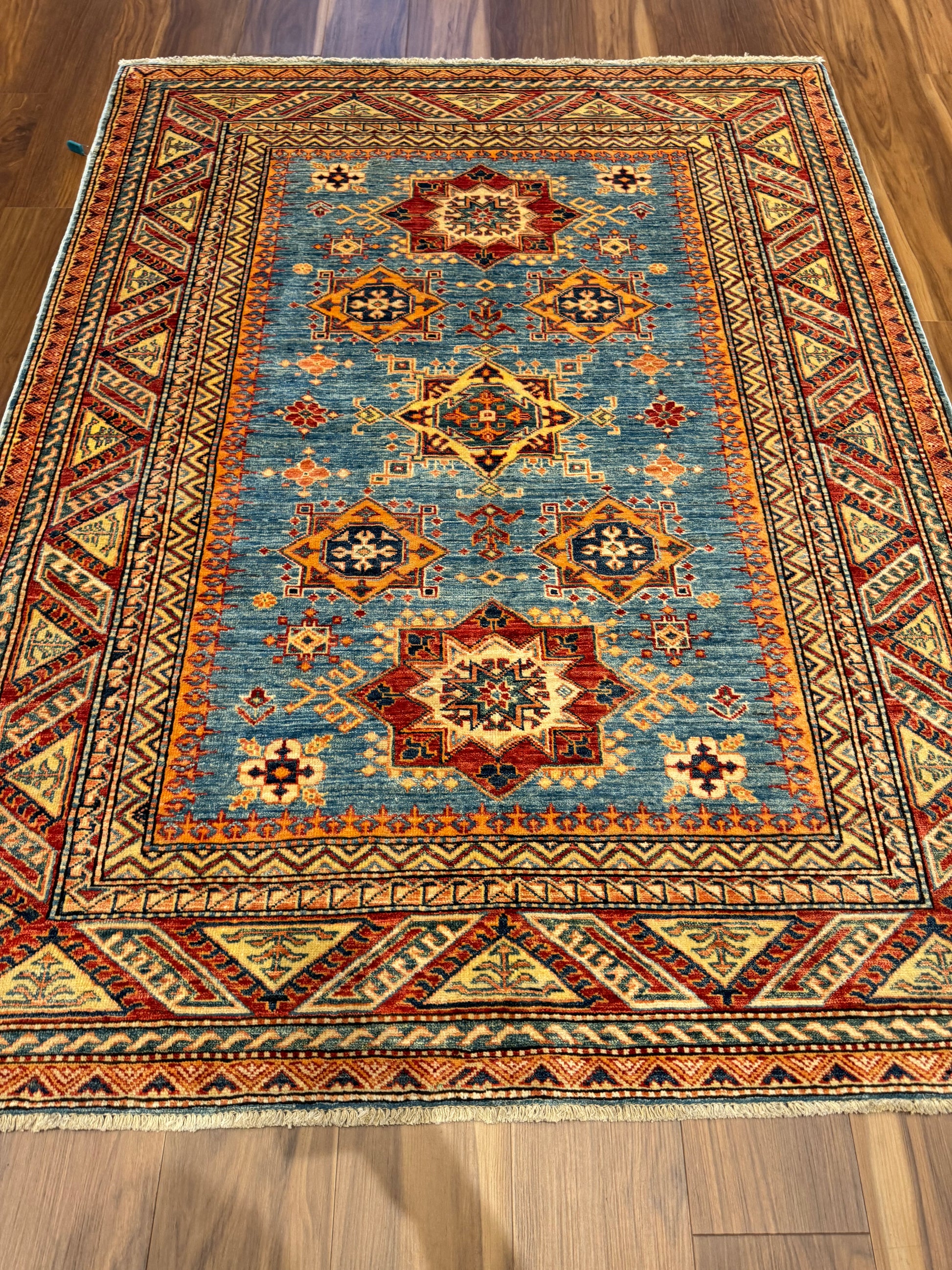 This Wool Kazak rug features a harmonious blend of traditional design and modern craftsmanship. The central pattern showcases bold, geometric medallions in warm hues of red and beige that contrast beautifully against the deep blue field, framed by an intricate border. Handwoven with precision, it exudes a sense of history and artisanal skill. This rug is ideal for adding a touch of timeless elegance to any living space.