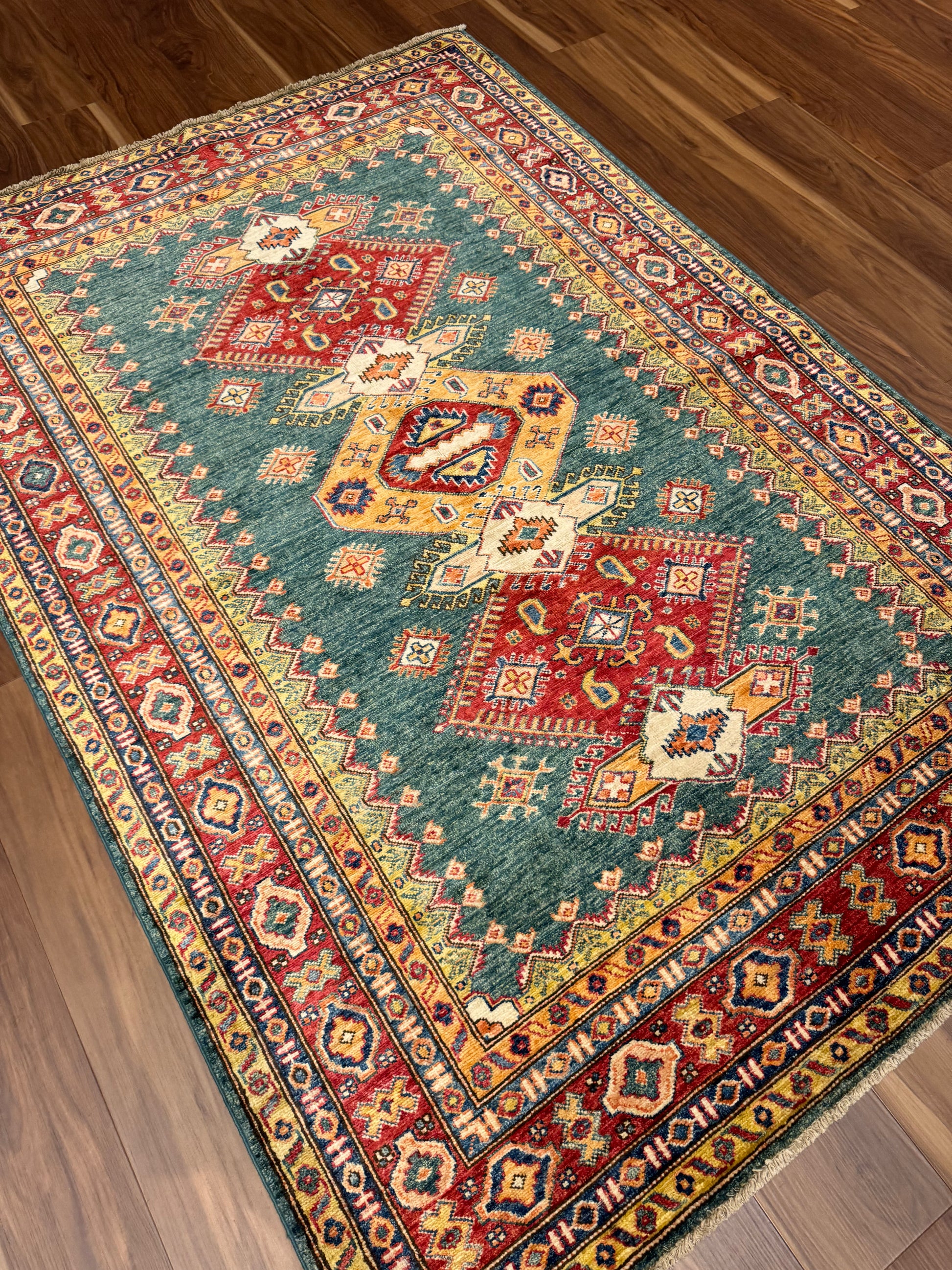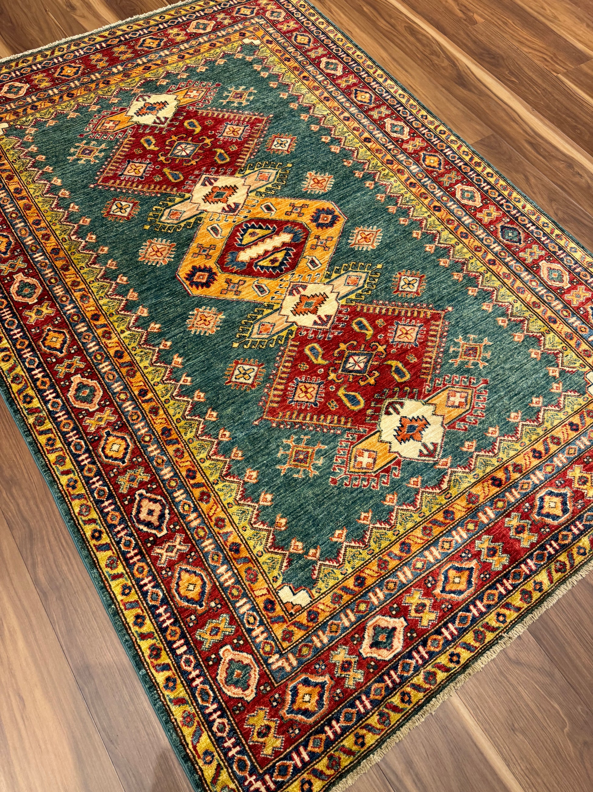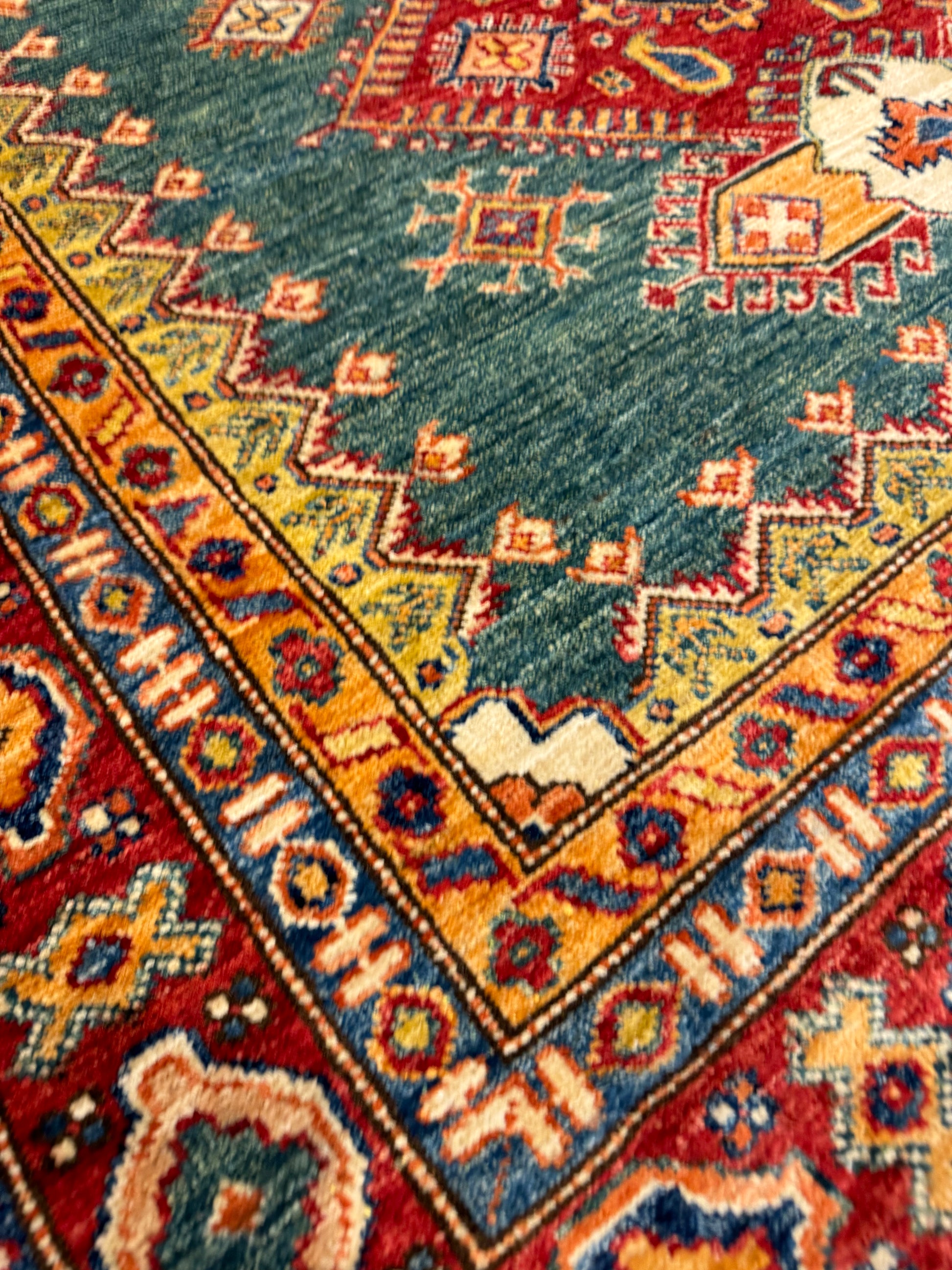 This exquisite Kazak rug features a traditional handwoven design known for its bold, tribal patterns and vibrant colors. Crafted from the finest wool, it displays geometric medallions, compelling border patterns, and a deep, rich palette that adds warmth and sophistication to any room. Its durable construction ensures it can withstand high traffic, making it a timeless piece for your collection.