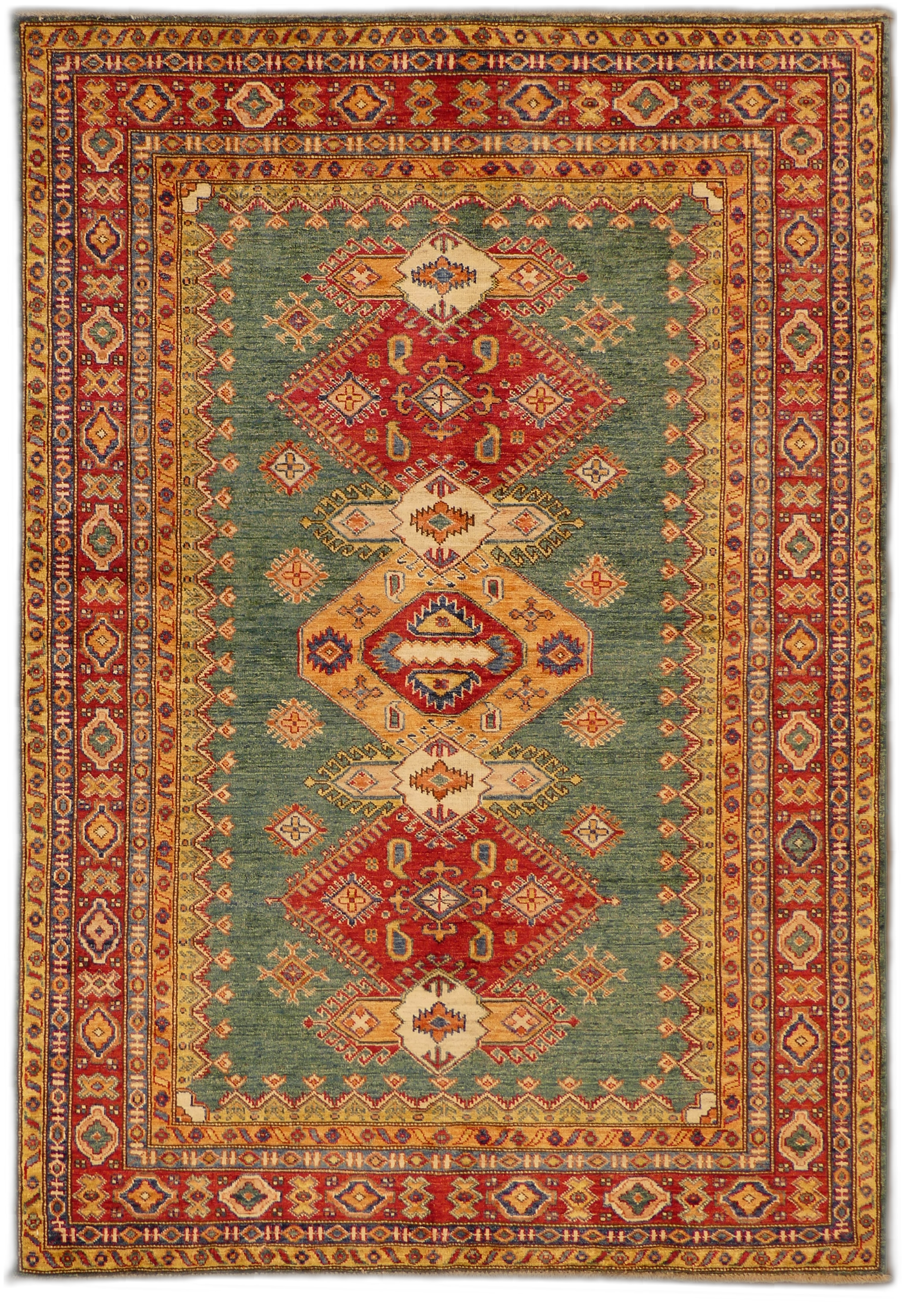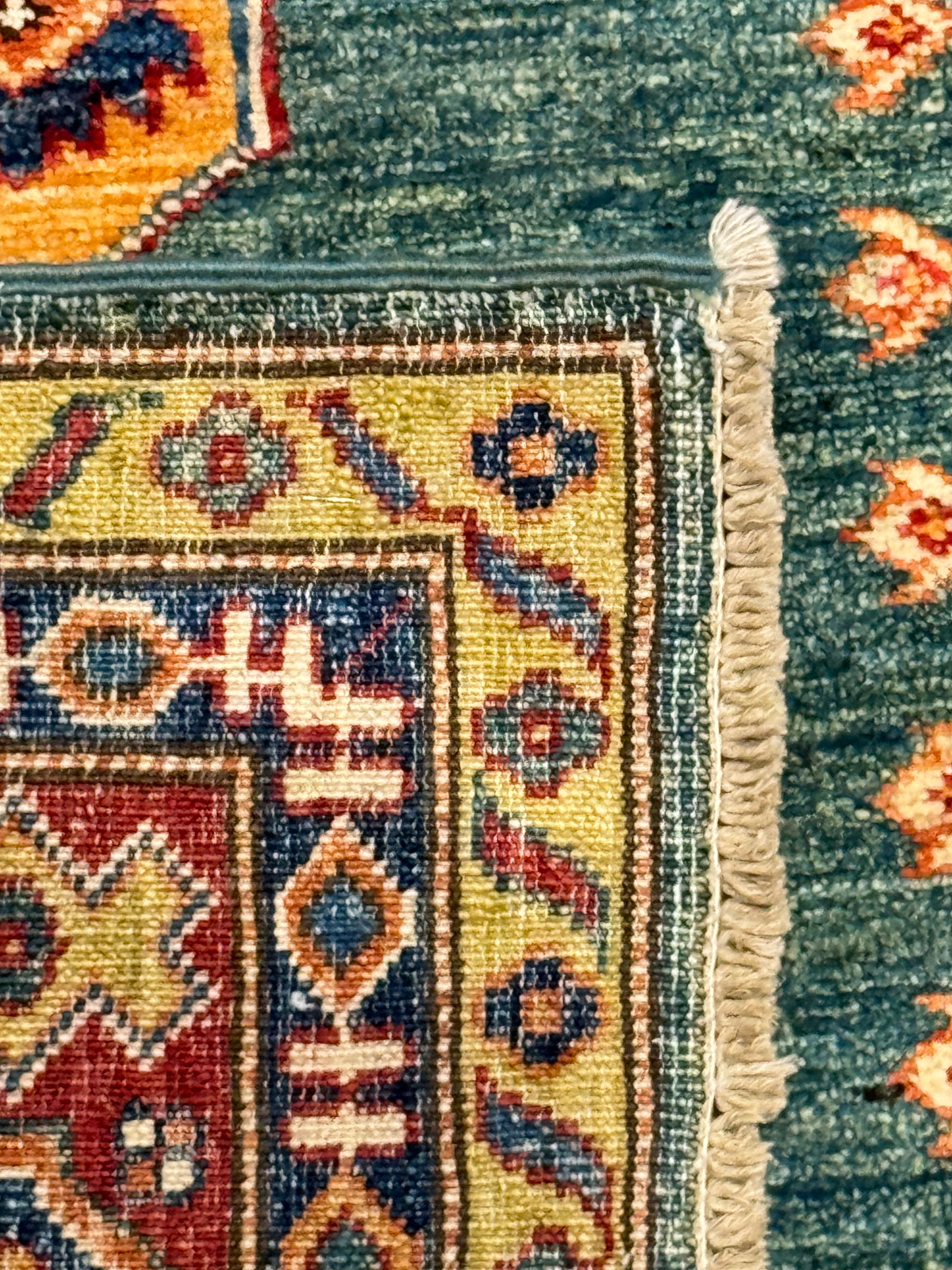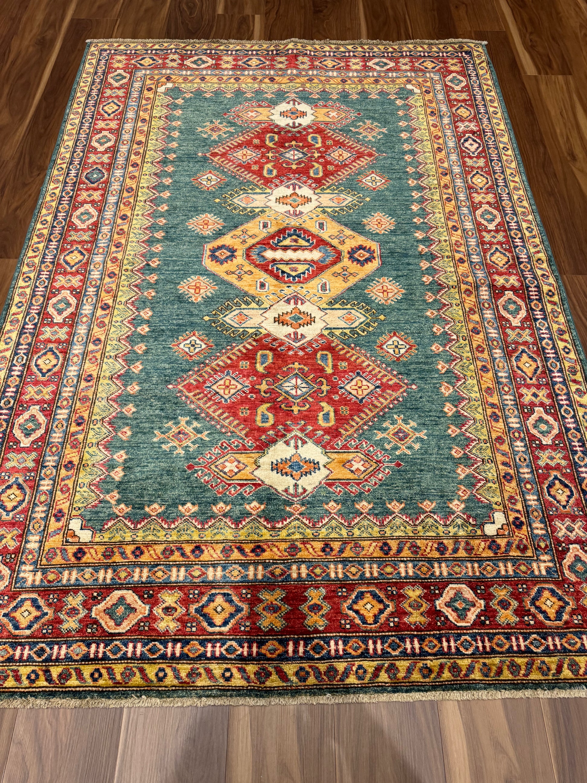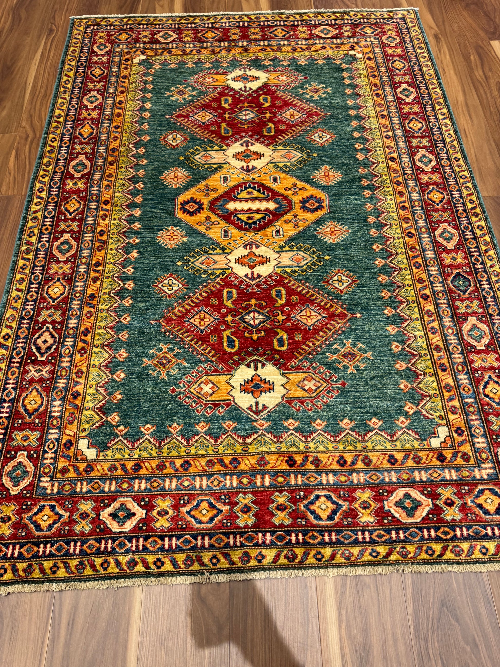 This exquisite Kazak rug features a traditional handwoven design known for its bold, tribal patterns and vibrant colors. Crafted from the finest wool, it displays geometric medallions, compelling border patterns, and a deep, rich palette that adds warmth and sophistication to any room. Its durable construction ensures it can withstand high traffic, making it a timeless piece for your collection.