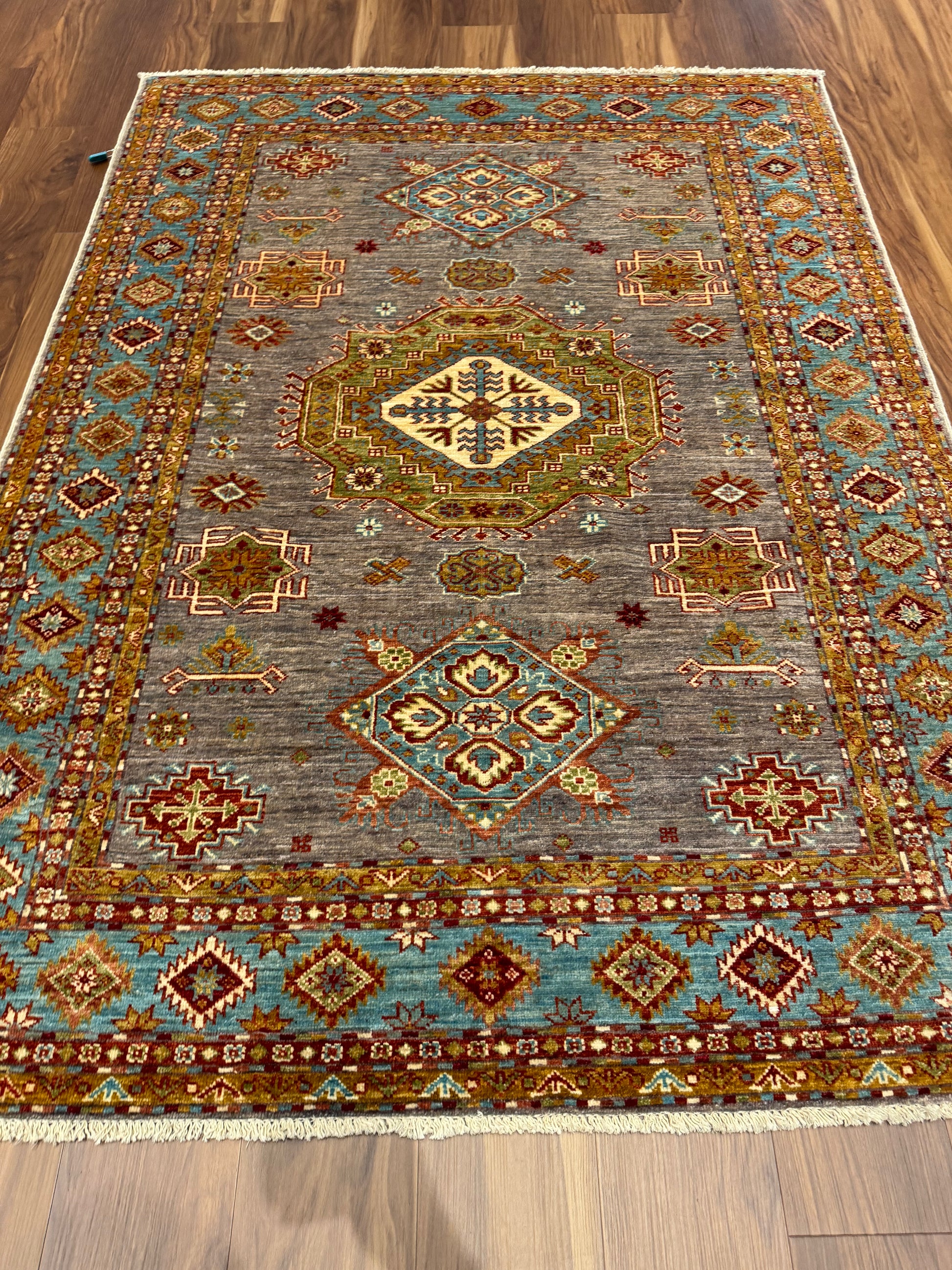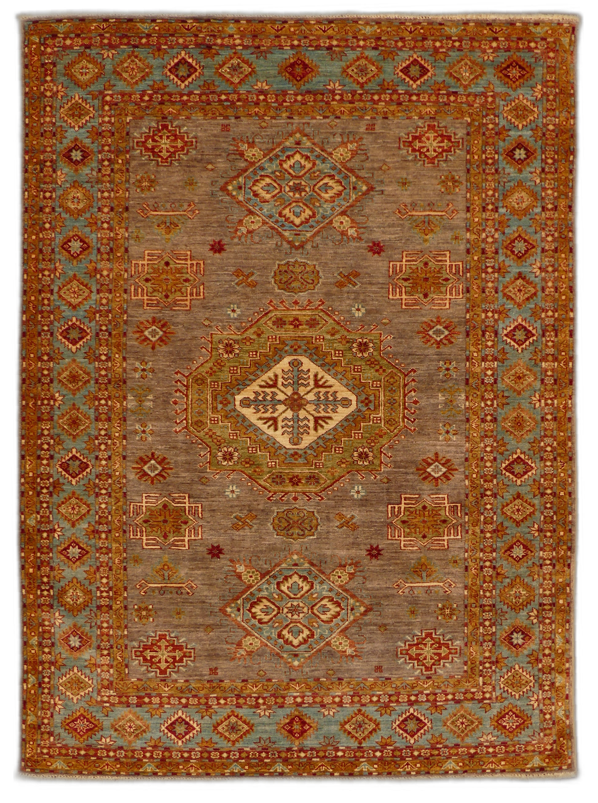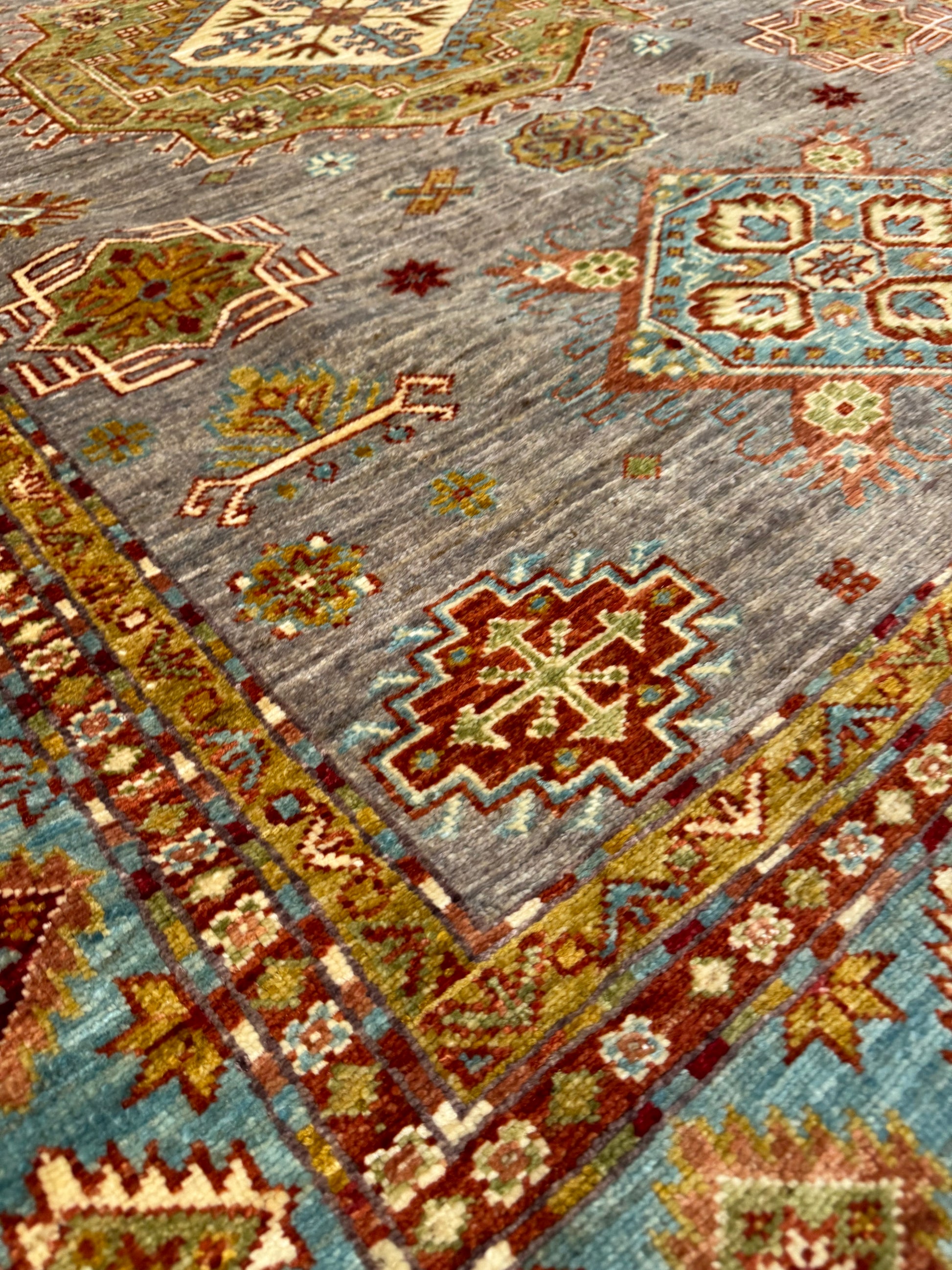 Experience the timelessness of a traditional handcrafted Kazak rug, expertly woven from high-quality wool. This piece features a medley of rustic rust, tranquil blue, and warm beige tones, complemented by ivory accents. The intricate geometric and tribal motifs symbolize authenticity and cultural heritage, with each knot telling a story of craftsmanship. Ideal for adding a touch of ethnic elegance to both contemporary and classic interiors, this rug promises durability and comfort underfoot, making it both a practical choice and a visual treat.