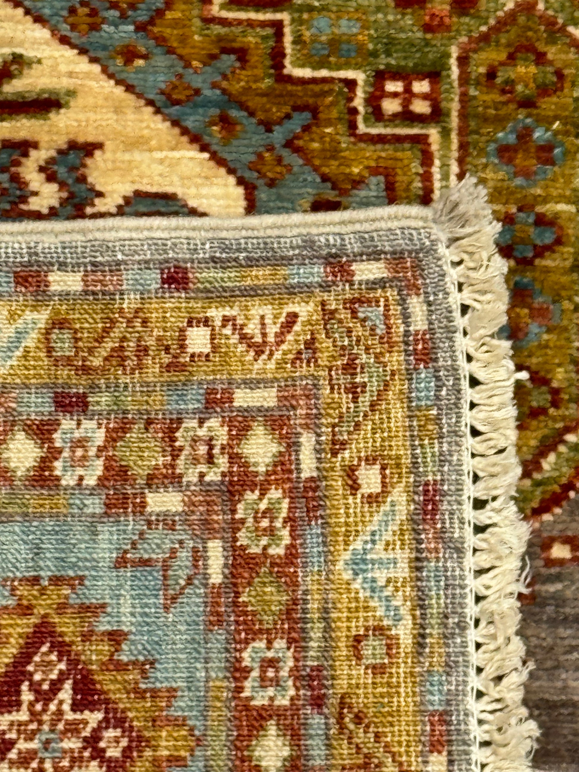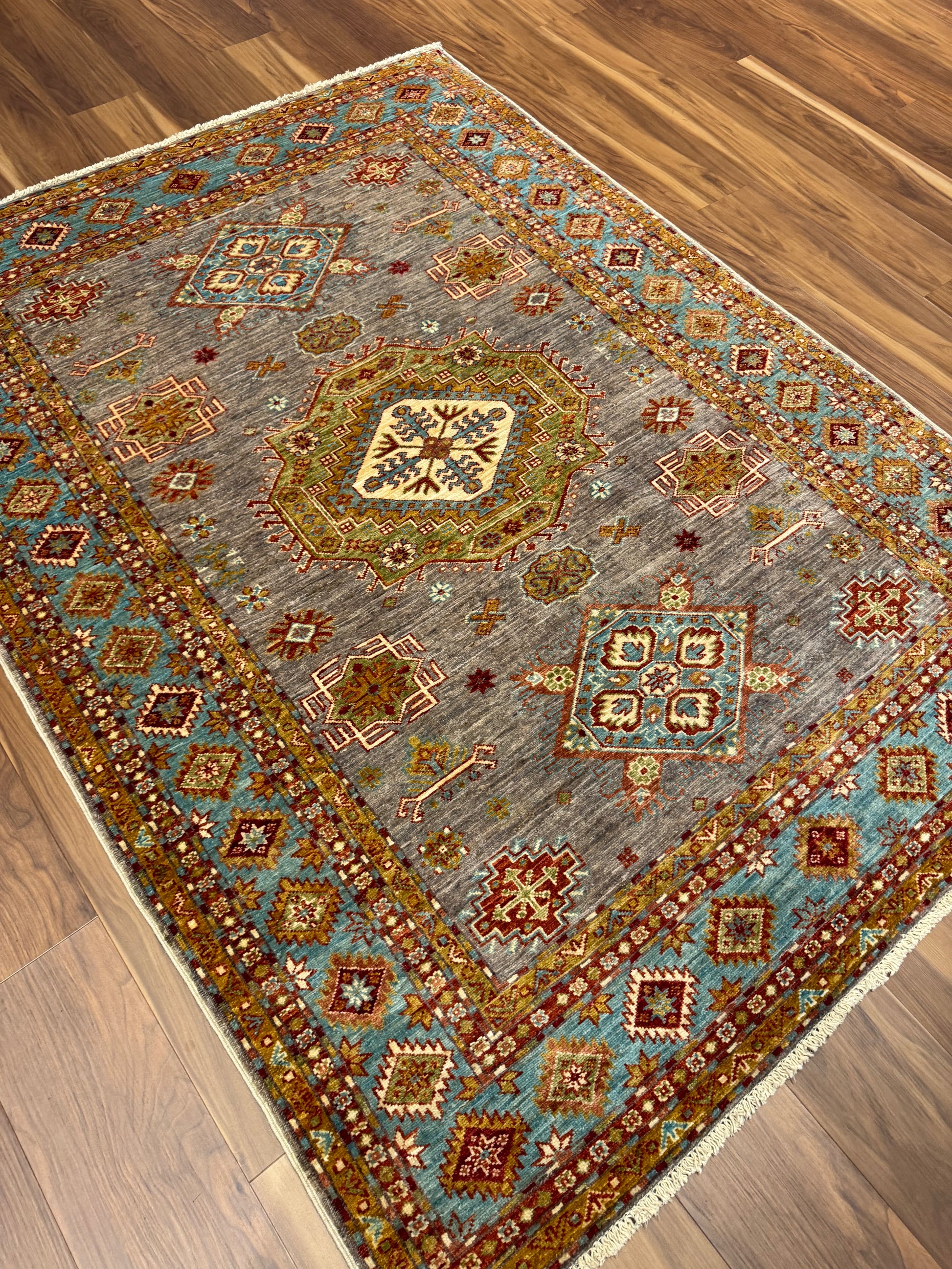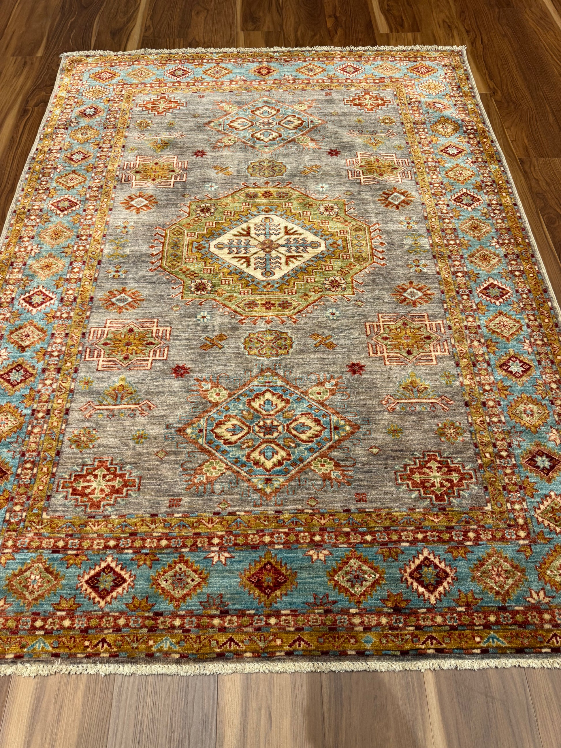 Experience the timelessness of a traditional handcrafted Kazak rug, expertly woven from high-quality wool. This piece features a medley of rustic rust, tranquil blue, and warm beige tones, complemented by ivory accents. The intricate geometric and tribal motifs symbolize authenticity and cultural heritage, with each knot telling a story of craftsmanship. Ideal for adding a touch of ethnic elegance to both contemporary and classic interiors, this rug promises durability and comfort underfoot, making it both a practical choice and a visual treat.
