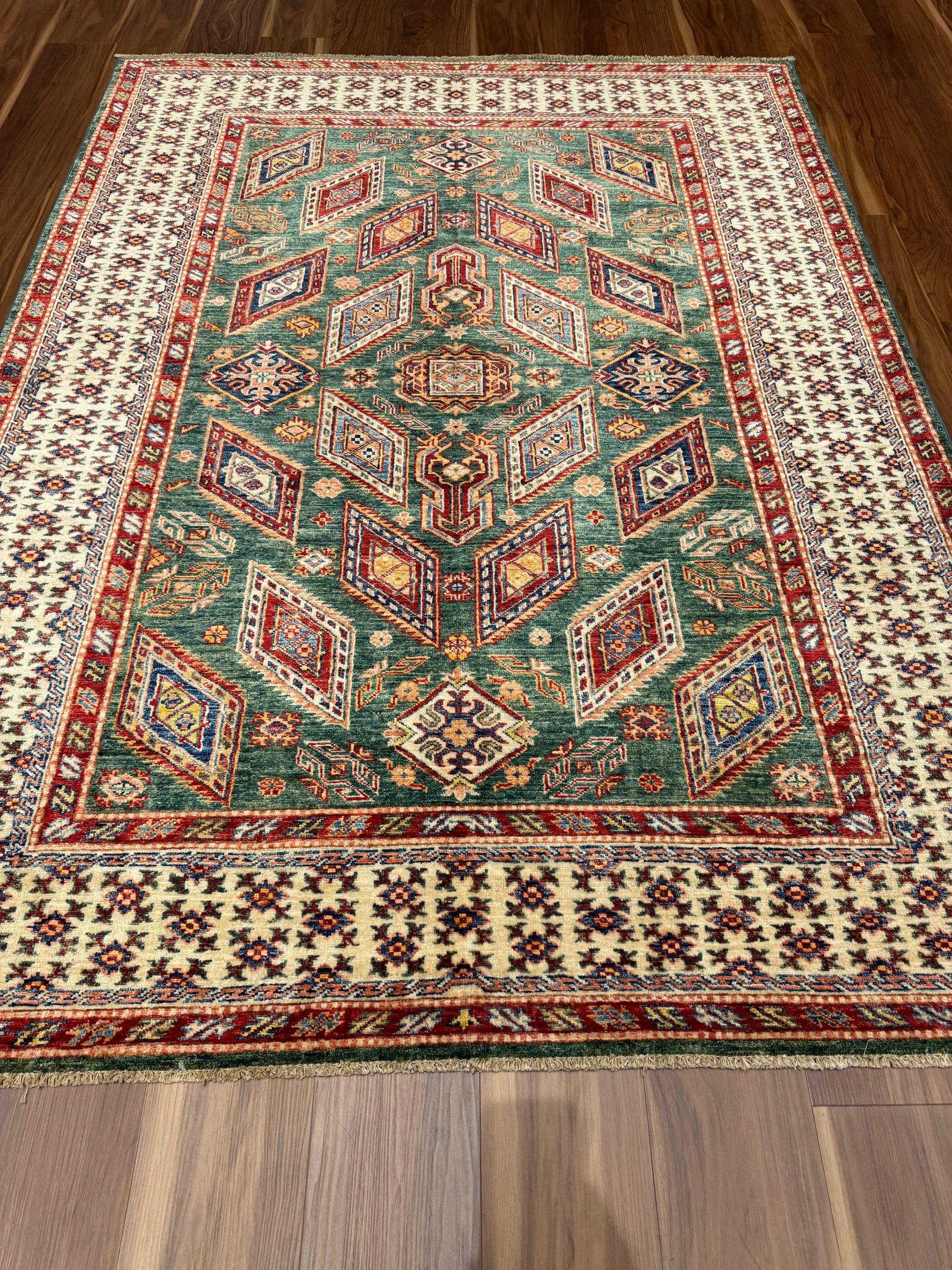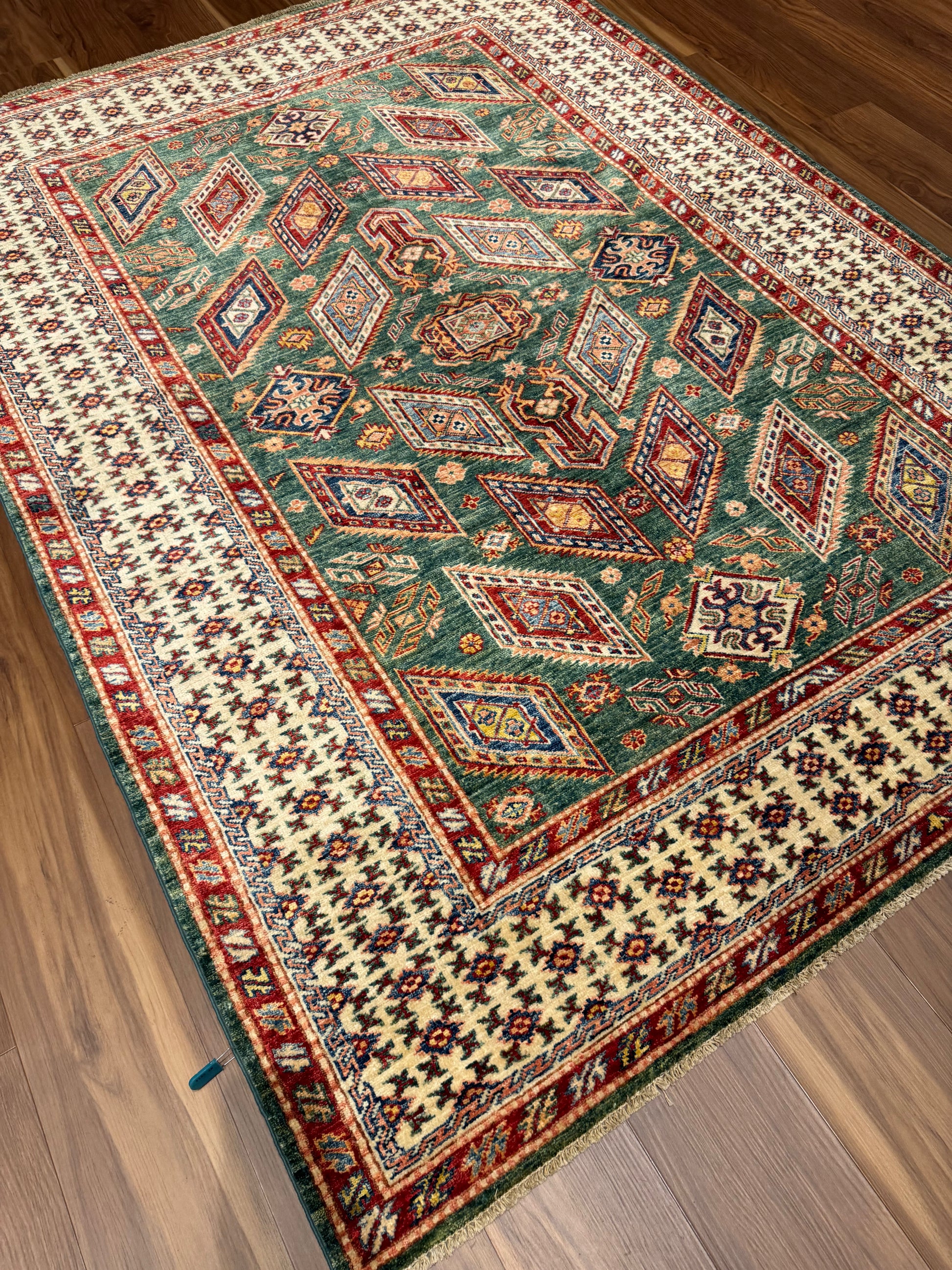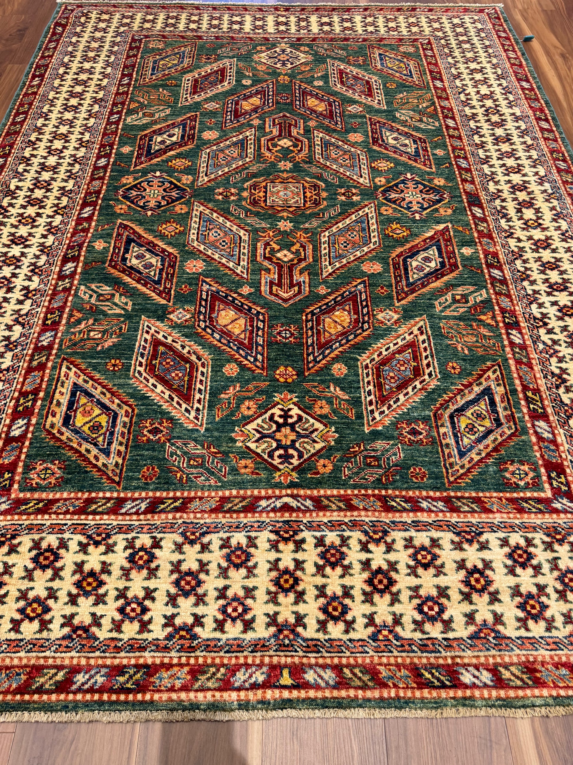 This exquisitely crafted Kazak rug, woven with high-quality wool, features a rich pattern of geometric motifs, traditional to the Kazak style. The piece showcases a symphony of vibrant reds, deep greens, and touches of blues and ivory, bringing a sense of energy and tradition to any room. The central field is complemented by intricate border detailing, enhancing the rug's visual appeal. Each knot is carefully tied to create a durable yet soft surface, testifying to the artisan's skill and dedication to their craft.