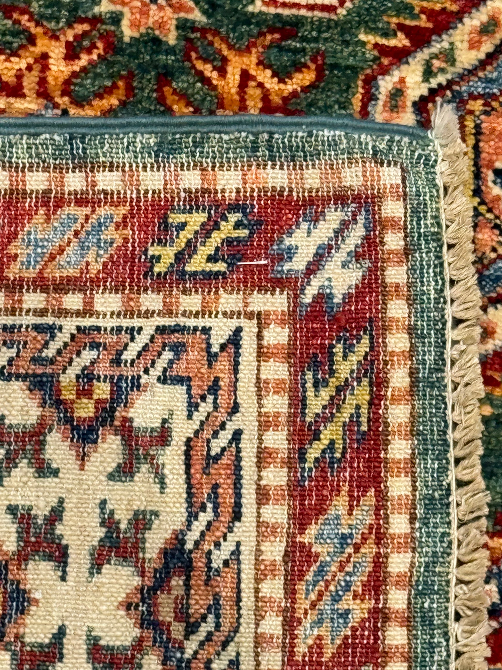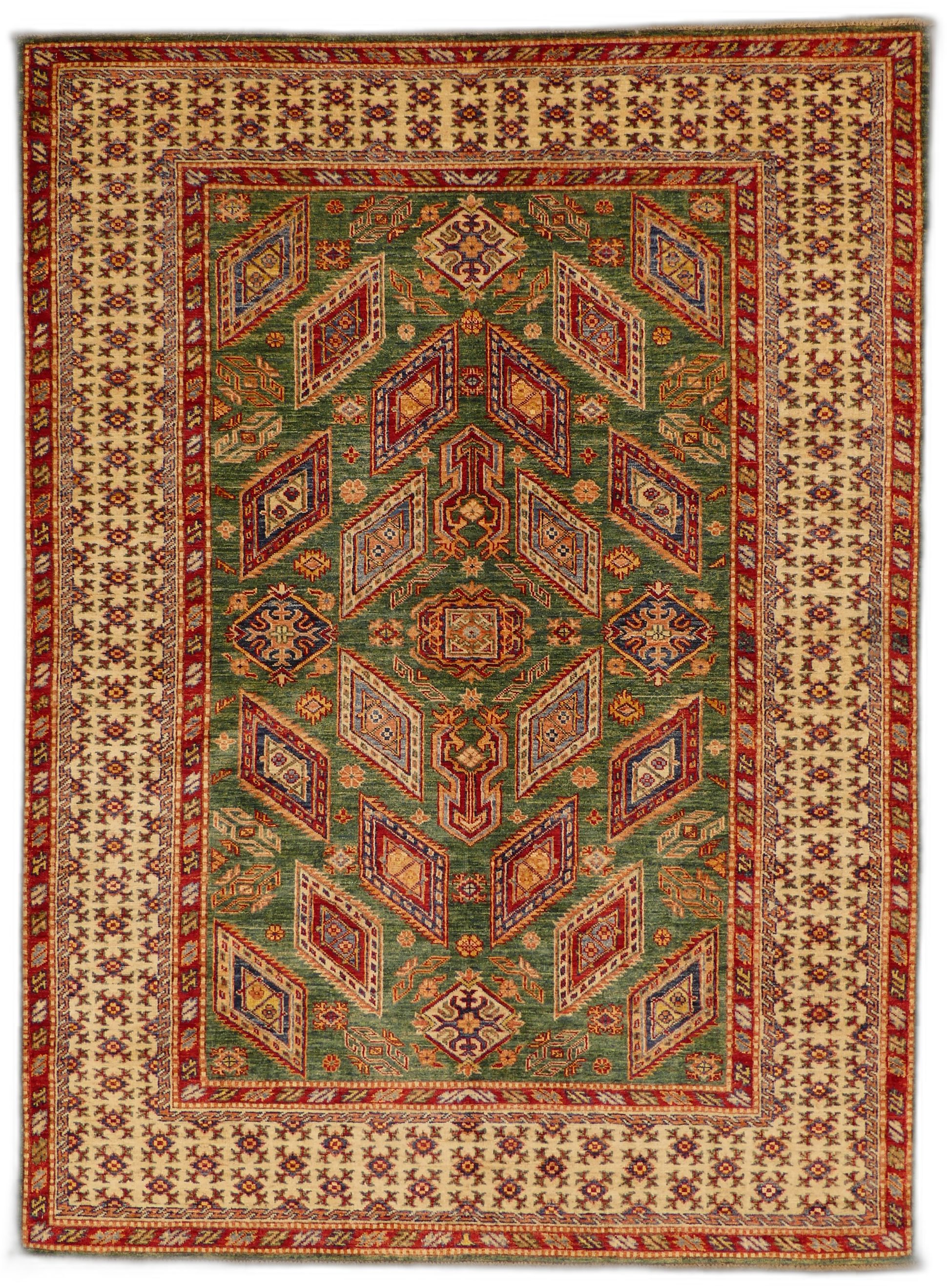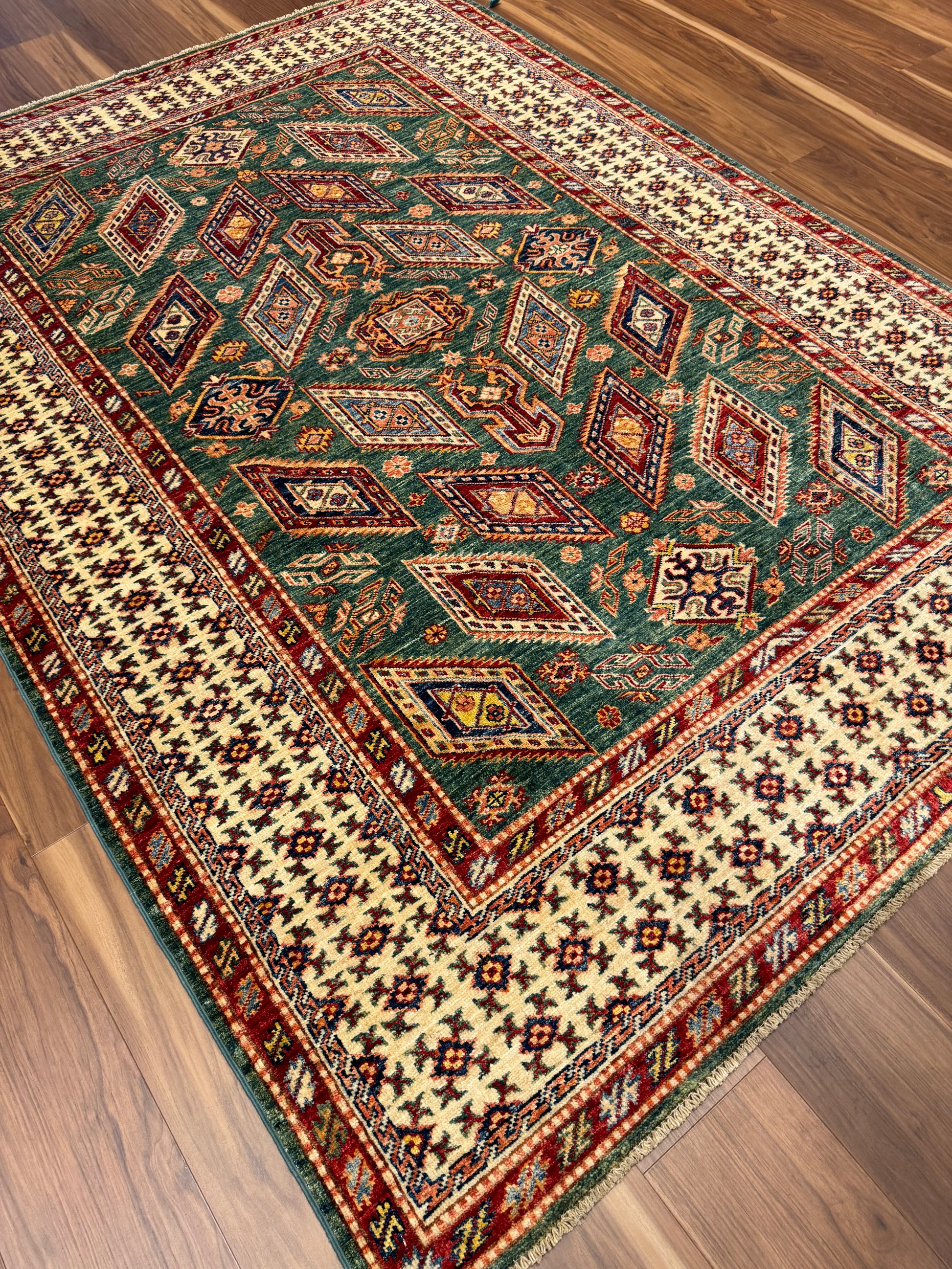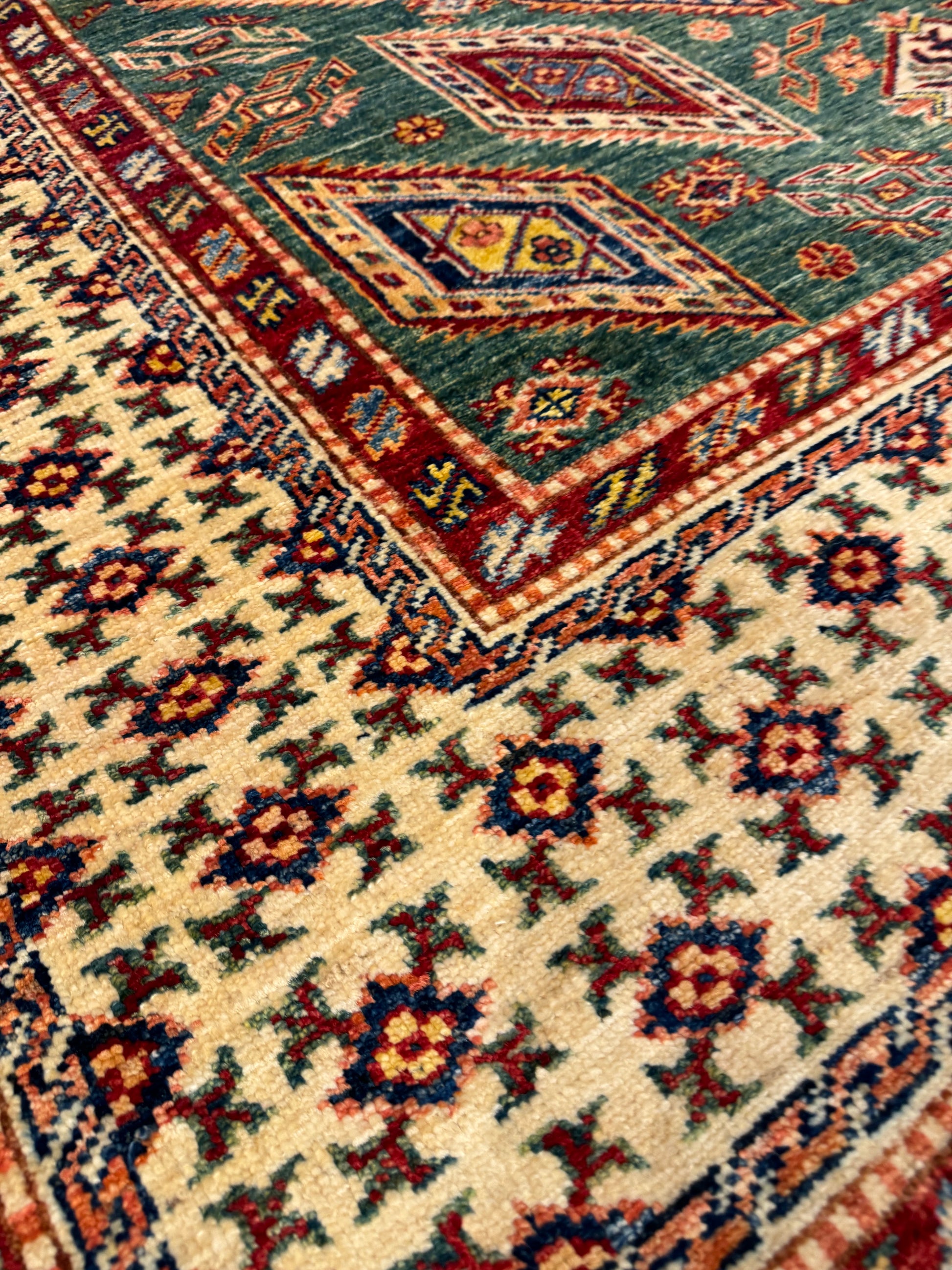 This exquisitely crafted Kazak rug, woven with high-quality wool, features a rich pattern of geometric motifs, traditional to the Kazak style. The piece showcases a symphony of vibrant reds, deep greens, and touches of blues and ivory, bringing a sense of energy and tradition to any room. The central field is complemented by intricate border detailing, enhancing the rug's visual appeal. Each knot is carefully tied to create a durable yet soft surface, testifying to the artisan's skill and dedication to their craft.