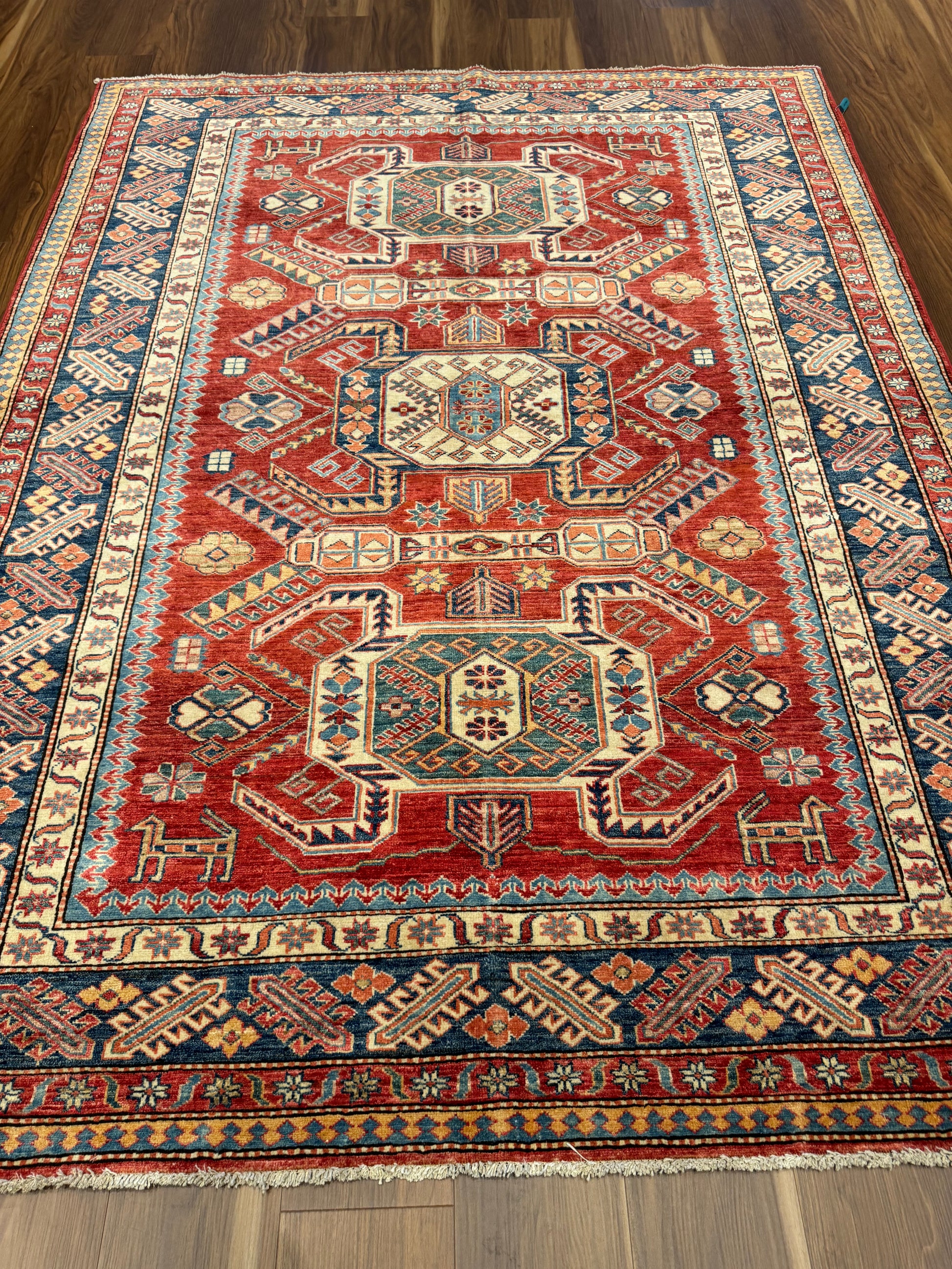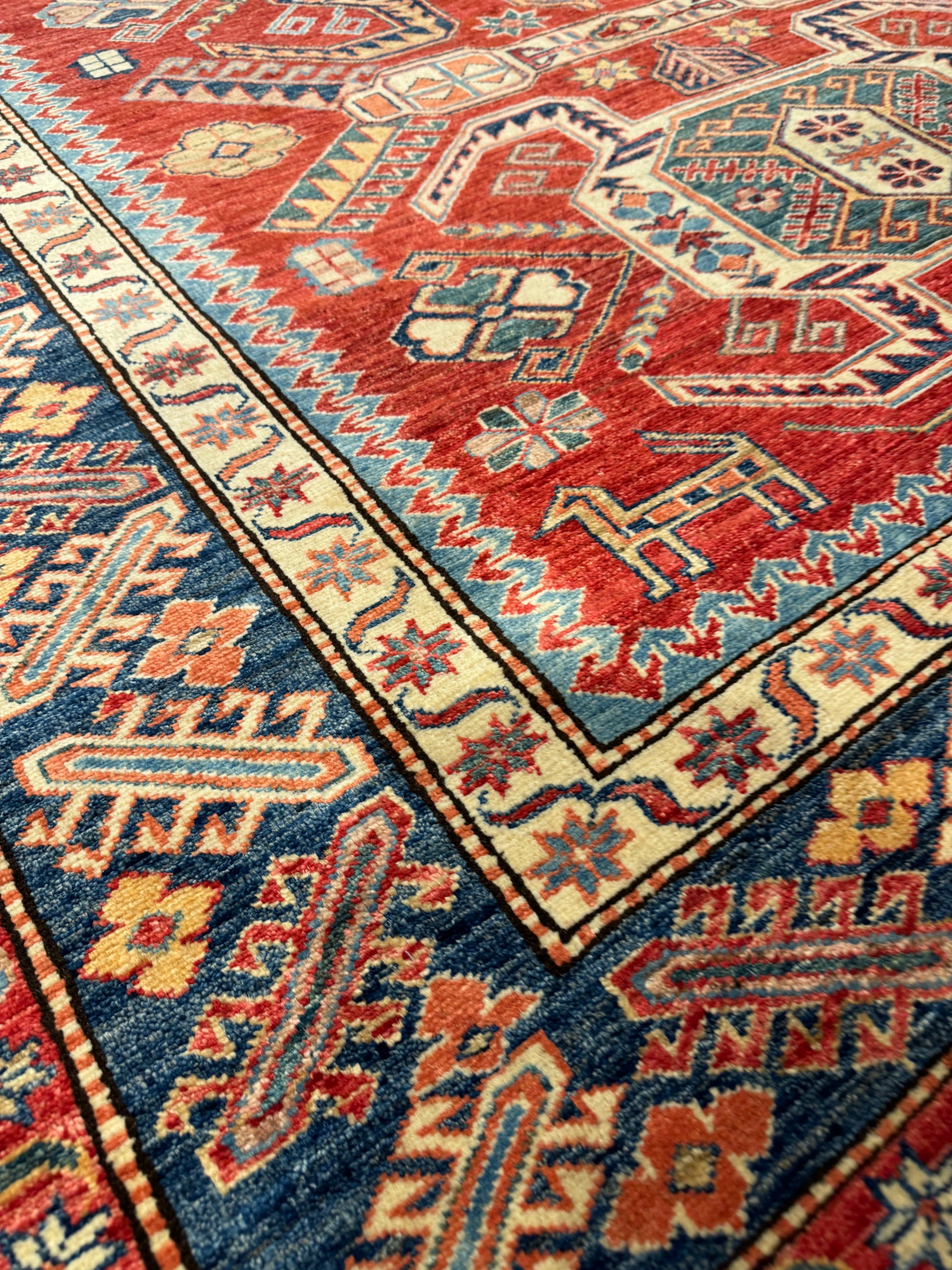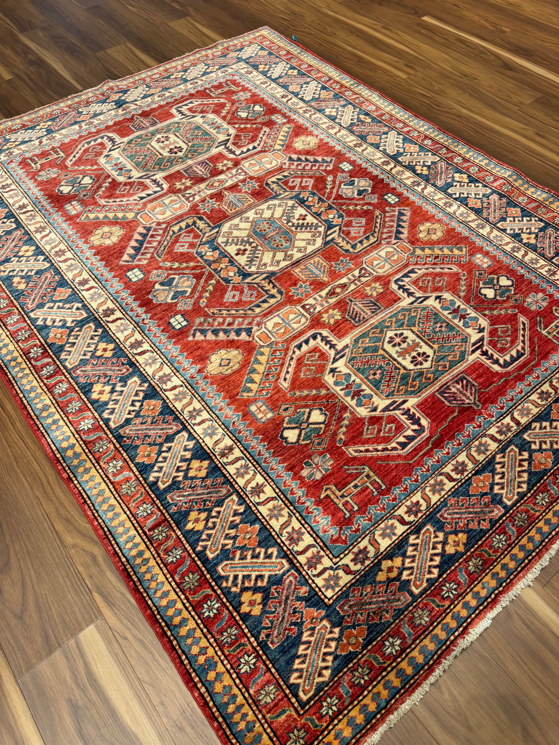 This authentic Kazak rug boasts traditional craftsmanship with its rich red background and intricate geometric patterns in shades of blue and beige. Each element is carefully woven from high-quality wool, reflecting a heritage of skilled artisanship. Its bold design elements draw on ancient cultural motifs, making it a statement piece for any room. Durable and timeless, this piece is more than just a rug; it's a work of art that offers both aesthetic and functional value.