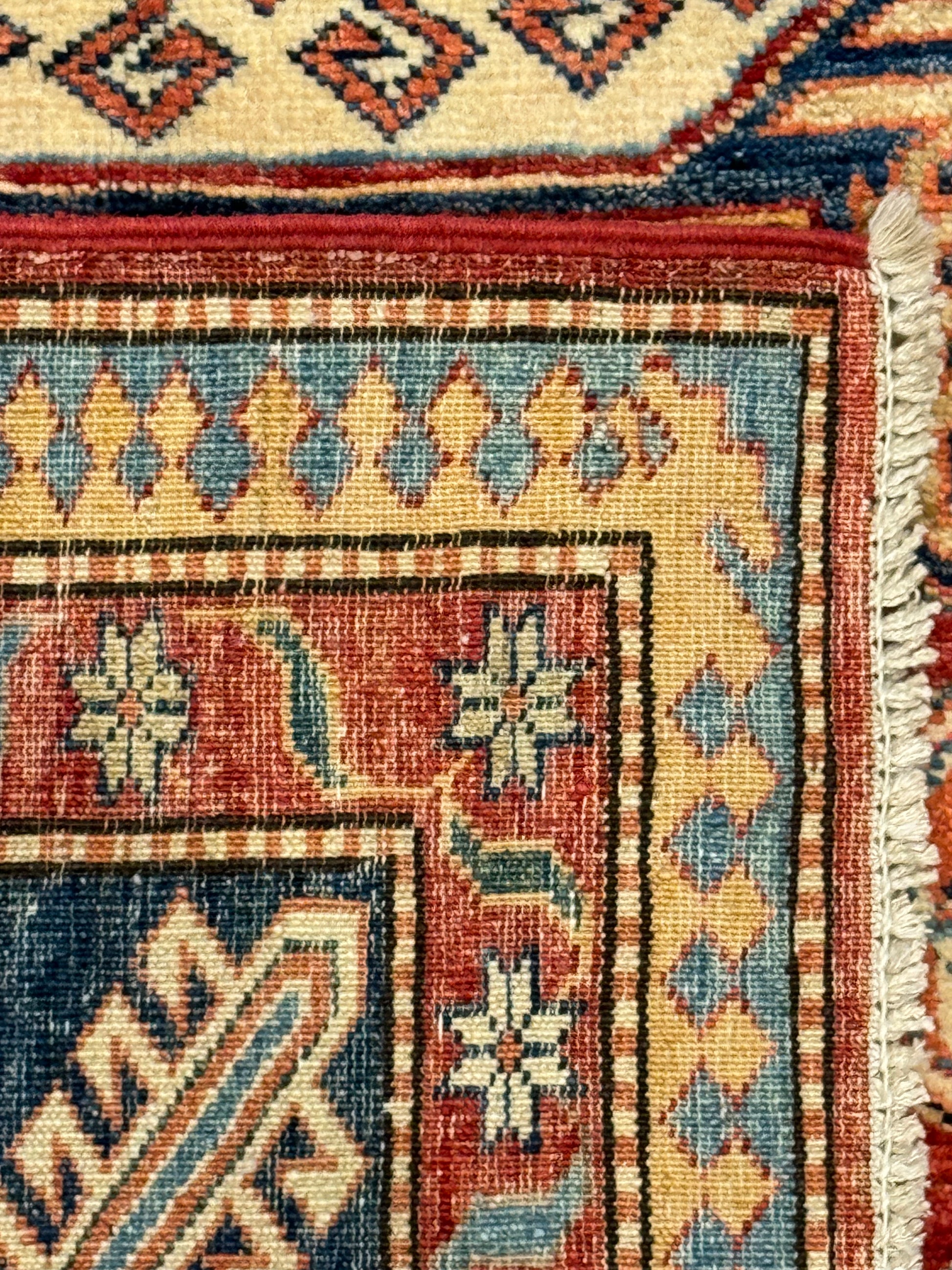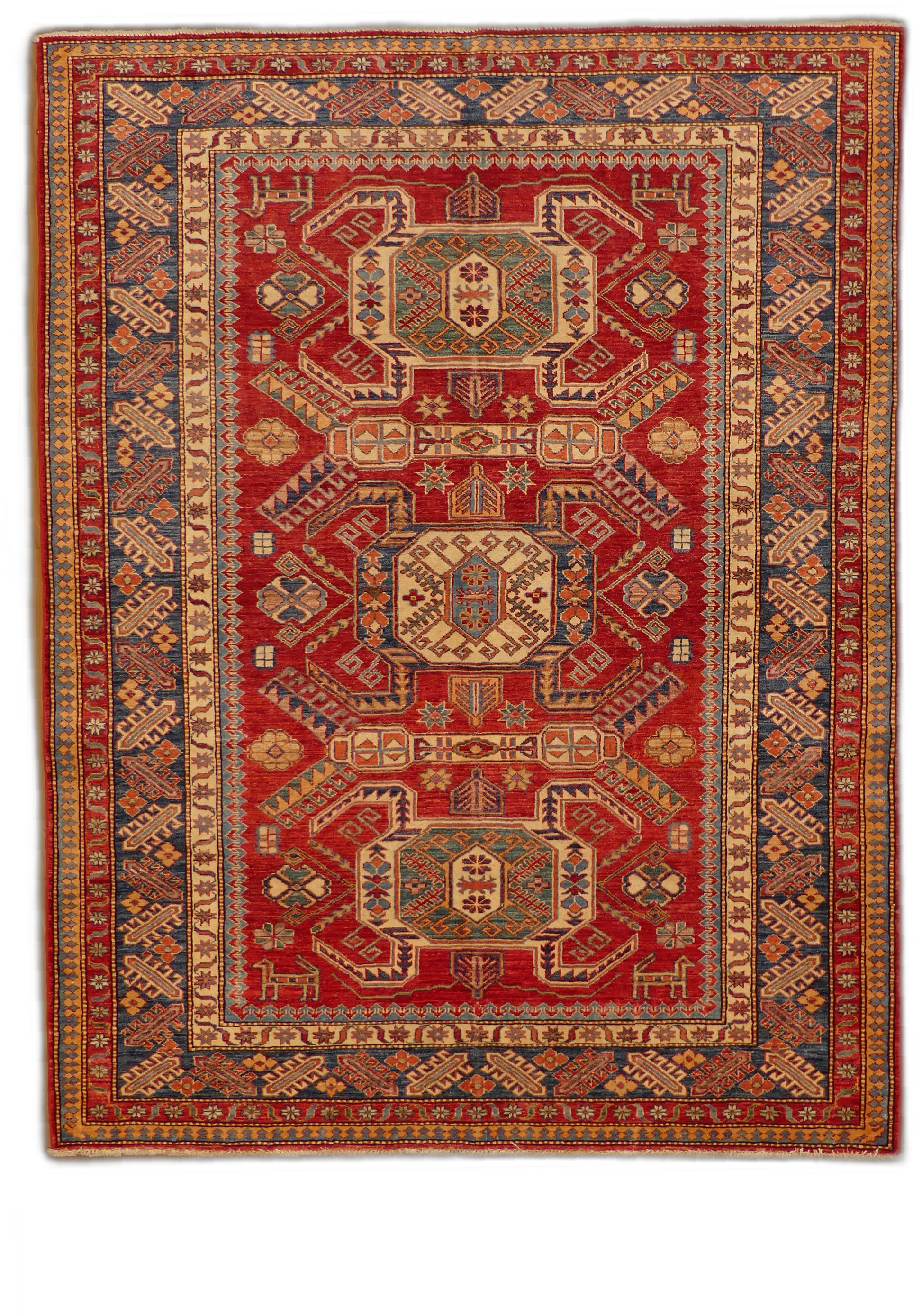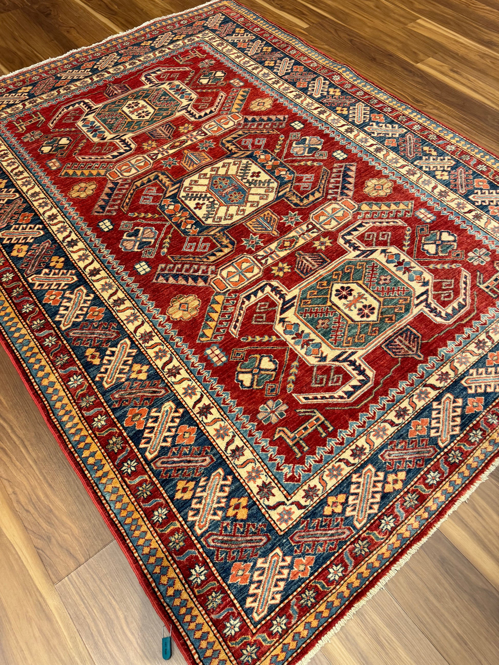 This authentic Kazak rug boasts traditional craftsmanship with its rich red background and intricate geometric patterns in shades of blue and beige. Each element is carefully woven from high-quality wool, reflecting a heritage of skilled artisanship. Its bold design elements draw on ancient cultural motifs, making it a statement piece for any room. Durable and timeless, this piece is more than just a rug; it's a work of art that offers both aesthetic and functional value.