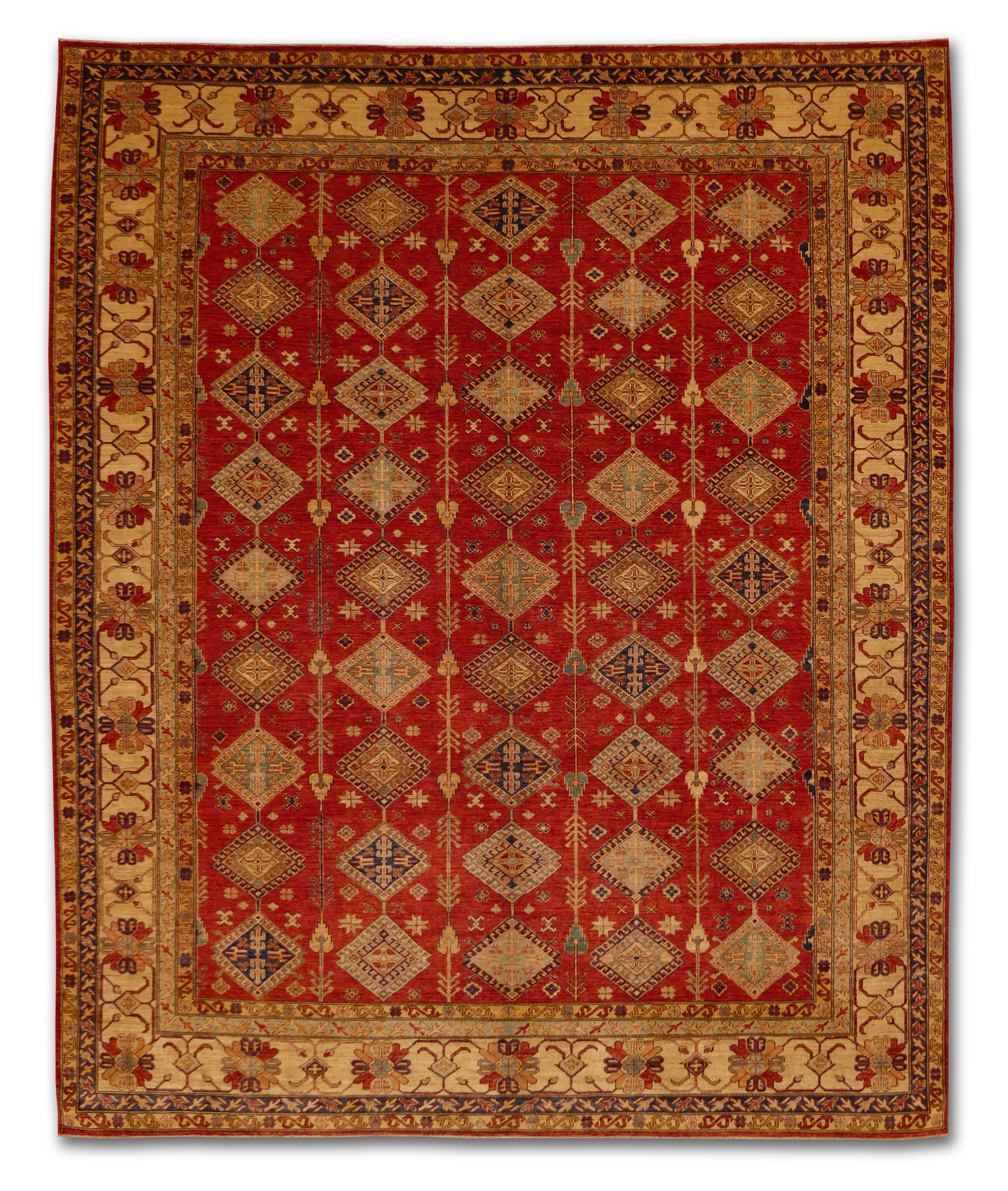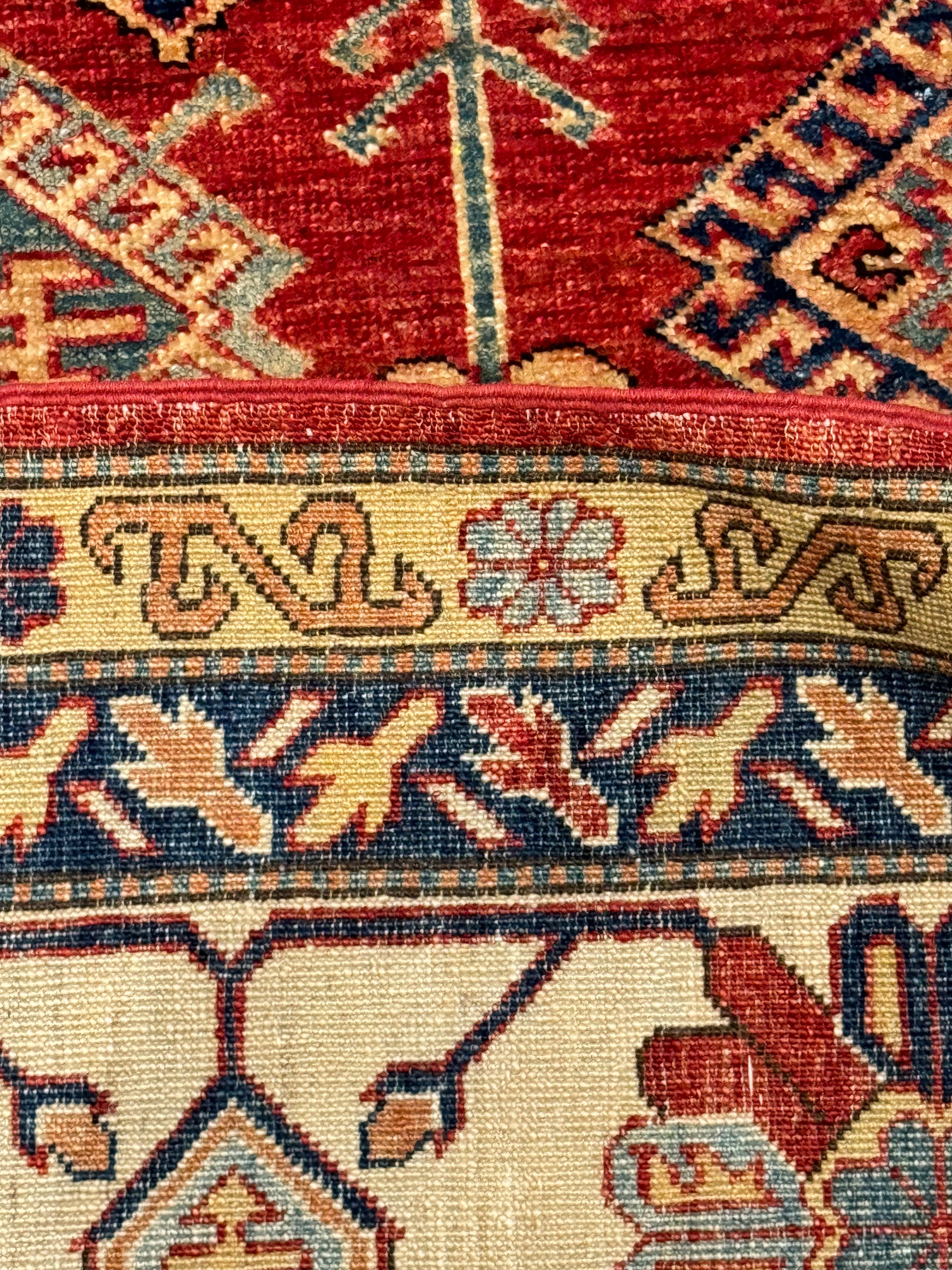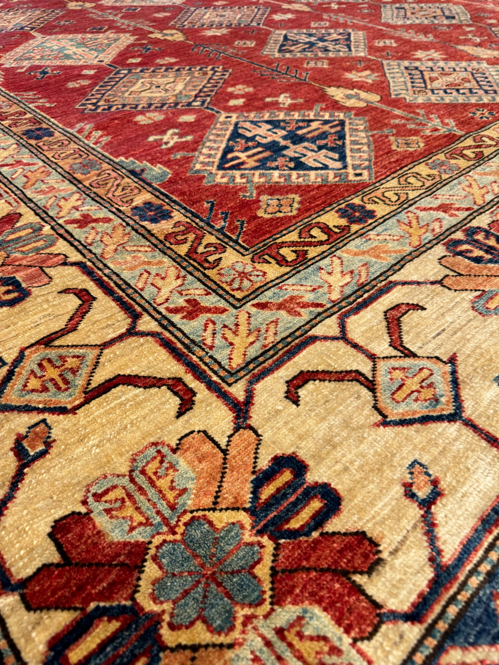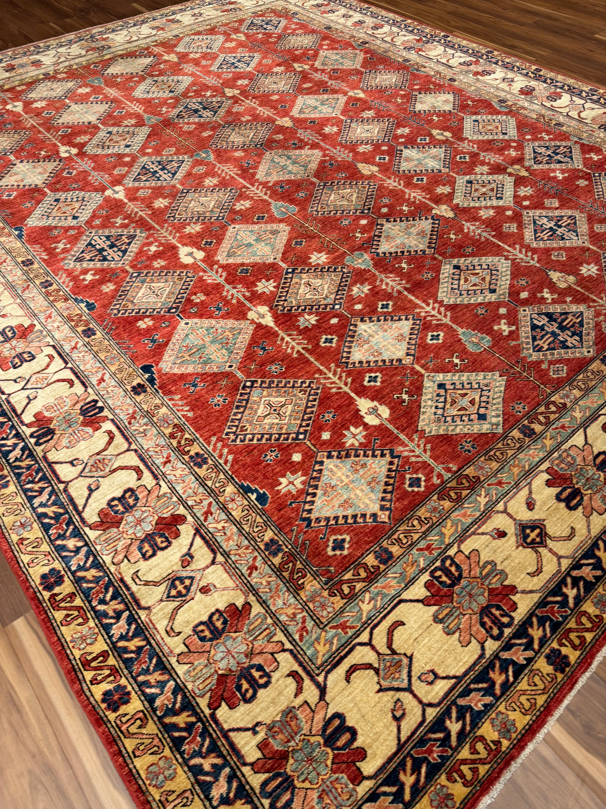 This exquisite Kazak rug showcases a bold, traditional design characterized by symmetrical geometric patterns and a rich palette. The red field is adorned with blue and beige accents, creating a vibrant yet harmonious aesthetic. Expertly handwoven from high-quality wool, this rug promises durability and comfort. Its intricate borders frame the central composition, highlighting meticulous craftsmanship and cultural heritage. Perfect for adding warmth and sophistication to any interior space.