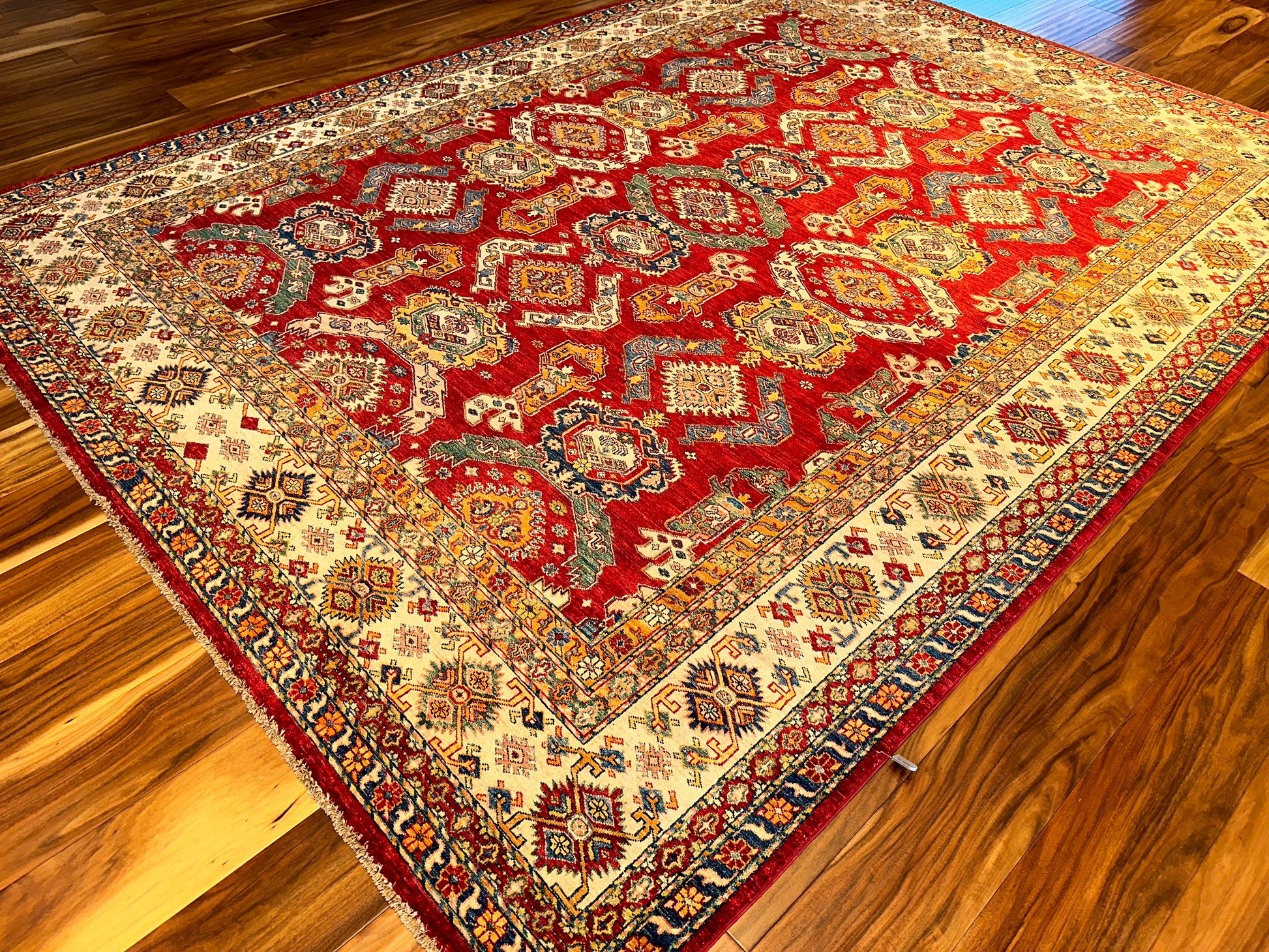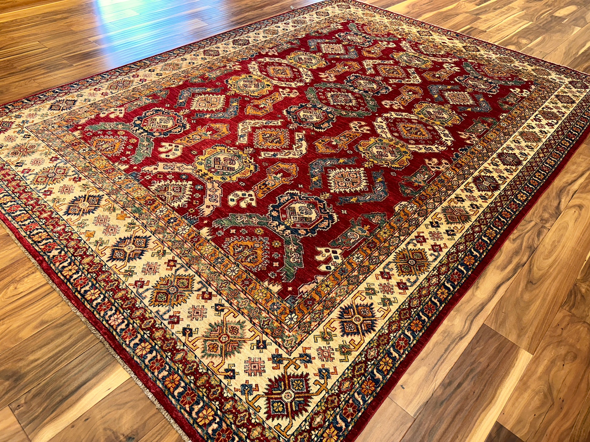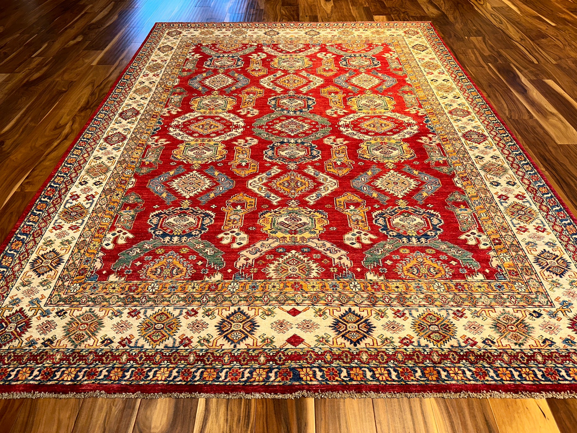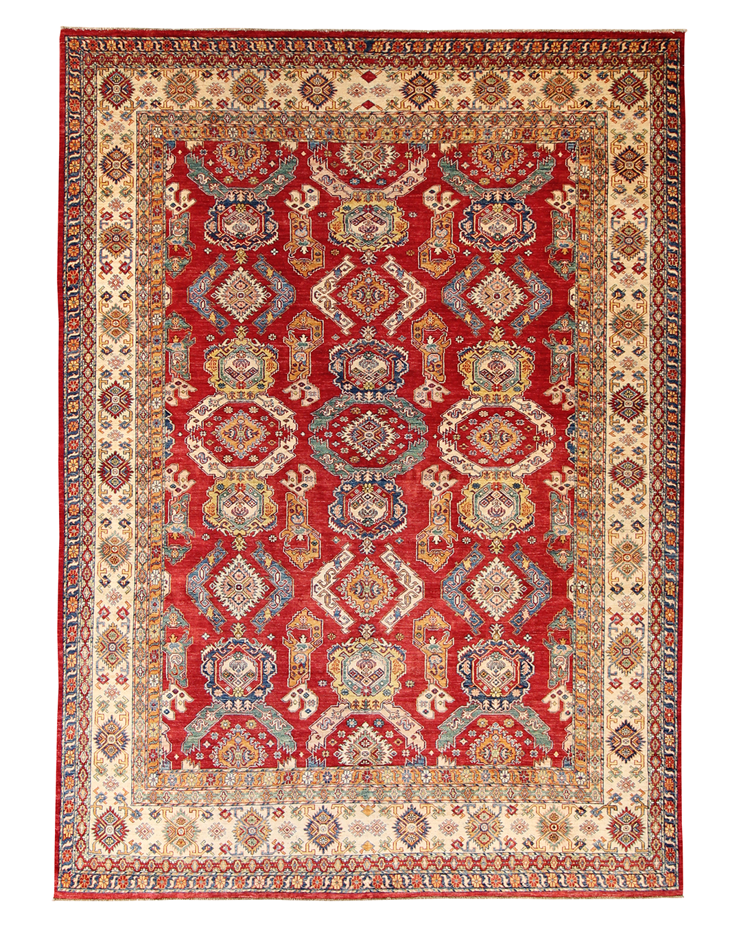 This Kazak-style rug is a celebration of intricate tribal geometry, rendered in a palette of rich red, beige, and soft blue. A rhythmic layout of stepped medallions and angular motifs gives the piece a strong architectural presence, softened by floral accents and contrasting tones in the border. The composition feels grounded yet ornate, perfect for anchoring a wide, open space.