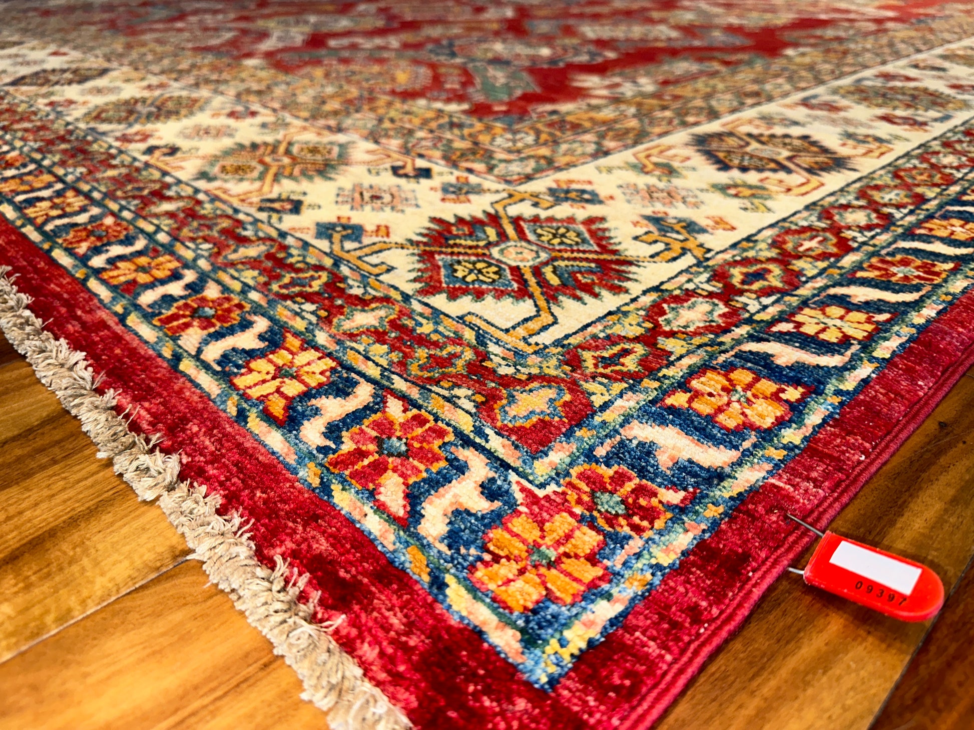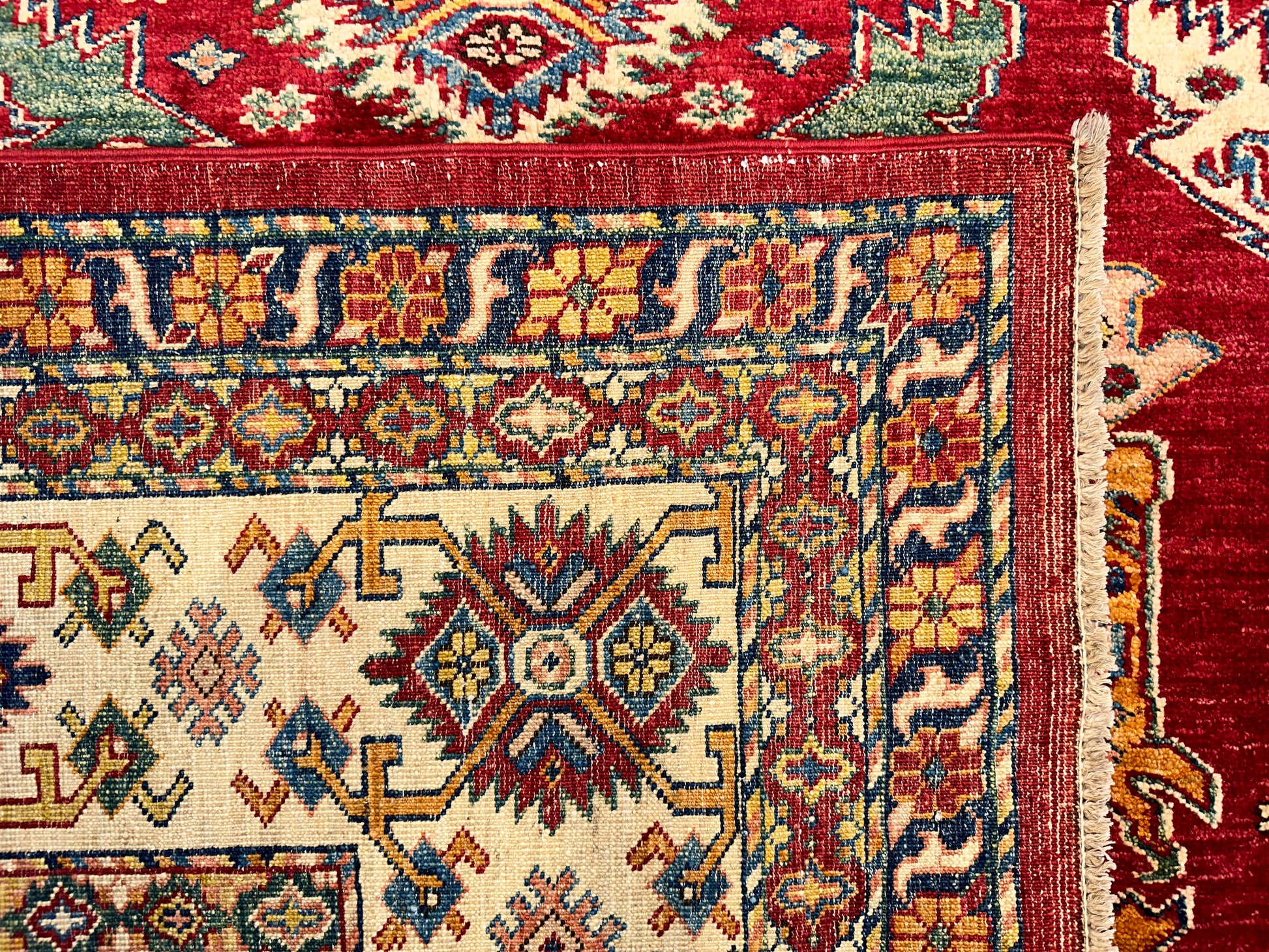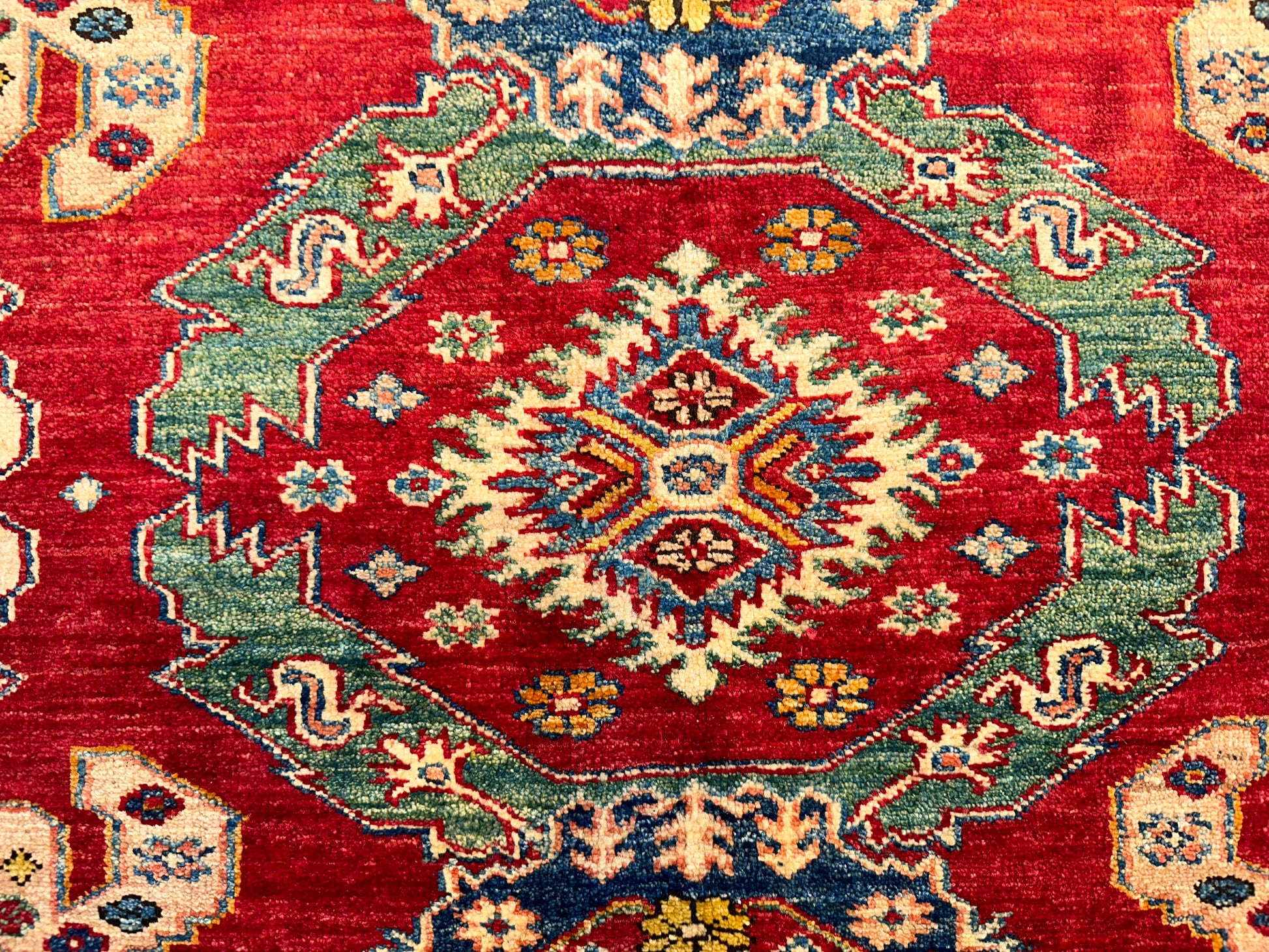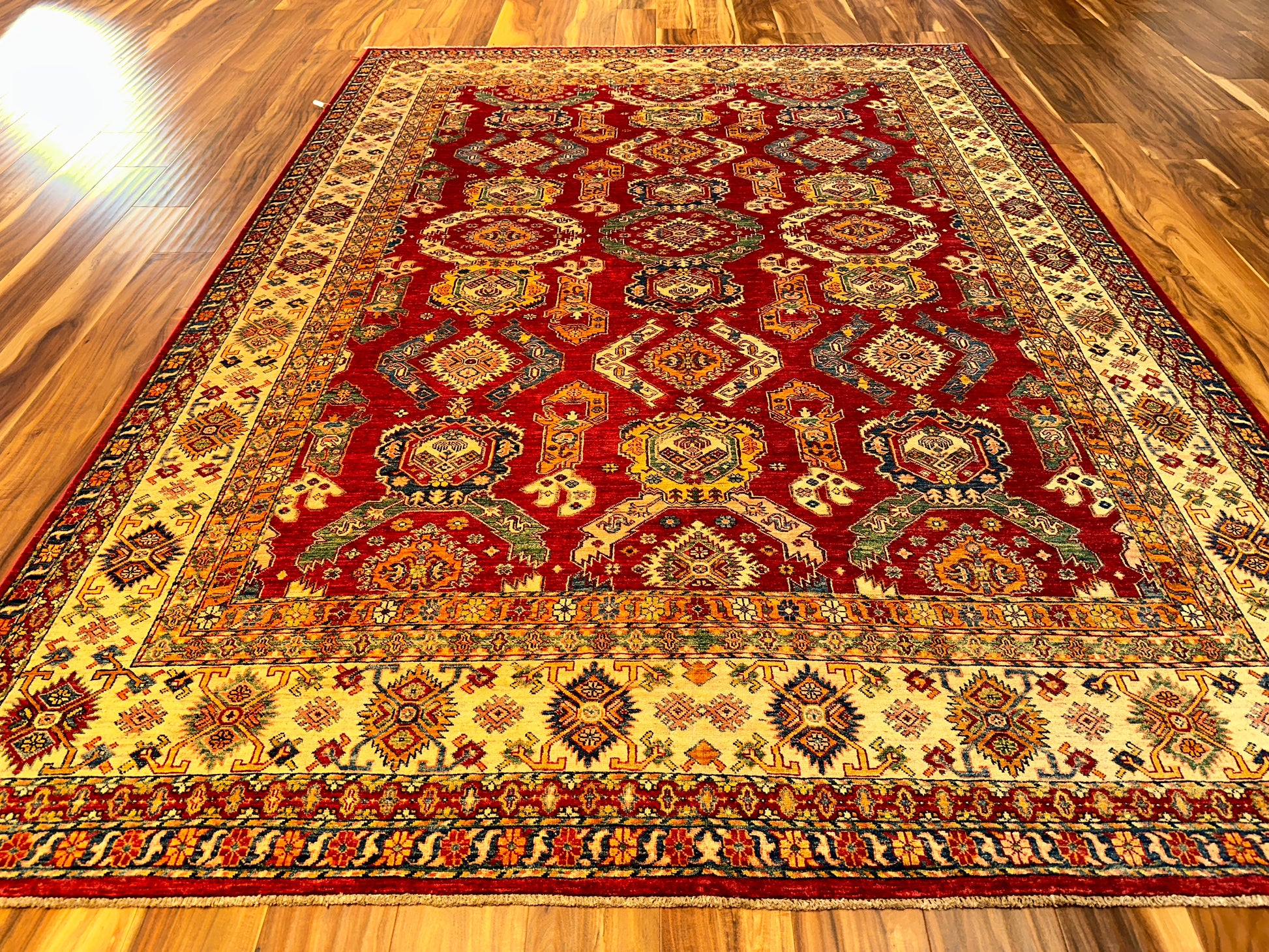 This Kazak-style rug is a celebration of intricate tribal geometry, rendered in a palette of rich red, beige, and soft blue. A rhythmic layout of stepped medallions and angular motifs gives the piece a strong architectural presence, softened by floral accents and contrasting tones in the border. The composition feels grounded yet ornate, perfect for anchoring a wide, open space.