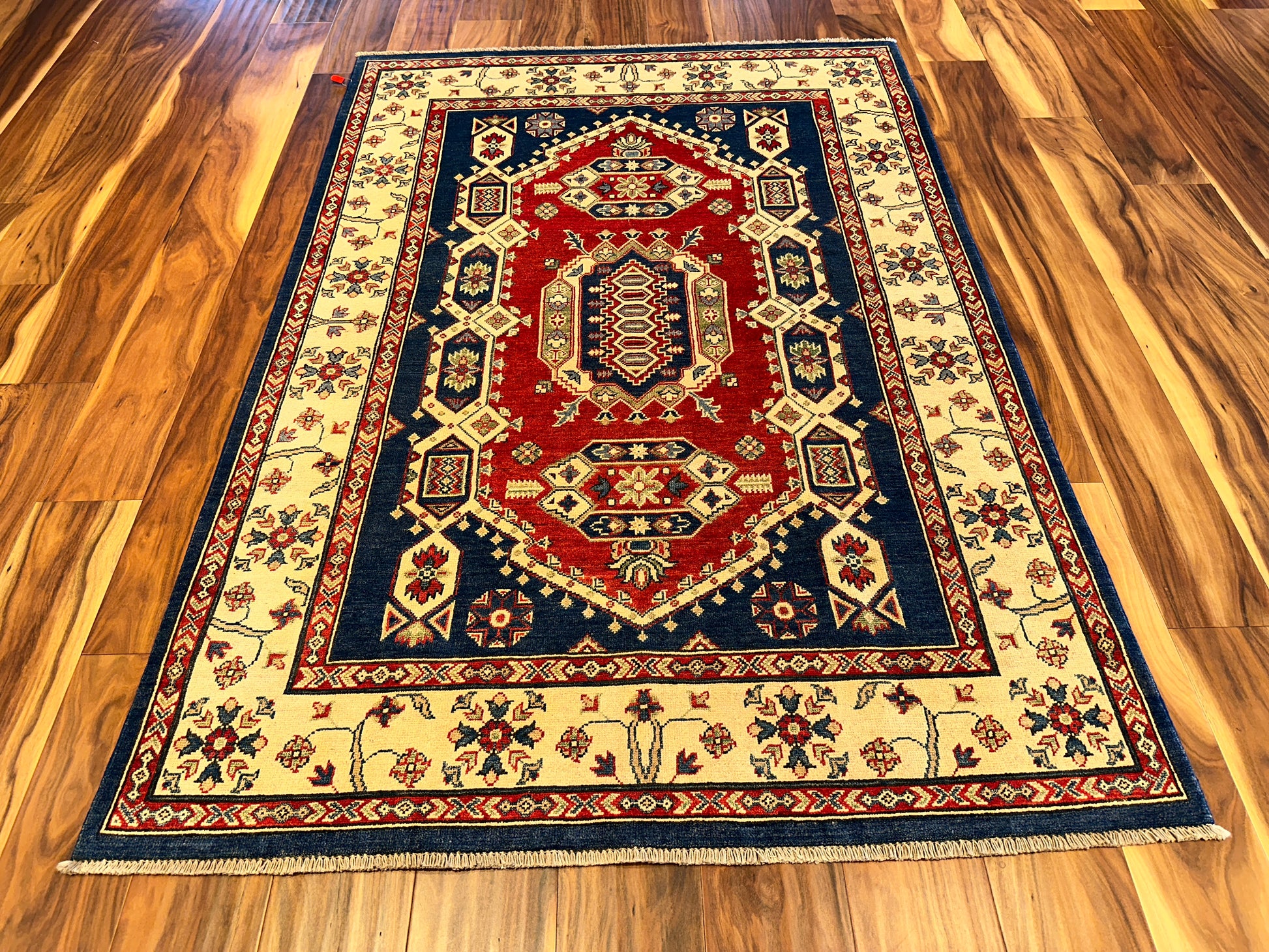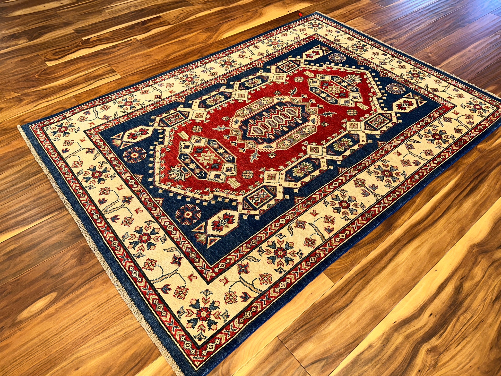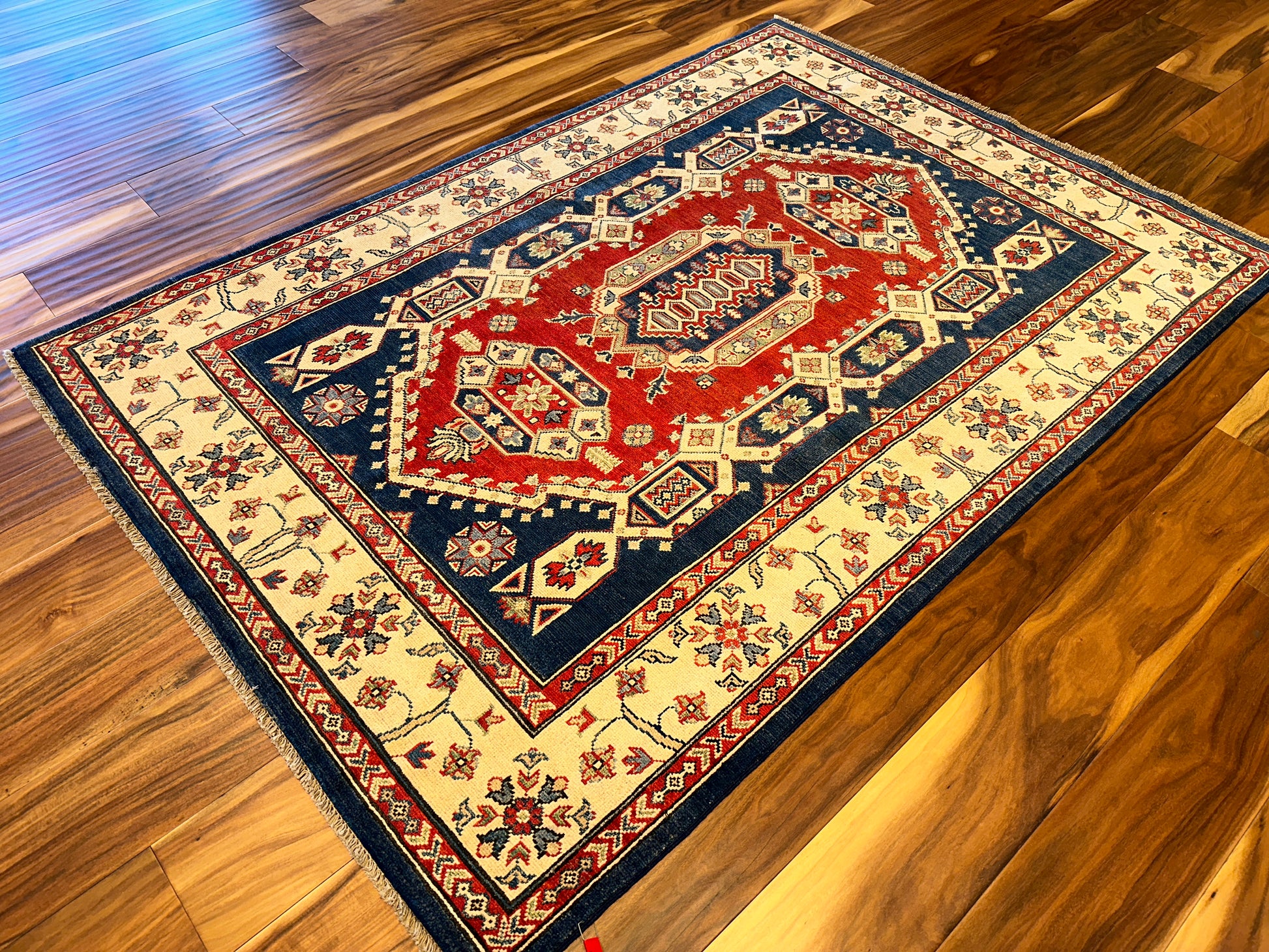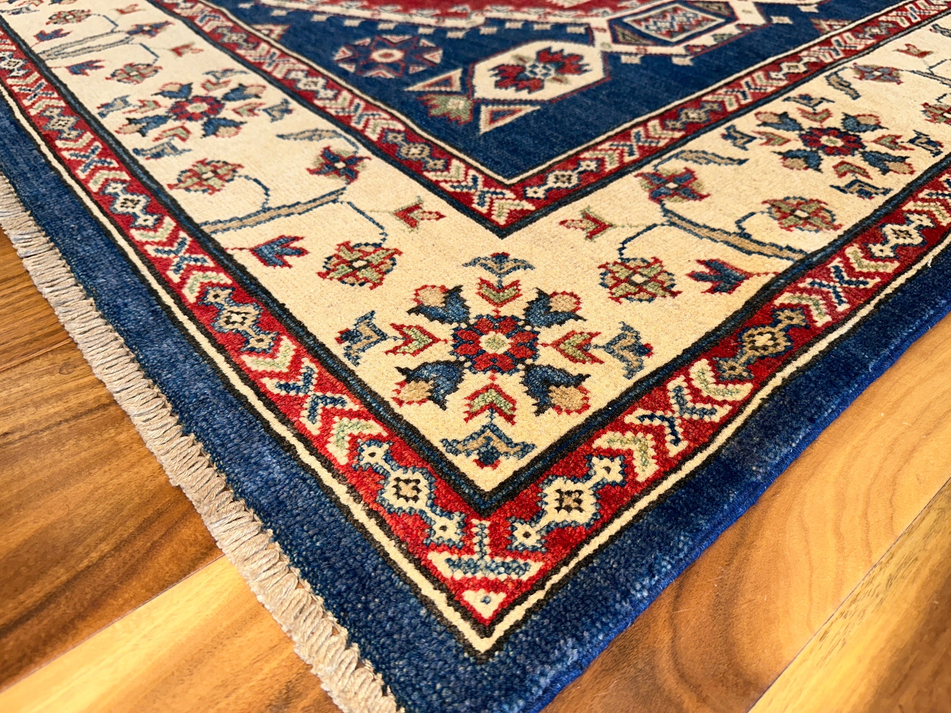 This striking hand-knotted rug showcases a bold geometric medallion surrounded by intricate motifs in a traditional Caucasian-inspired layout. The vivid red field is framed by inky blue and golden beige accents, with crisp details that bring dimension and structure. Fine floral elements in the border soften the strong angular forms, balancing power and precision in a cohesive design.