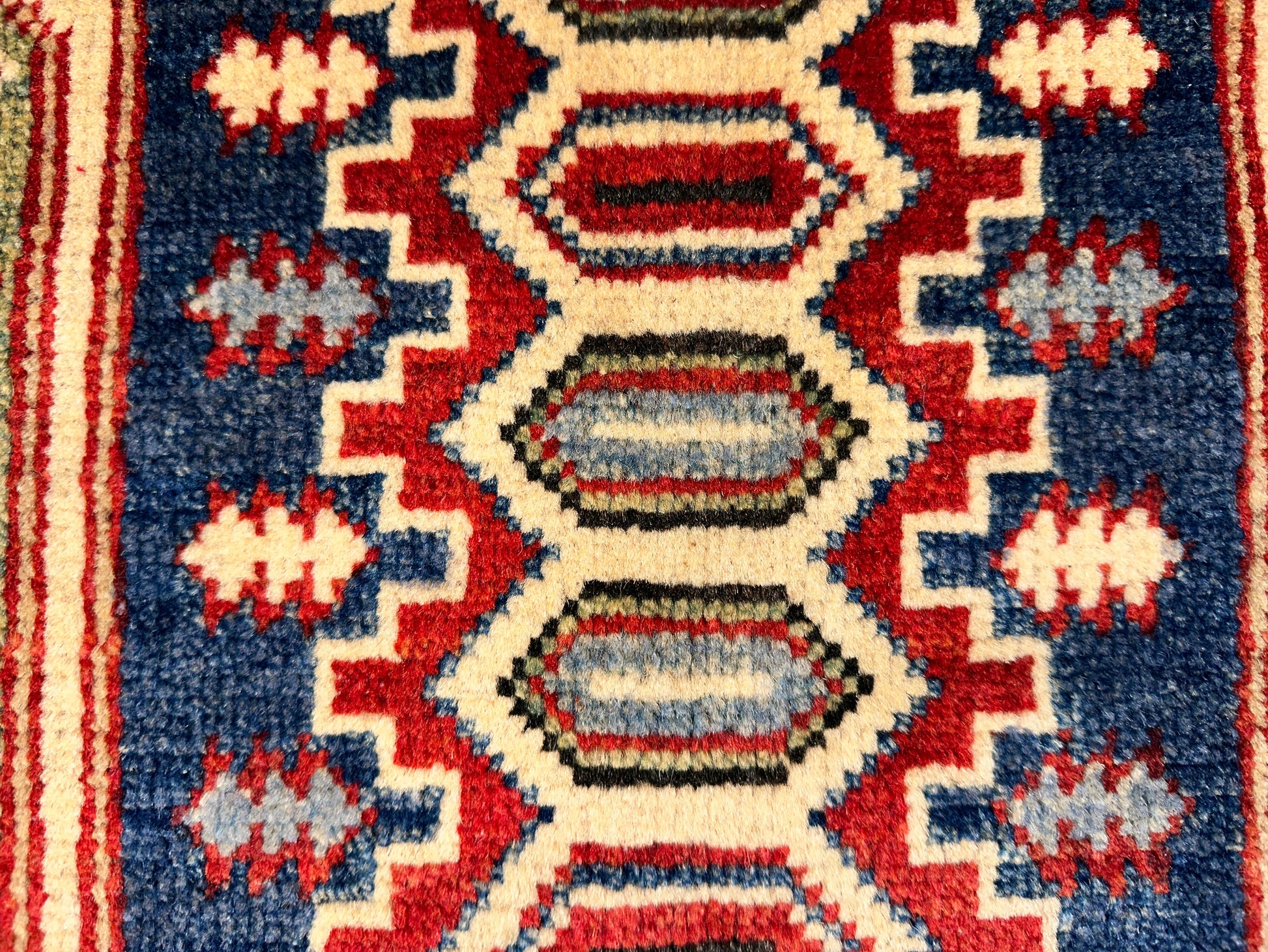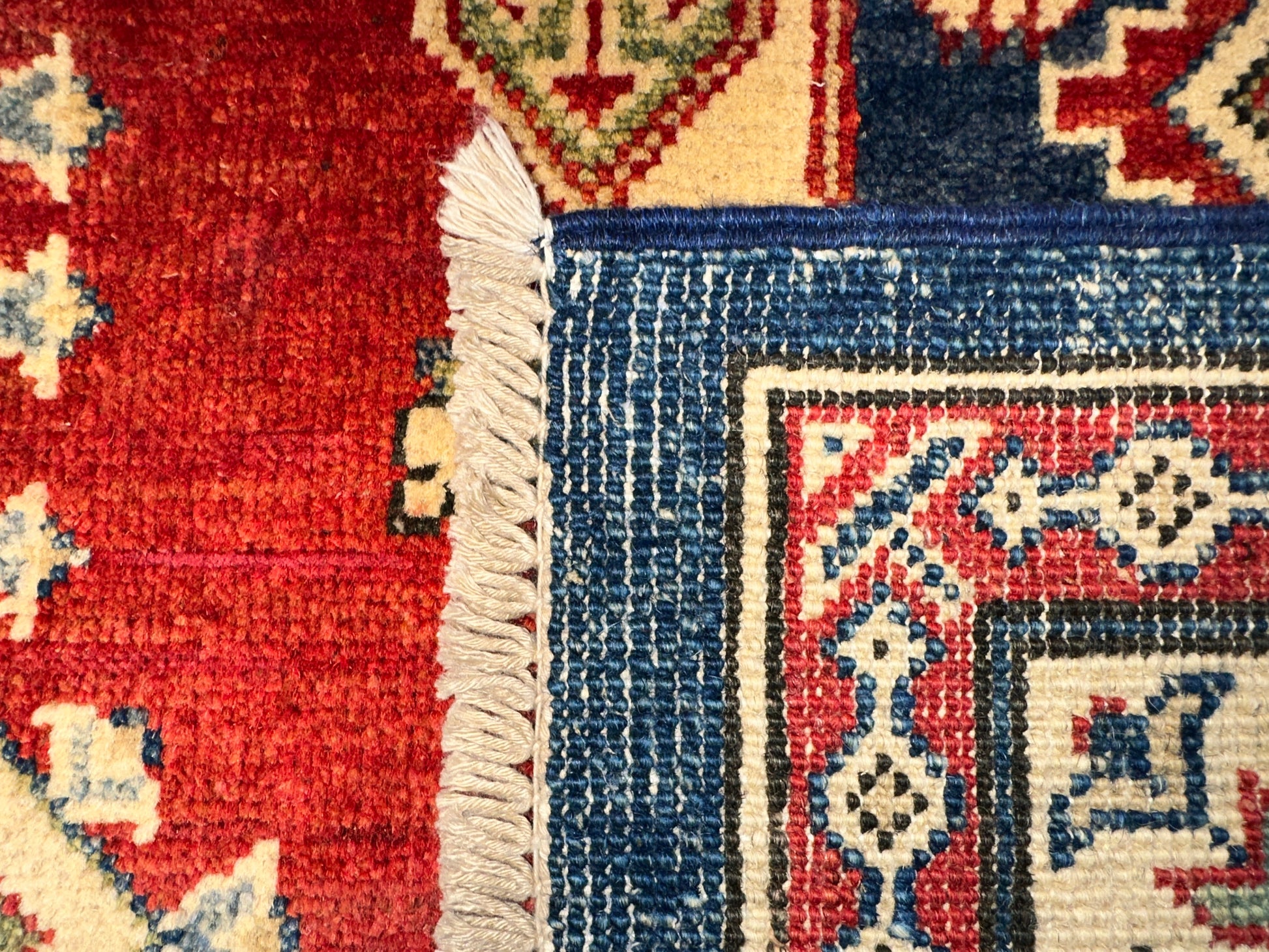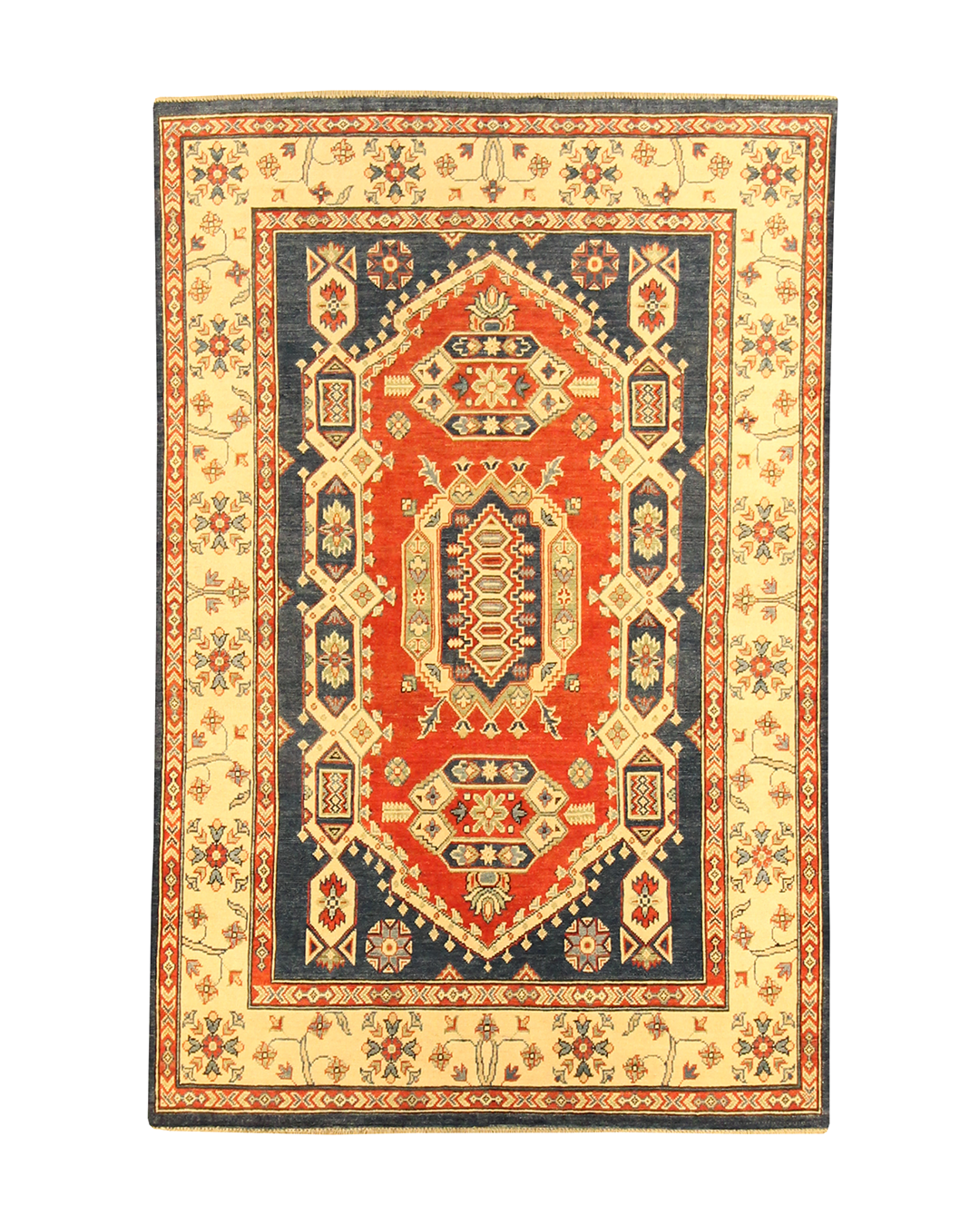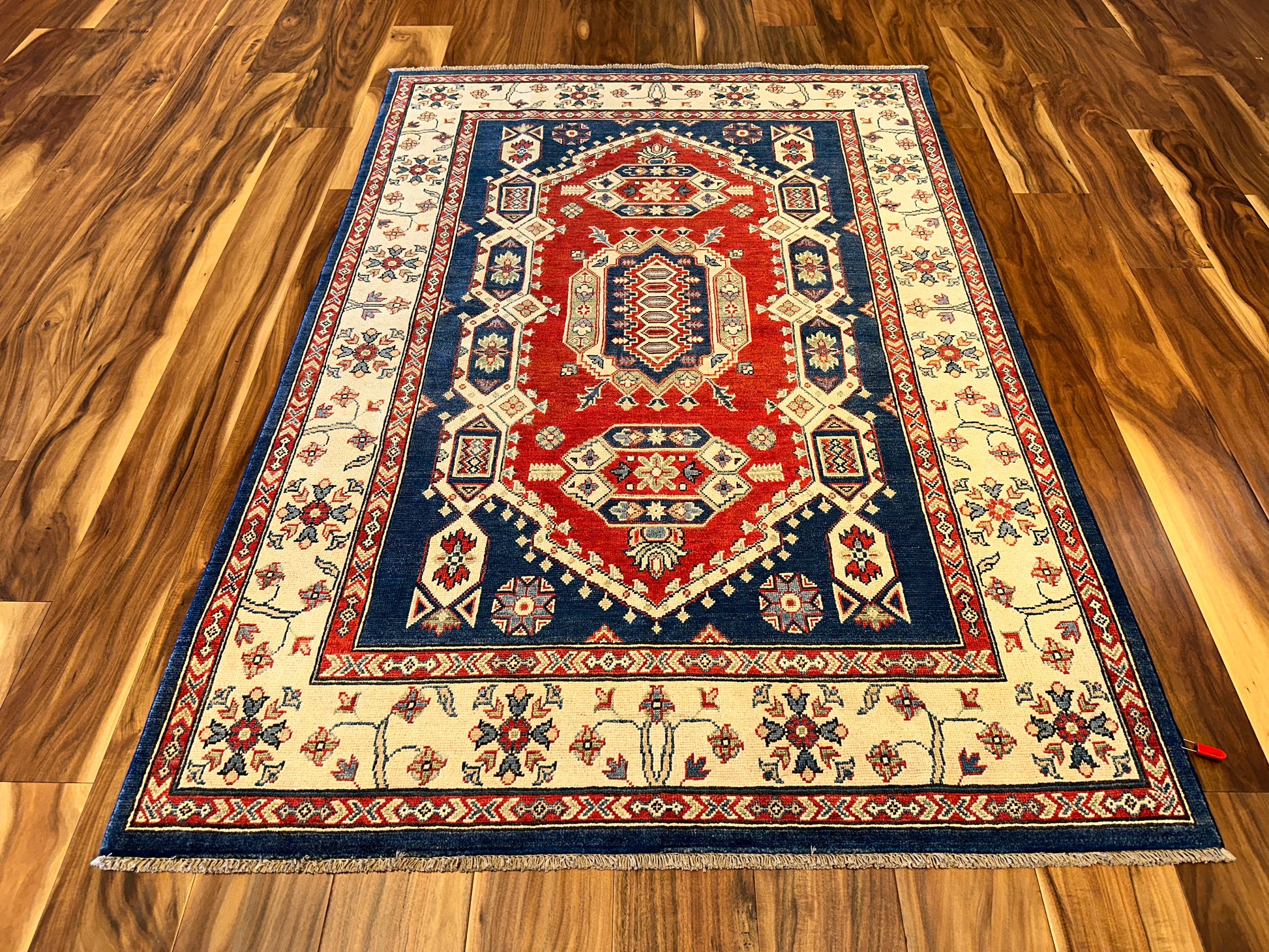 This striking hand-knotted rug showcases a bold geometric medallion surrounded by intricate motifs in a traditional Caucasian-inspired layout. The vivid red field is framed by inky blue and golden beige accents, with crisp details that bring dimension and structure. Fine floral elements in the border soften the strong angular forms, balancing power and precision in a cohesive design.