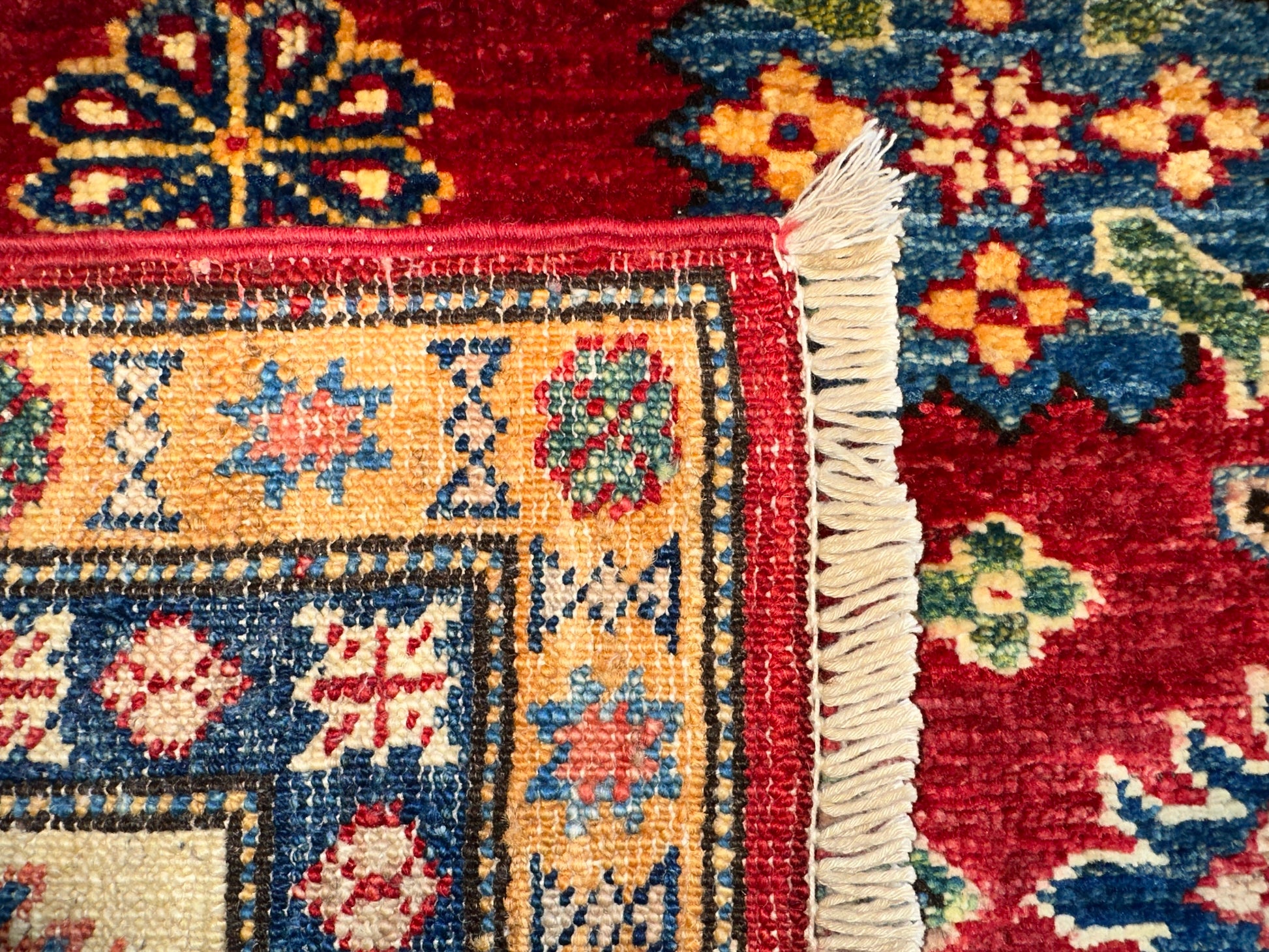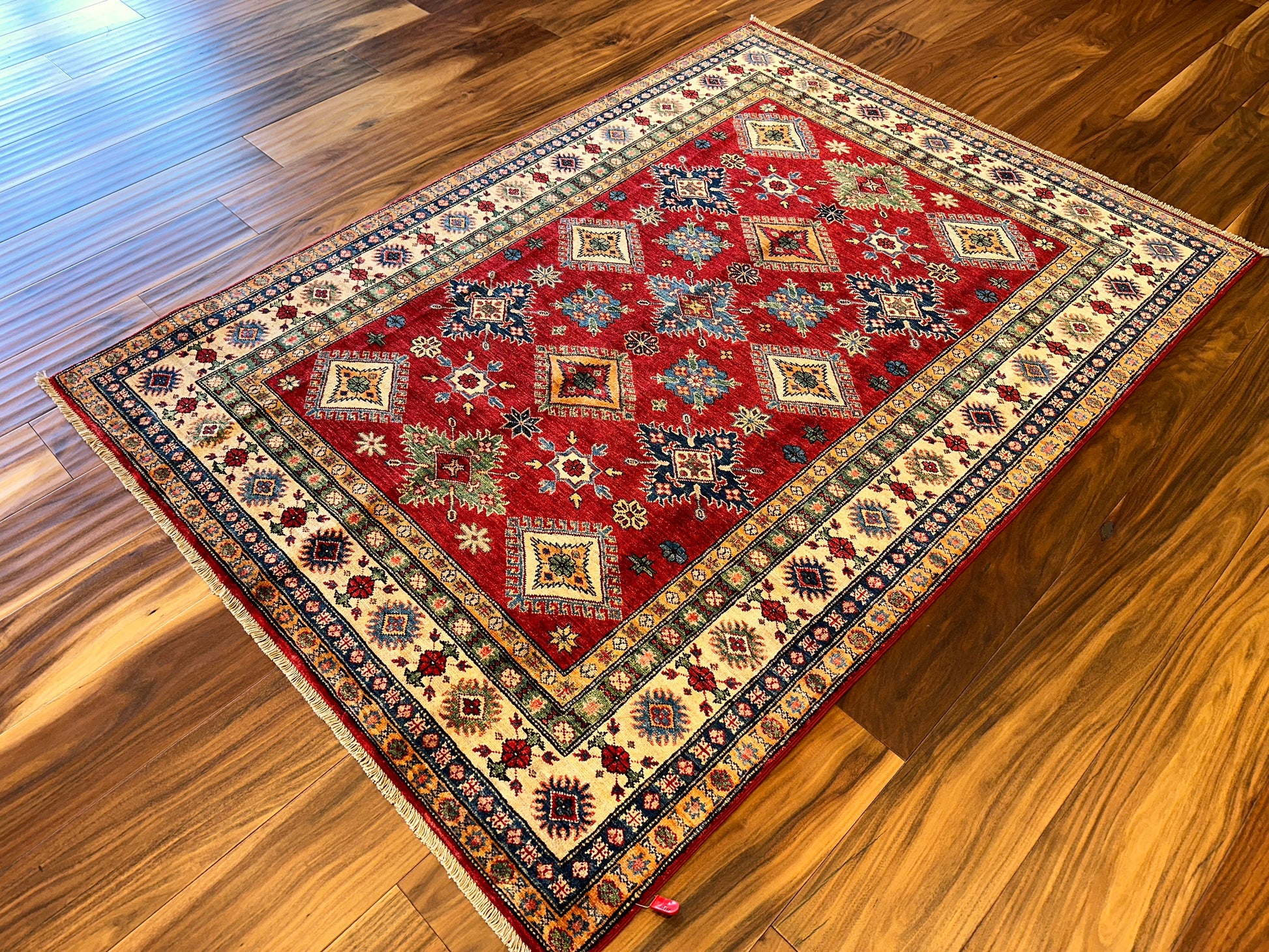 This striking handmade rug features a vibrant red field adorned with a geometric arrangement of tribal medallions and stylized floral motifs. The ivory and black borders provide bold contrast while enclosing the vivid pattern with symmetry and strength. A rich mix of greens, golds, and blues adds color depth without overwhelming the eye.