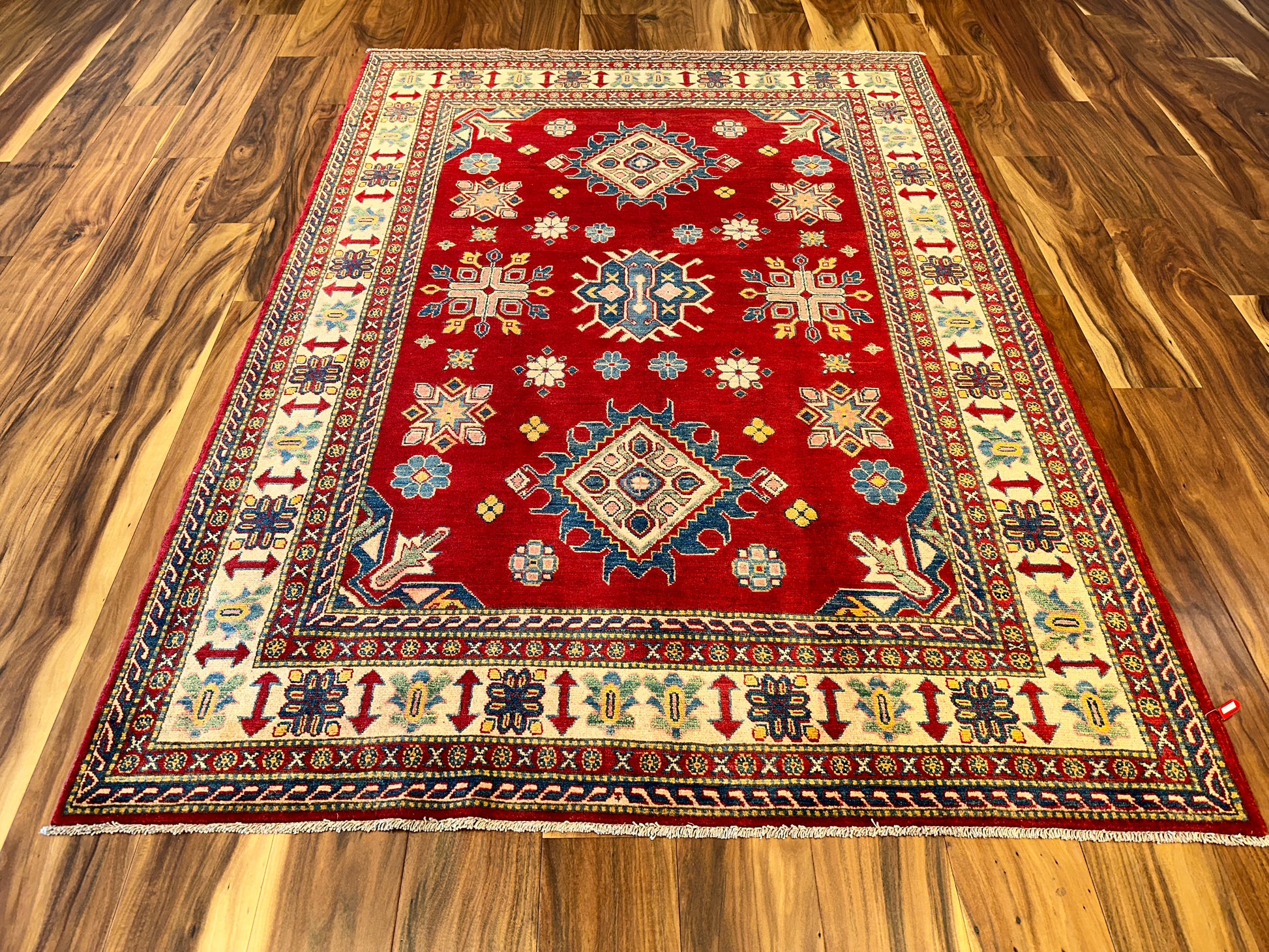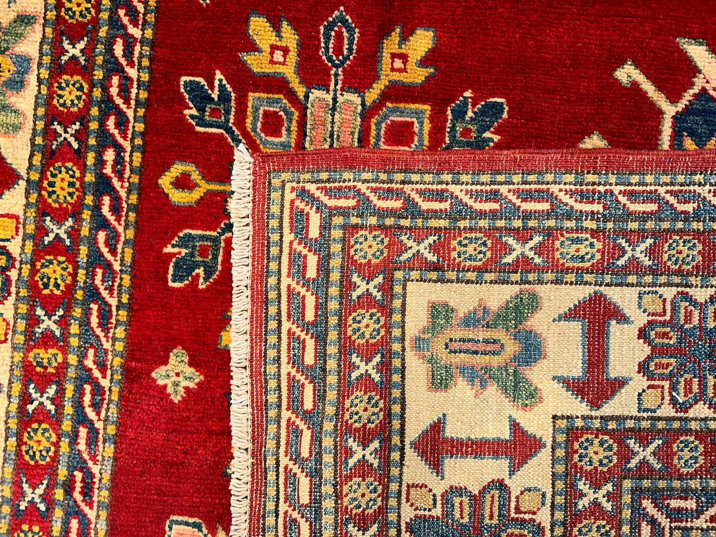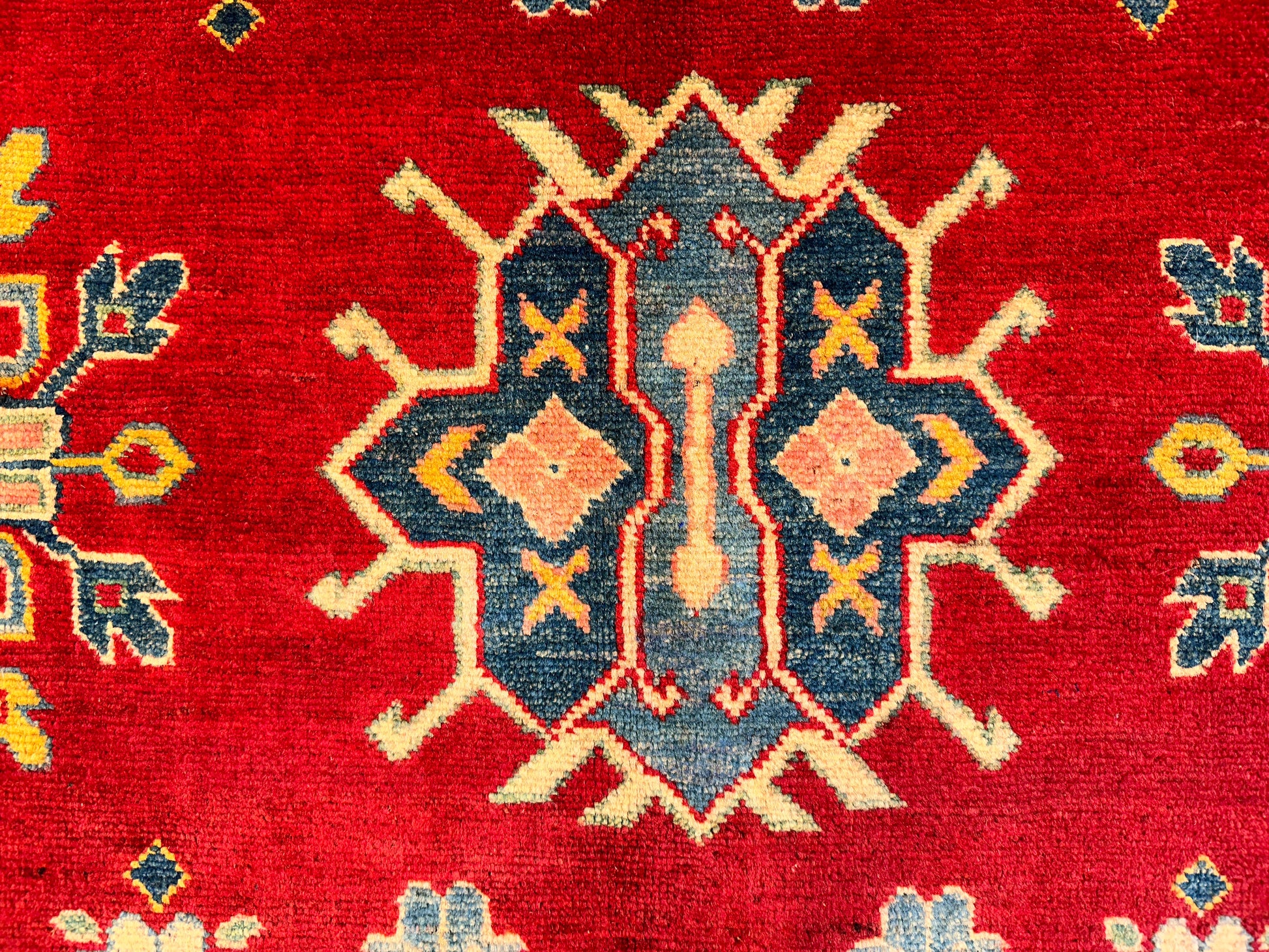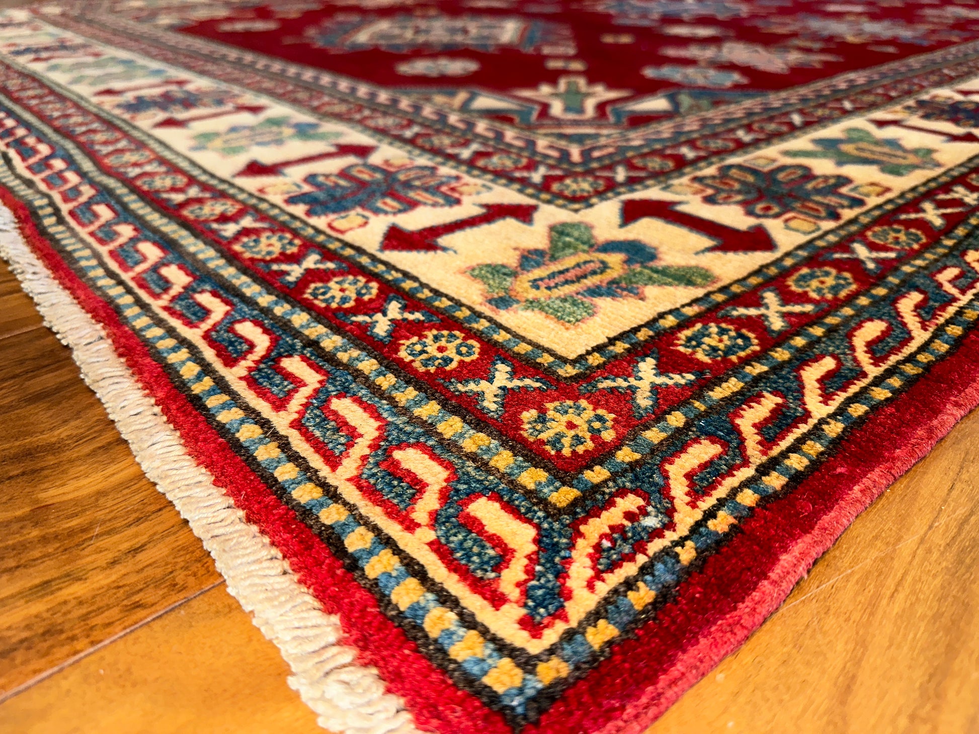 Striking and full of energy, this hand-knotted rug features a bold geometric layout with medallions and tribal motifs arranged on a vivid red field. Accents of cobalt, ivory, gold, and soft teal bring each element to life, while the wide border with stylized rosettes and arrows frames the design with balance and flair. A visually captivating piece with strong traditional roots.