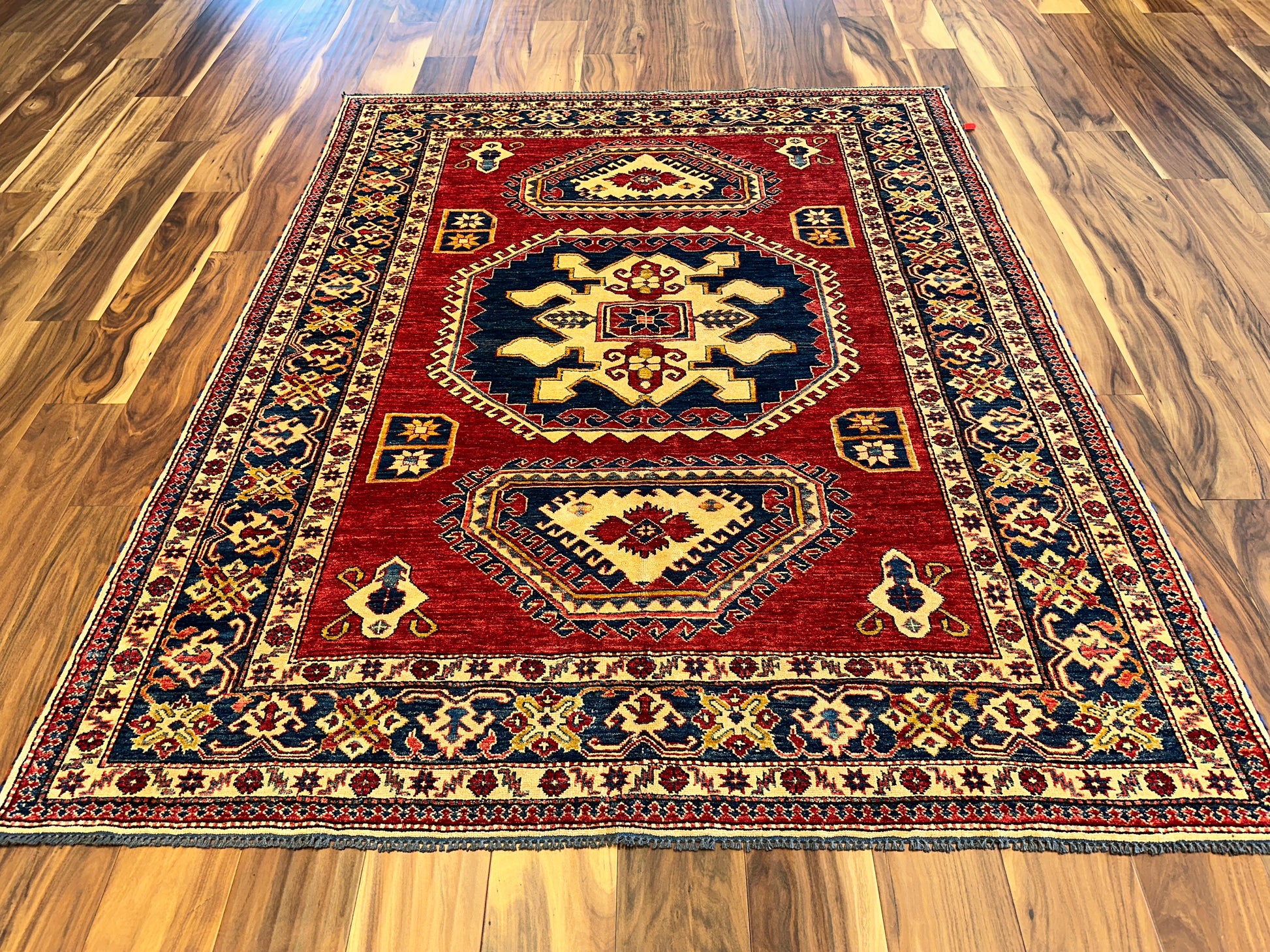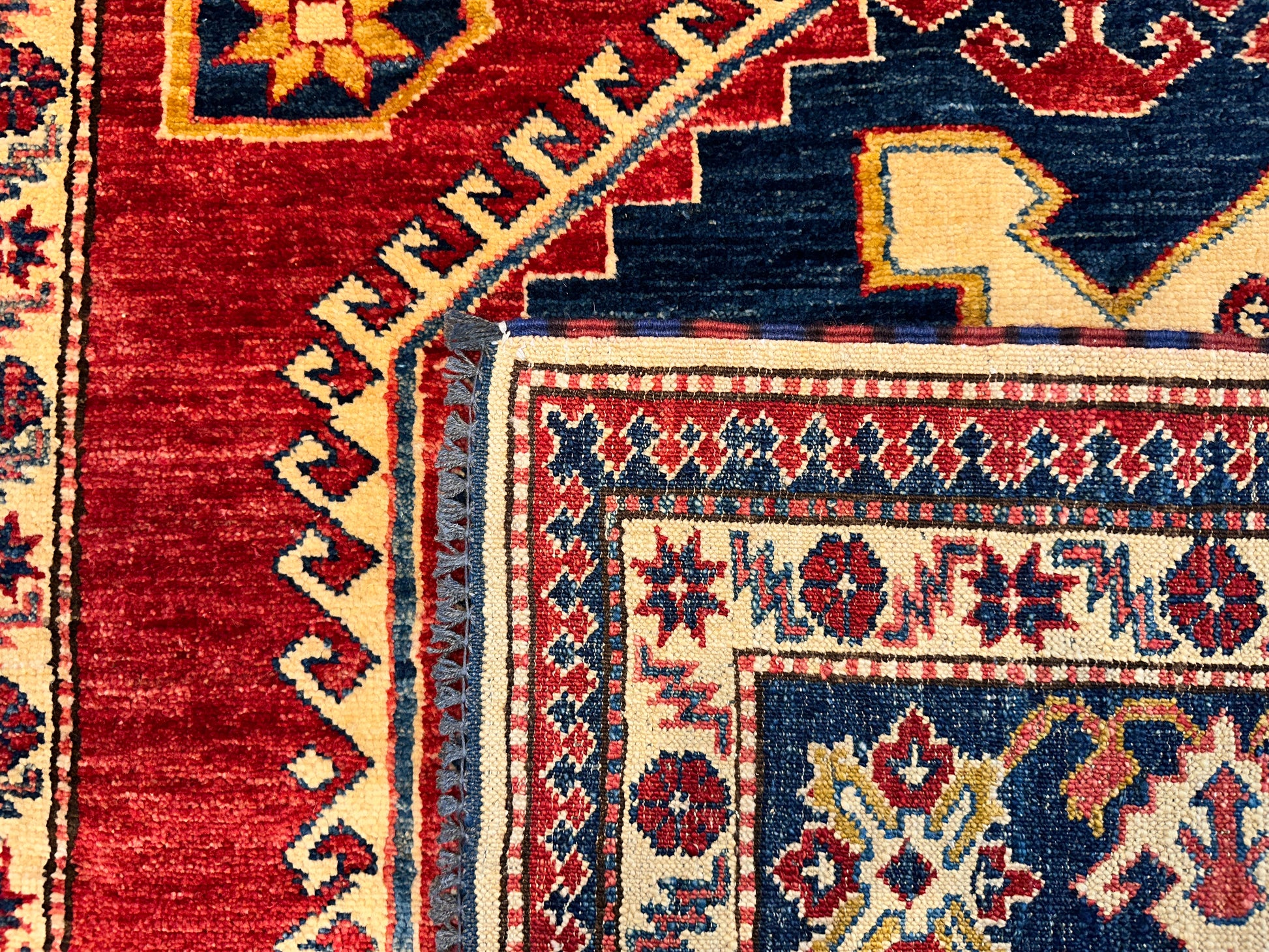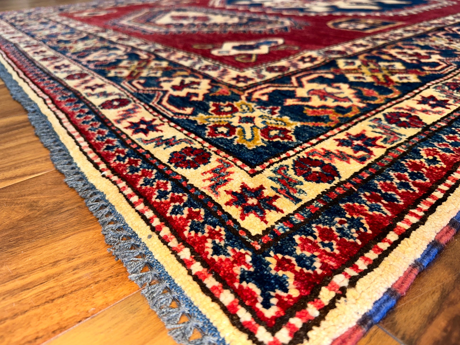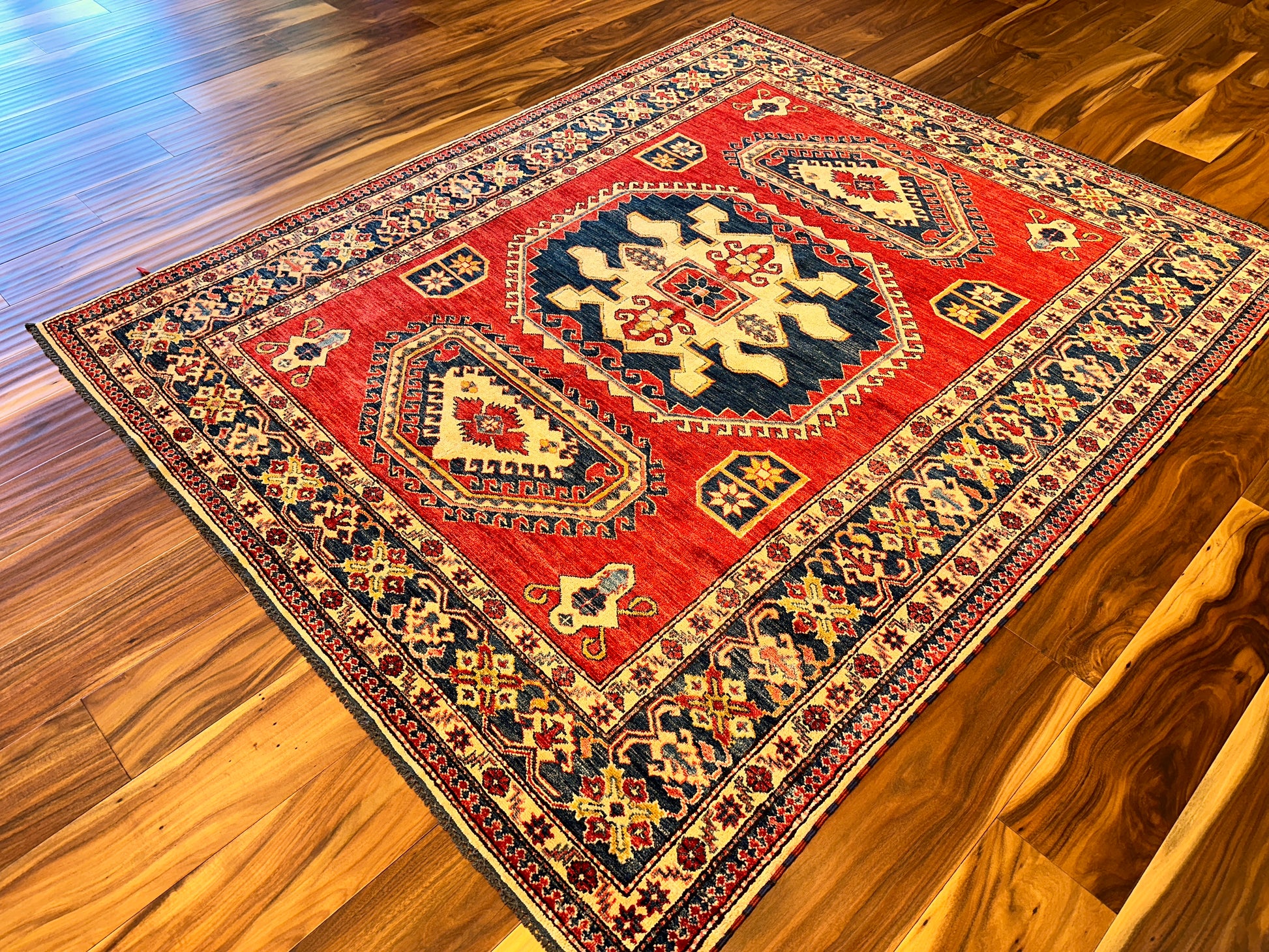 Bold and dynamic, this hand-knotted rug features a striking trio of geometric medallions set against a rich red field. Accented with deep navy, ivory, and gold, the motifs are framed by a layered border of stylized rosettes and stepped detailing. The crisp, angular forms and vivid contrast give it a strong tribal presence with graphic appeal.