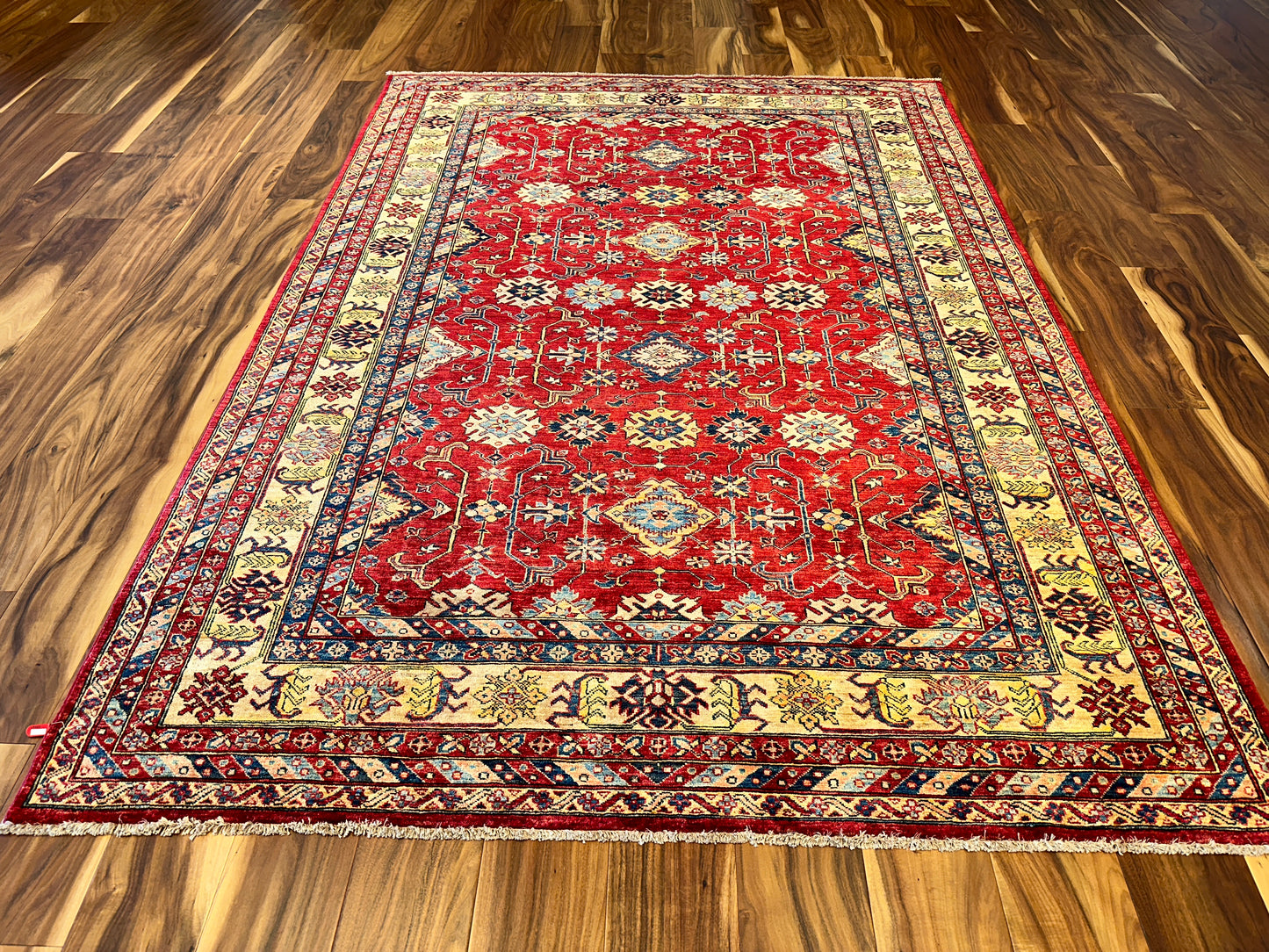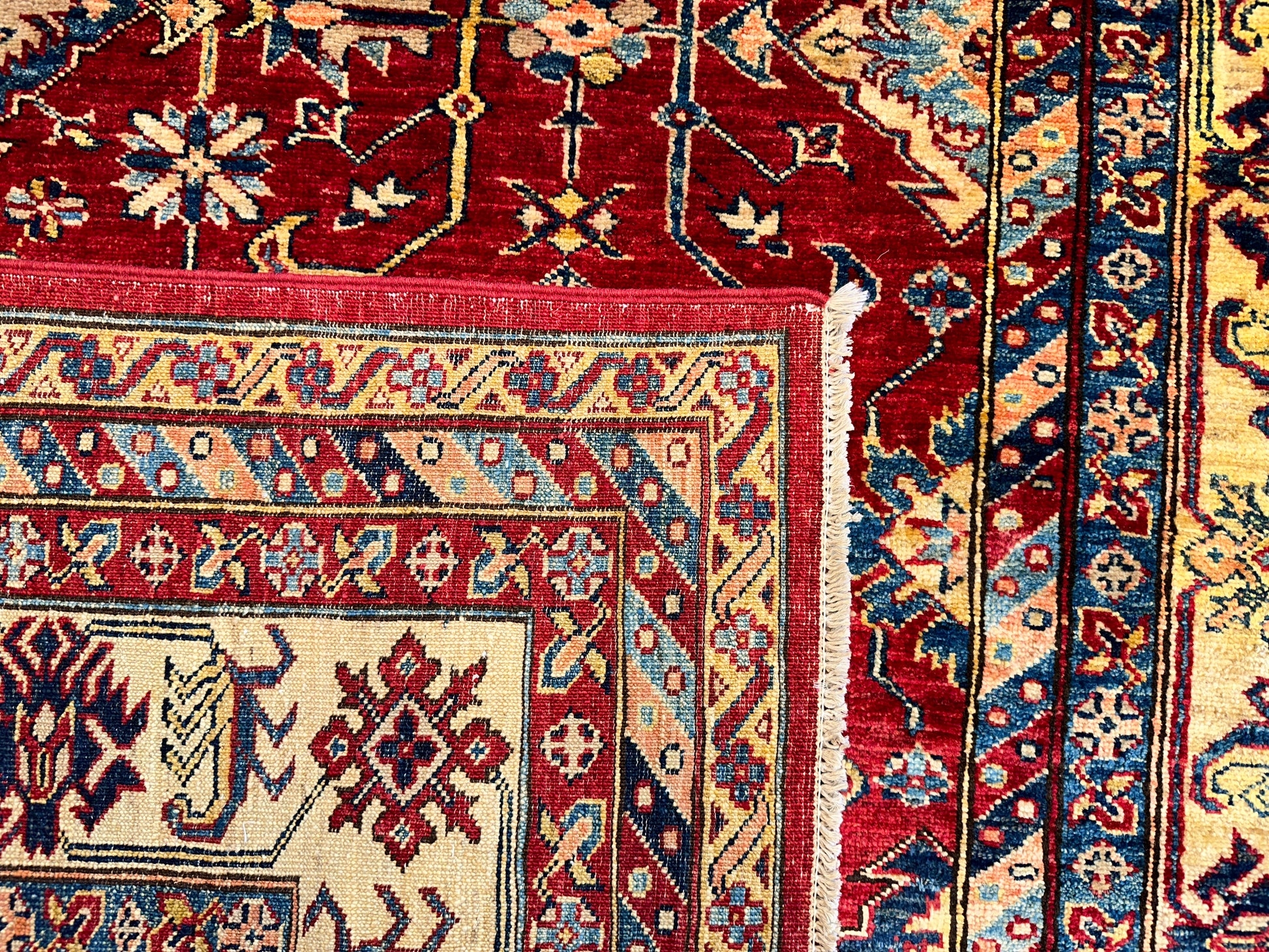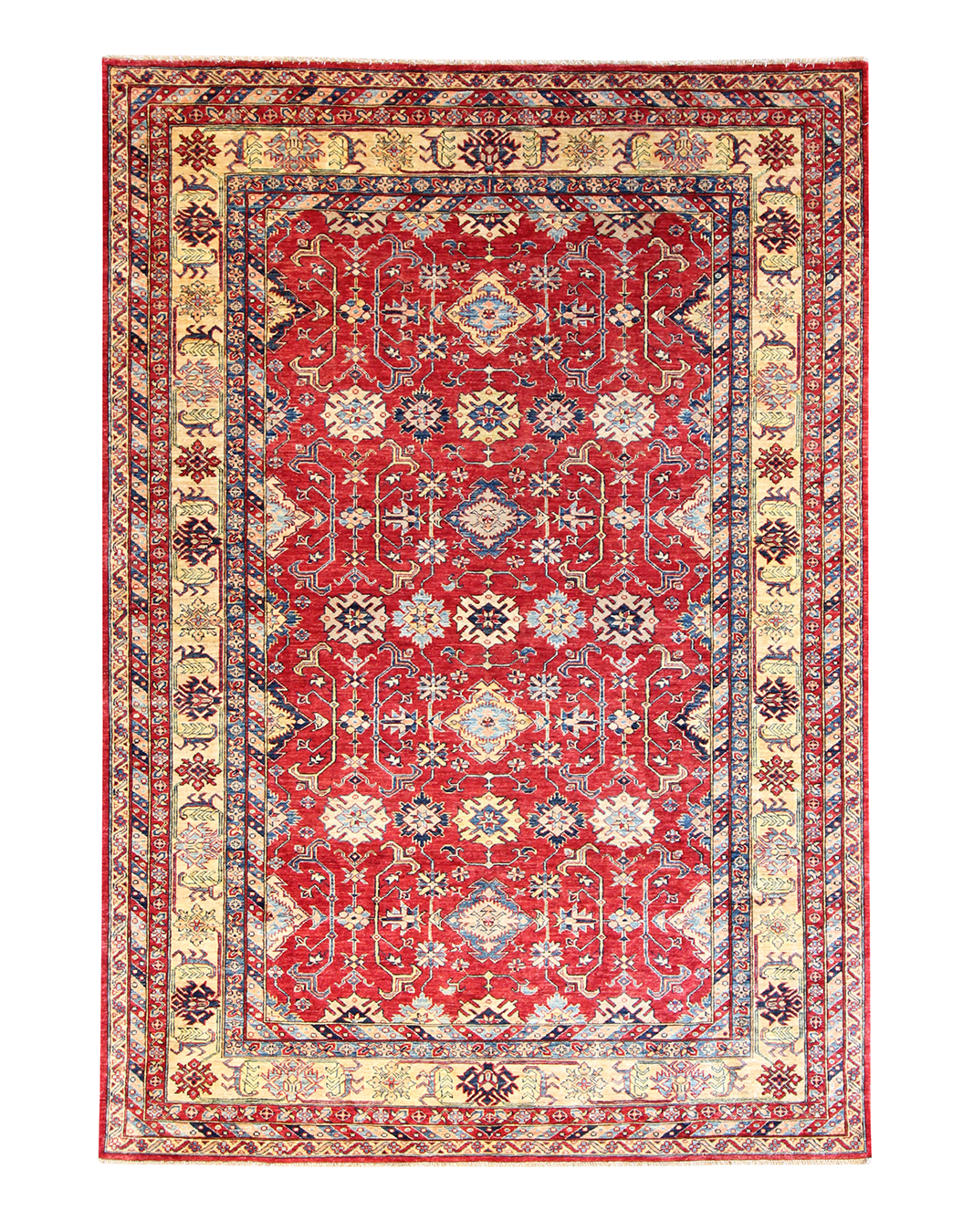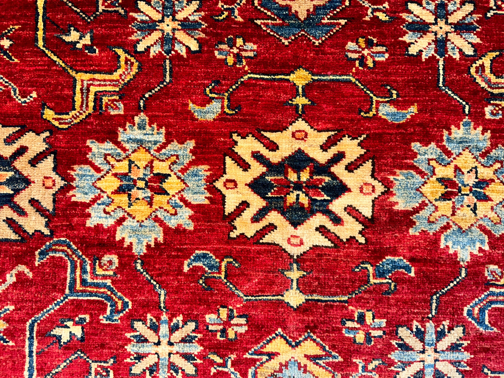 Vibrant and boldly traditional, this handmade rug features a dynamic allover pattern of stylized medallions and floral motifs on a radiant red field. Intricate vinework and geometric flourishes in shades of ivory, navy, and soft blue add dimension and contrast, while the cream-toned border provides a graceful frame. The design evokes the rich heritage of Caucasian and tribal weaving, reinterpreted with clarity and warmth.
