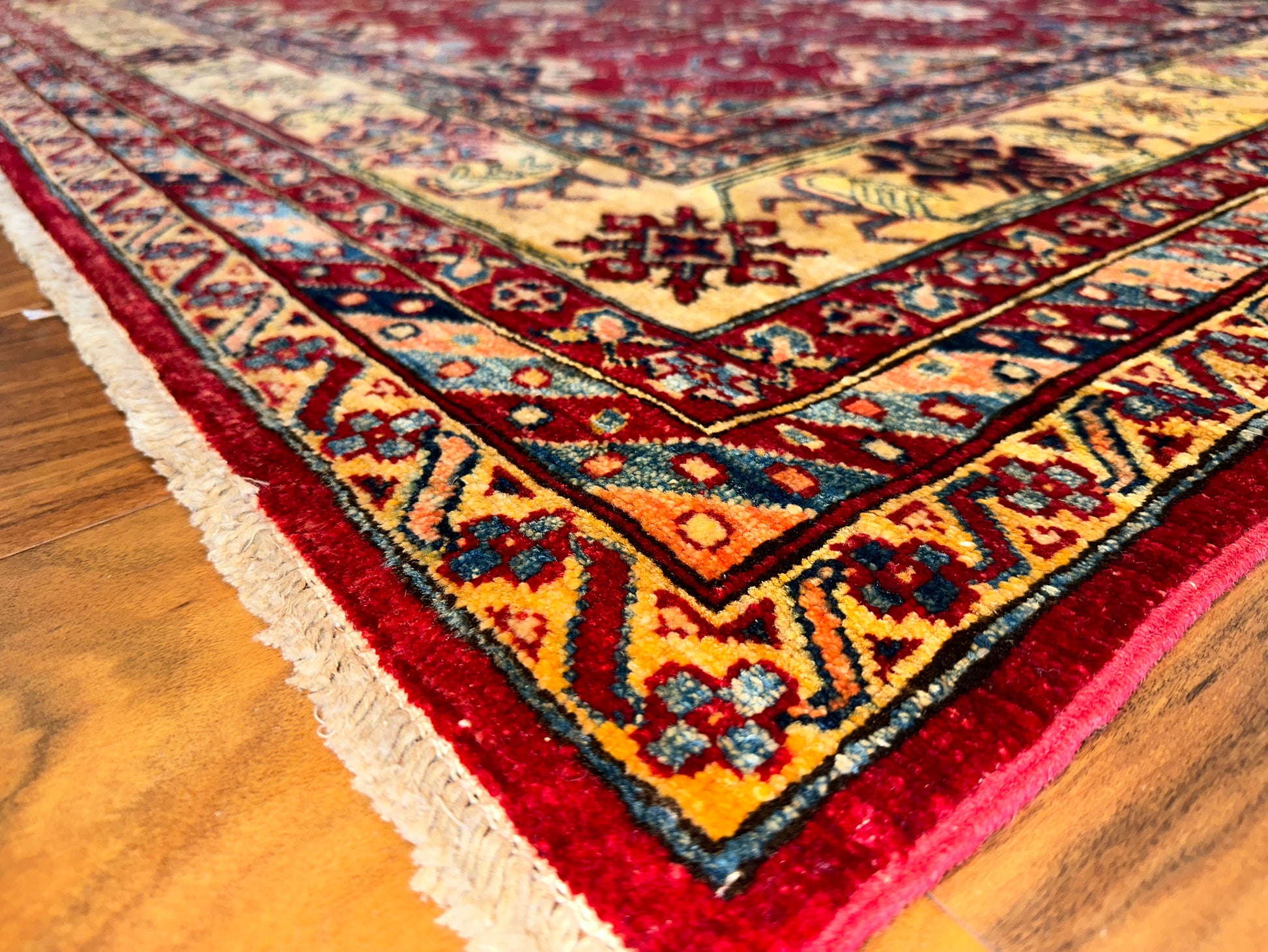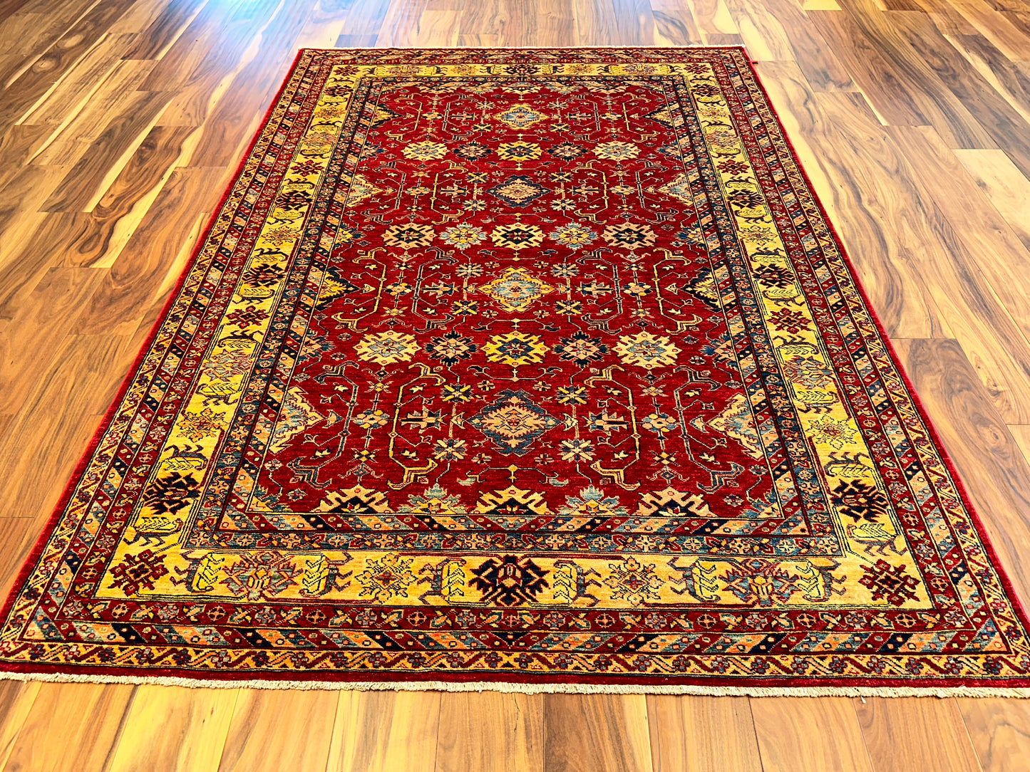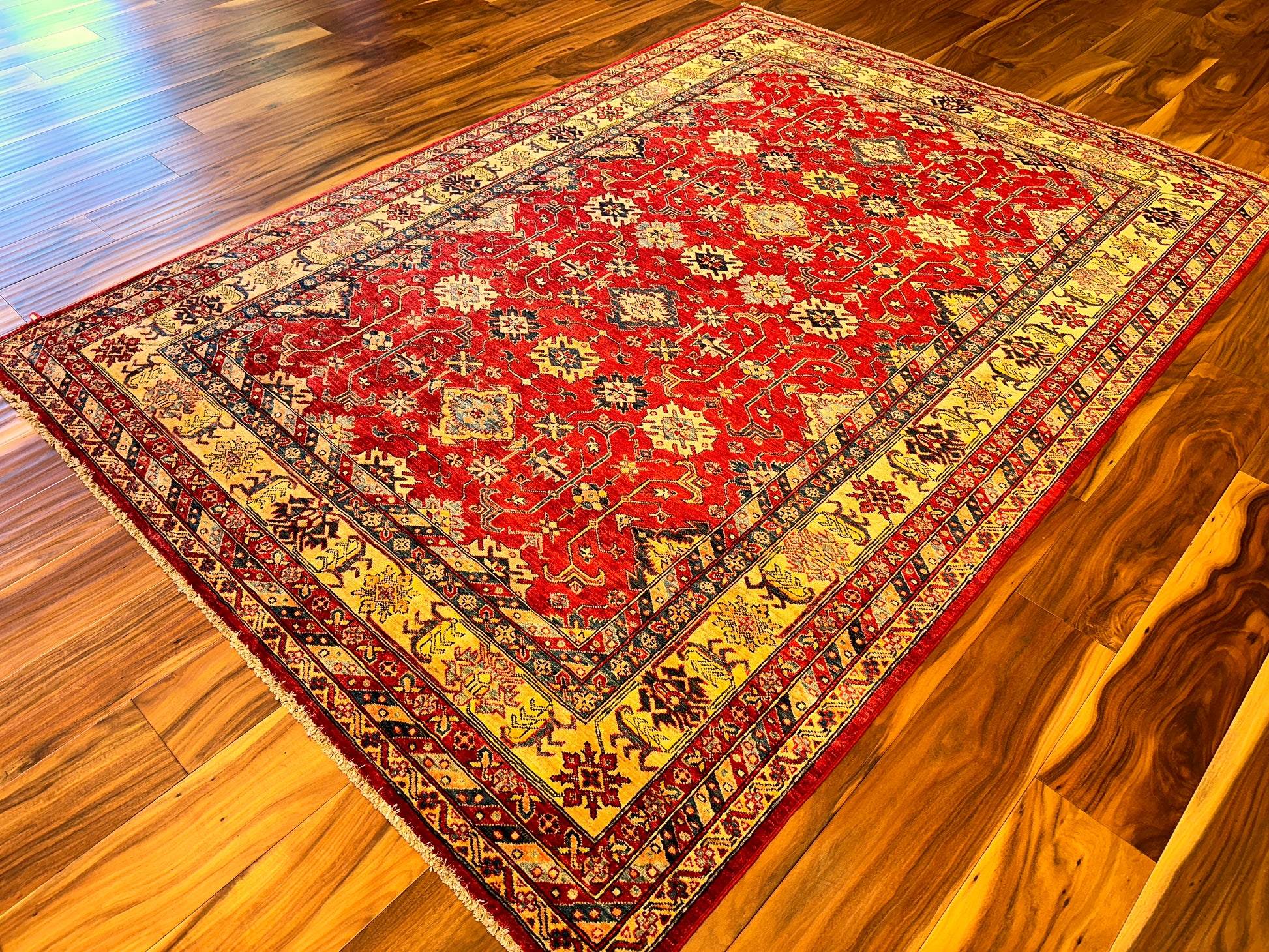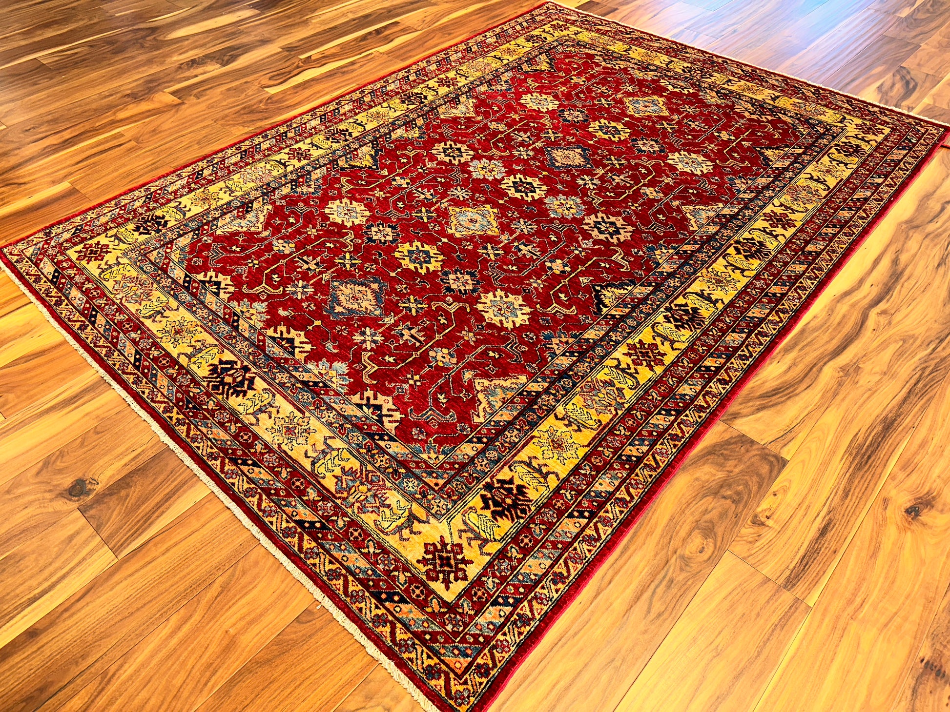 Vibrant and boldly traditional, this handmade rug features a dynamic allover pattern of stylized medallions and floral motifs on a radiant red field. Intricate vinework and geometric flourishes in shades of ivory, navy, and soft blue add dimension and contrast, while the cream-toned border provides a graceful frame. The design evokes the rich heritage of Caucasian and tribal weaving, reinterpreted with clarity and warmth.