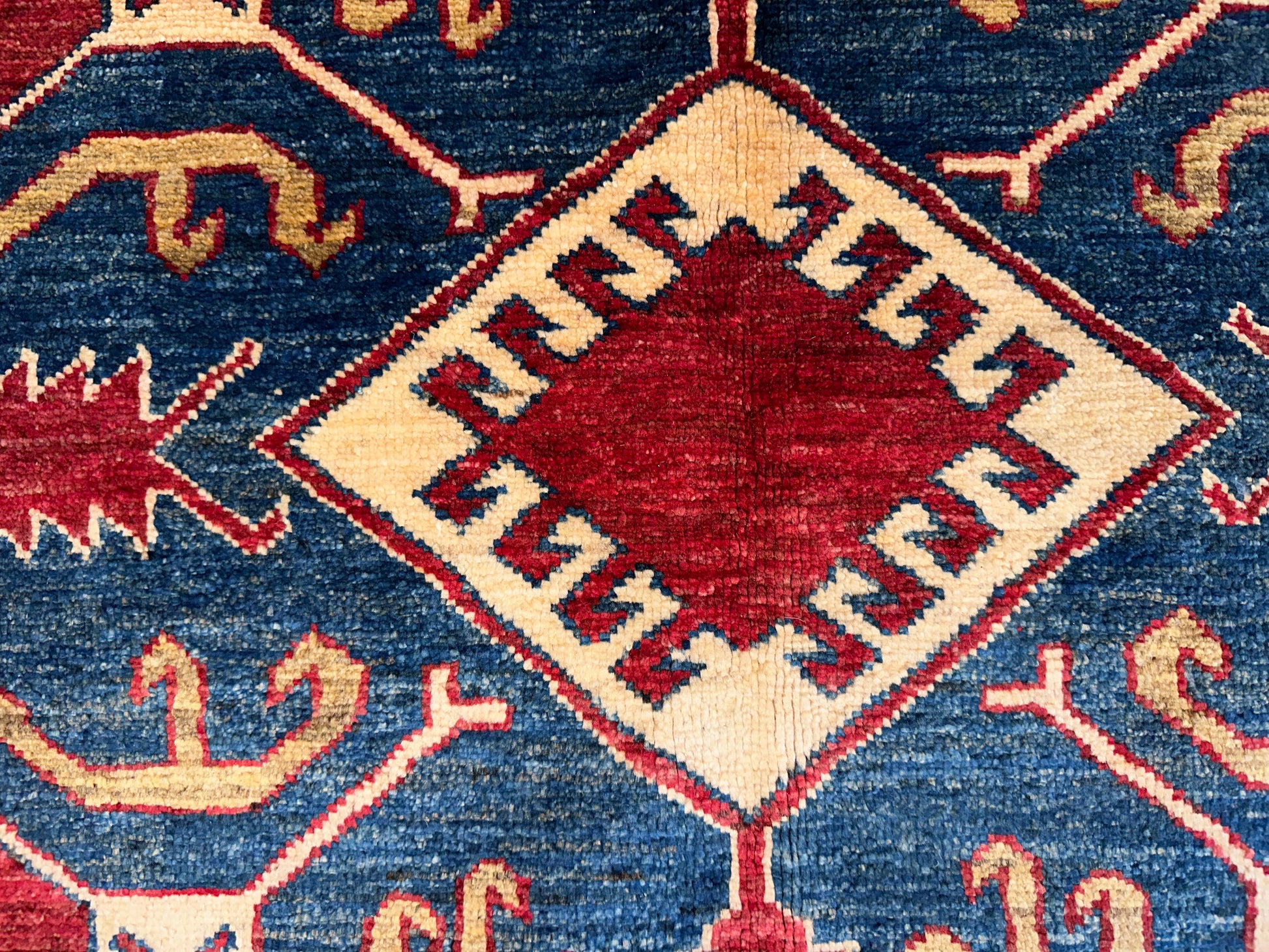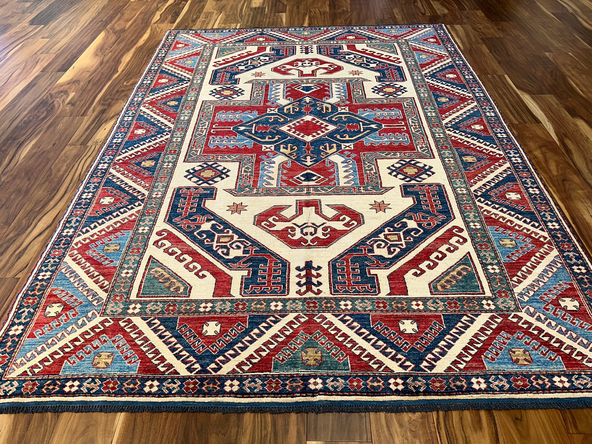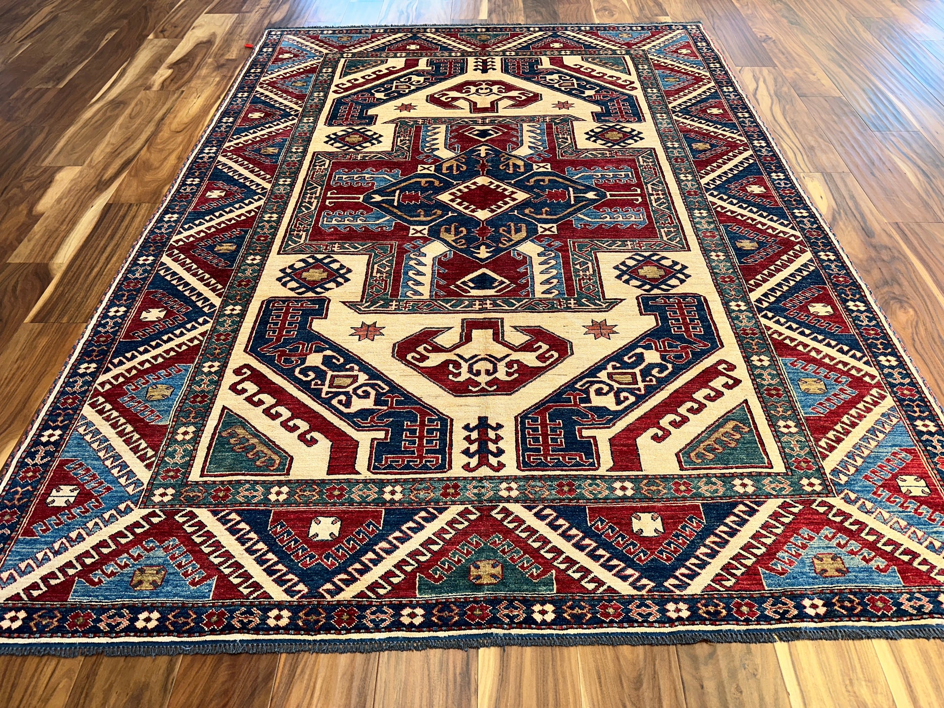 Bold and energetic, this hand-knotted wool rug features a striking central medallion surrounded by geometric motifs in a powerful tribal layout. The crisp contrast of crimson, navy, and ivory is balanced by teal and sky blue accents, enhancing the visual rhythm throughout. Its confident palette and structured pattern make it an expressive piece for lively, curated interiors.