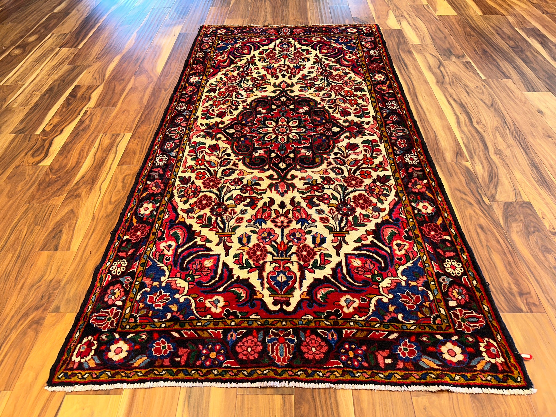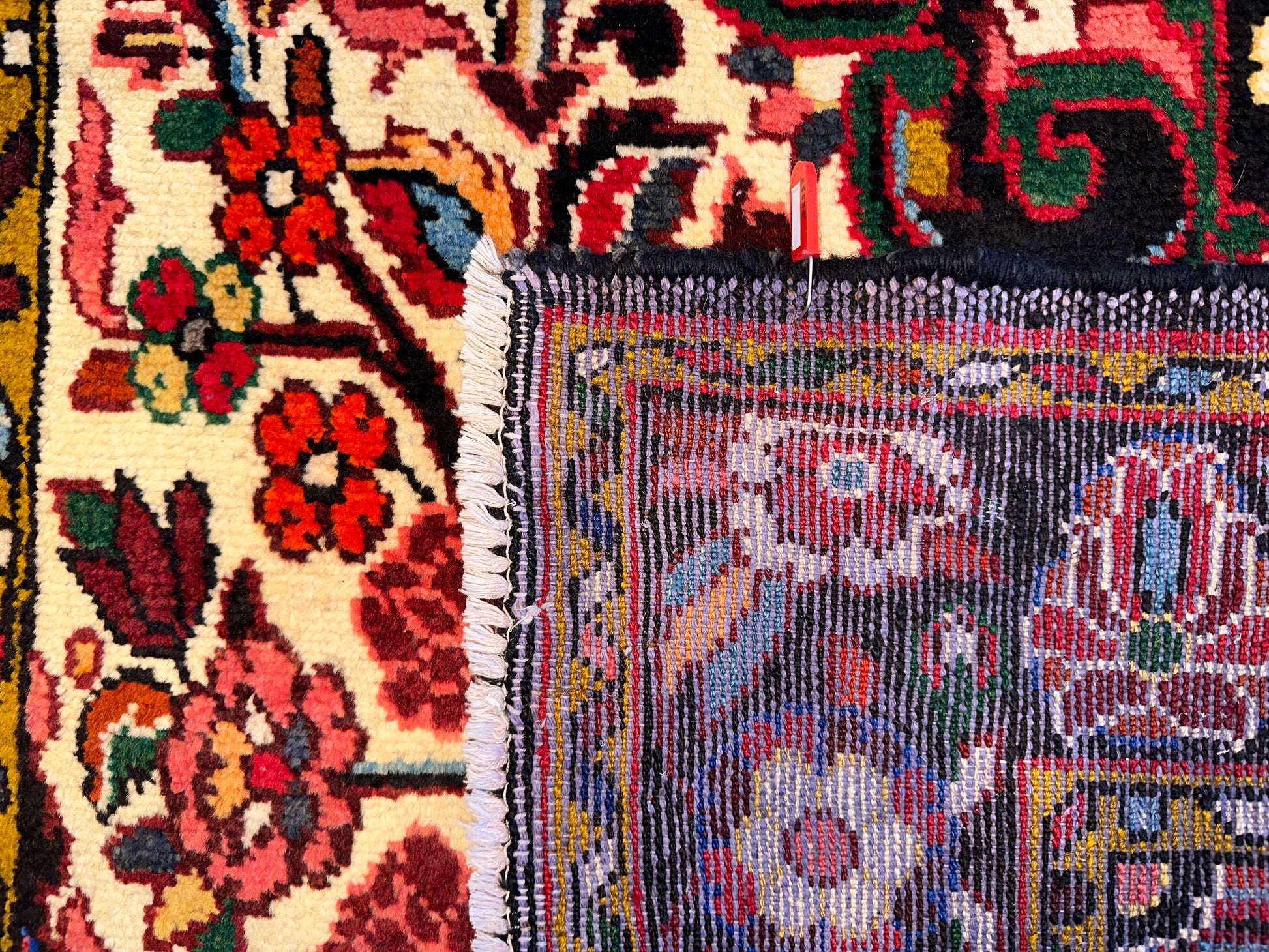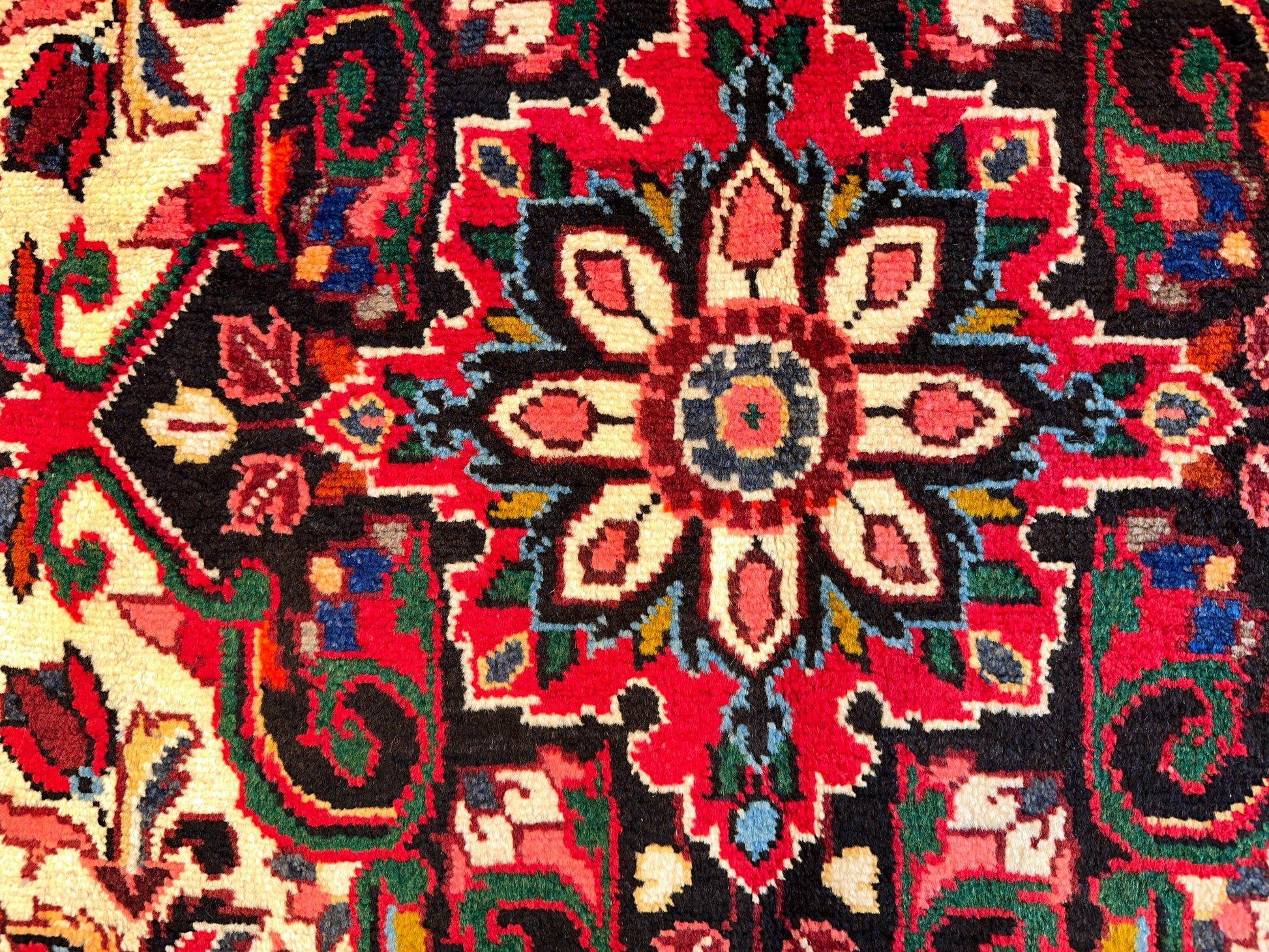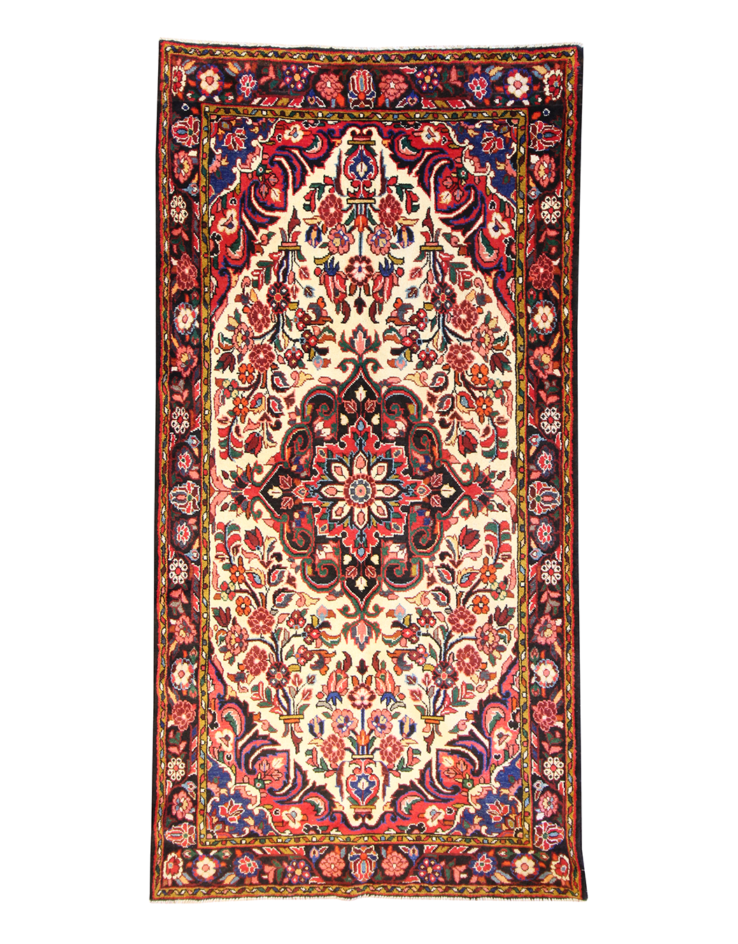 Lush and expressive, this hand-knotted rug showcases a dramatic central floral medallion set within a garden of blooming bouquets and ornate vases. The creamy beige field creates a striking contrast to the deep navy and vibrant red detailing, while the rich floral border brings cohesion to the composition. A vivid celebration of traditional Persian artistry.