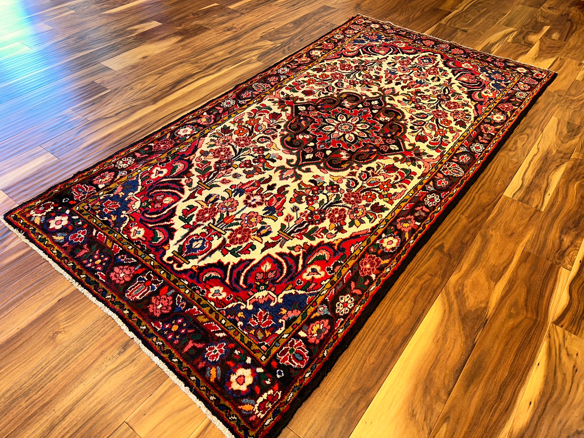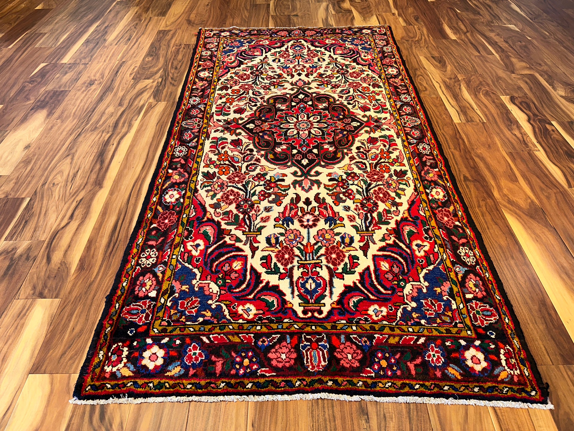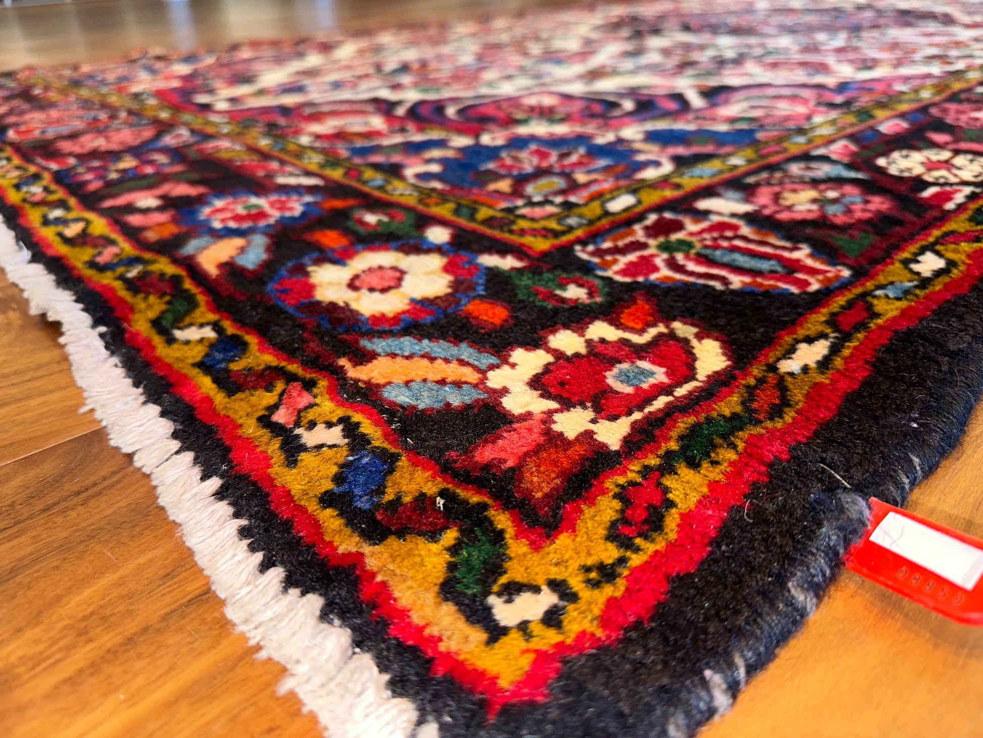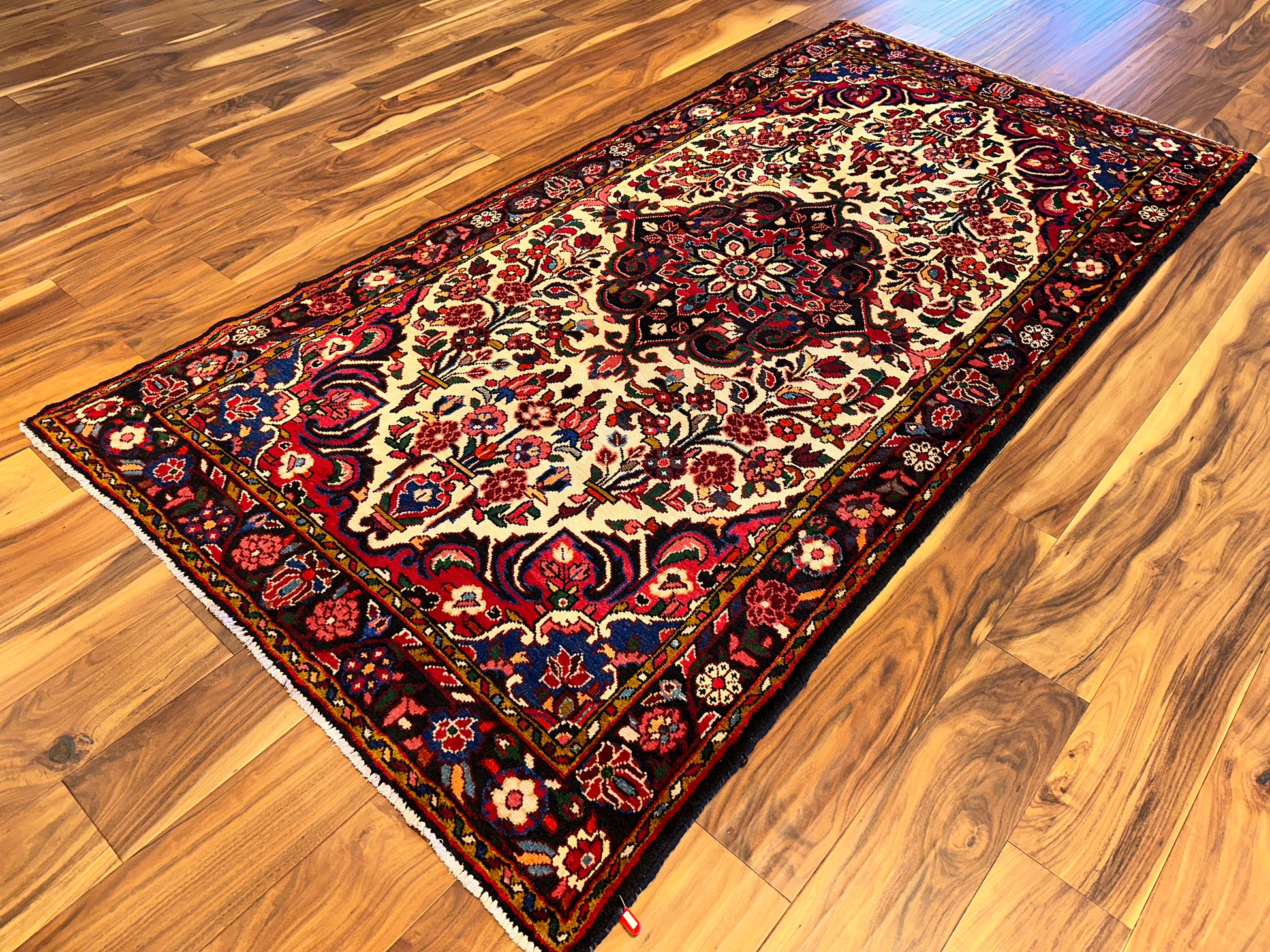 Lush and expressive, this hand-knotted rug showcases a dramatic central floral medallion set within a garden of blooming bouquets and ornate vases. The creamy beige field creates a striking contrast to the deep navy and vibrant red detailing, while the rich floral border brings cohesion to the composition. A vivid celebration of traditional Persian artistry.