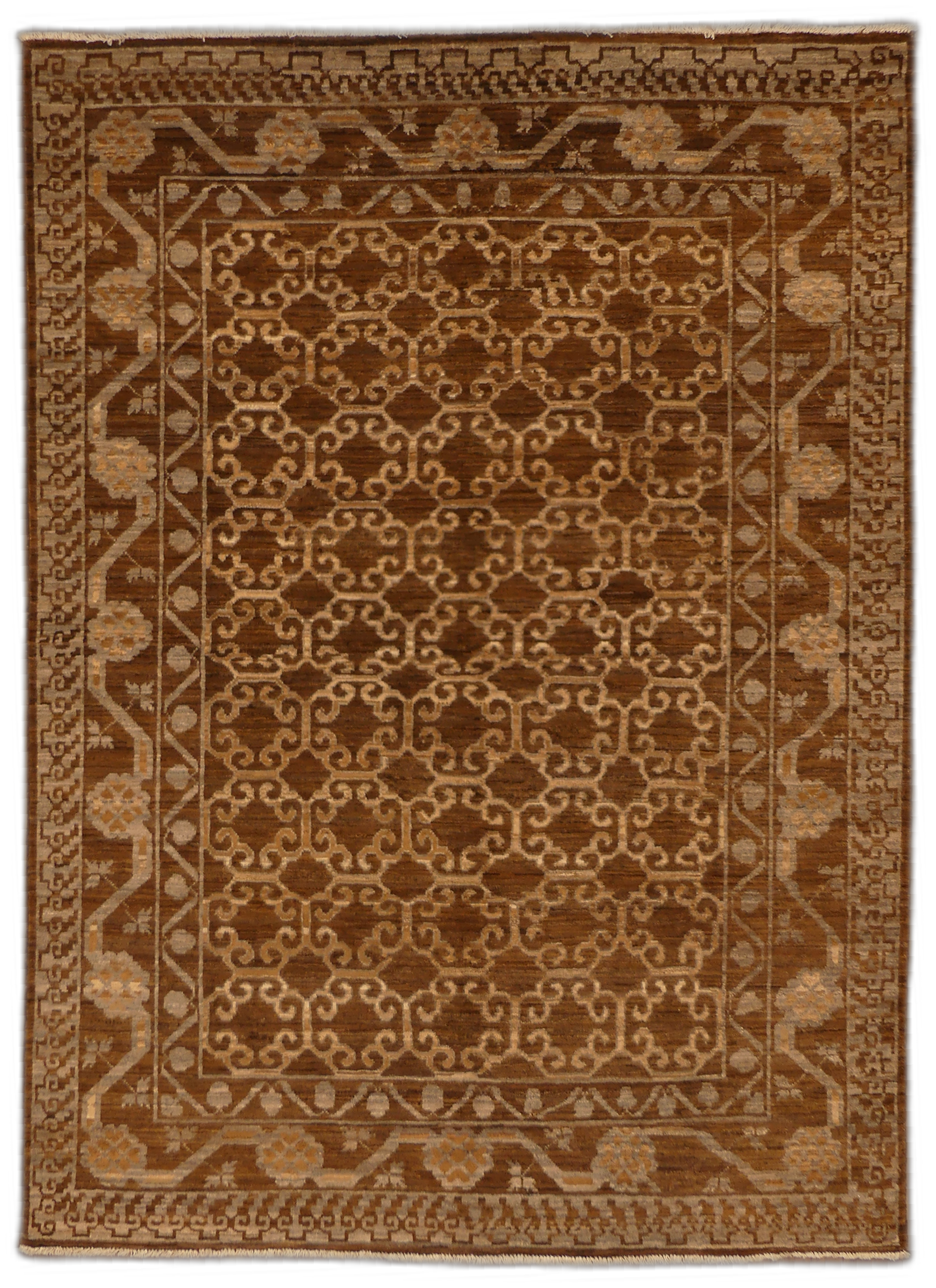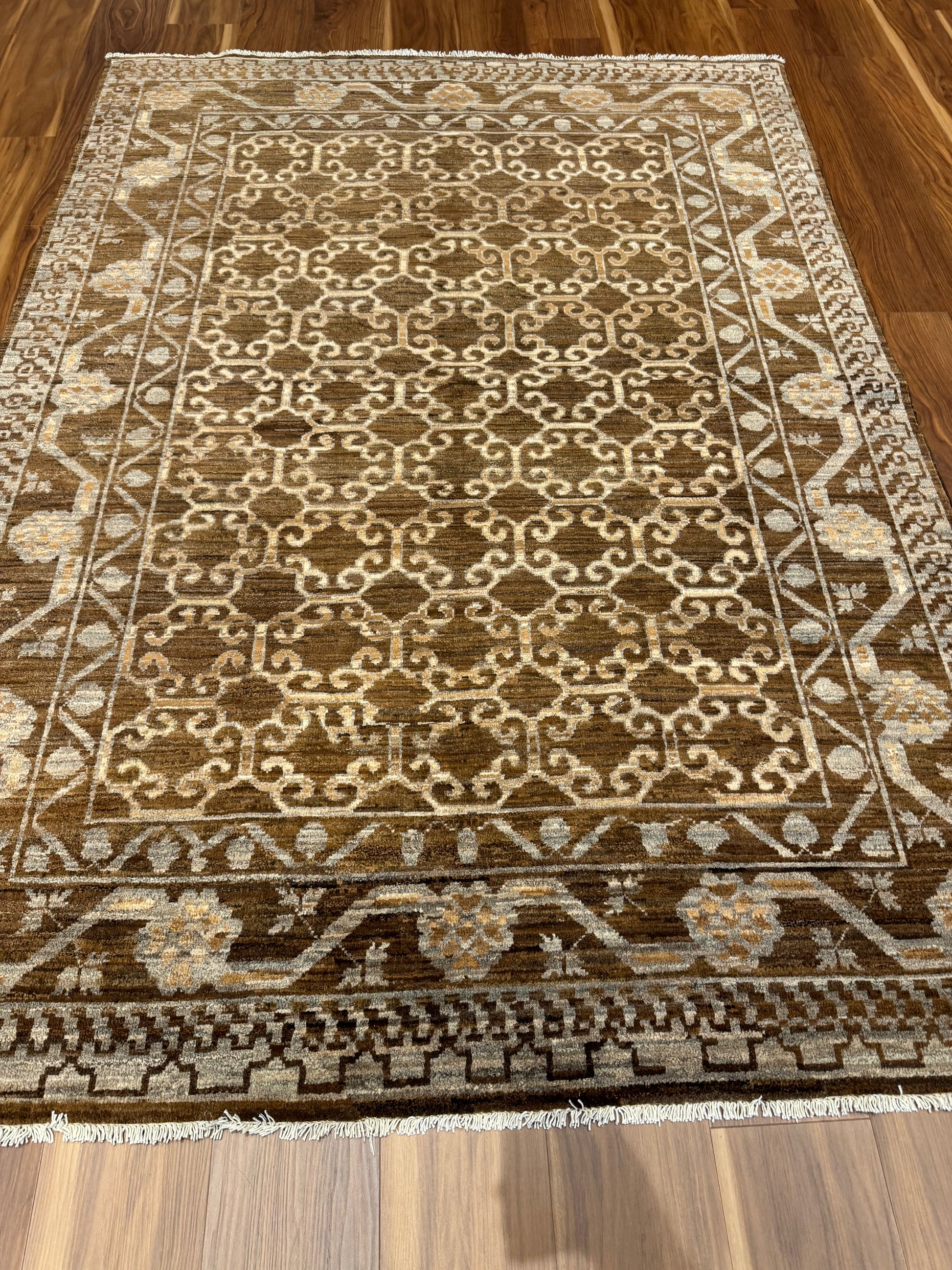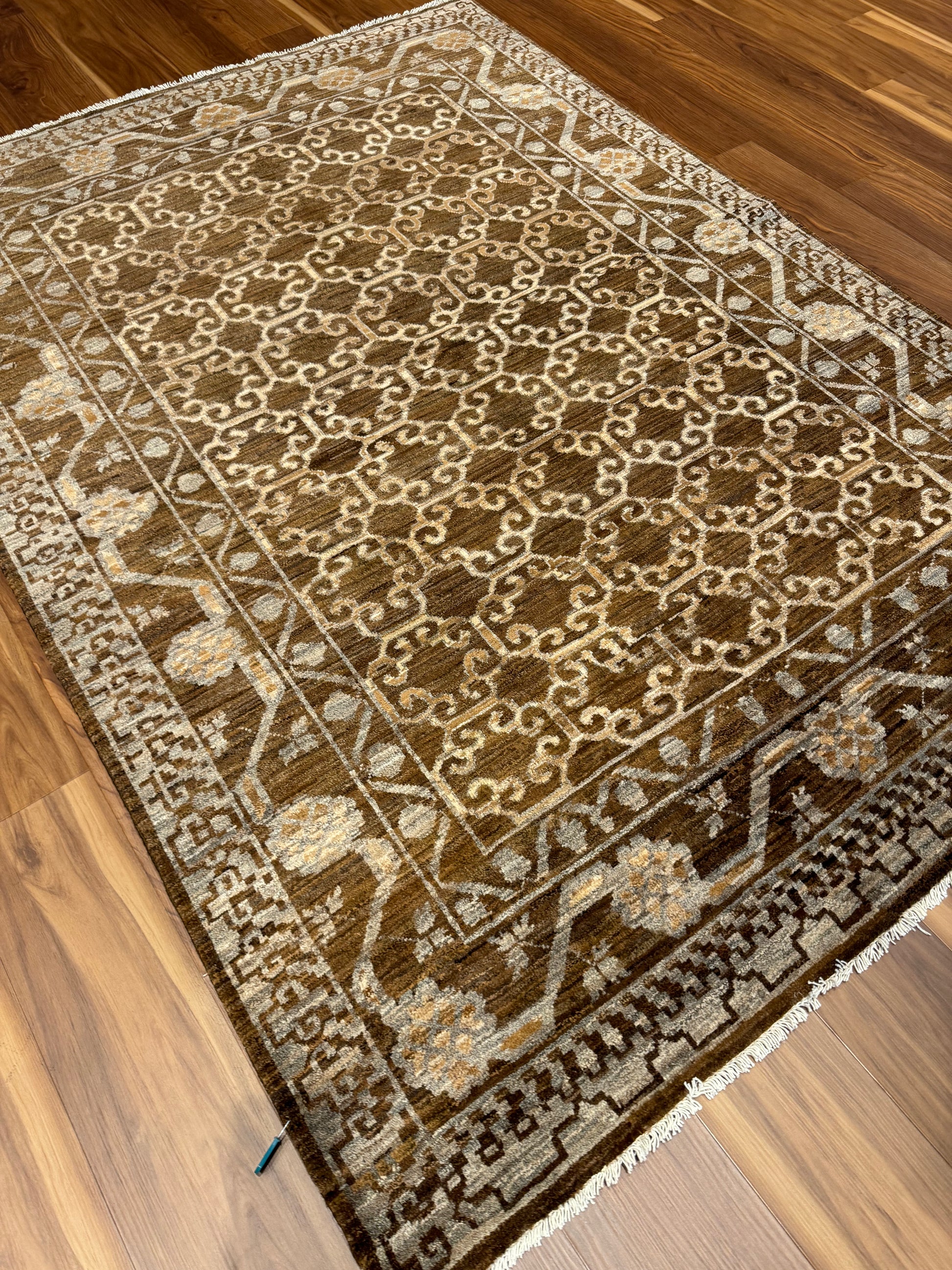 This exquisite Khotan rug features a traditional design characterized by symmetrical patterns and a rich brown, beige, and tan color palette. The delicate details and motifs are inspired by historic Oriental tapestries, giving it an air of timelessness. Crafted with high-quality wool, it promises durability and a soft, luxurious texture underfoot. Perfect for adding warmth and elegance to any classic or contemporary interior.