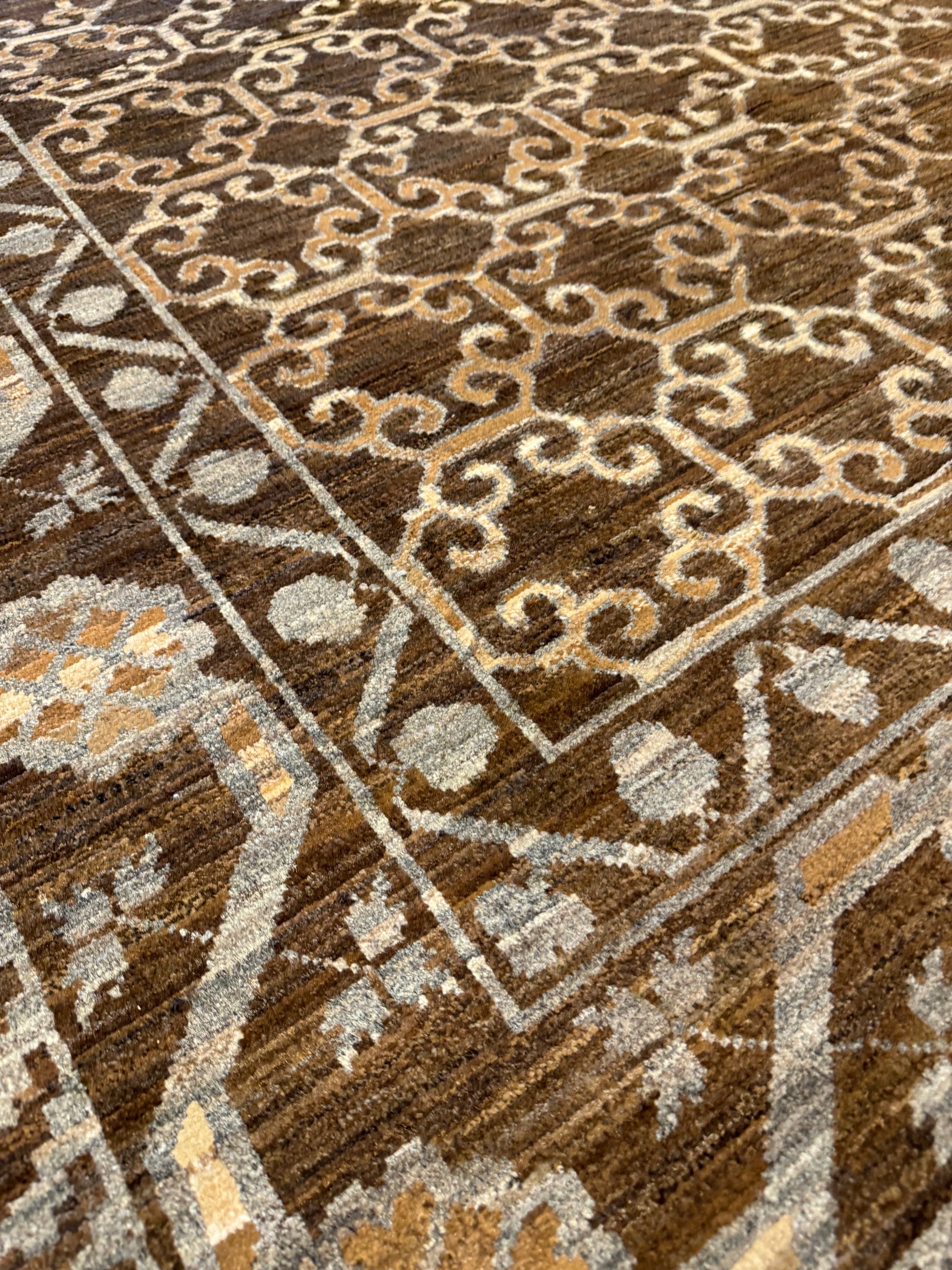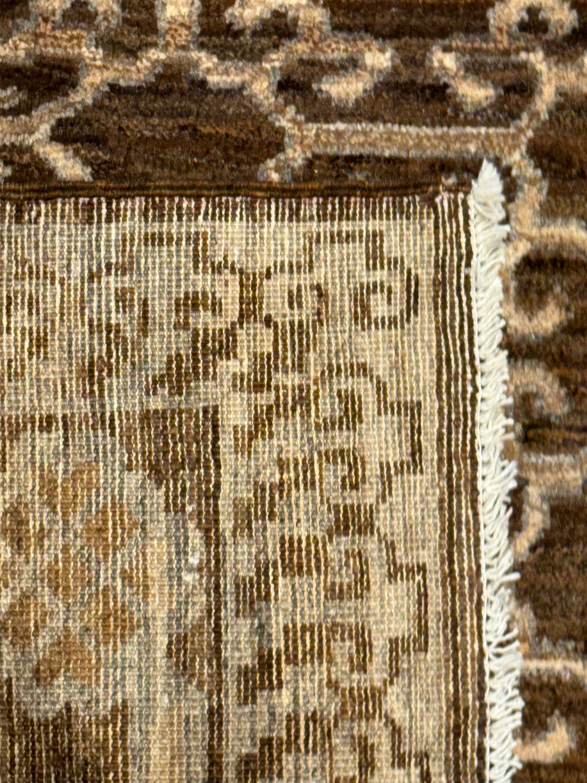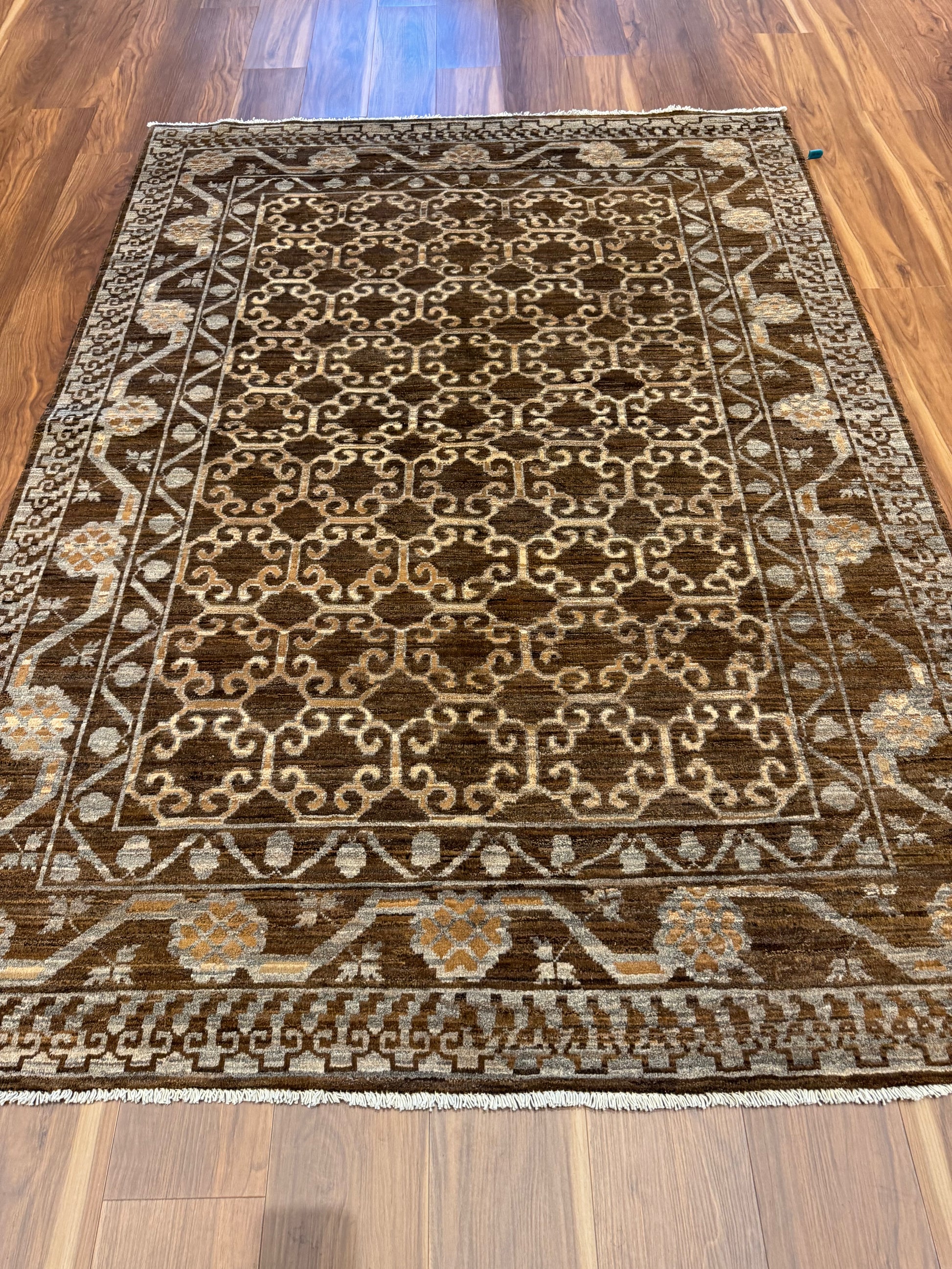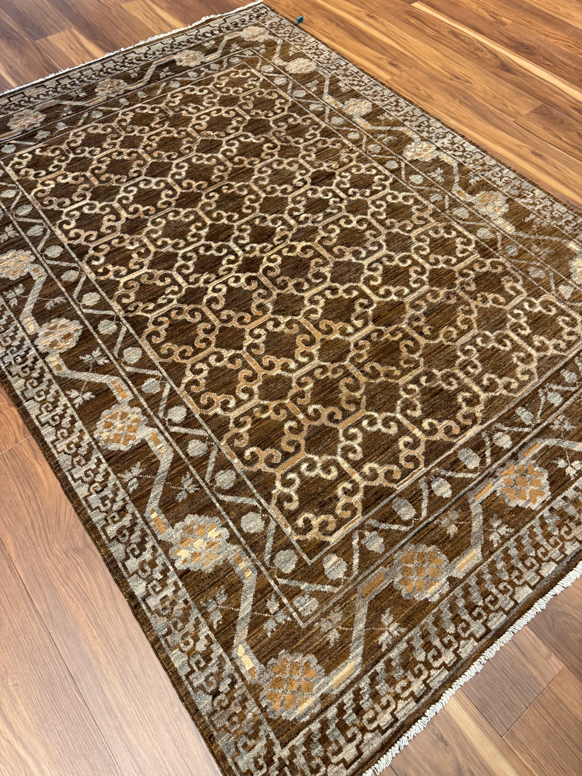 This exquisite Khotan rug features a traditional design characterized by symmetrical patterns and a rich brown, beige, and tan color palette. The delicate details and motifs are inspired by historic Oriental tapestries, giving it an air of timelessness. Crafted with high-quality wool, it promises durability and a soft, luxurious texture underfoot. Perfect for adding warmth and elegance to any classic or contemporary interior.