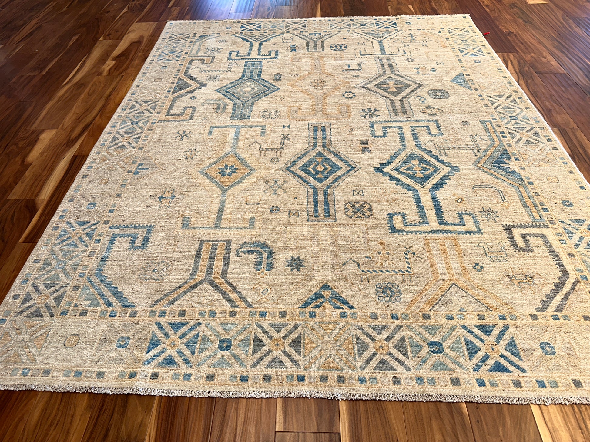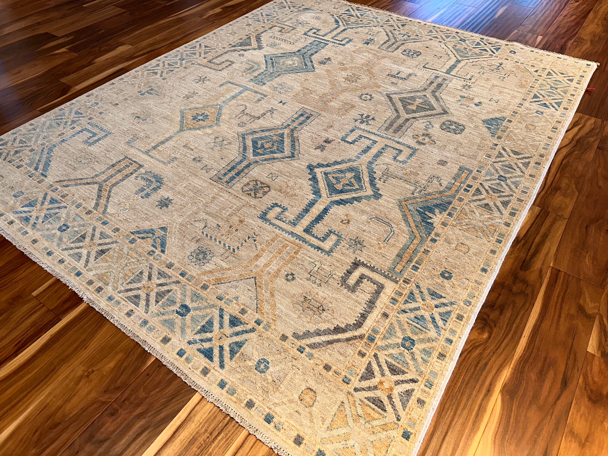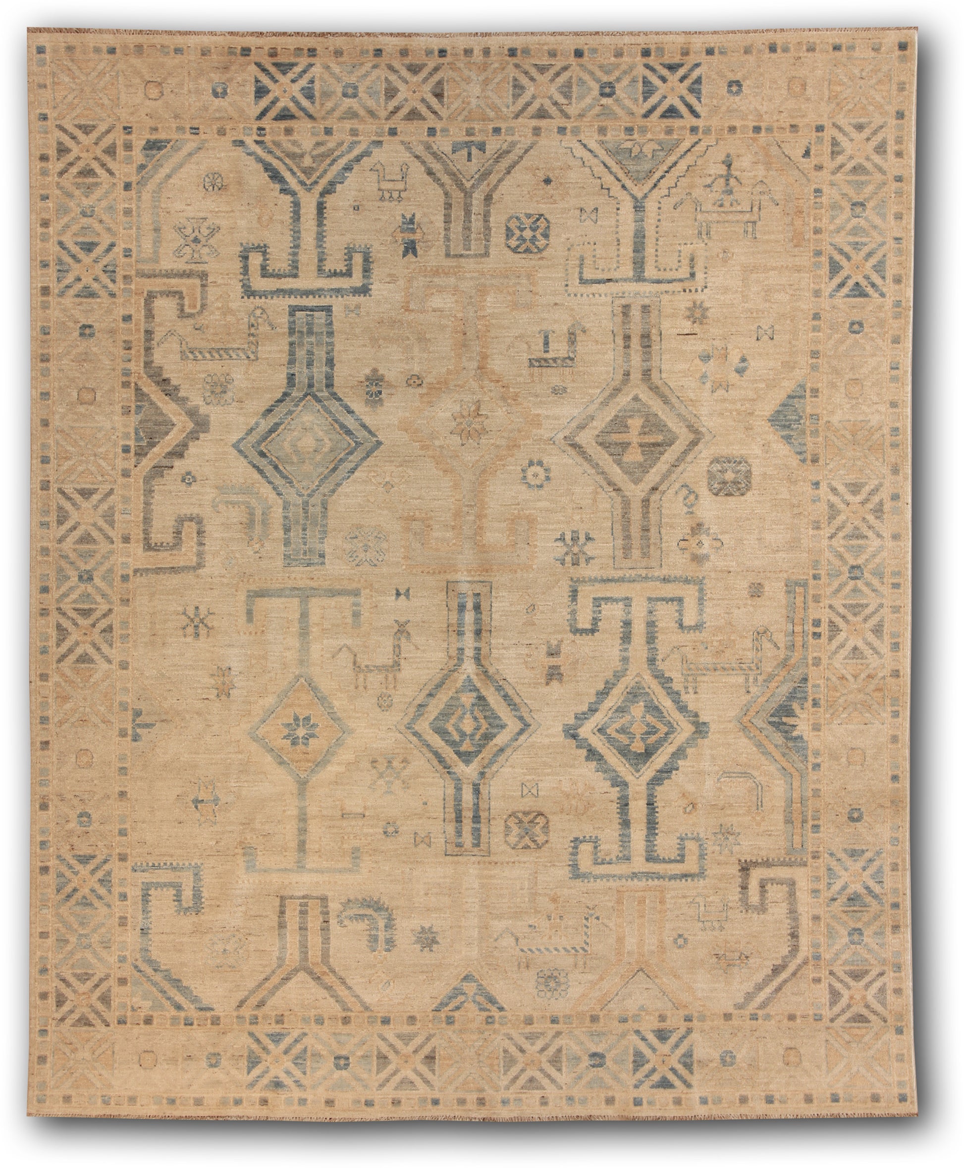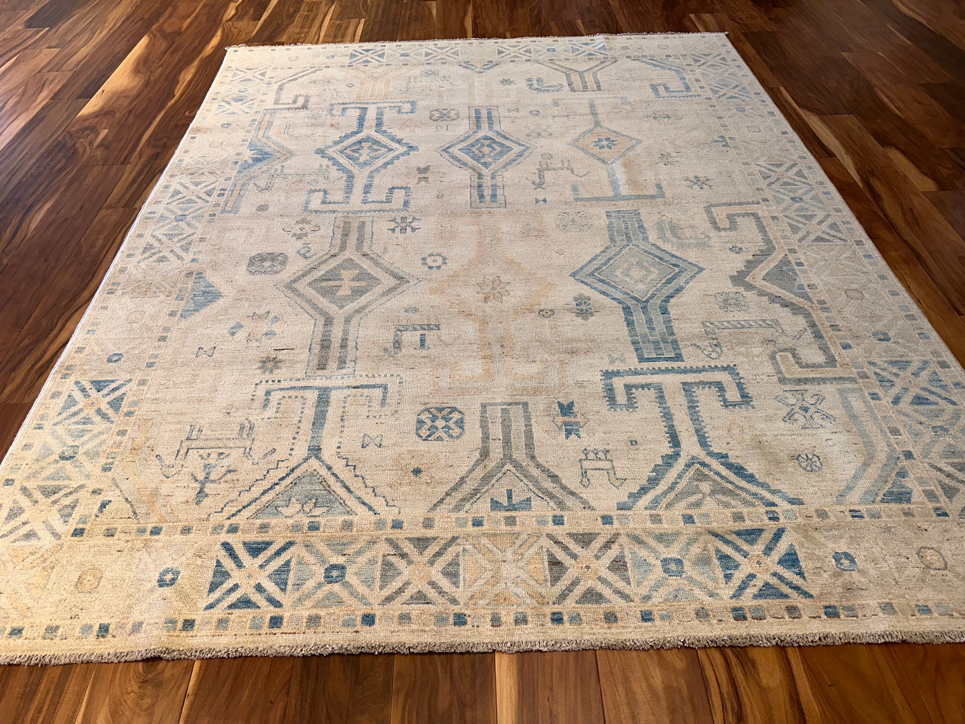 This hand-knotted wool rug features a bold tribal-inspired pattern softened by a gently faded palette. Large-scale geometric medallions and abstract motifs unfold across a sandy beige field, rendered in pale denim blues and soft stone tones. Its relaxed symmetry and muted colors lend a refined rustic presence with a distinctly artisanal feel.