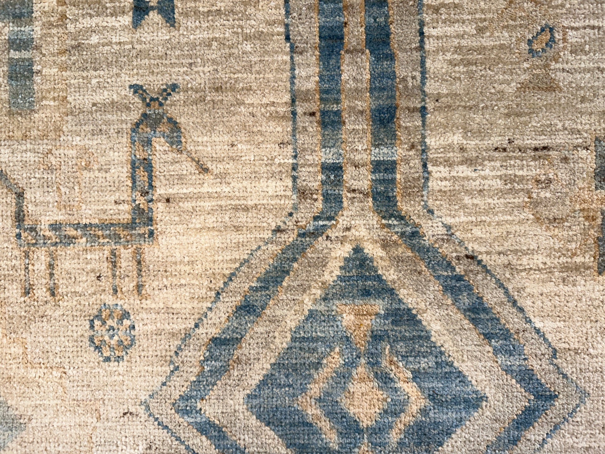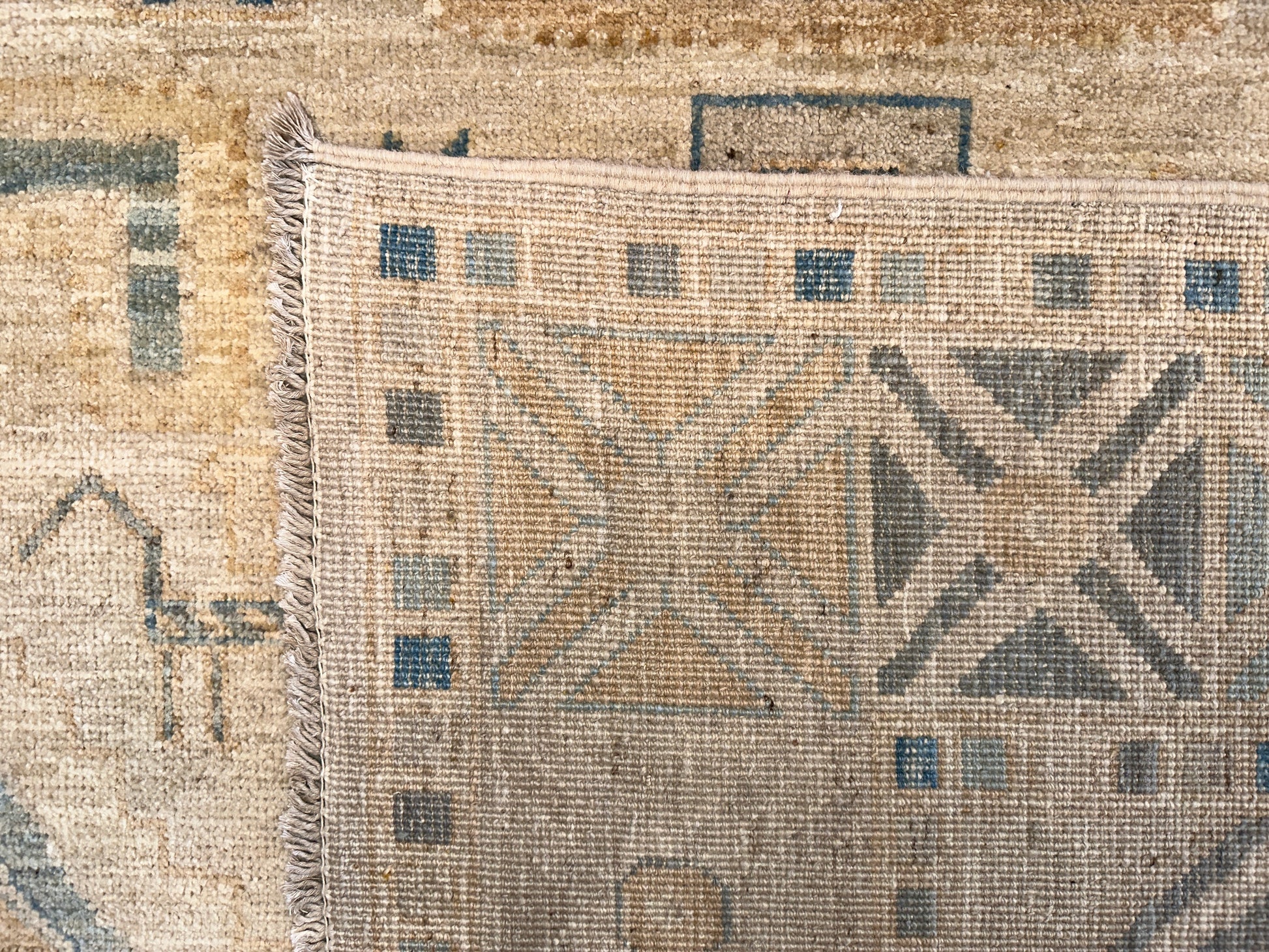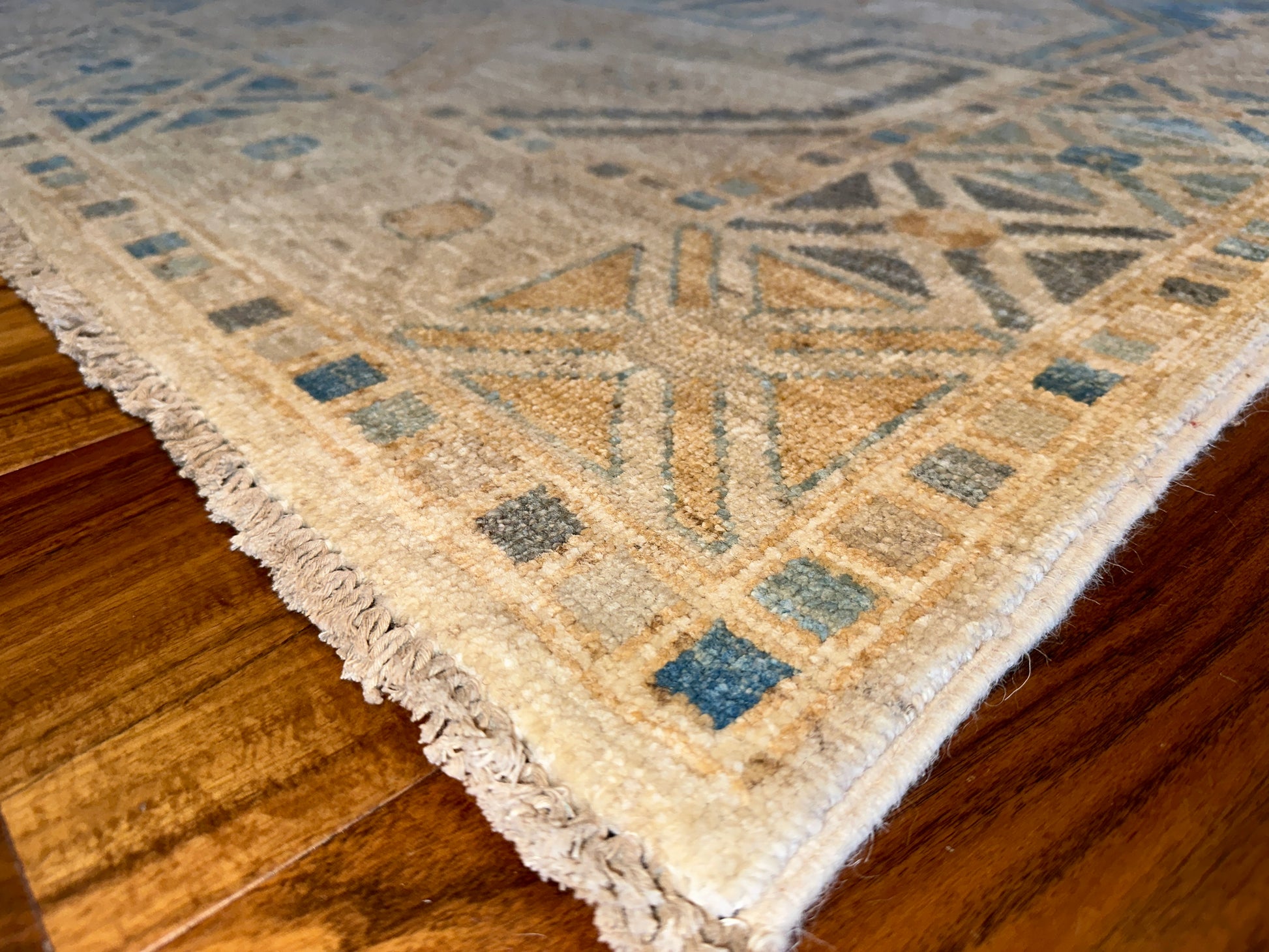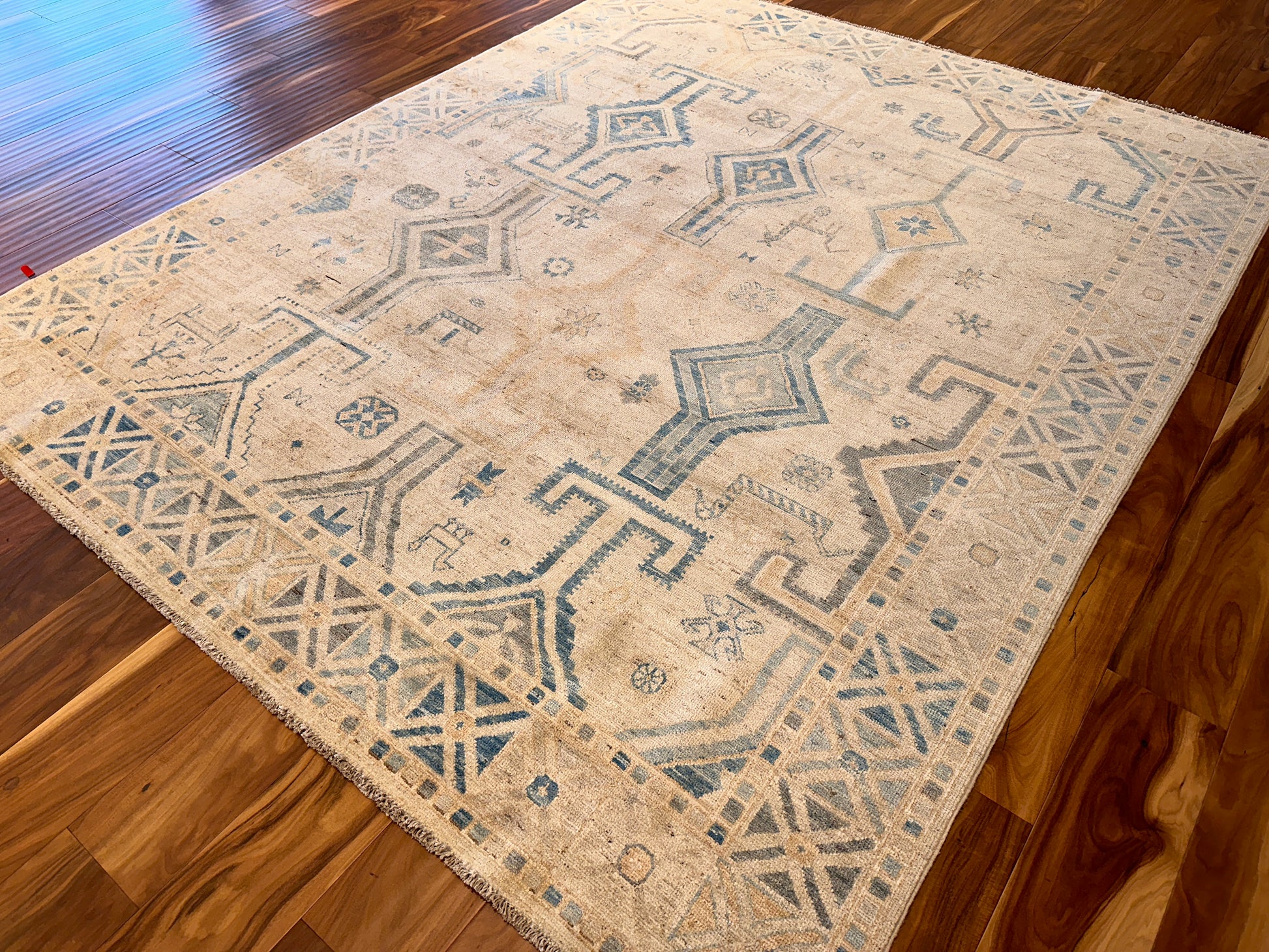 This hand-knotted wool rug features a bold tribal-inspired pattern softened by a gently faded palette. Large-scale geometric medallions and abstract motifs unfold across a sandy beige field, rendered in pale denim blues and soft stone tones. Its relaxed symmetry and muted colors lend a refined rustic presence with a distinctly artisanal feel.