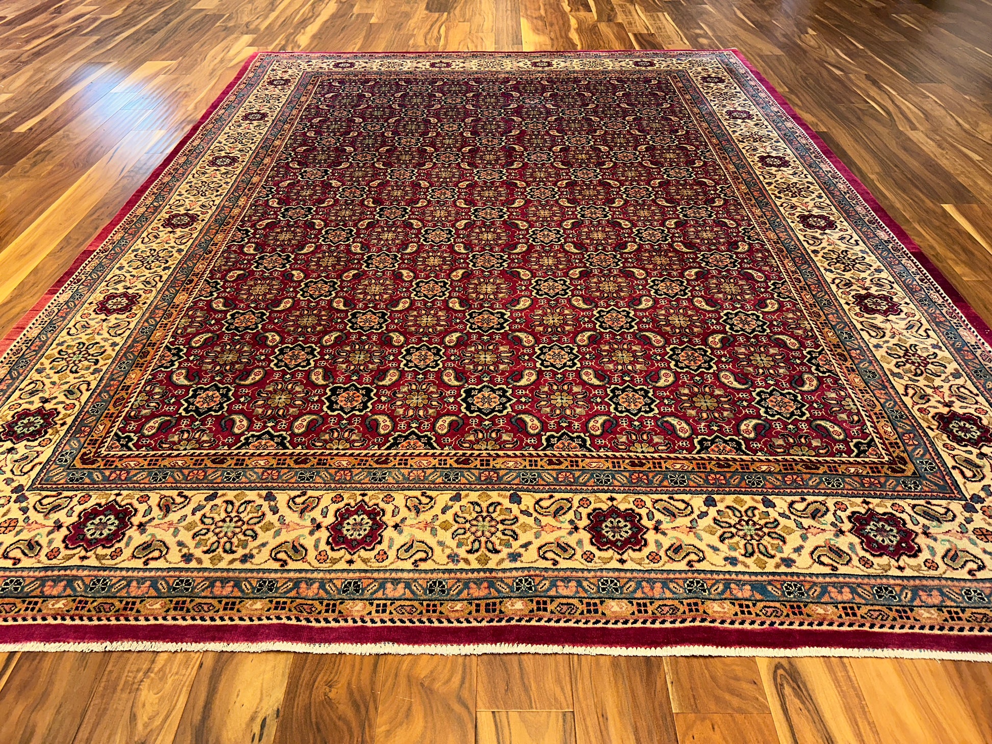This luxurious hand-knotted rug features a rich, ruby red field adorned with a repeating floral lattice pattern that evokes the refinement of classic Persian design. The soft ivory border, framed by intricate guard bands, creates a beautiful contrast that enhances the visual depth of the overall composition. Detailed medallions and botanical elements lend an air of sophistication, making this piece an elegant foundation for both formal and traditional spaces.