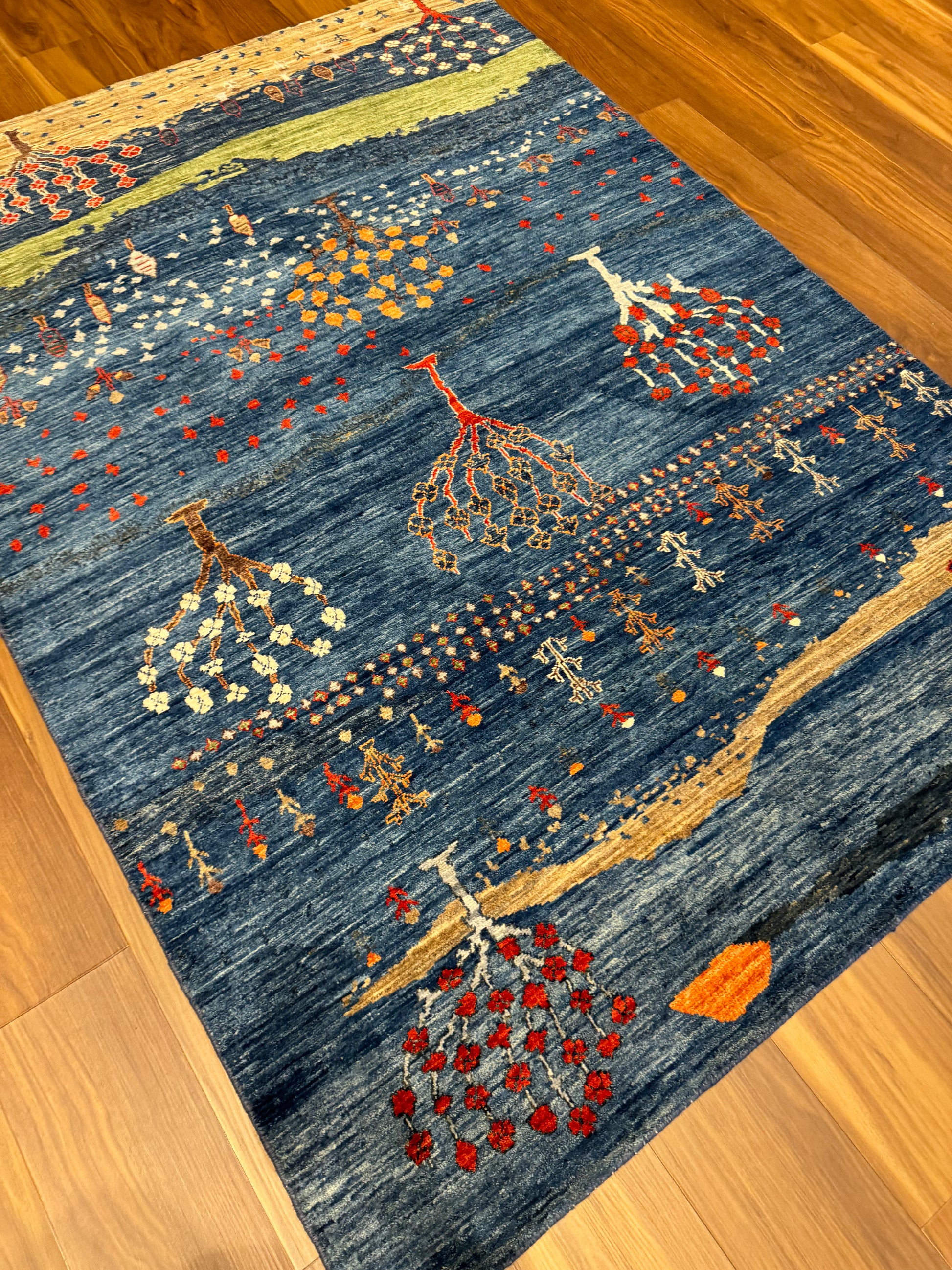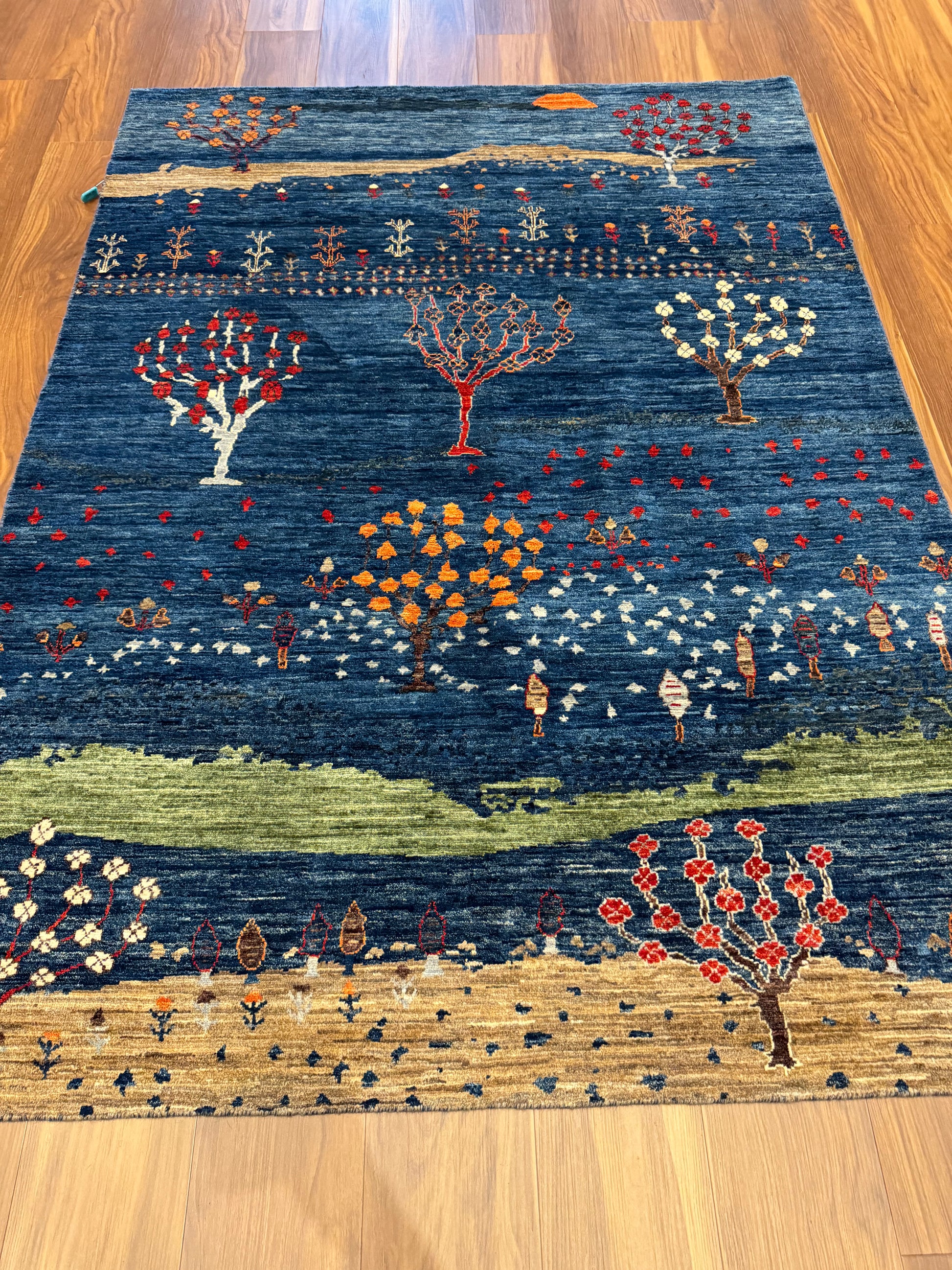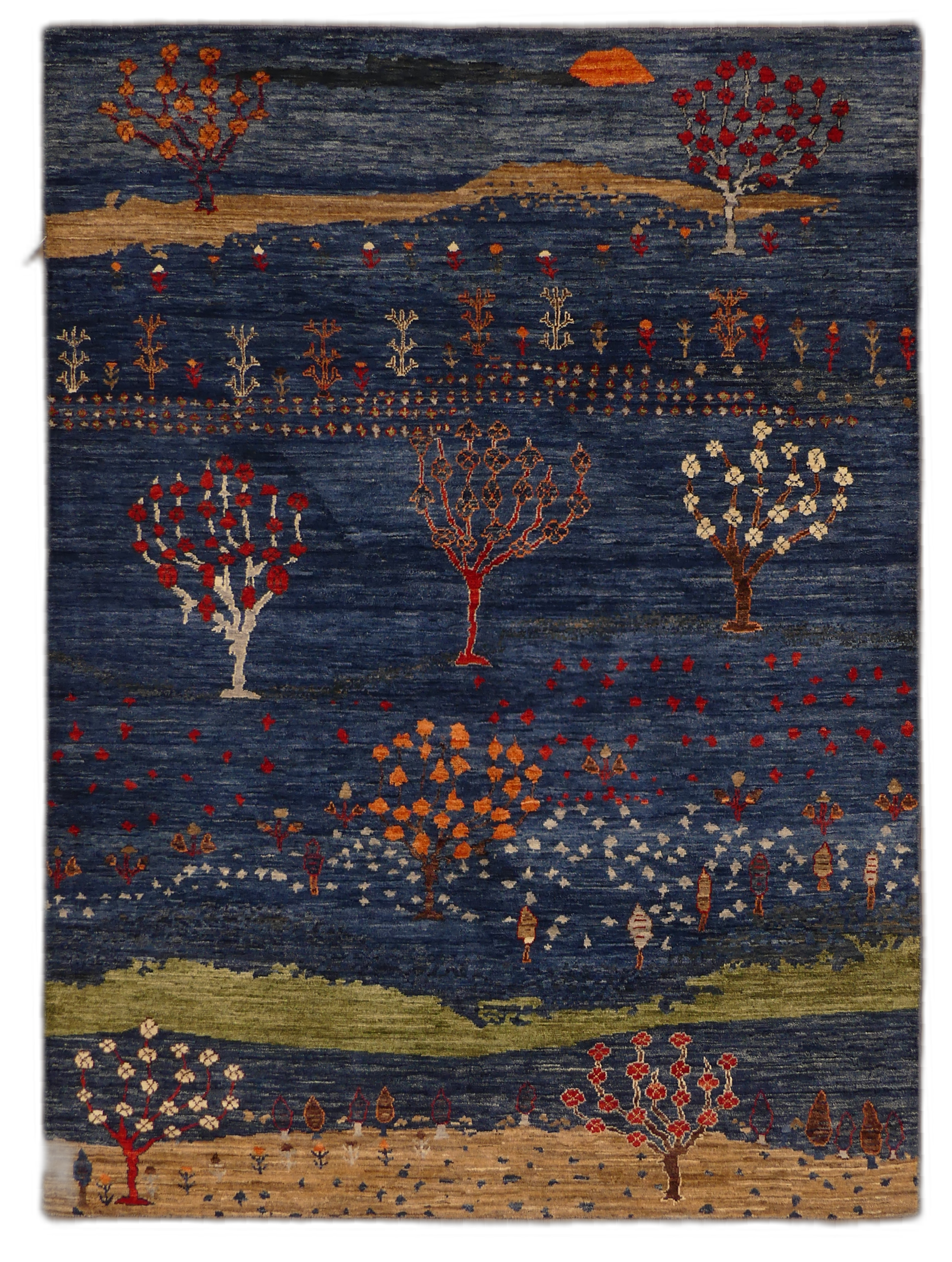 This Lori Gabbeh rug boasts a delightful pastoral scene, reminiscent of ancient storytelling. Handwoven from wool, its deep navy blue backdrop sets the stage for vibrant reds and oranges, creating a vivid contrast that elevates its simple charm. Each element – from the whimsical depiction of trees to the scattered wildlife – is skillfully crafted, exuding a warmth that's sure to enrich any living space.