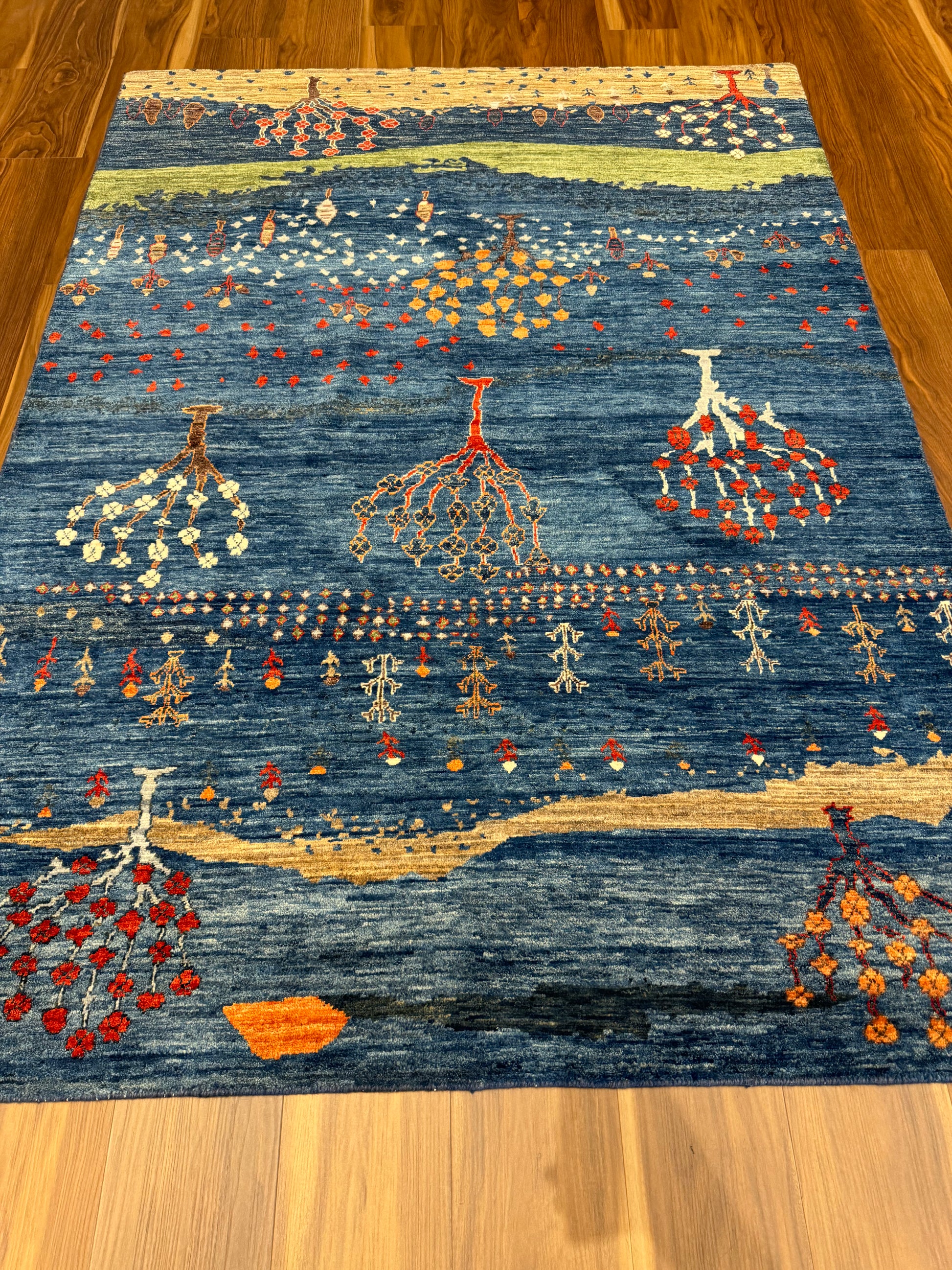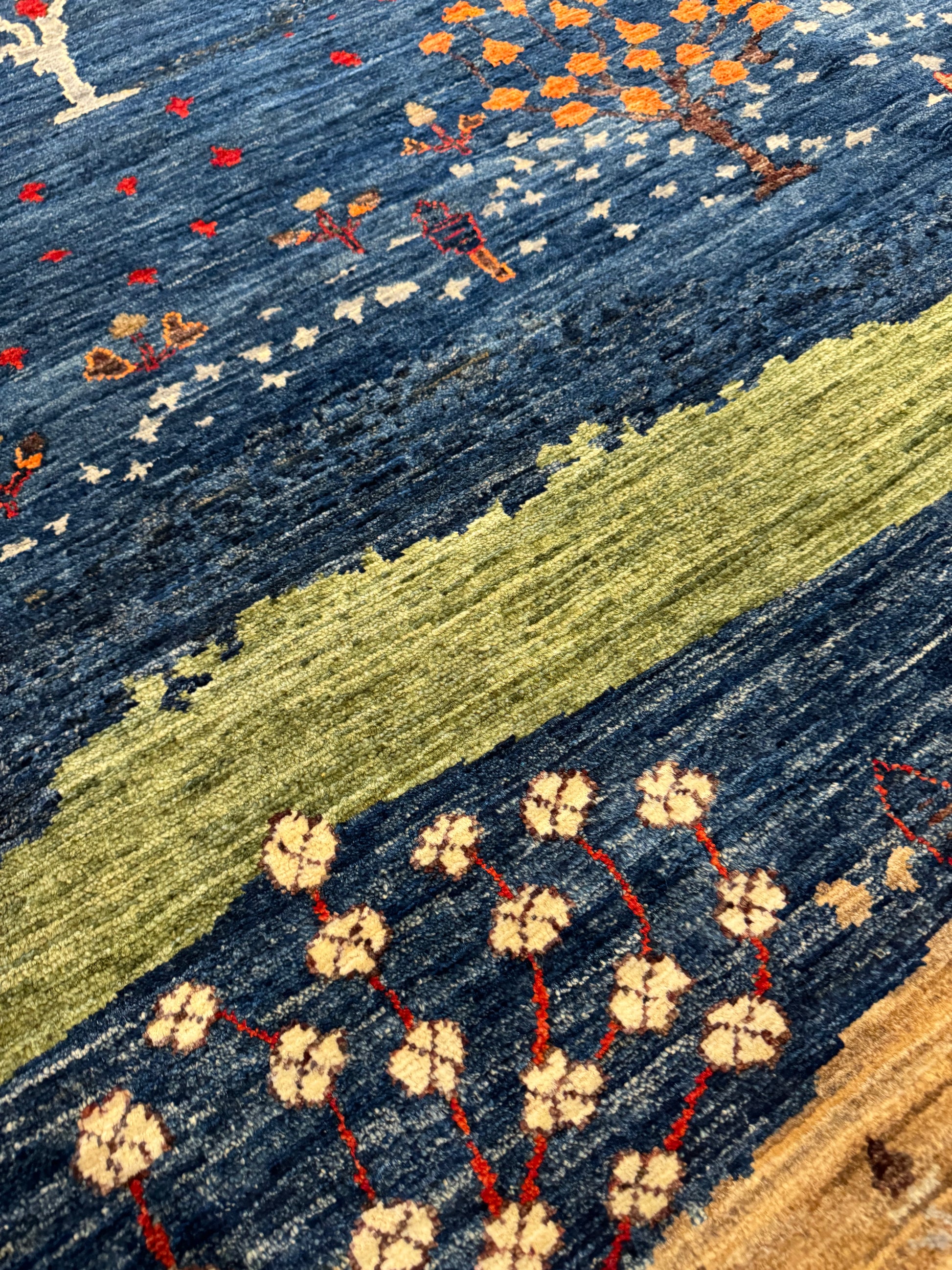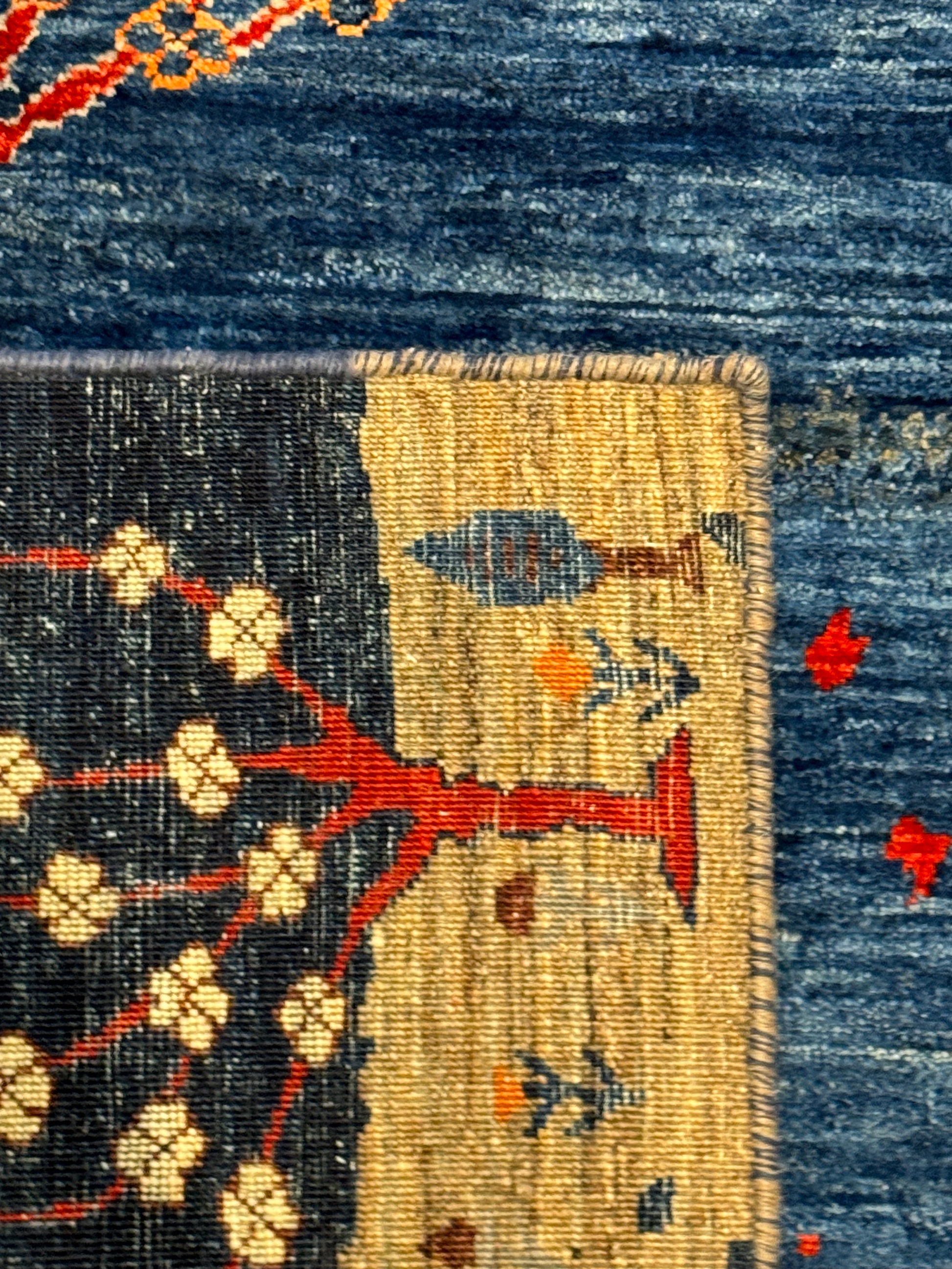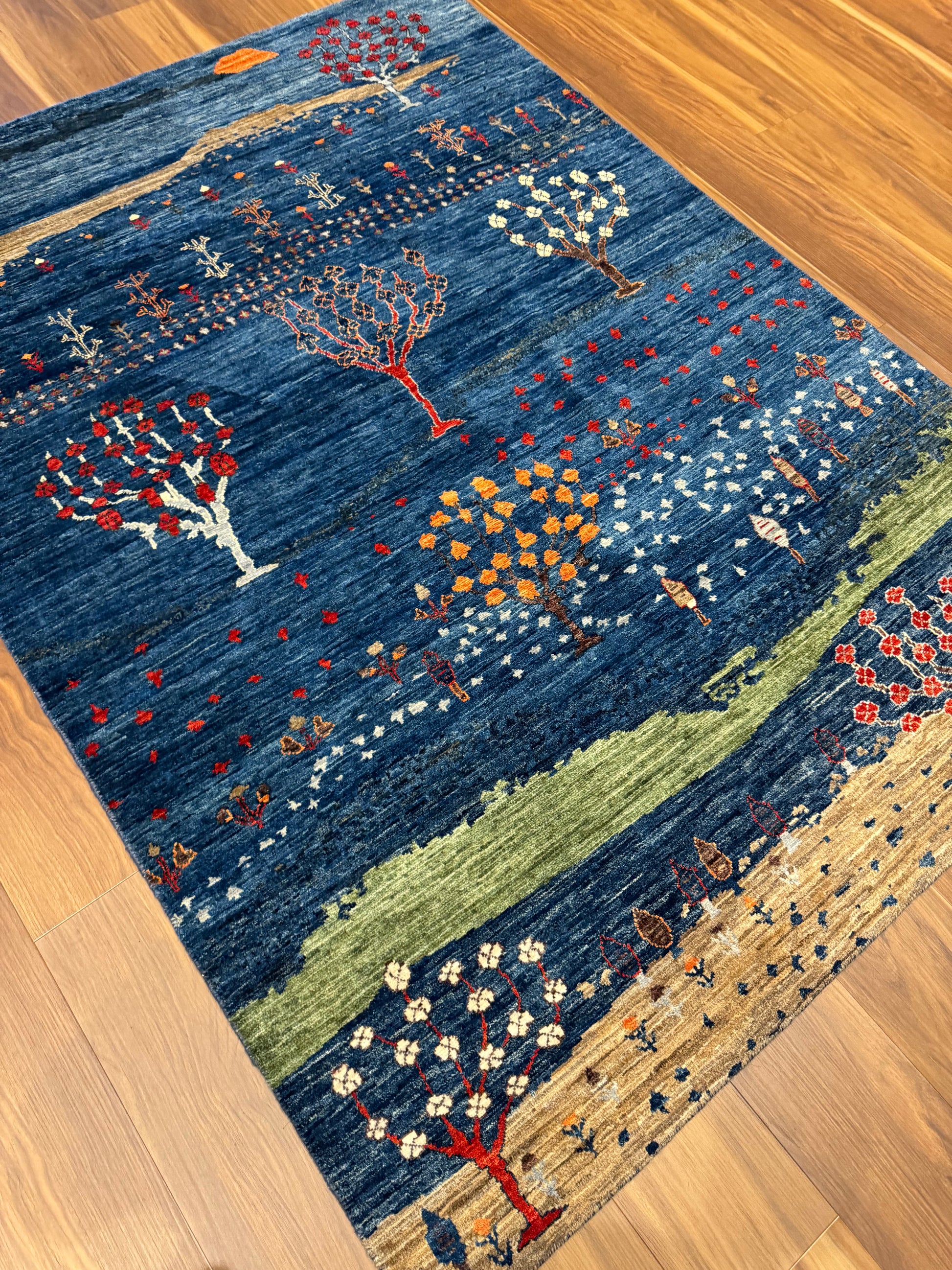 This Lori Gabbeh rug boasts a delightful pastoral scene, reminiscent of ancient storytelling. Handwoven from wool, its deep navy blue backdrop sets the stage for vibrant reds and oranges, creating a vivid contrast that elevates its simple charm. Each element – from the whimsical depiction of trees to the scattered wildlife – is skillfully crafted, exuding a warmth that's sure to enrich any living space.