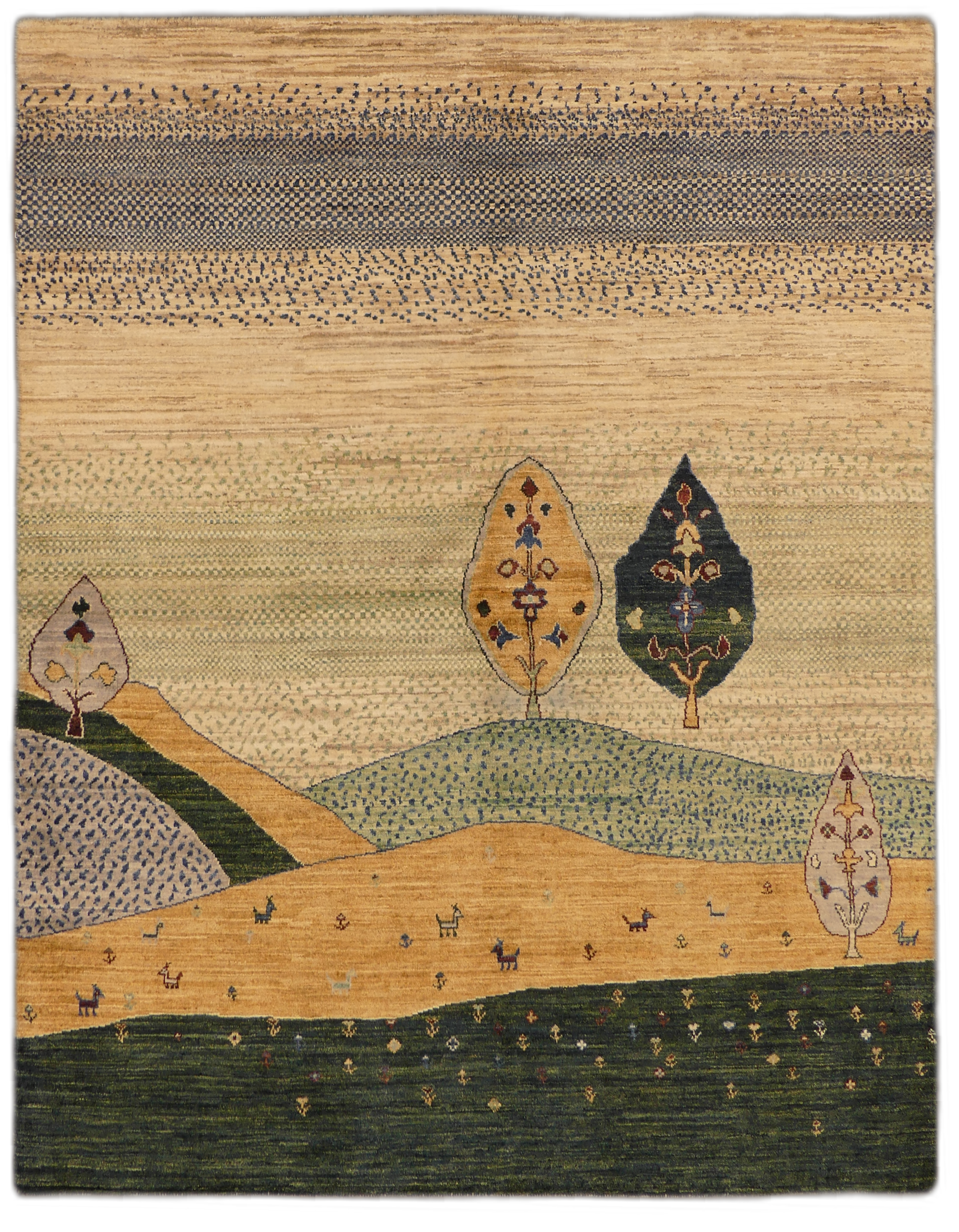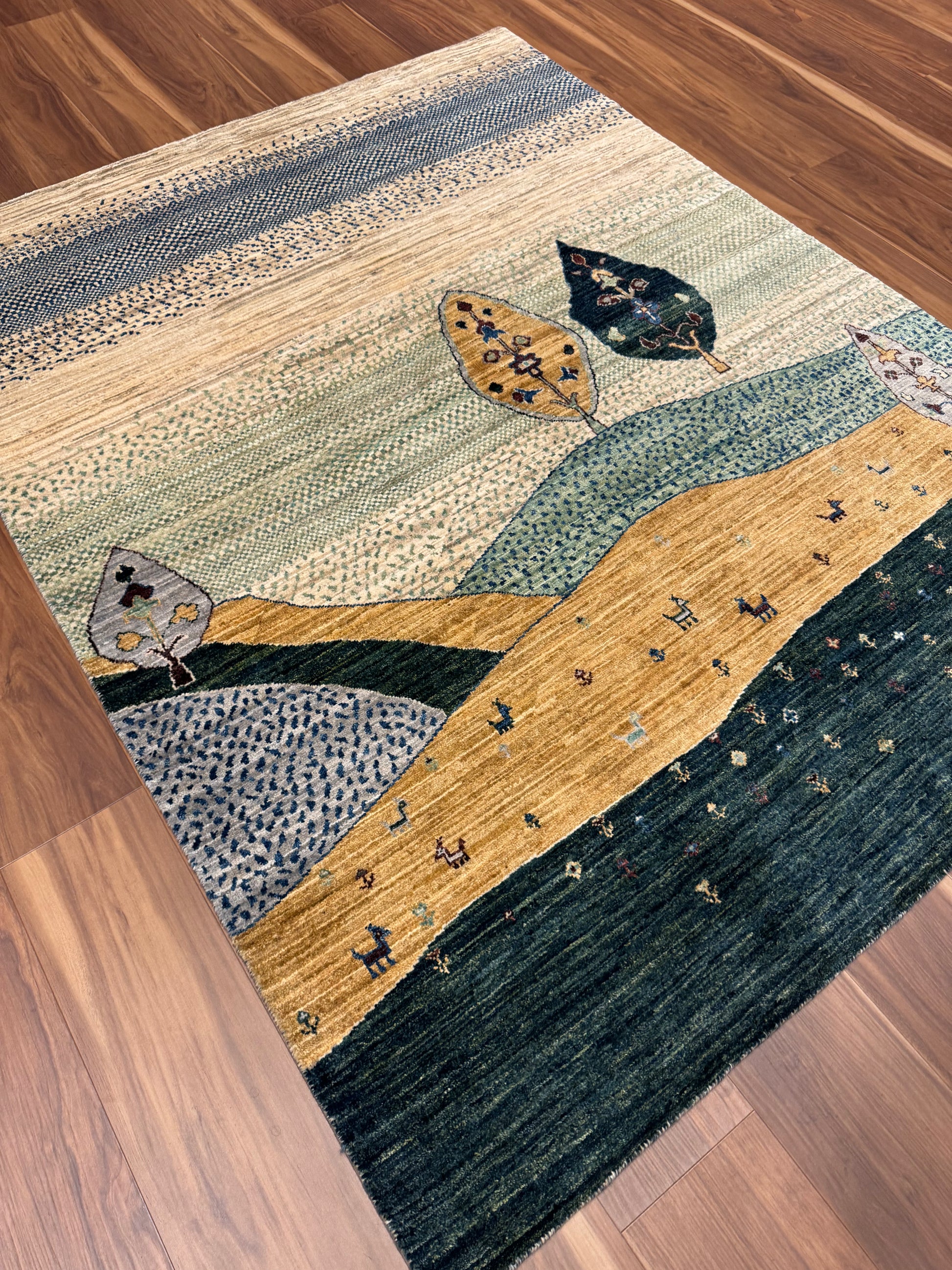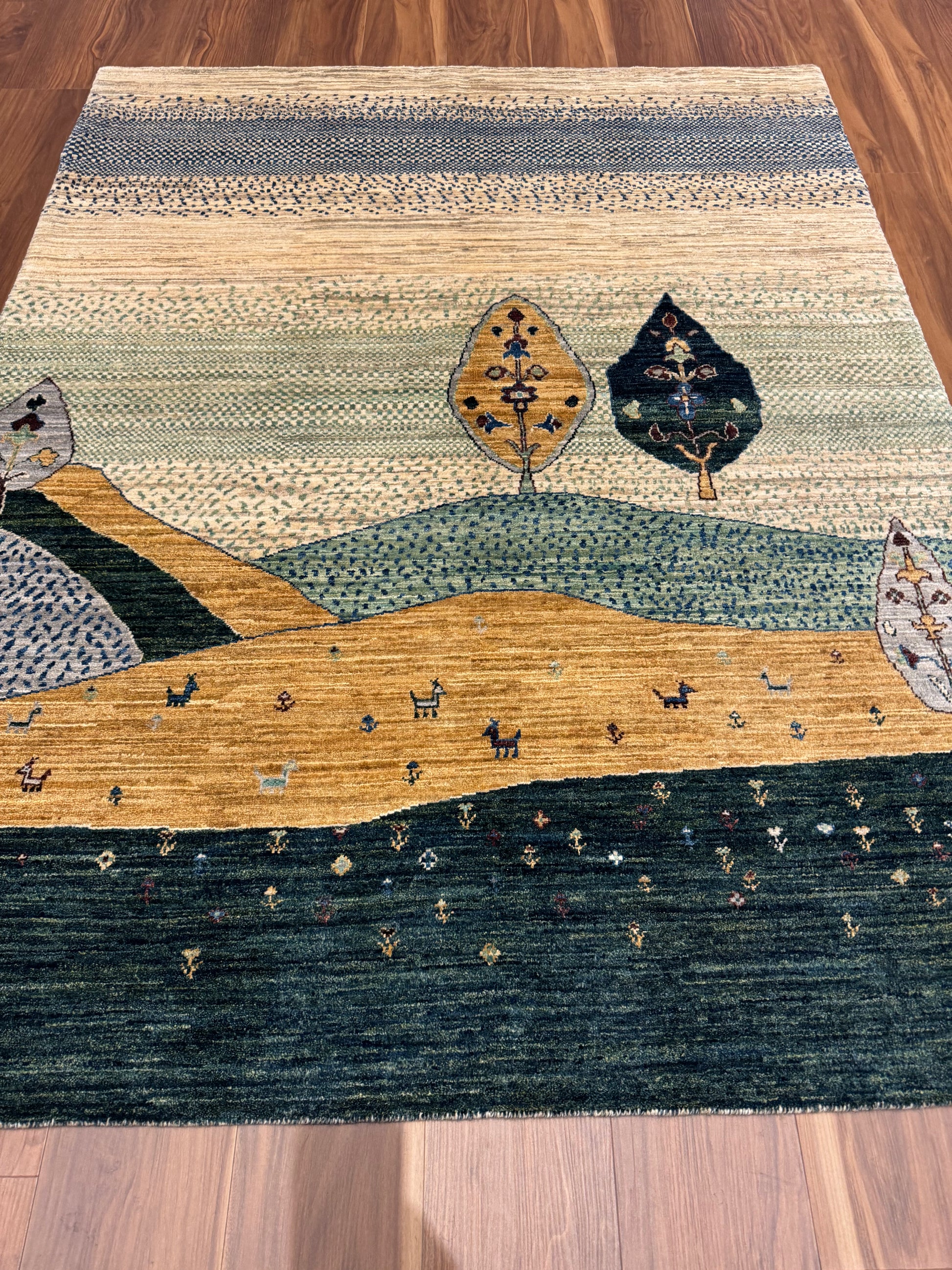 This Lori Gabbeh rug is a charming piece that showcases a pastoral vignette, featuring a soothing landscape of rolling hills adorned with foliage. The simple, yet evocative design is infused with subtle color transitions that evoke a sense of calm and tranquility. Each element, from the stylized trees to the playful animal figures scattered across the field, is rendered with a naive artistry reminiscent of folk traditions. Handwoven from high-quality wool, the rug's textural richness and durability make it both a practical and aesthetically pleasing addition to any interior space seeking a touch of rustic charm.