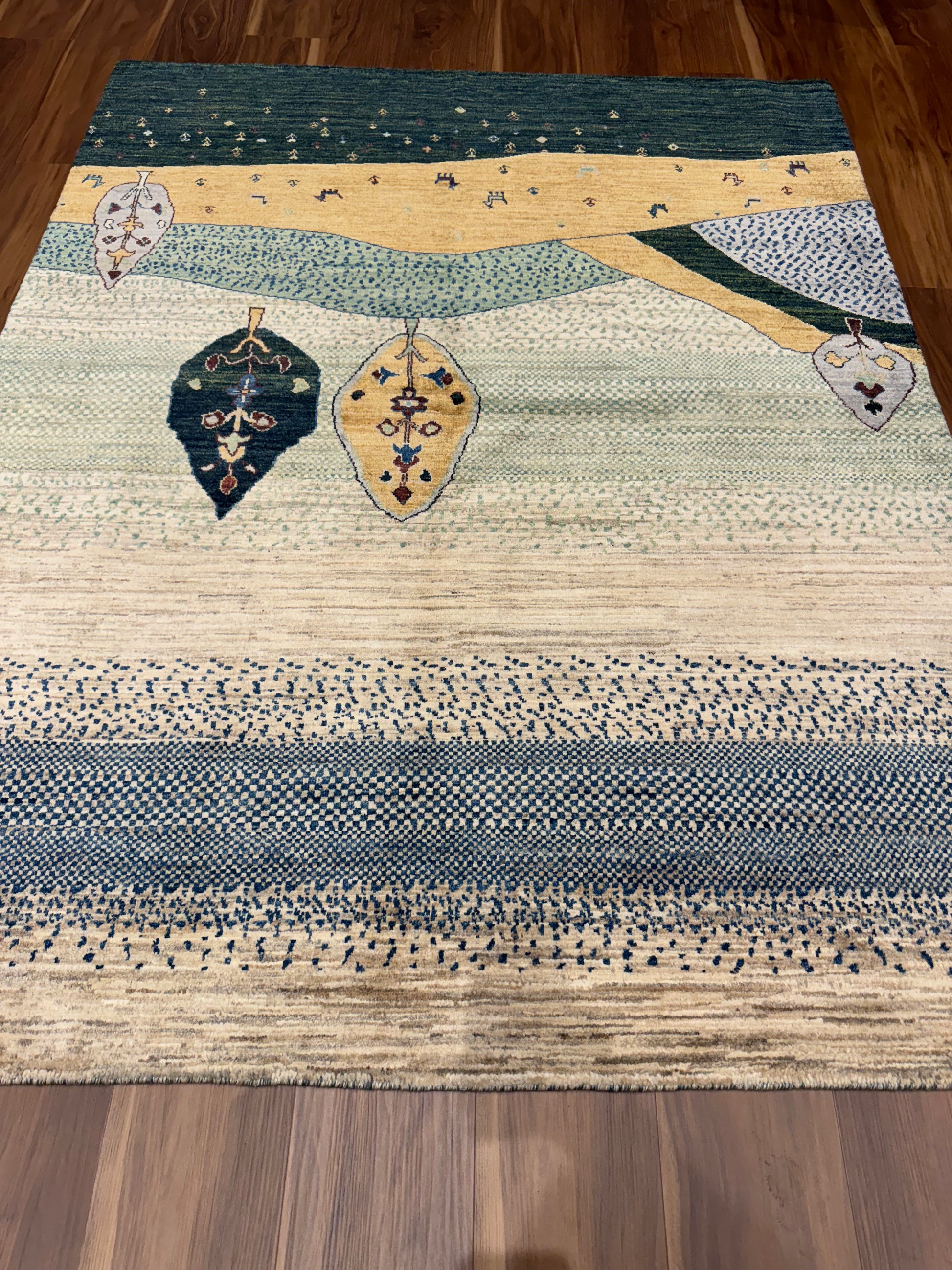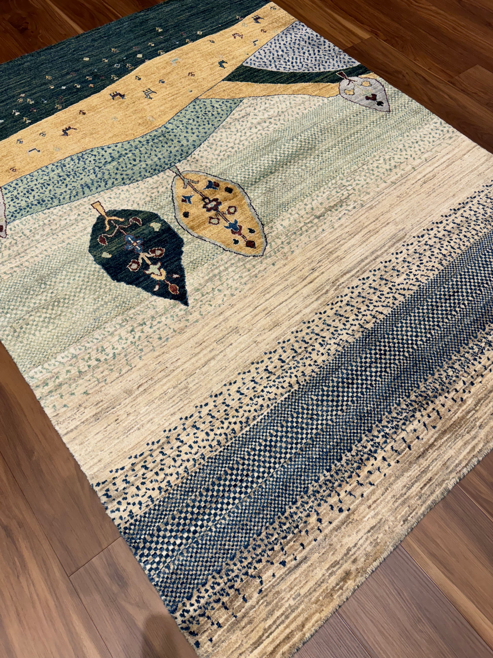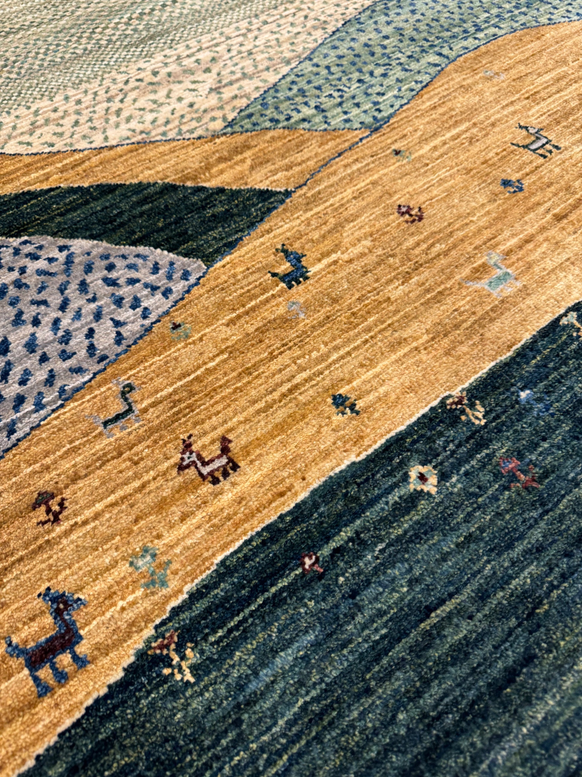This Lori Gabbeh rug is a charming piece that showcases a pastoral vignette, featuring a soothing landscape of rolling hills adorned with foliage. The simple, yet evocative design is infused with subtle color transitions that evoke a sense of calm and tranquility. Each element, from the stylized trees to the playful animal figures scattered across the field, is rendered with a naive artistry reminiscent of folk traditions. Handwoven from high-quality wool, the rug's textural richness and durability make it both a practical and aesthetically pleasing addition to any interior space seeking a touch of rustic charm.