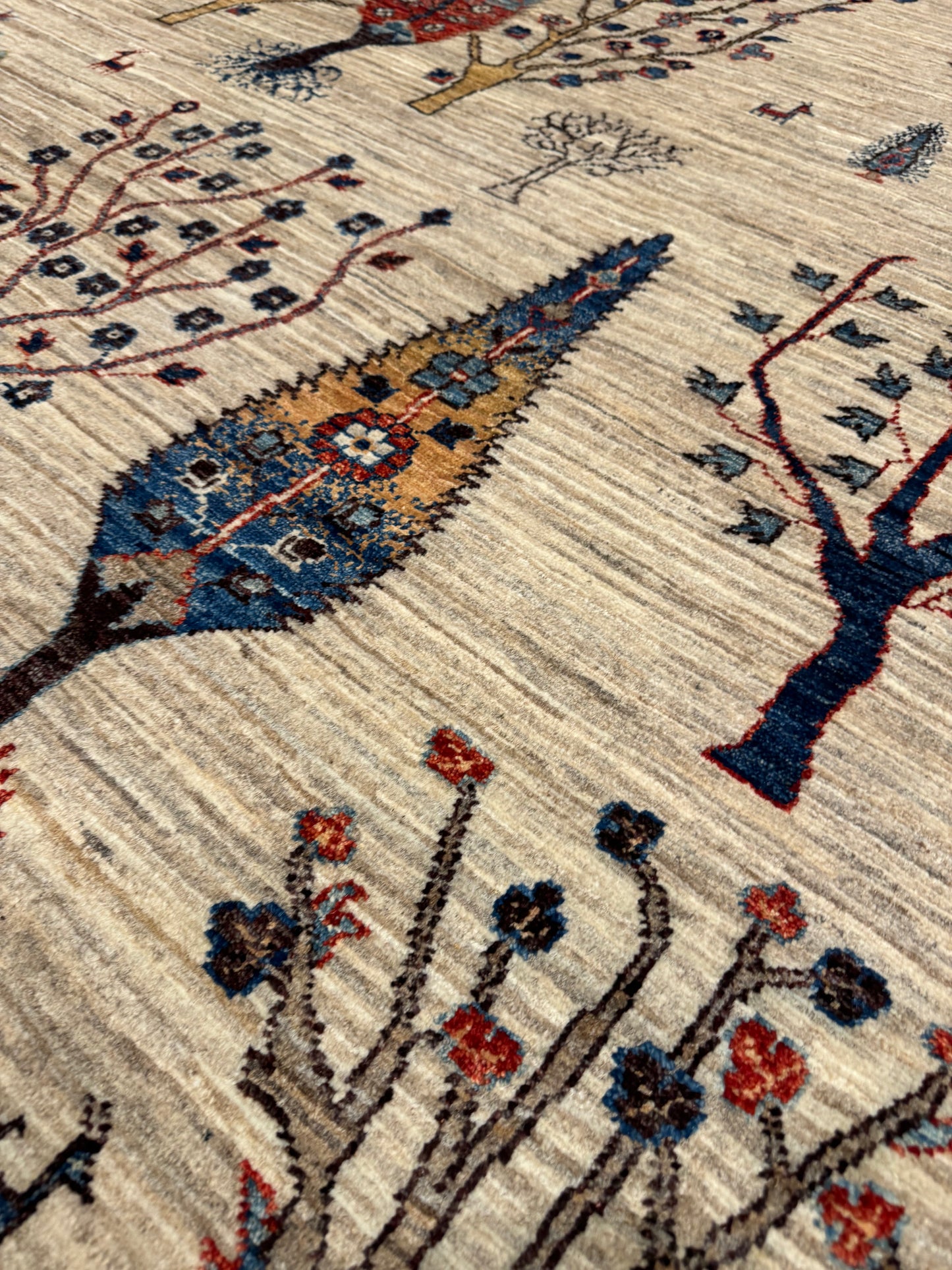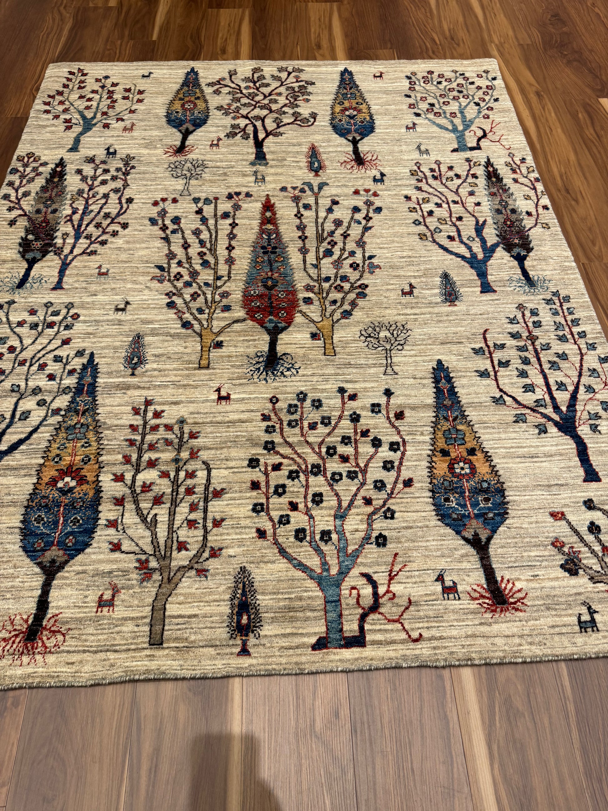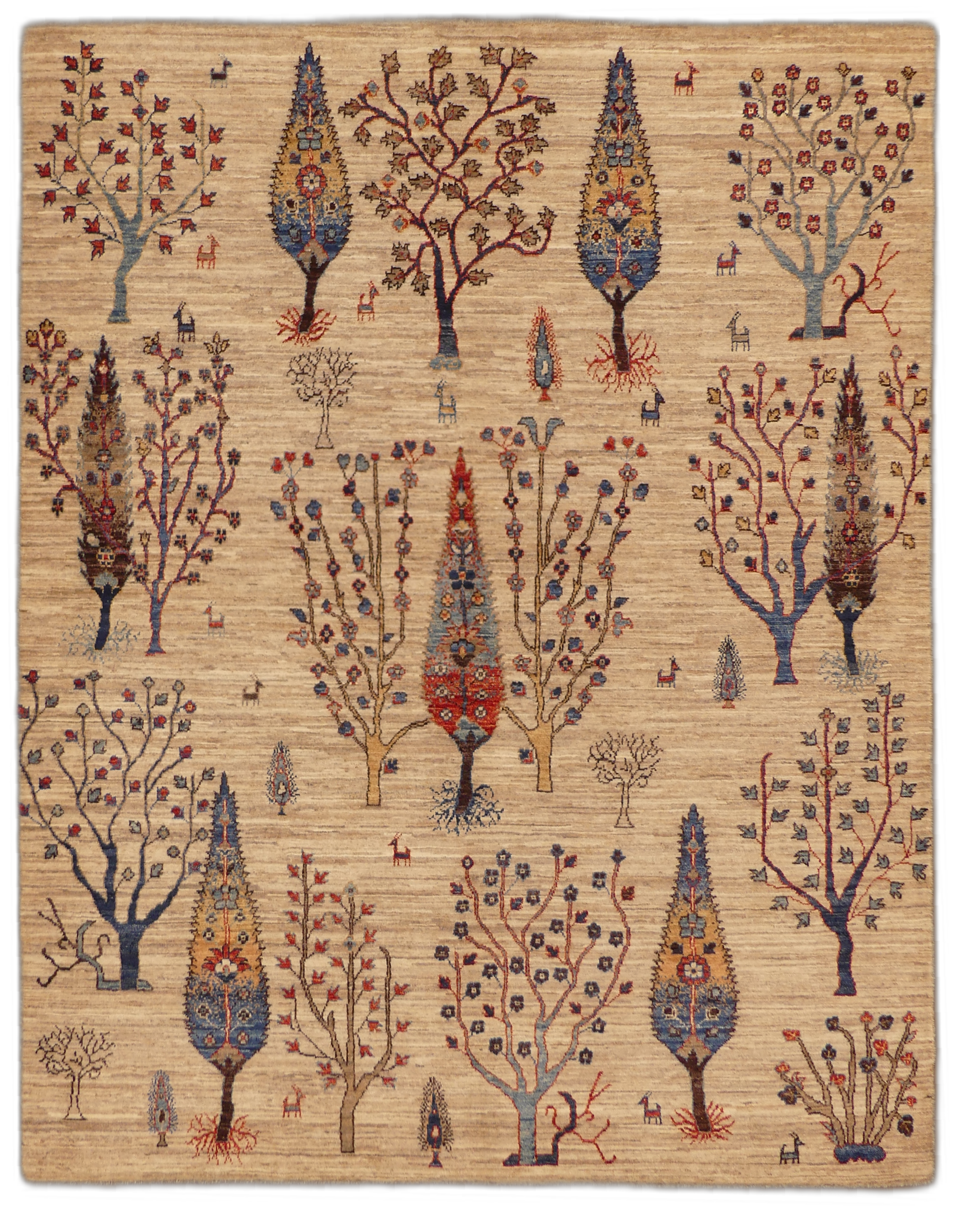 This enchanting Lori Gabbeh rug showcases a tapestry of vibrant trees and wildlife, creating a lively forest scene. Crafted with high-quality wool, each tree is intricately detailed with unique patterns and colors, evoking whimsy and the charm of nature's untouched beauty. Ideal for bringing warmth and storytelling to any room, this rug merges traditional craftsmanship with a rustic, naturalistic aesthetic.