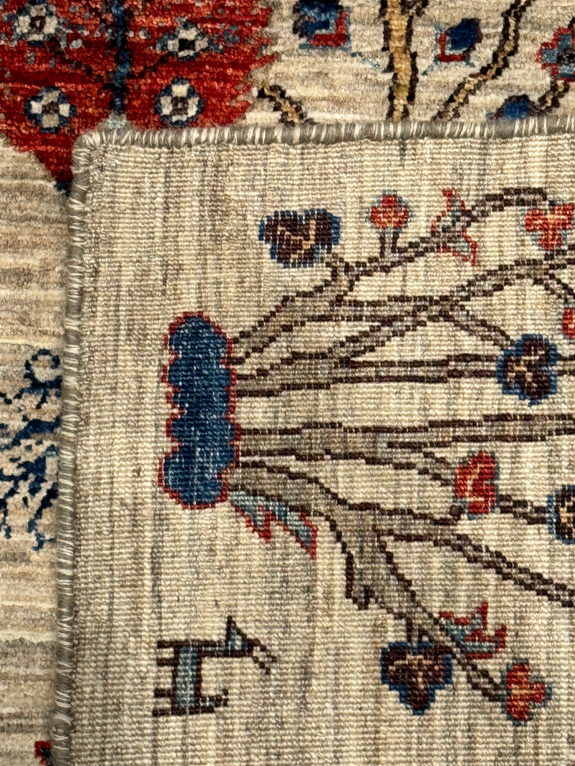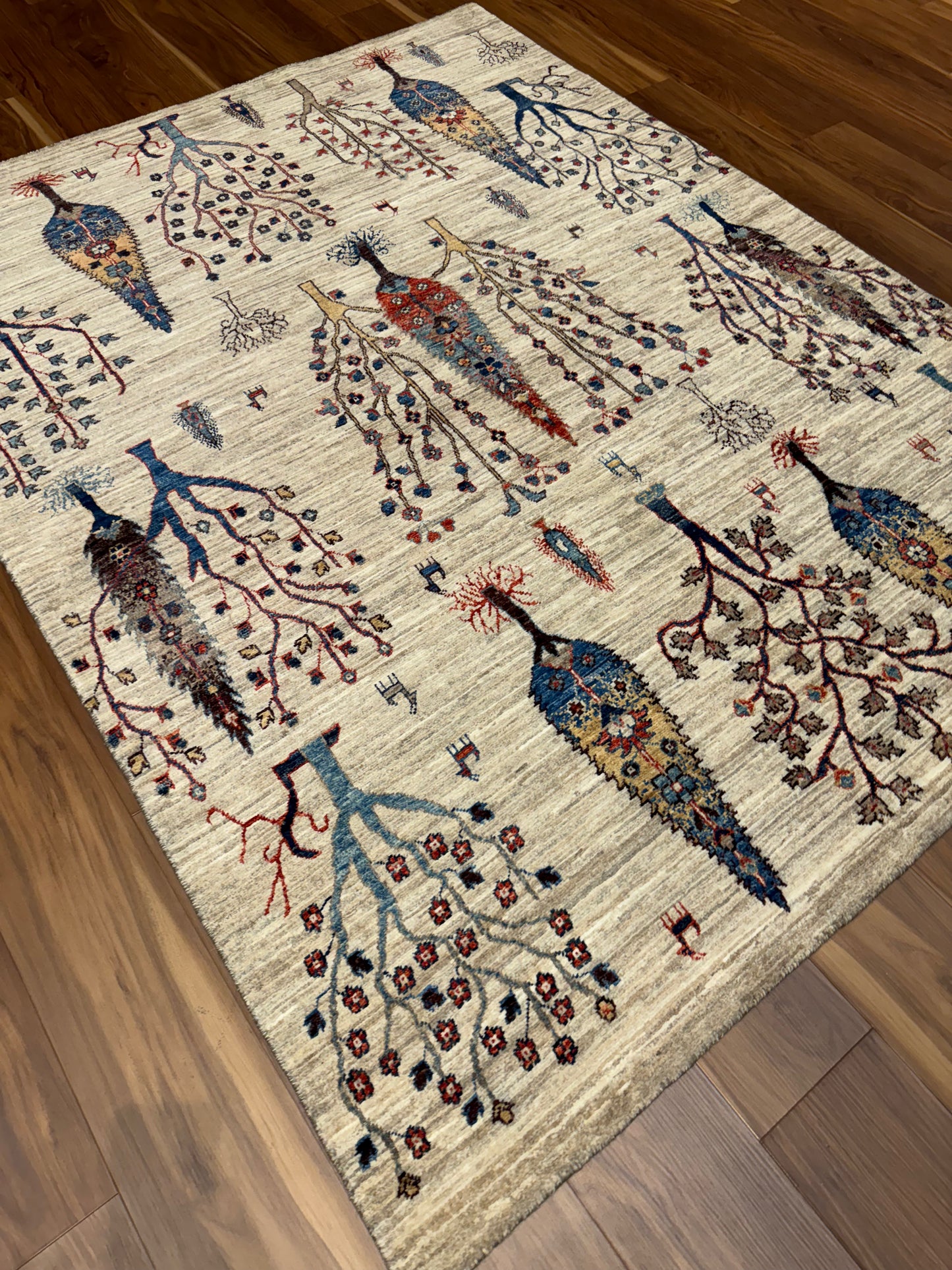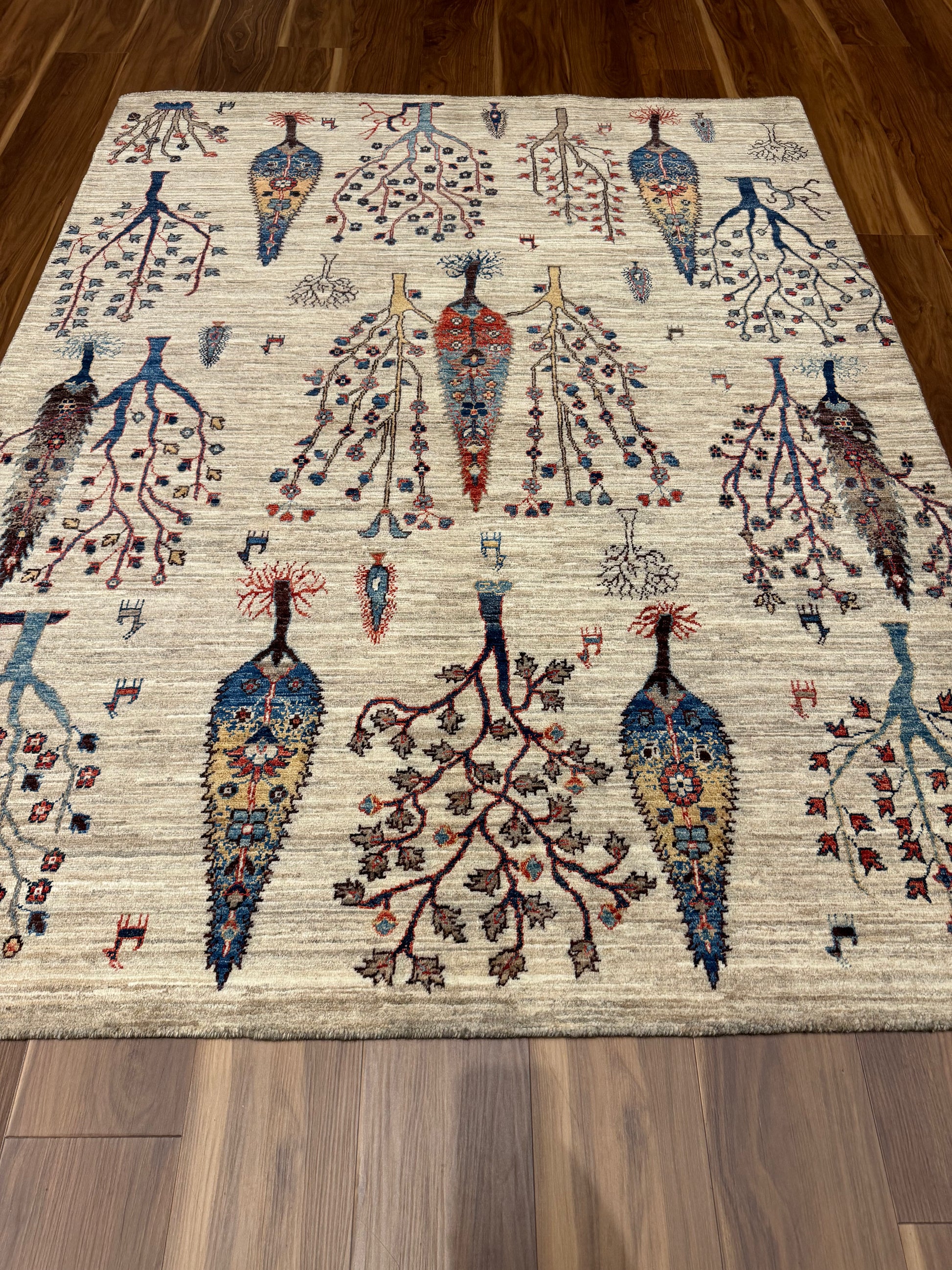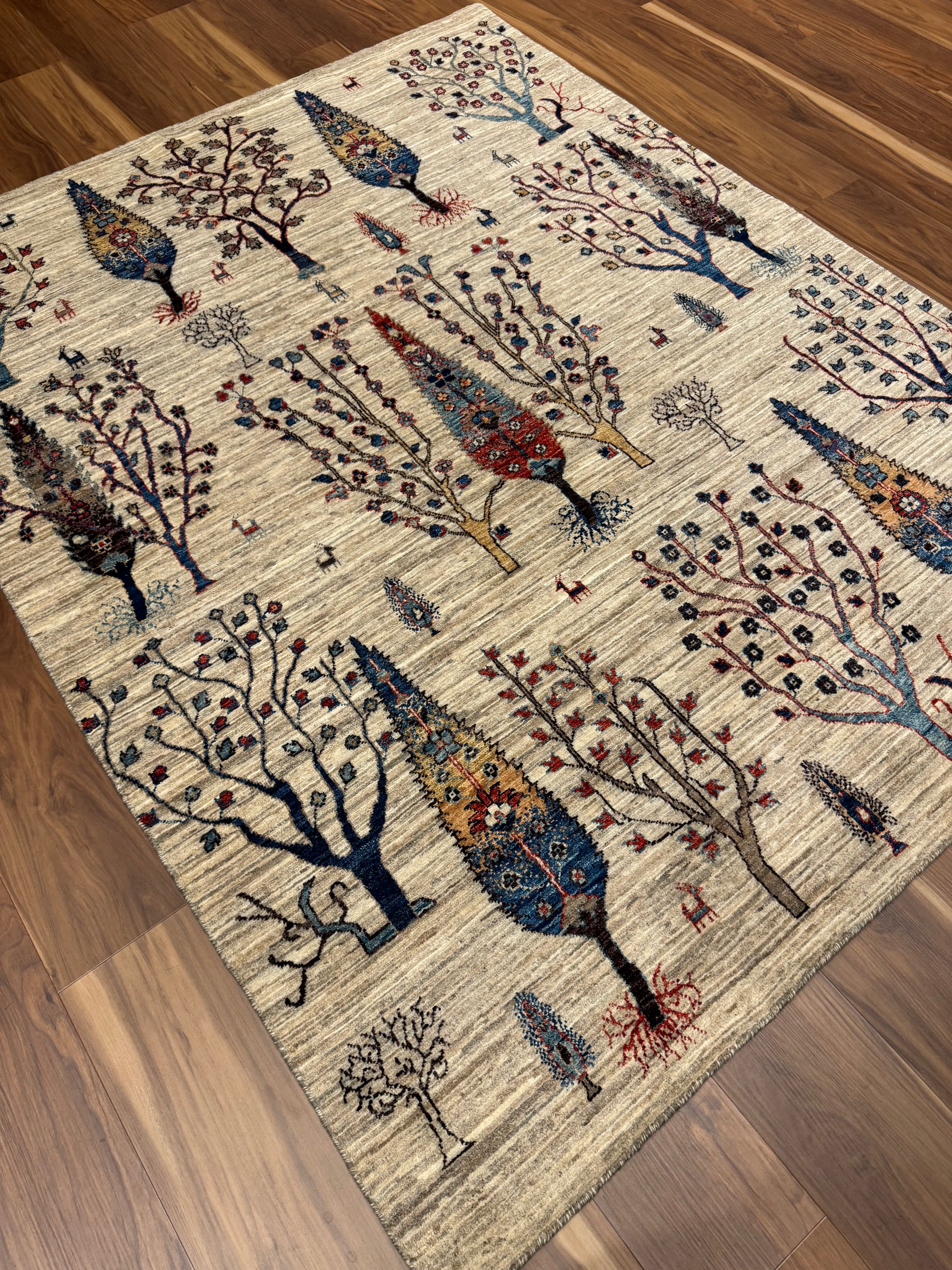 This enchanting Lori Gabbeh rug showcases a tapestry of vibrant trees and wildlife, creating a lively forest scene. Crafted with high-quality wool, each tree is intricately detailed with unique patterns and colors, evoking whimsy and the charm of nature's untouched beauty. Ideal for bringing warmth and storytelling to any room, this rug merges traditional craftsmanship with a rustic, naturalistic aesthetic.