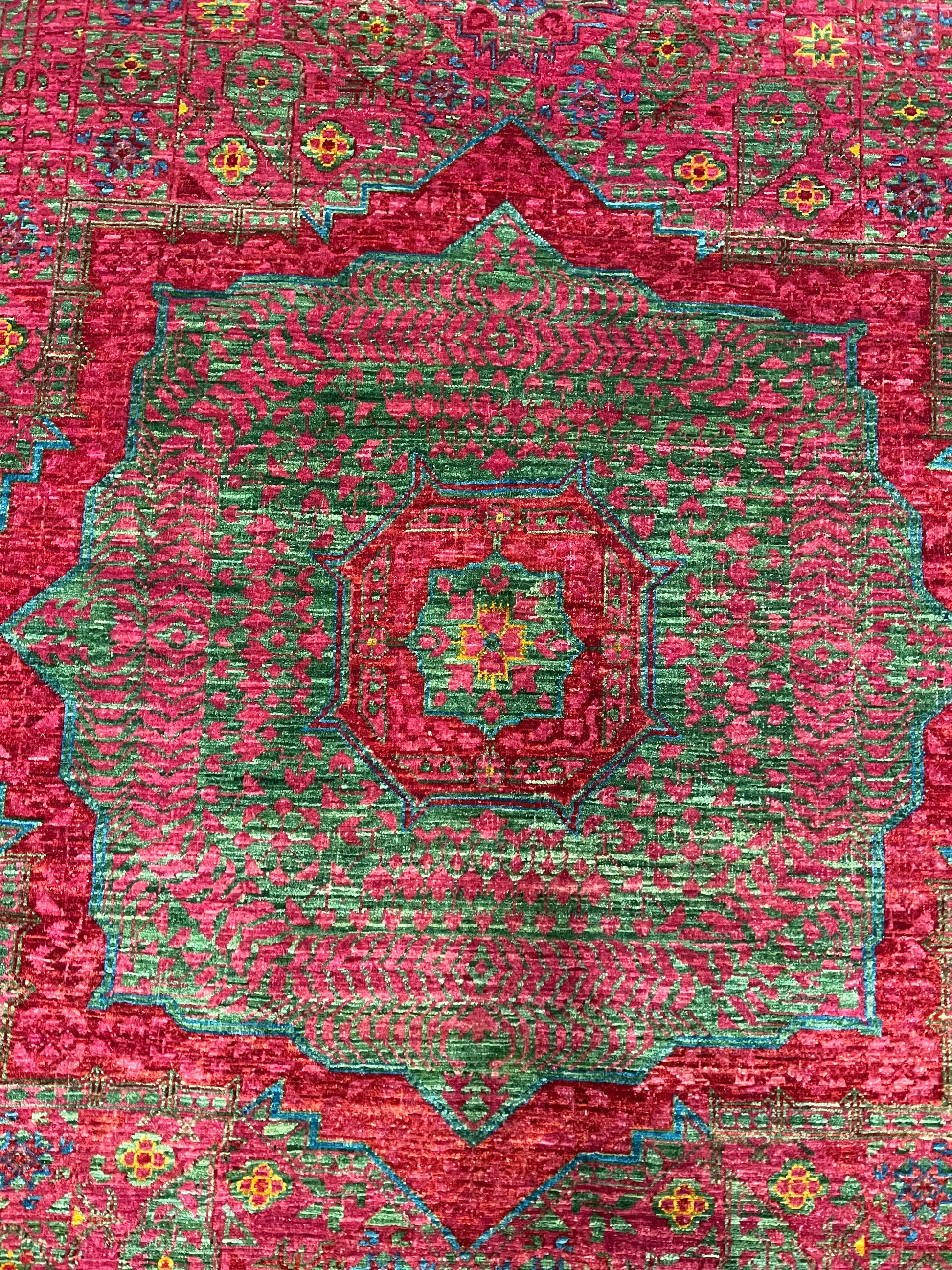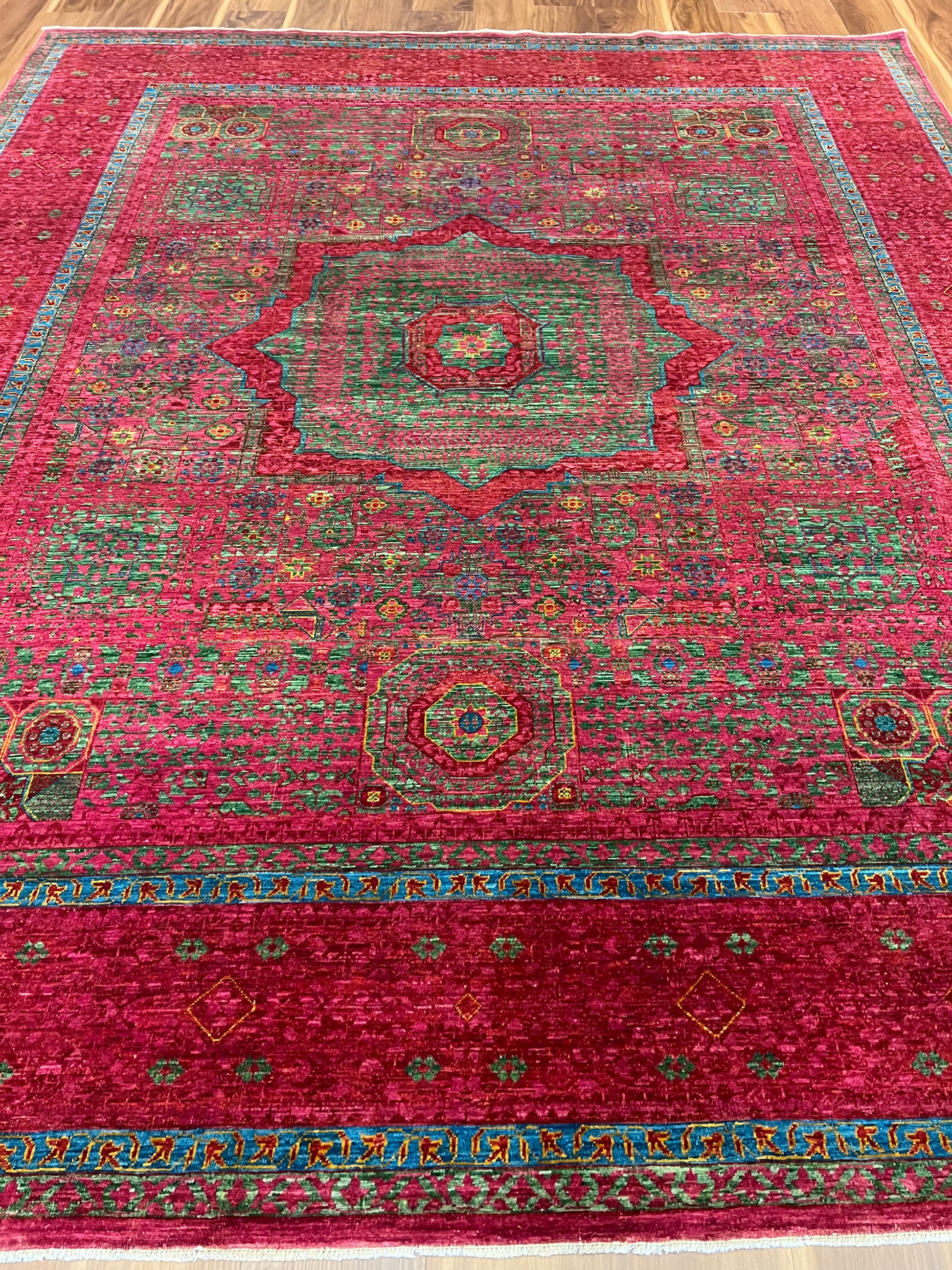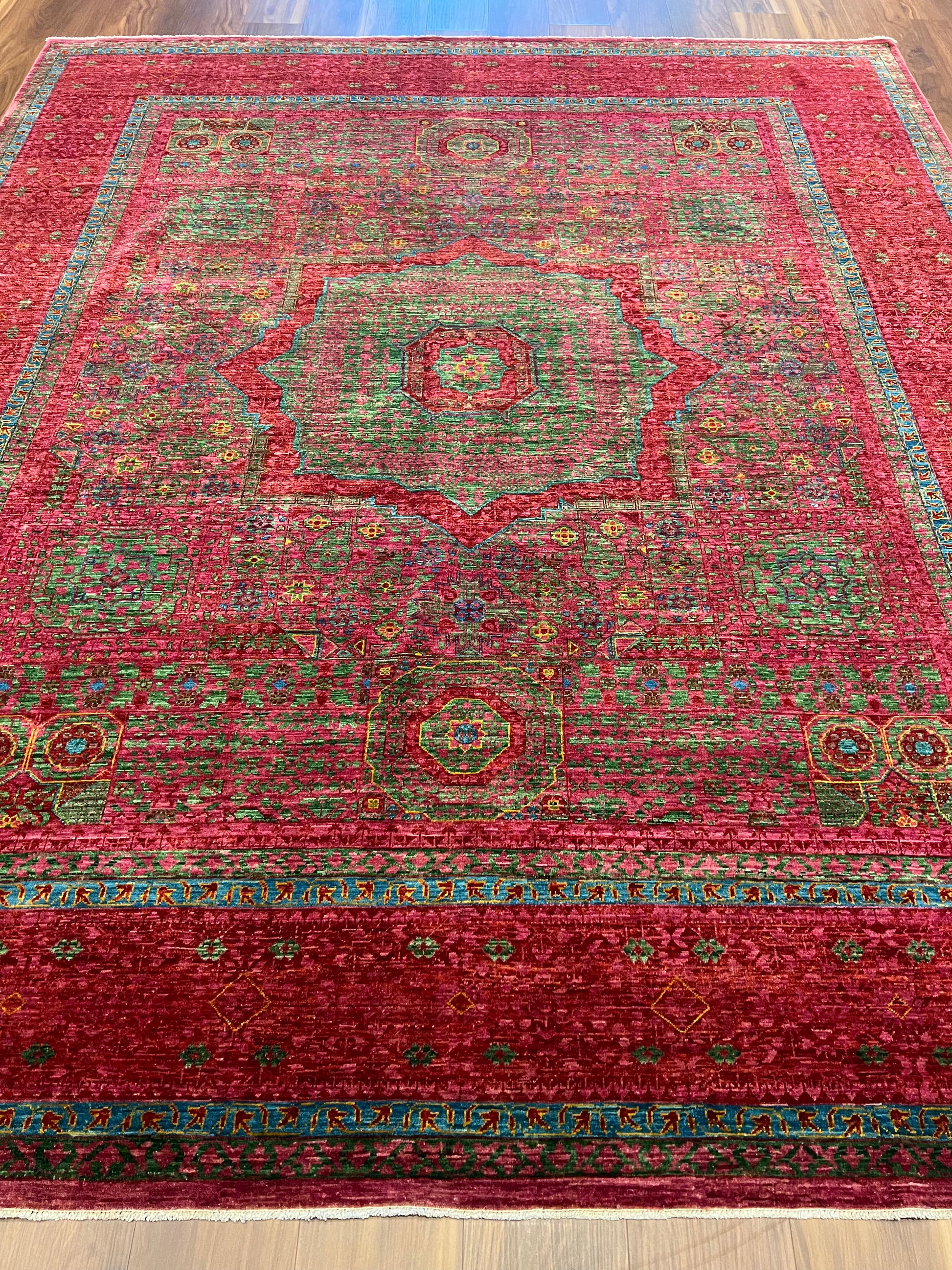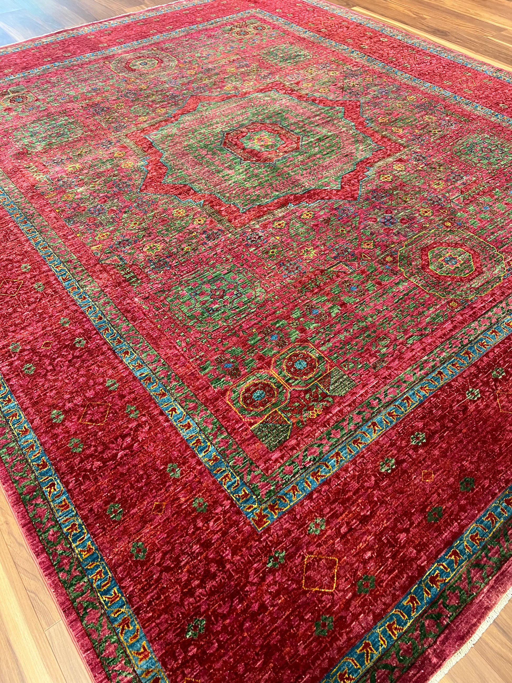 This exquisite traditional Mamluk rug is crafted from high-quality wool, showcasing a rich interplay of red, green, and gold hues. Its detailed geometric patterns and star-centered medallion resonate with historic artistry and craftsmanship. The precise symmetry and harmony reflect the time-honored Mamluk design, making it an exceptional piece that brings an air of sophistication and cultural depth to any interior.