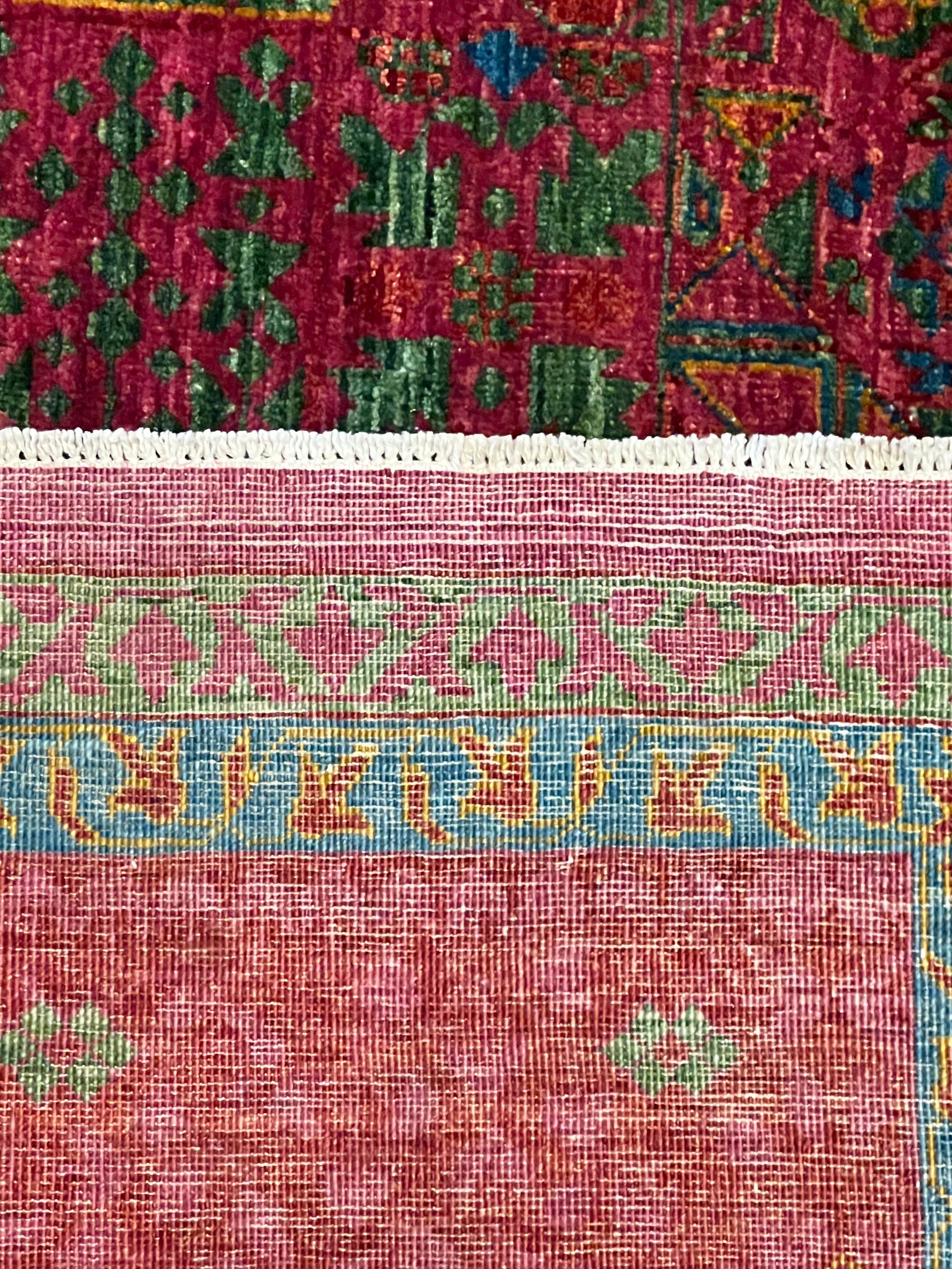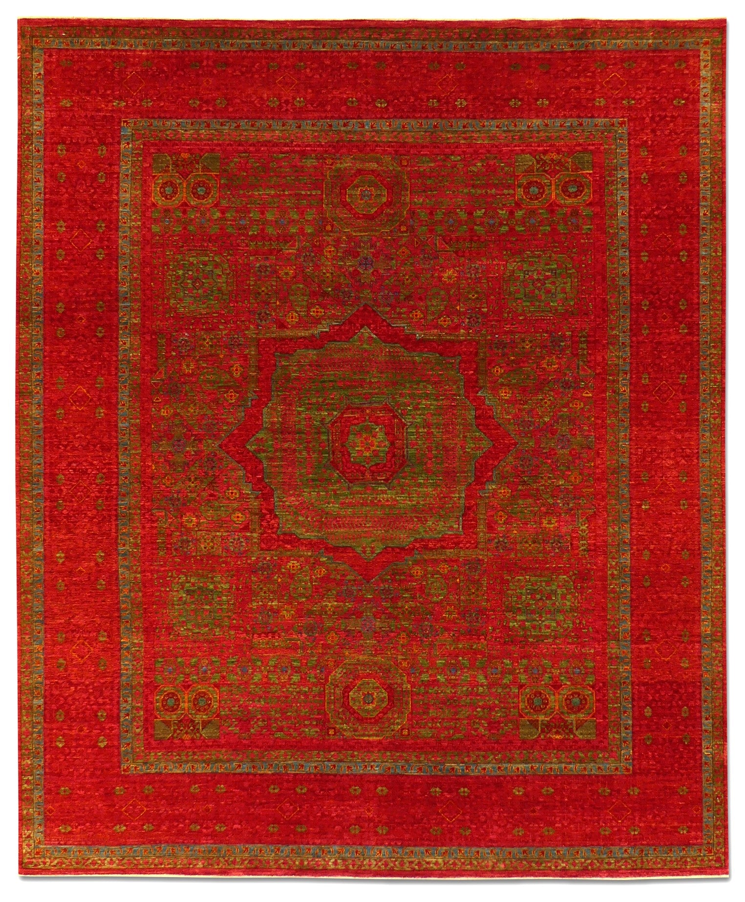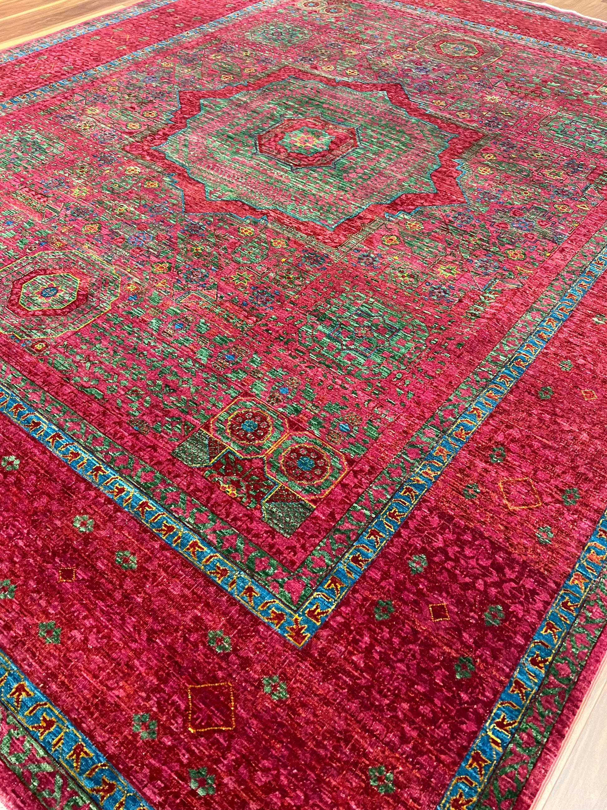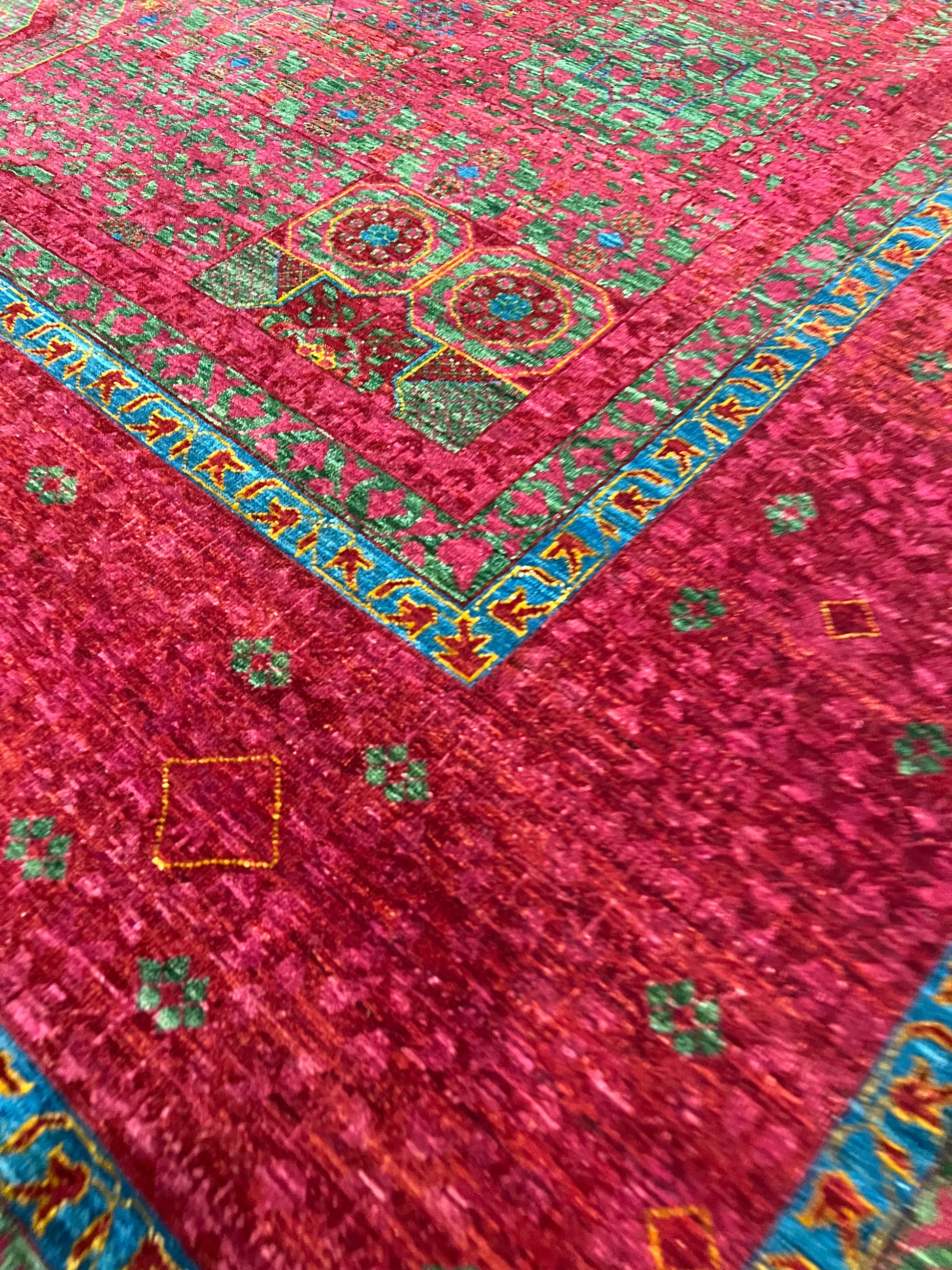 This exquisite traditional Mamluk rug is crafted from high-quality wool, showcasing a rich interplay of red, green, and gold hues. Its detailed geometric patterns and star-centered medallion resonate with historic artistry and craftsmanship. The precise symmetry and harmony reflect the time-honored Mamluk design, making it an exceptional piece that brings an air of sophistication and cultural depth to any interior.